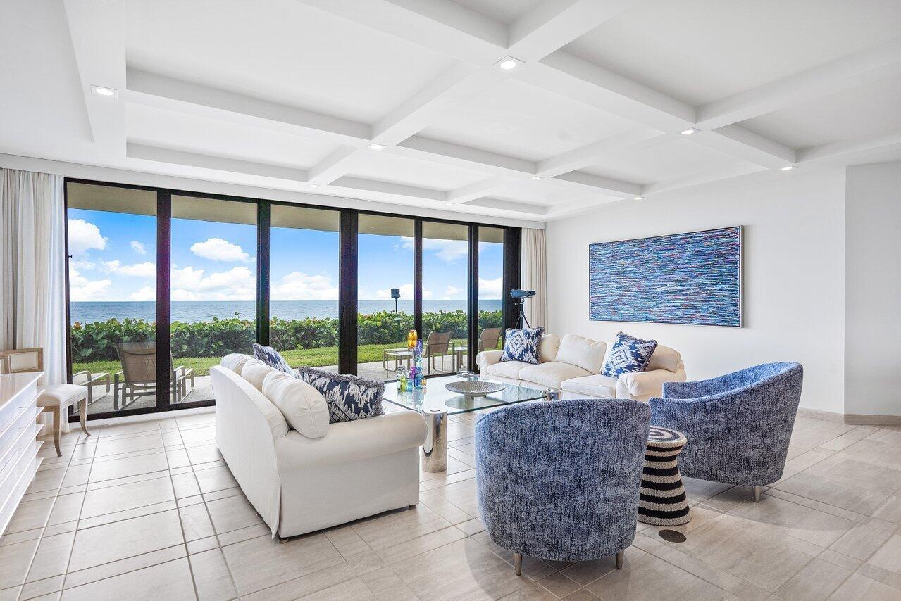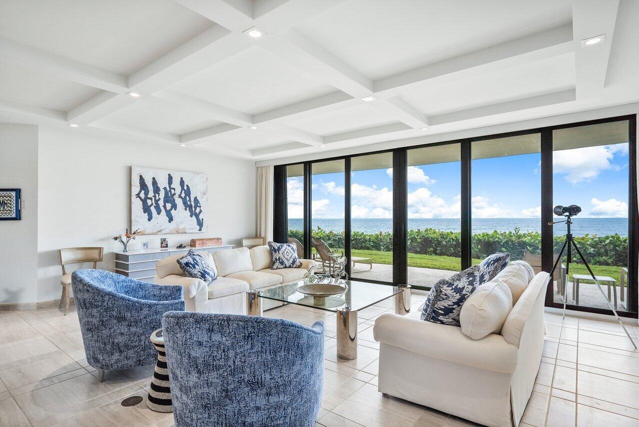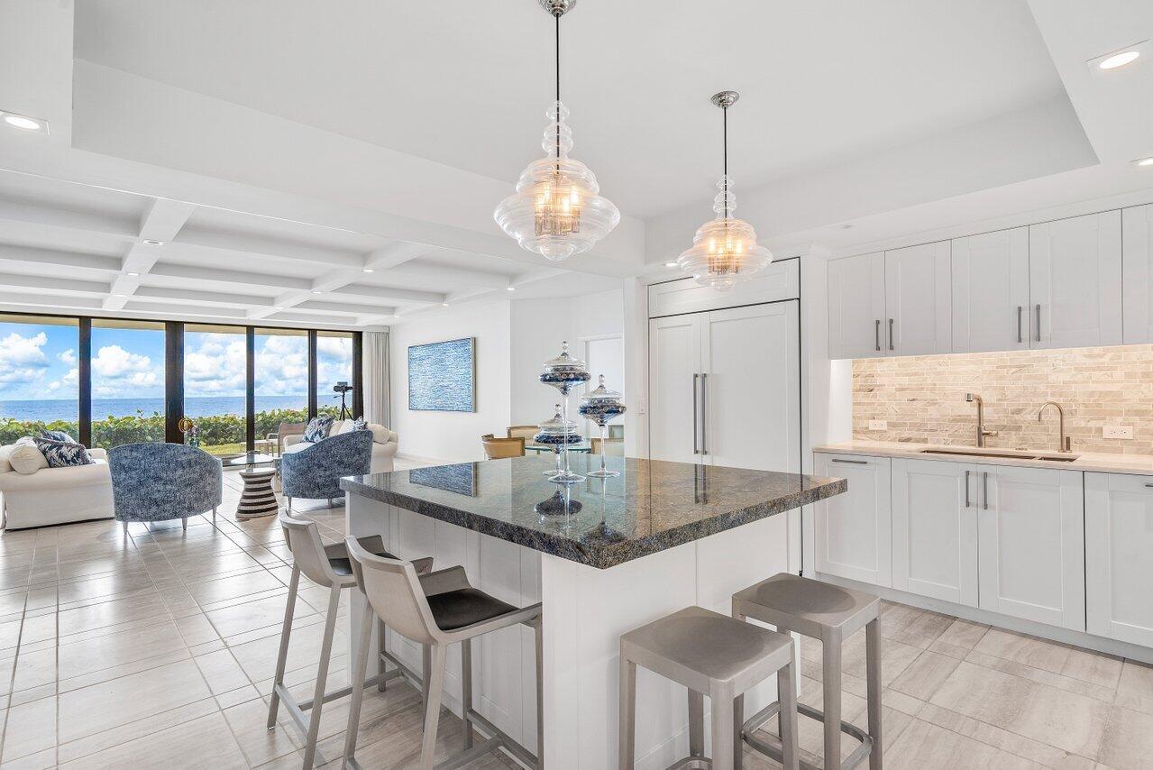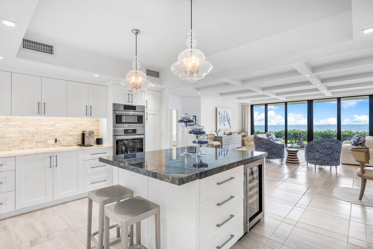Take in unending crystal blue ocean views from this stunningly renovated first floor condominium in sought after Sloans Curve. A gracious foyer leads to the kitchen, dining and living spaces, beautifully illuminated through the large hurricane impact sliding doors extending from the new marble floors to the coffered ceilings. The new kitchen features a granite topped island, stainless steel appliances, and built-in wine cooler. The spacious master suite is adorned with automatic drapes, wood floors and quartz bathroom counters.