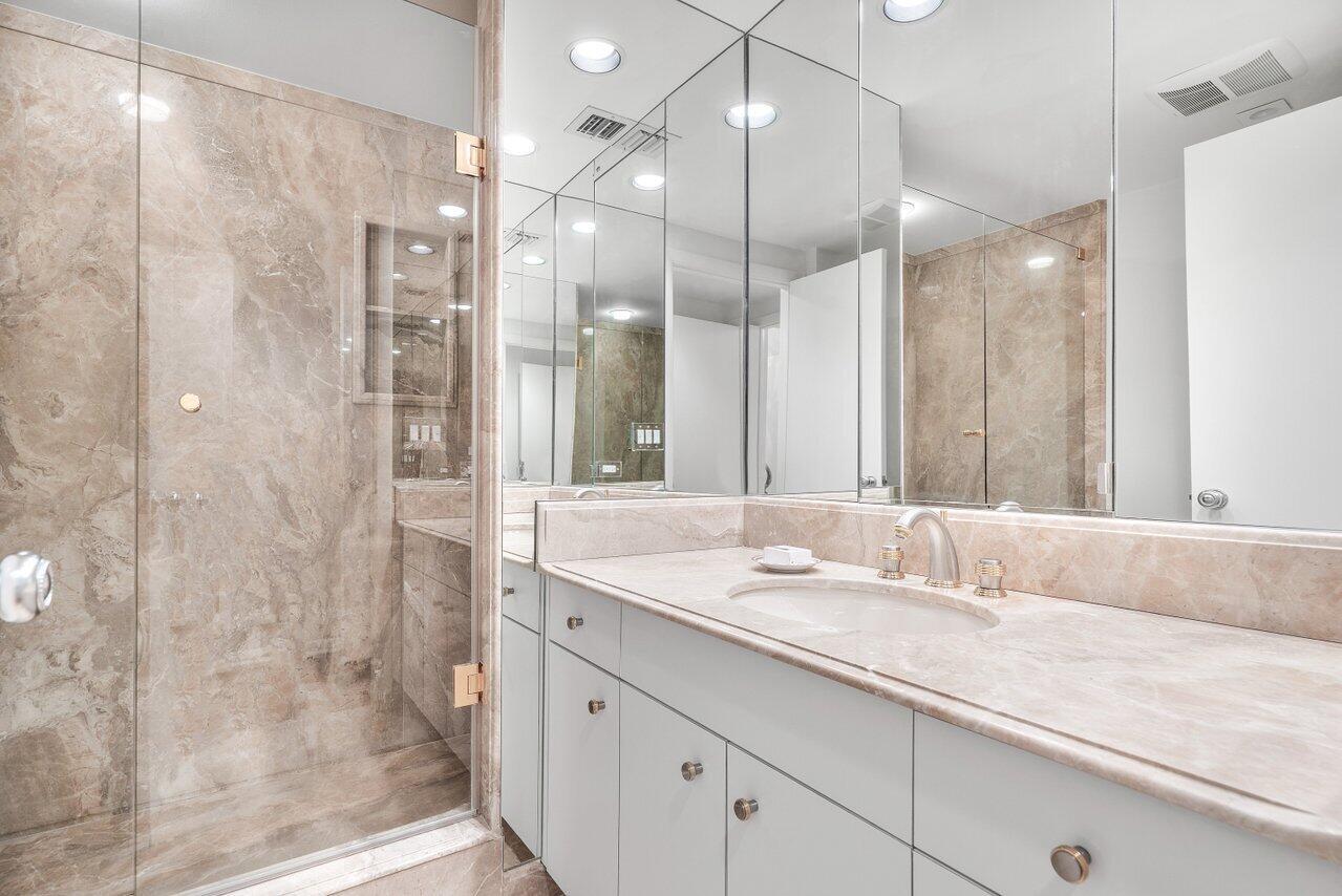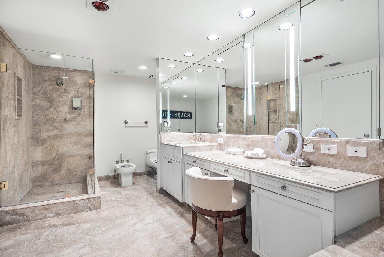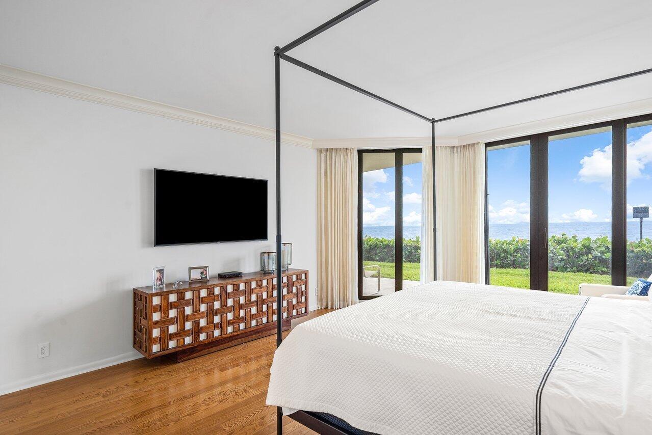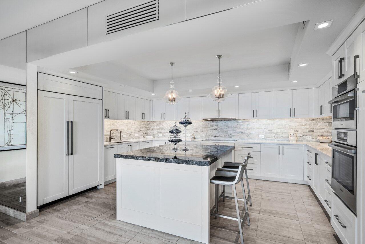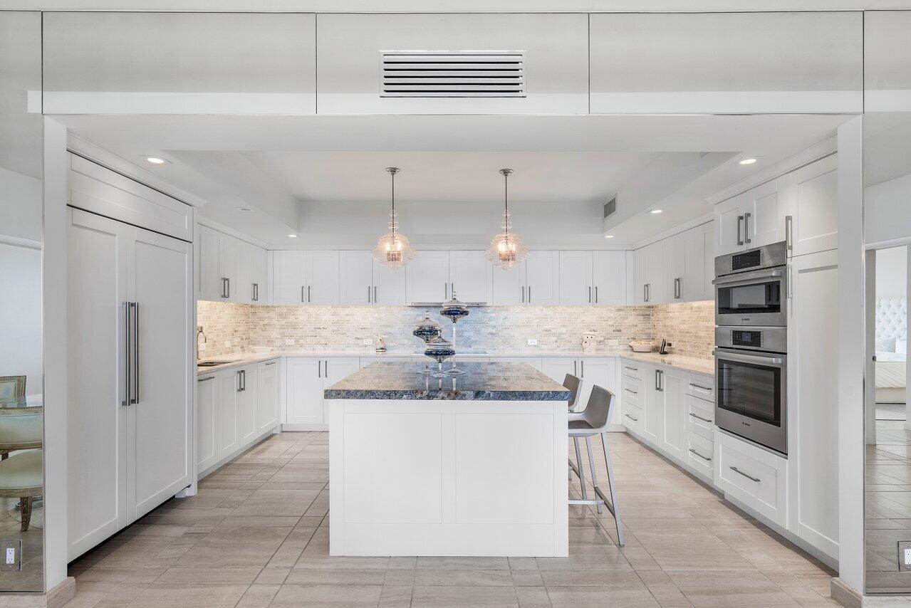 Take in unending crystal blue ocean views from this stunningly renovated first floor condominium in sought after Sloans Curve. A gracious foyer leads to the kitchen, dining and living spaces, beautifully illuminated through the large hurricane impact sliding doors extending from the new marble floors to the coffered ceilings. The new kitchen features a granite topped island, stainless steel appliances, and built-in wine cooler. The spacious master suite is adorned with automatic drapes, wood floors and quartz bathroom counters.