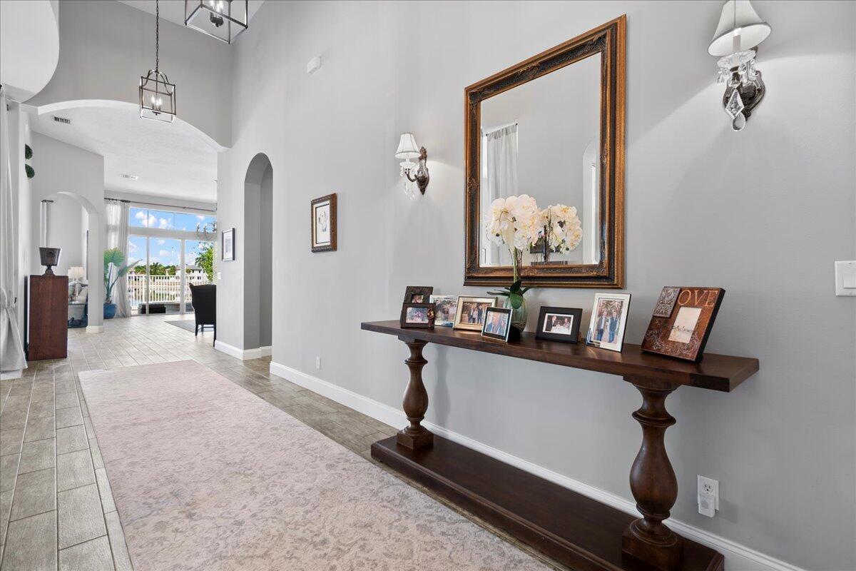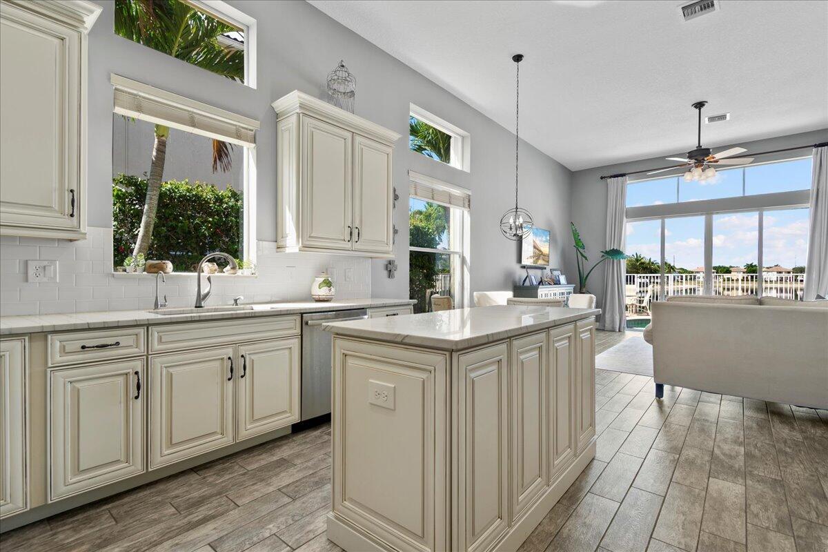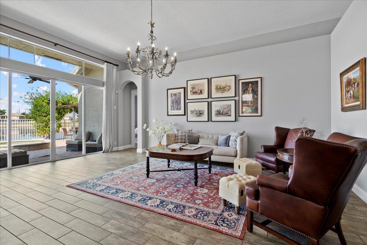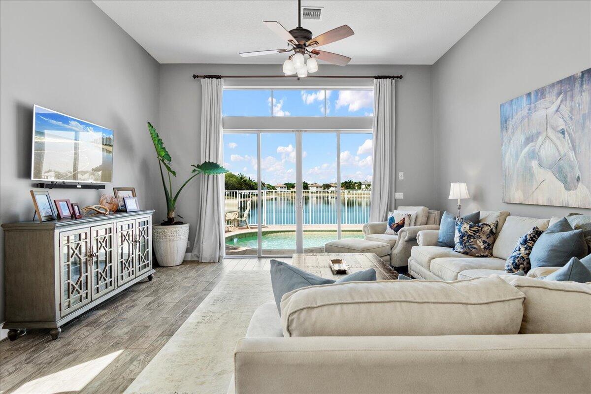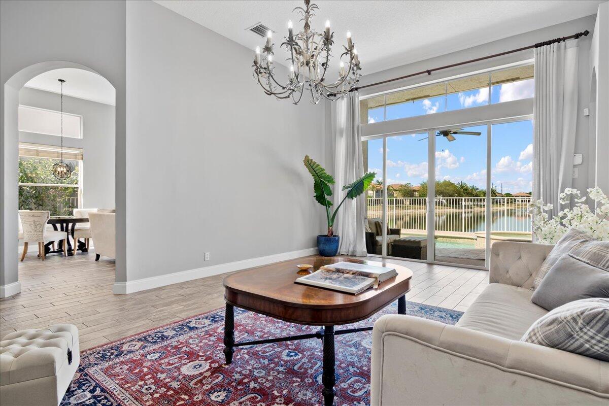 Welcome to Bay View Way! This designer renovated, western facing lake view pool home offers an abundance of natural light throughout, vaulted 15 foot ceilings and spacious floor plan. Newer AC, hot water heater & pool pump. All new porcelain tile floors! Layout consists of a split floor plan ,3 bedrooms plus a den/office that can be a 4h bedroom and 2.5 baths. Laundry room inside with sink leads you the oversized 3 car garage. Multiple living spaces with gorgeous views & a custom chefs kitchen with gas range, Brazilian quartzite countertops, pantry & island. A fully fenced in yard lined with lush foliage and blooming bushes for the perfect way to end your days. Conveniently located on SR 7 close to dining, A+ rated schools, shopping & equestrian facilities. A must see!