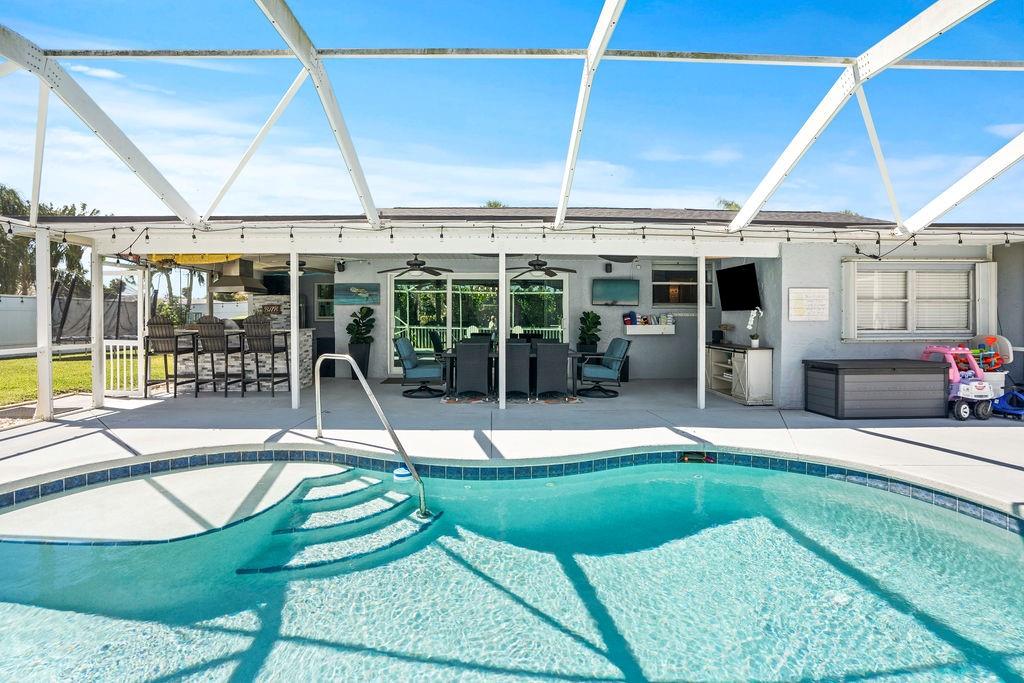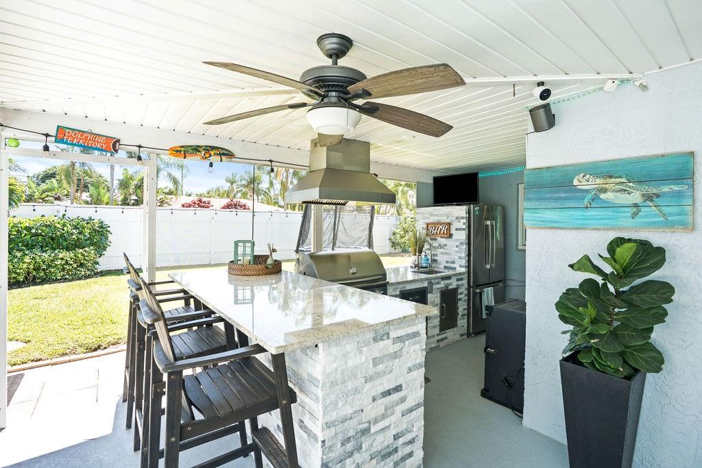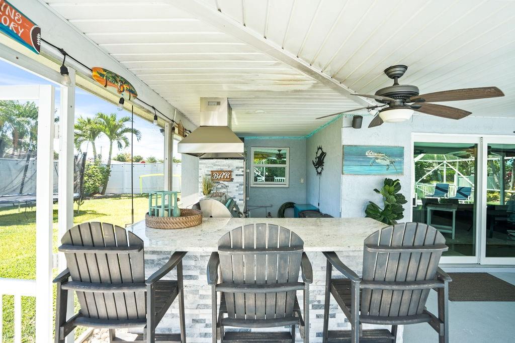 that opens to your tropical haven, and an outdoor kitchen with granite countertops that looks out over your