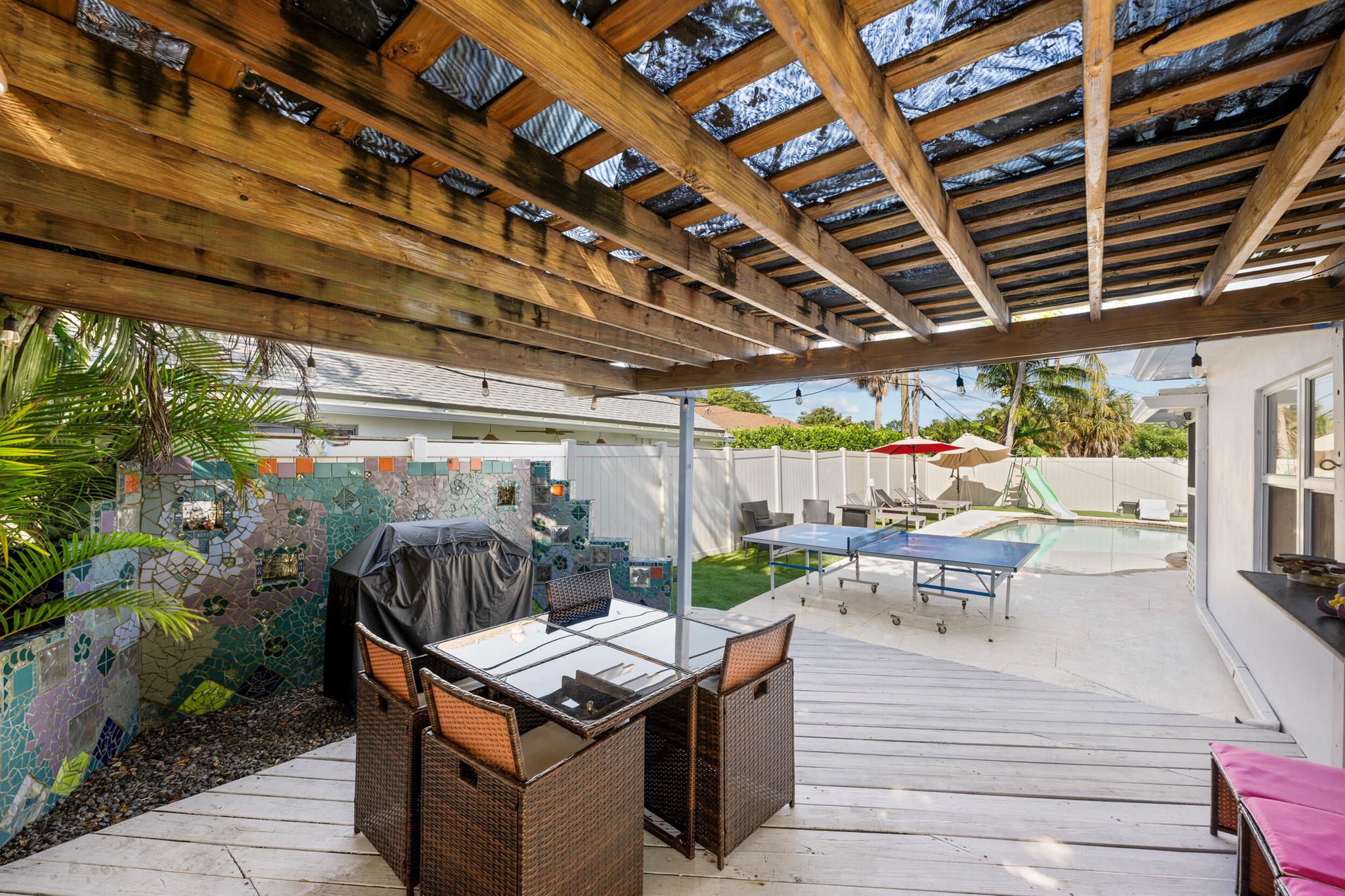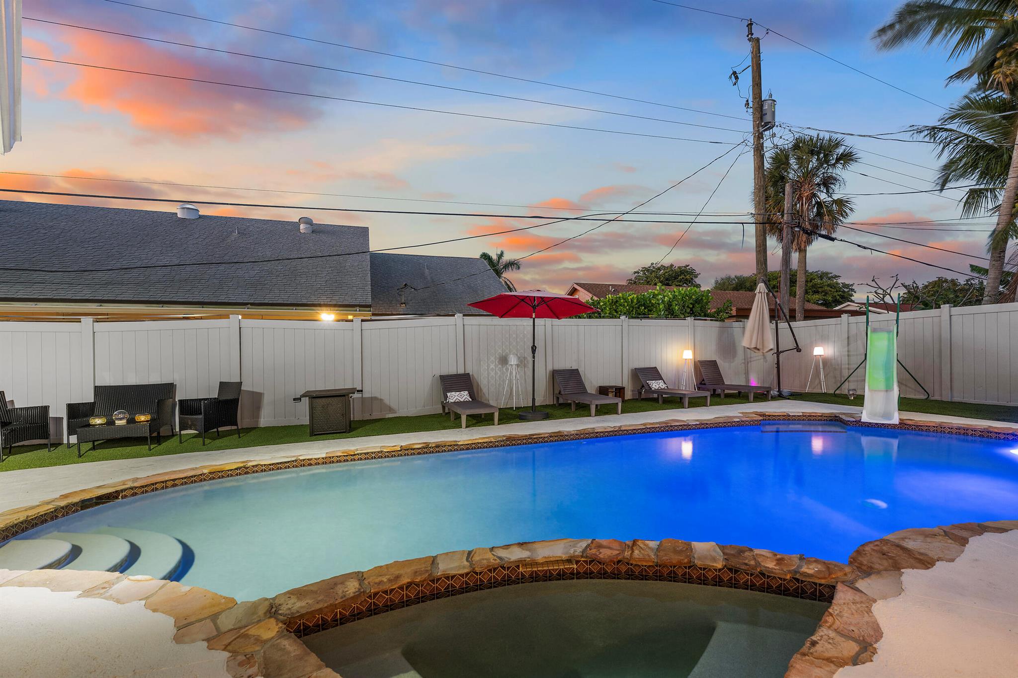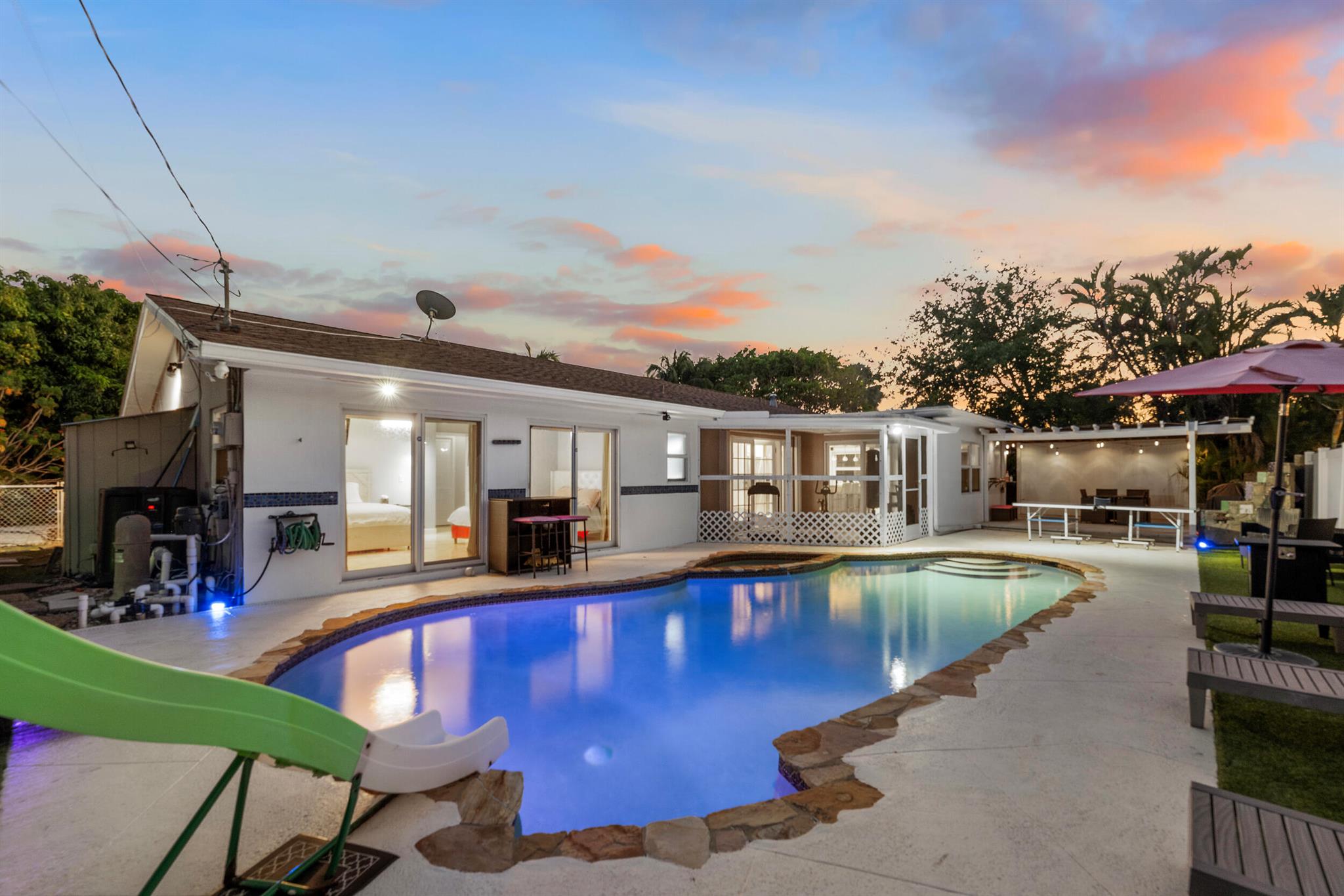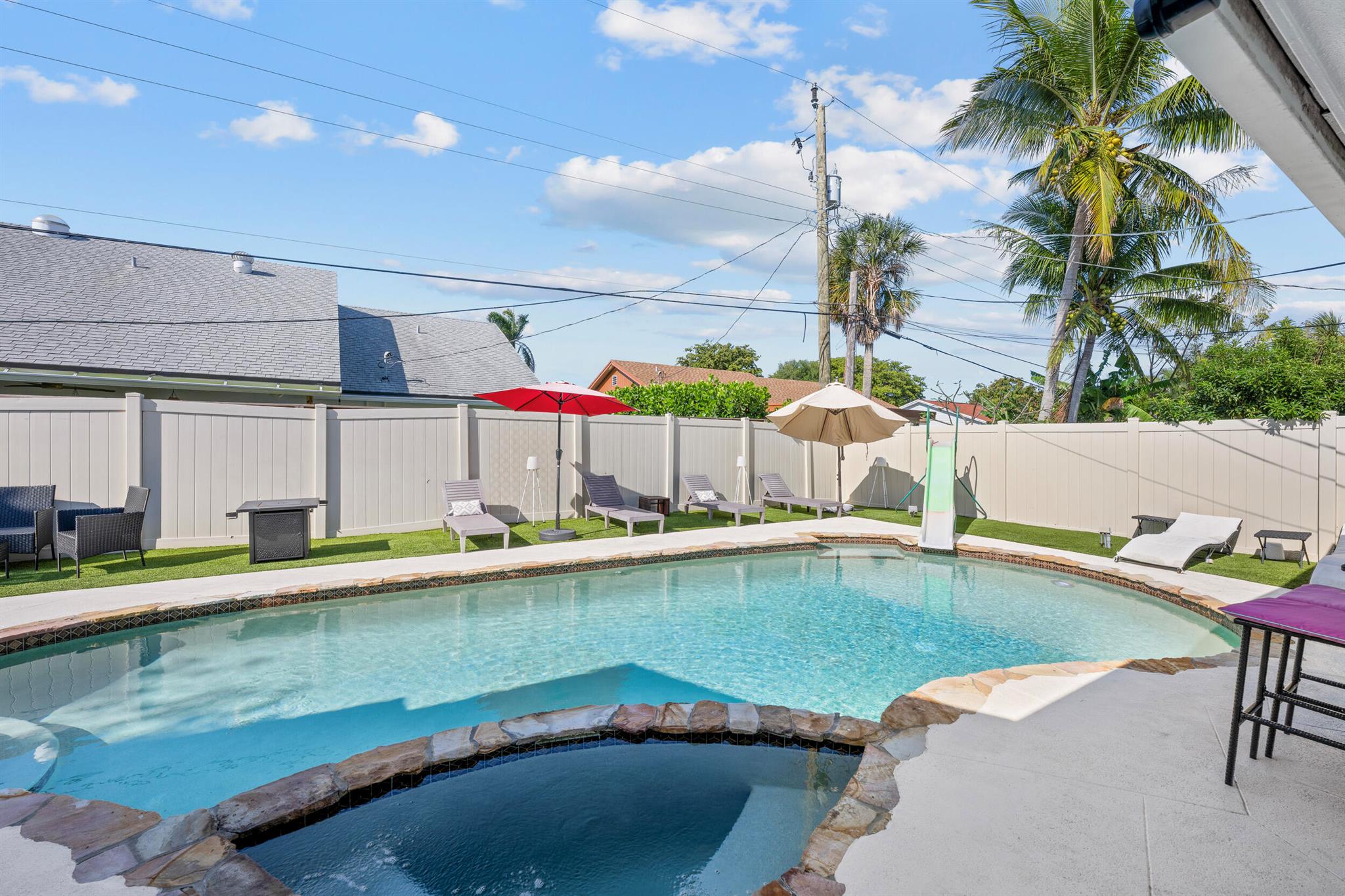 Welcome to 729 Heron Dr, where tropical resort-style living meets modern luxury in the heart of East Delray Beach! Safe, family friendly neighborhood with a fantastic location close to Atlantic Ave, Downtown Beach and Beach. This beautifully updated home features a freeform heated pool and spa, complete with a designer illuminated mosaic wall that sets the perfect ambiance for evening relaxation. The raised wood deck with a pergola provides the ideal space for unwinding, while the covered screened porch is perfect for entertaining or enjoying quiet moments. Inside, the open floor plan is highlighted by elegant tile flooring throughout, a newly remodeled kitchen with stunning granite countertops, and shaker-style soft-close cabinets and drawers. Pendant lighting adds a touch of