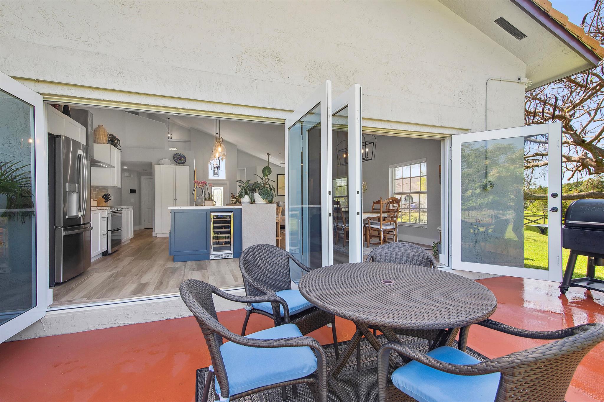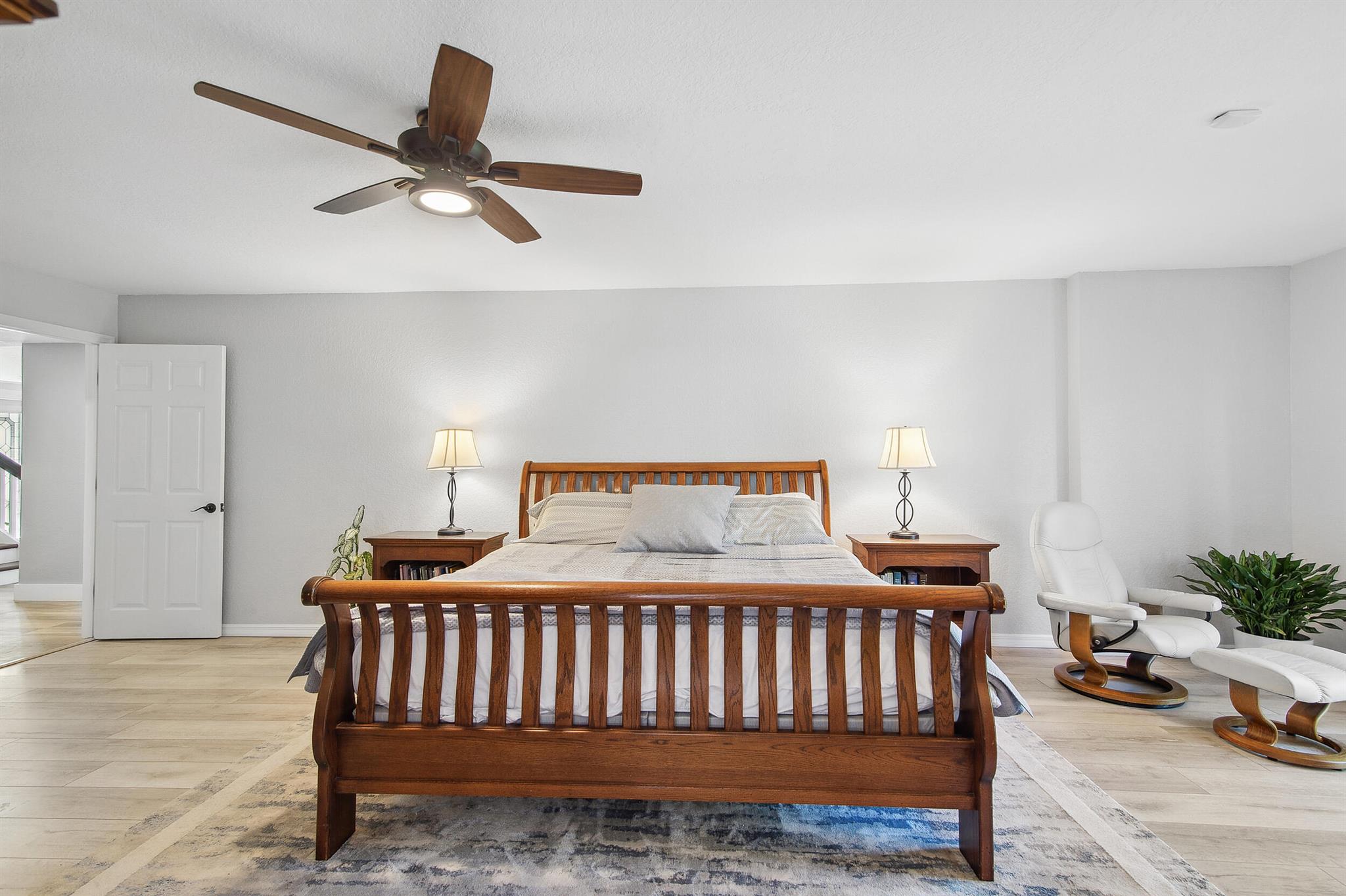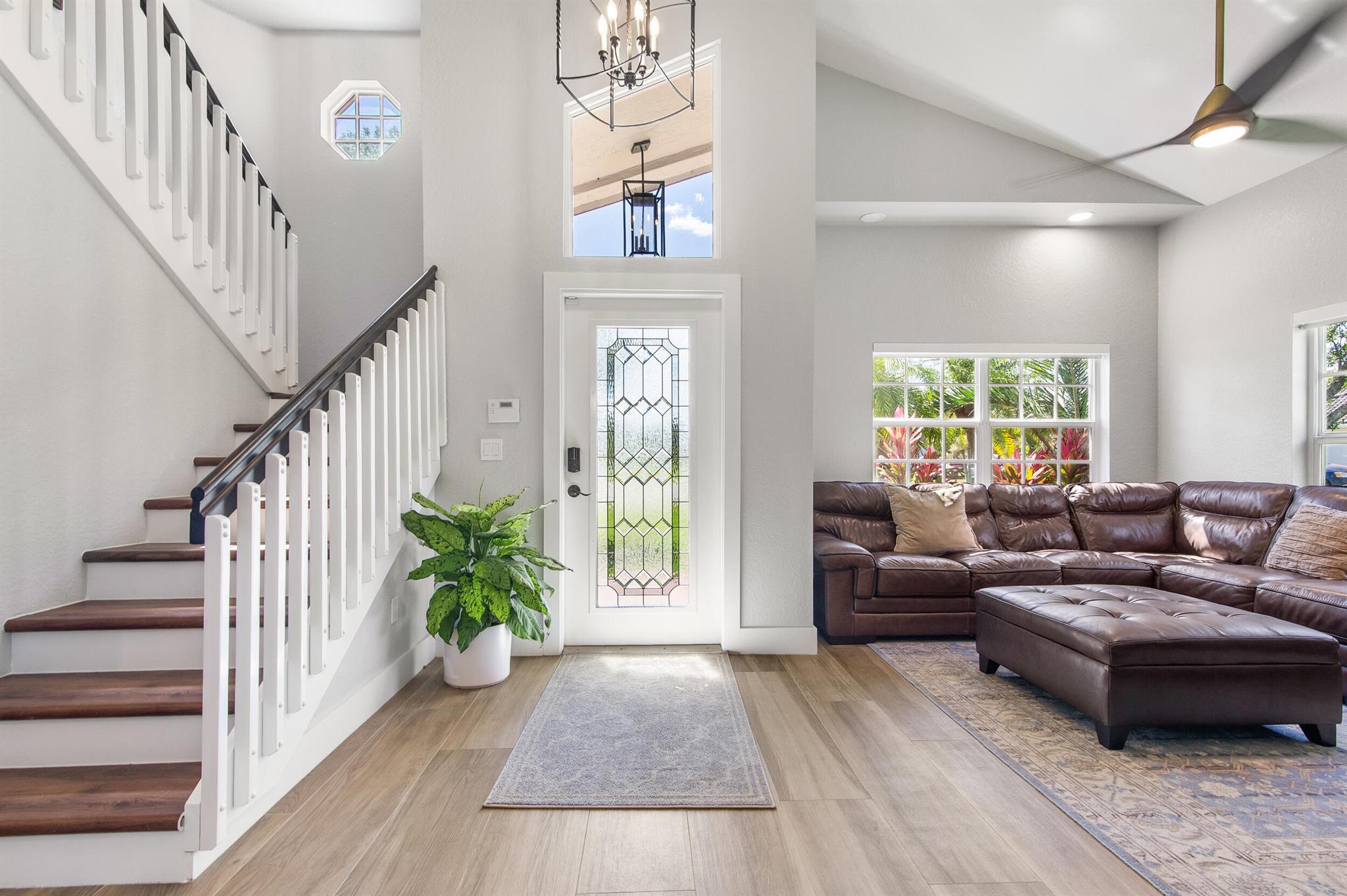 Nestled in a quiet cul-de-sac on an expansive 0.87-acre lot, this stunning 4-bedroom, 2.5-bath home offers 2,593 sq. ft. of thoughtfully designed living space. A huge concrete driveway provides ample parking for up to 10 cars or an RV, while the beautifully landscaped surroundings create a peaceful retreat.Step inside to find porcelain tile flooring in the living areas, soaring 20+ ft. ceilings, and automated blinds enhancing the home’s modern appeal. The fully remodeled kitchen boasts stainless steel appliances (2023), a large vent hood over the stove, Porcelain countertops, a wine cooler, extra bar cabinet space, and recessed lighting.The spacious master suite, located on the ground floor, features engineered laminate flooring, a luxurious en-suite bathroom with dual sinks, and