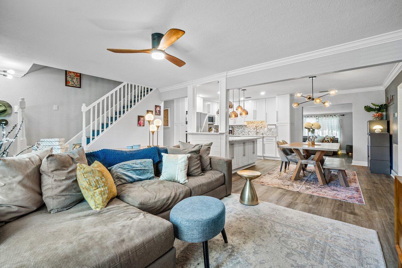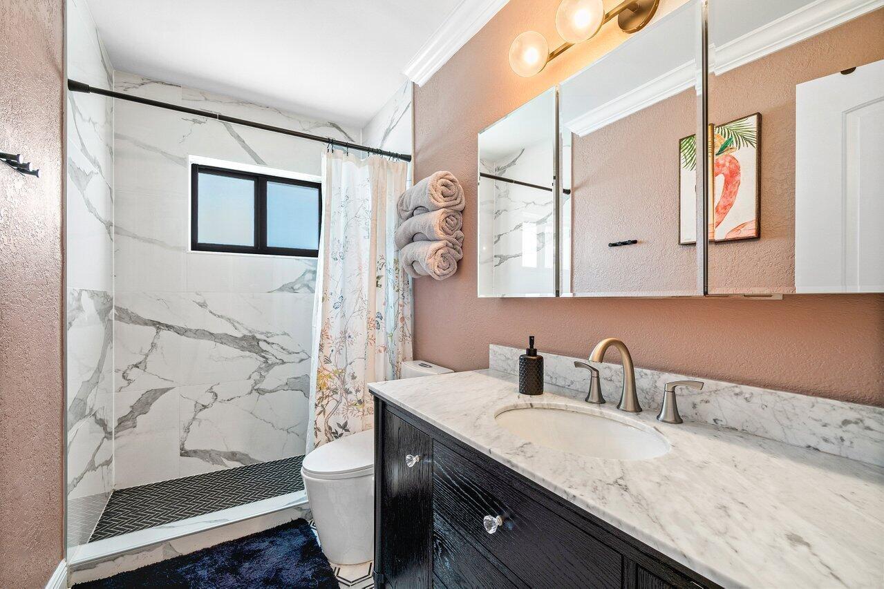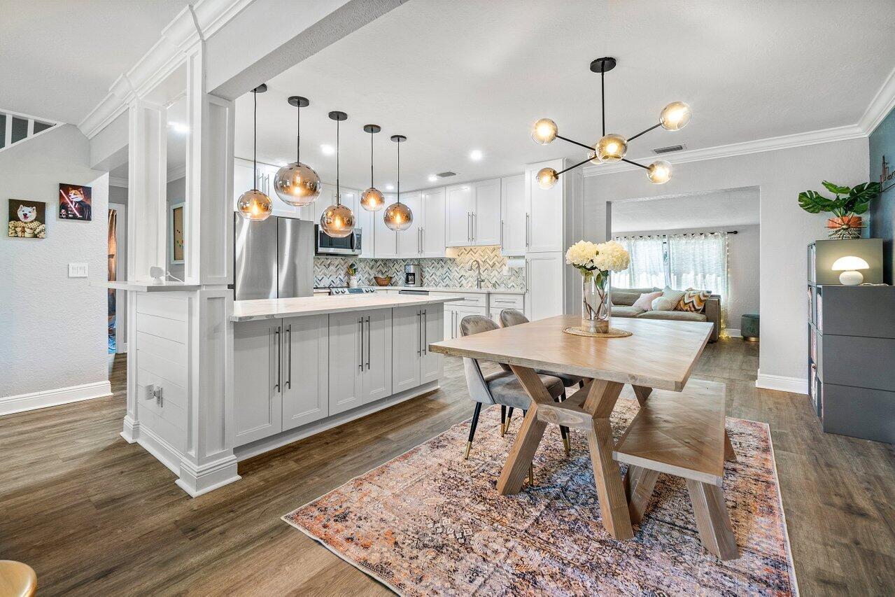 One of the larger homes in the vibrant and intimate Palm Beach Gardens Estates community, 293 Balsam features over 2,300 square feet under air with five bedrooms and two bathrooms. This home gives a family room to spread out with three lower level bedrooms and two upstairs bedrooms. The open kitchen, dining area and living room is ideal for family gatherings and entertaining. The enclosed Florida room creates the option for an additional den, playroom or home office. This home is newly renovated and move-in ready. Have peace of mind knowing all major components have been updated and taken care of: new roof, new impact windows, new A/C and a termite bond. Additionally, the kitchen, bathrooms and flooring have been updated including new Samsung kitchen appliances, marble tile in the