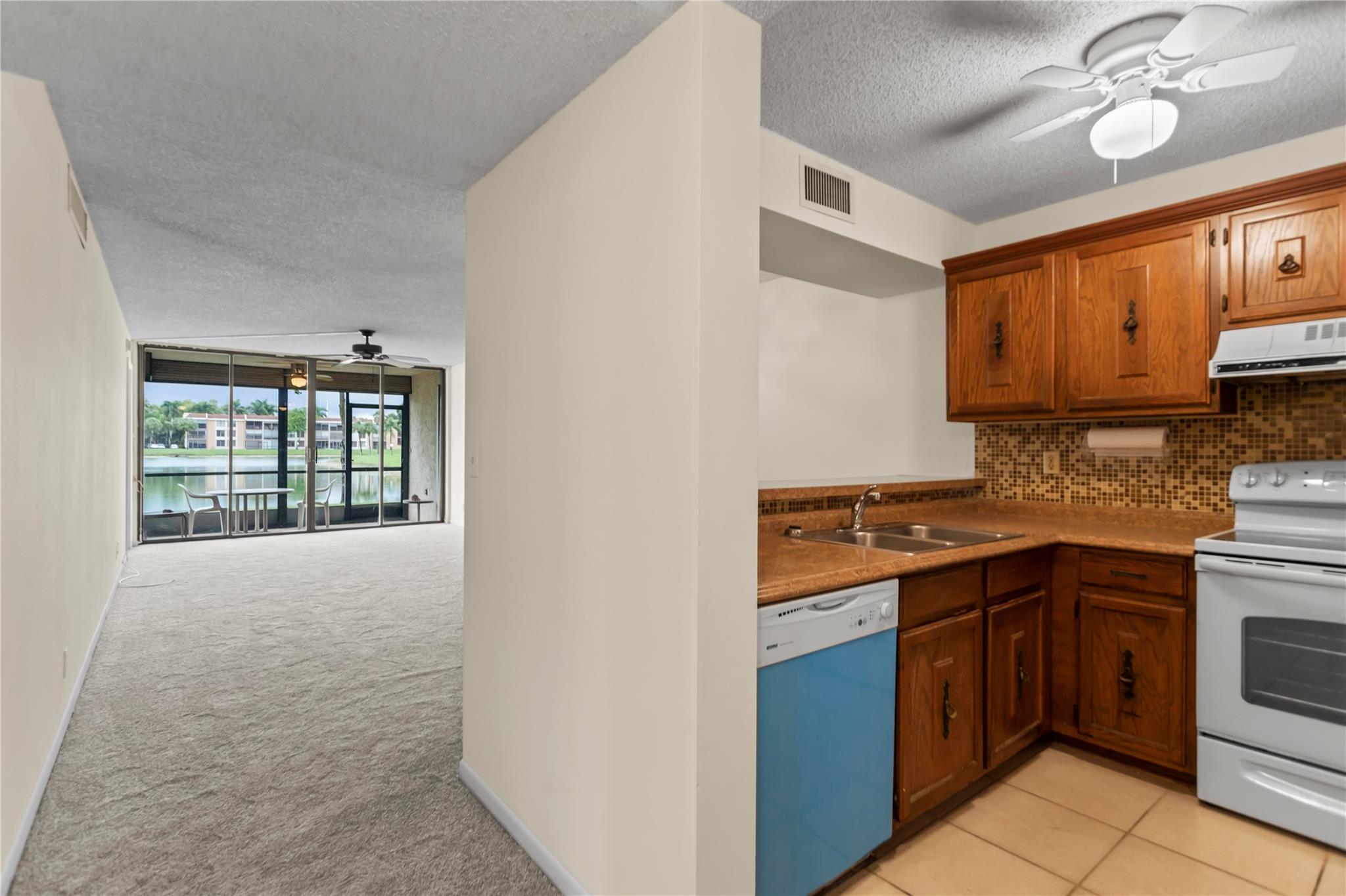 Rarely available first floor condo with stunning lake view. Brand new carpeting throughout and open floor plan. Kitchen opens to living room, extra-large bedrooms and a split floor plan and two full bathrooms. Private screened patio overlooking waterfront views and lush green landscaping. Full size washer and dryer, foyer entry way, and kitchenette with window. This 55+ neighborhood is centrally located with easy access to all your daily errands and offers a great active lifestyle environment.