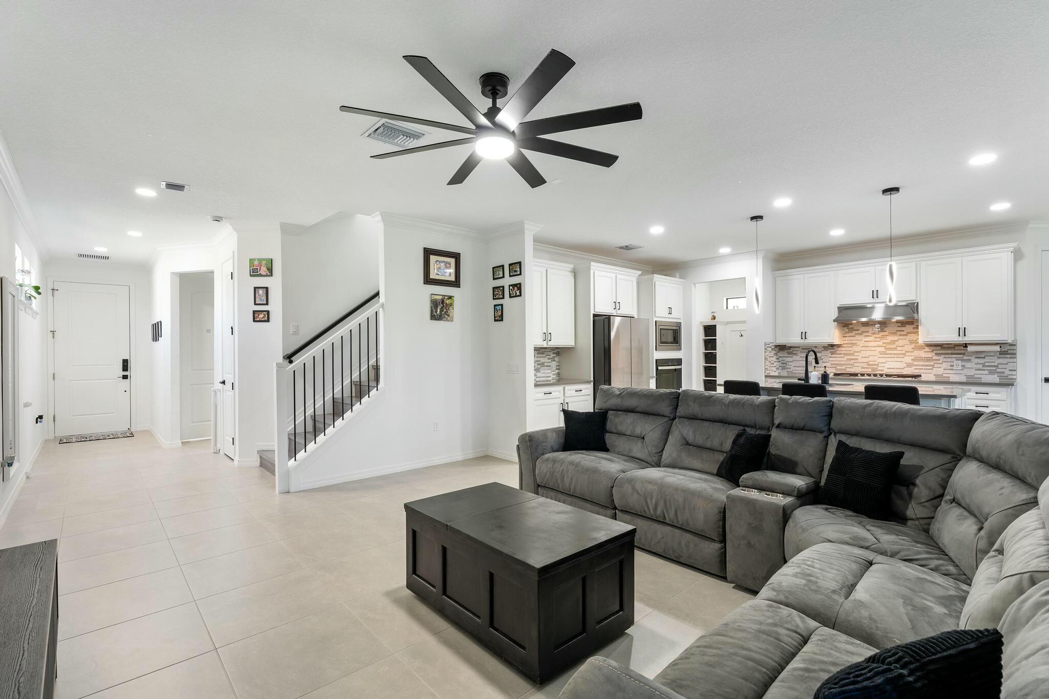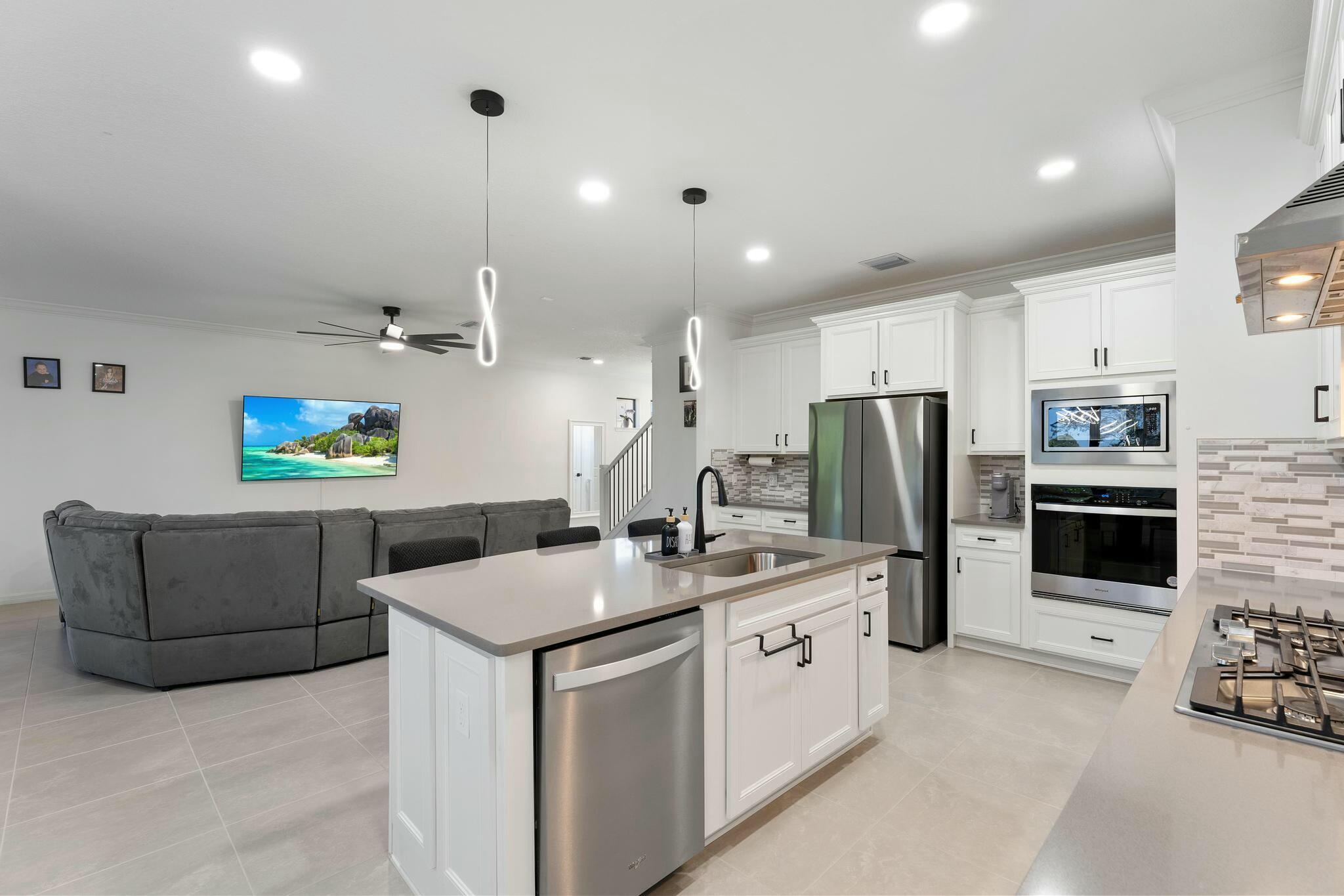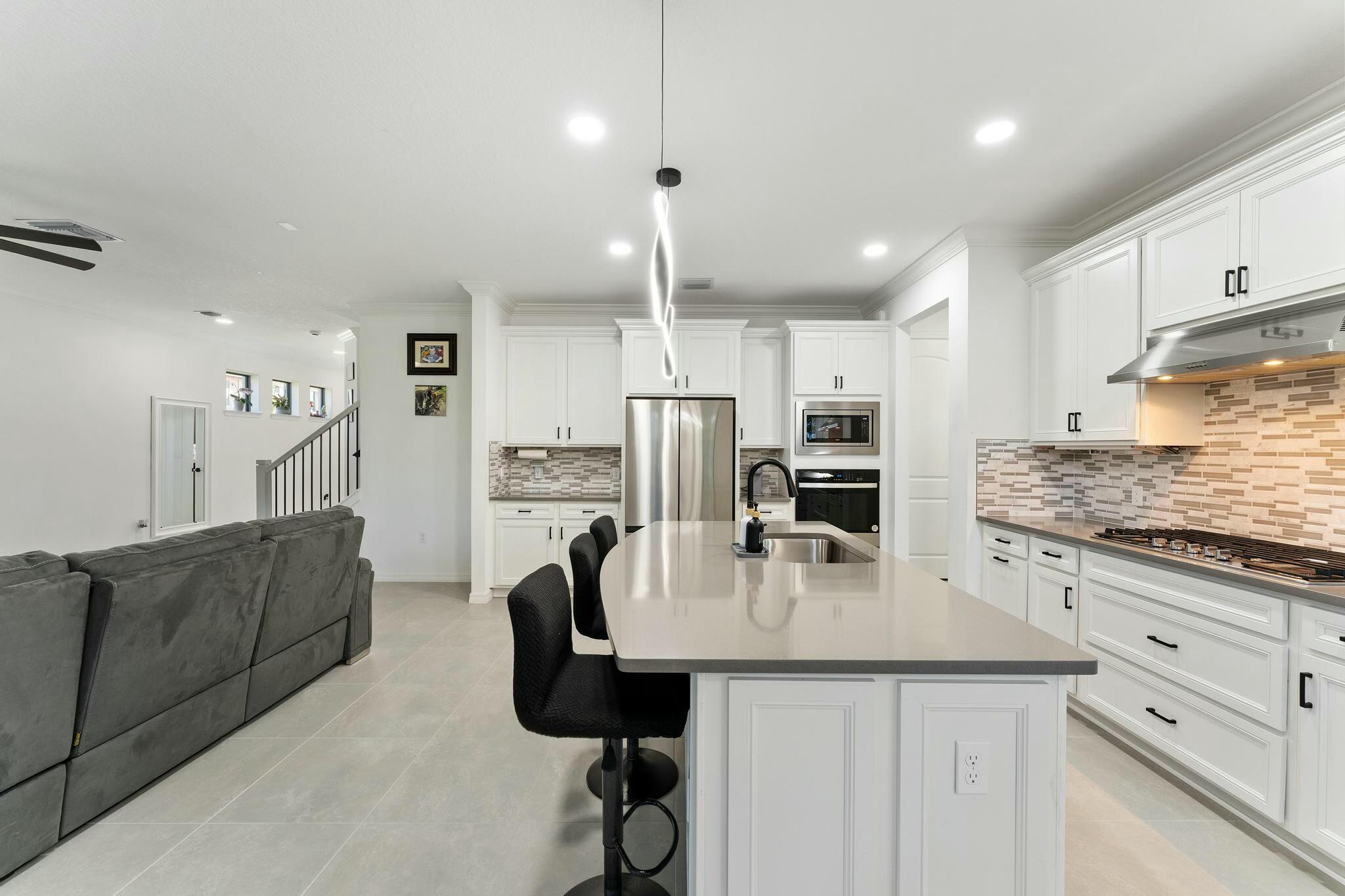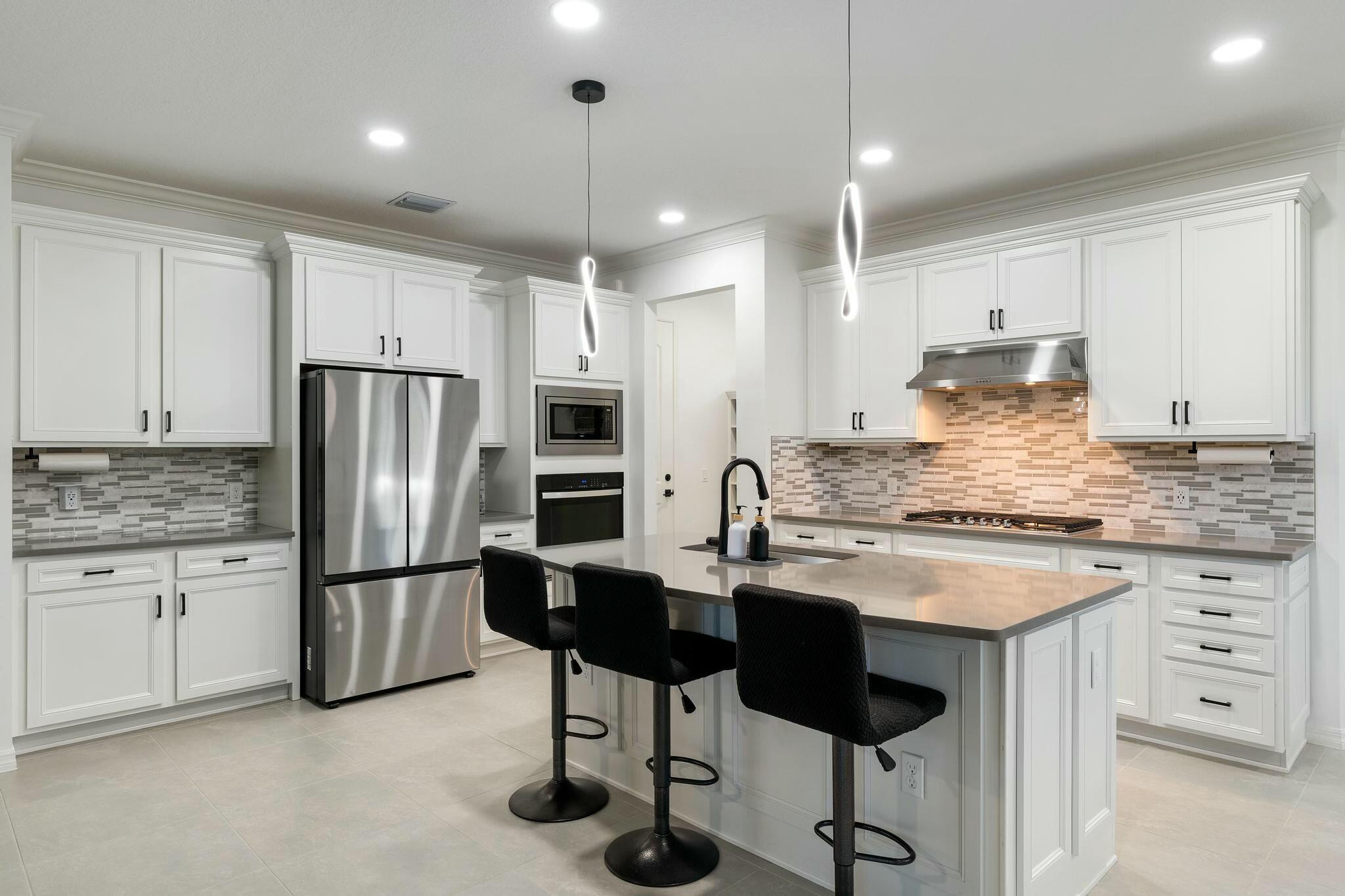 Stunning, modern 2023-Built home in the sought-after gated community of The Fields. This beautifully designed home offers 5 spacious bedrooms and 4 full bathrooms, including a convenient first-floor bedroom and bath. Situated on a desirable corner lot, this residence features impact windows, gas appliances, solid wood kitchen cabinets and elegant quartz countertops. The chef’s kitchen boasts a double pantry for ample storage. Enjoy energy efficiency with a tankless water heater and an alkaline water filtration system for the entire home. Outdoors, relax in a permanently installed outdoor trim lighting within the fenced yard. Additional perks include a 2-car garage with ceiling storage racks. Don’t miss this modern masterpiece!