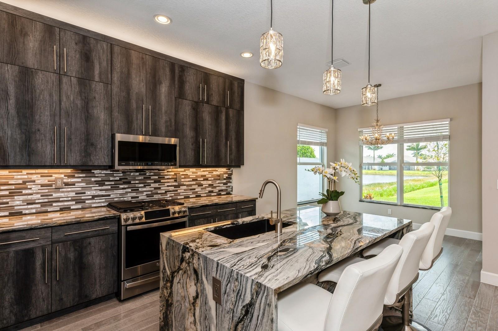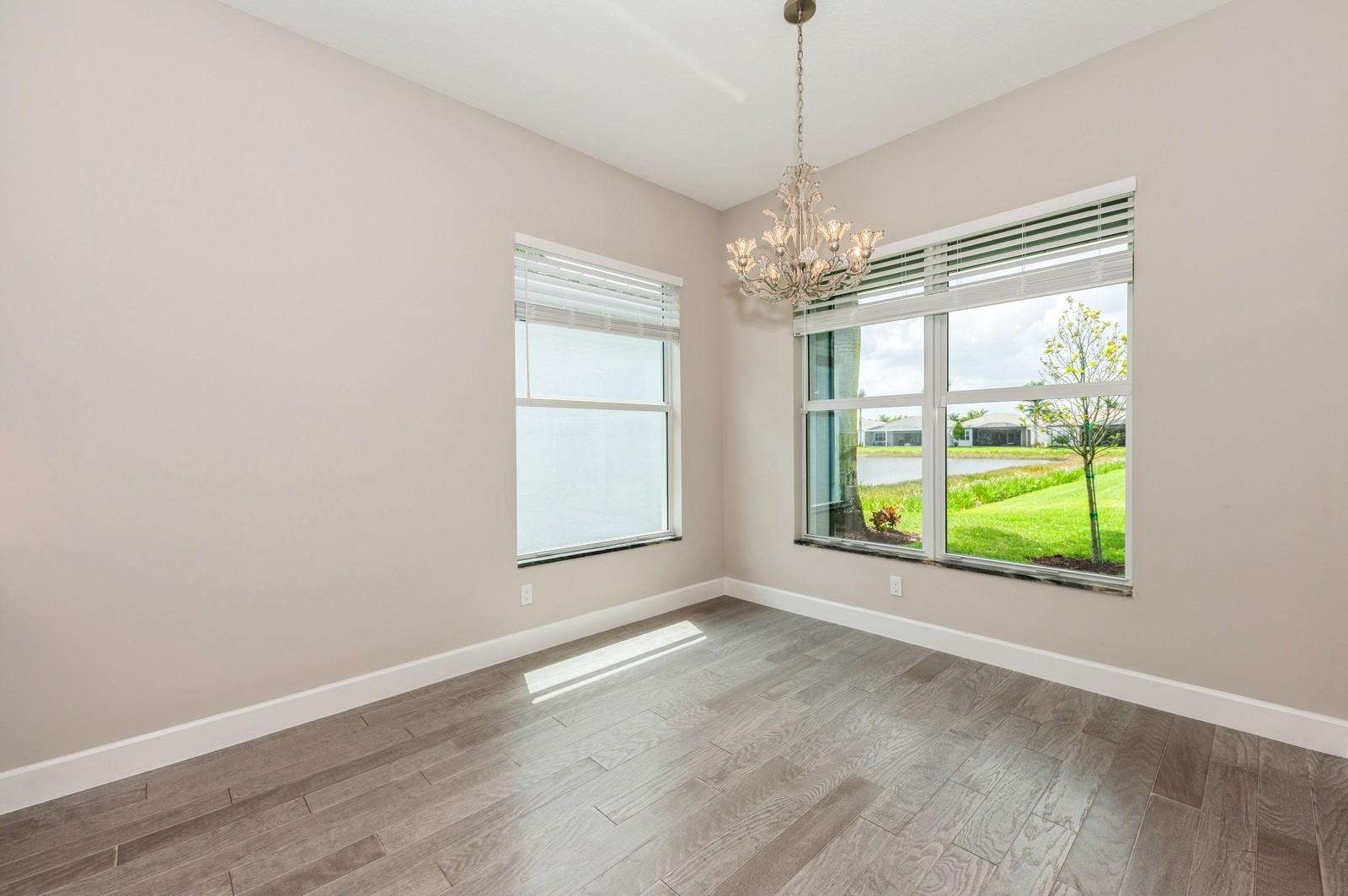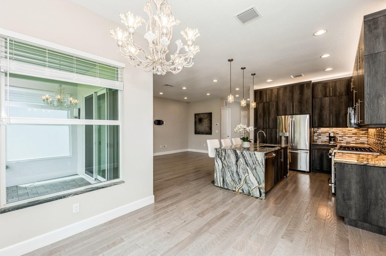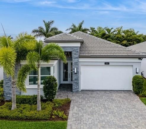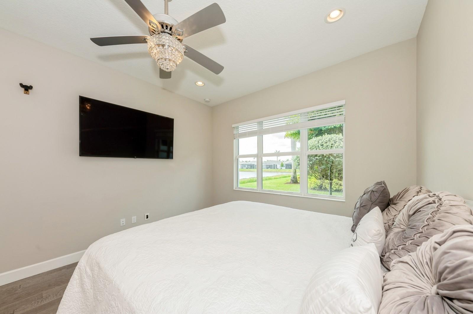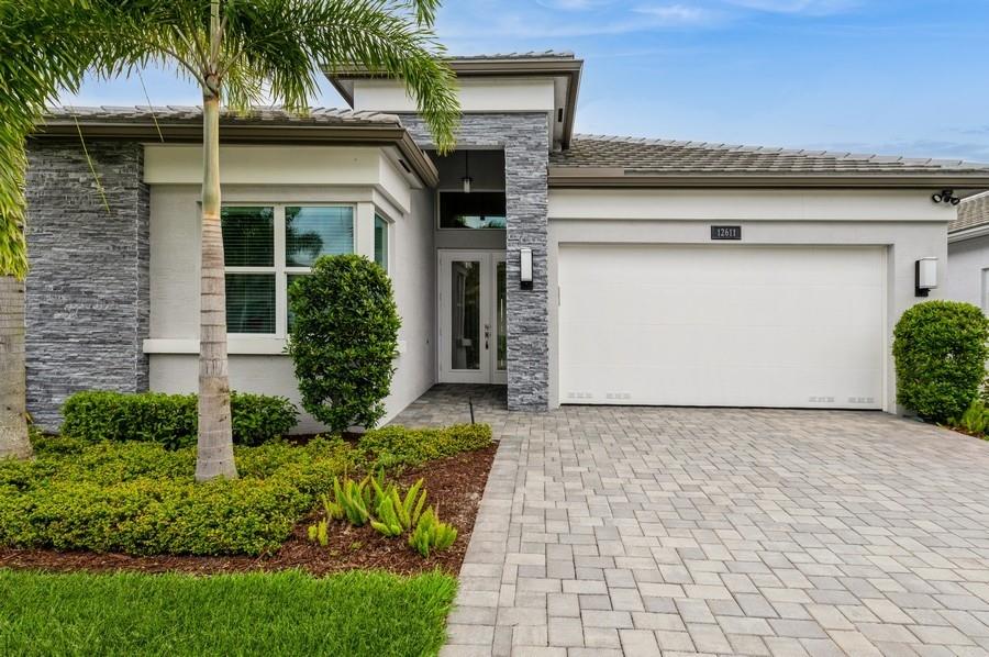 Why wait for new construction when you can move into this nearly new home in Valencia Sound? This premium lot offers lake views and stunning sunsets. Contemporary stacked stone front home with a neutral palate that boasts custom hardwood floors throughout, a designer kitchen with Brazilian quartzite waterfall counters with matching sills, custom undermount sink, stainless steel appliances with gas cooking, central vacuum, alarm system, epoxy garage floor, custom lighting and custom blinds. The study/home office could easily become a third bedroom. The 38,000 sq. ft. clubhouse offers resort-style pools, spa, outdoor bar, indoor sports bar, gourmet dining, a state-of-the-art gym, tennis & pickleball courts, ballroom, game rooms and more. The luxurious active adult lifestyle awaits you now!