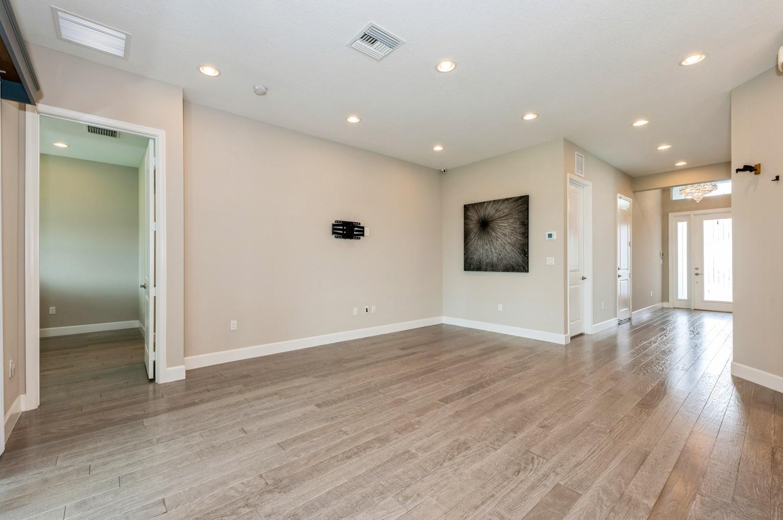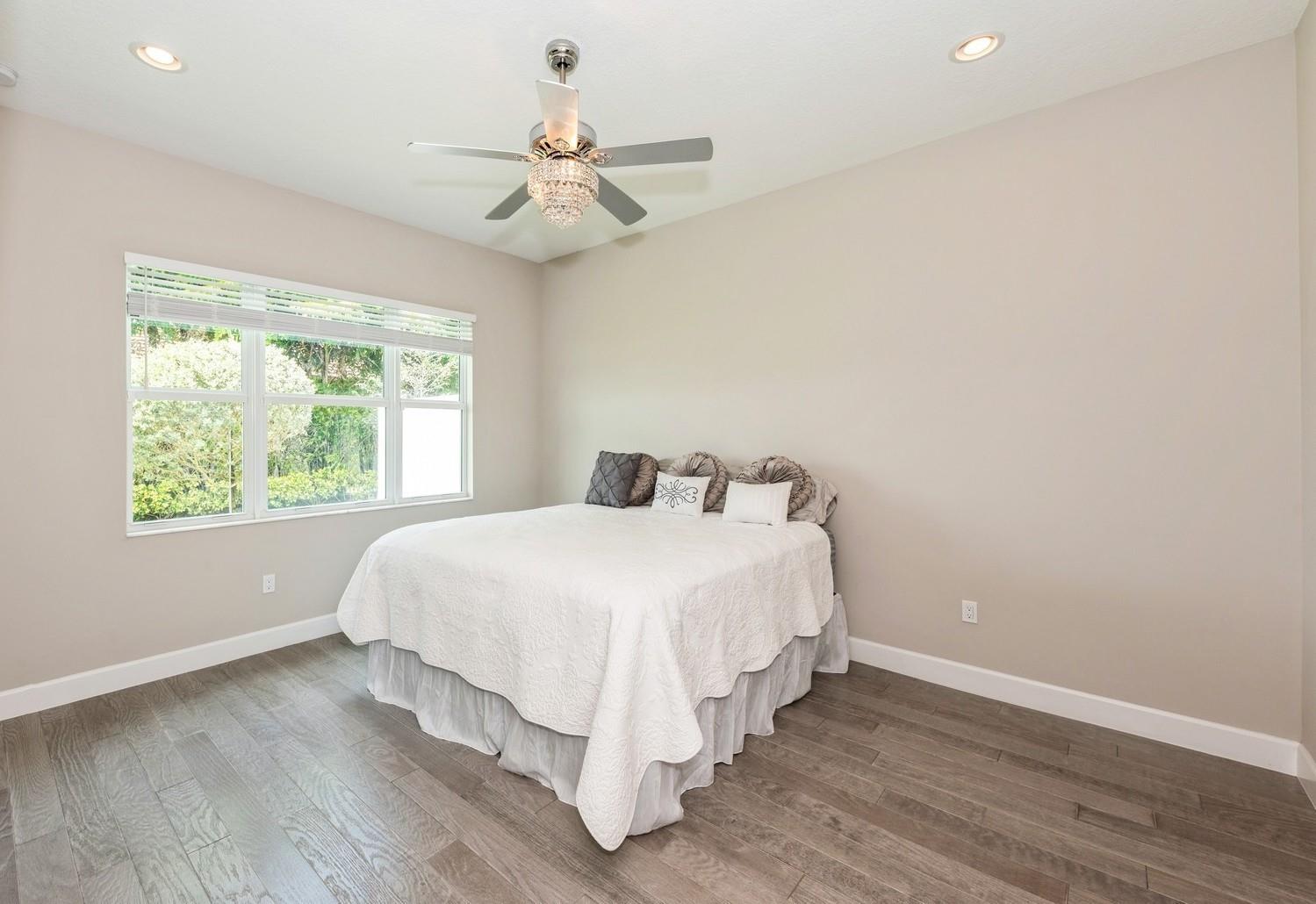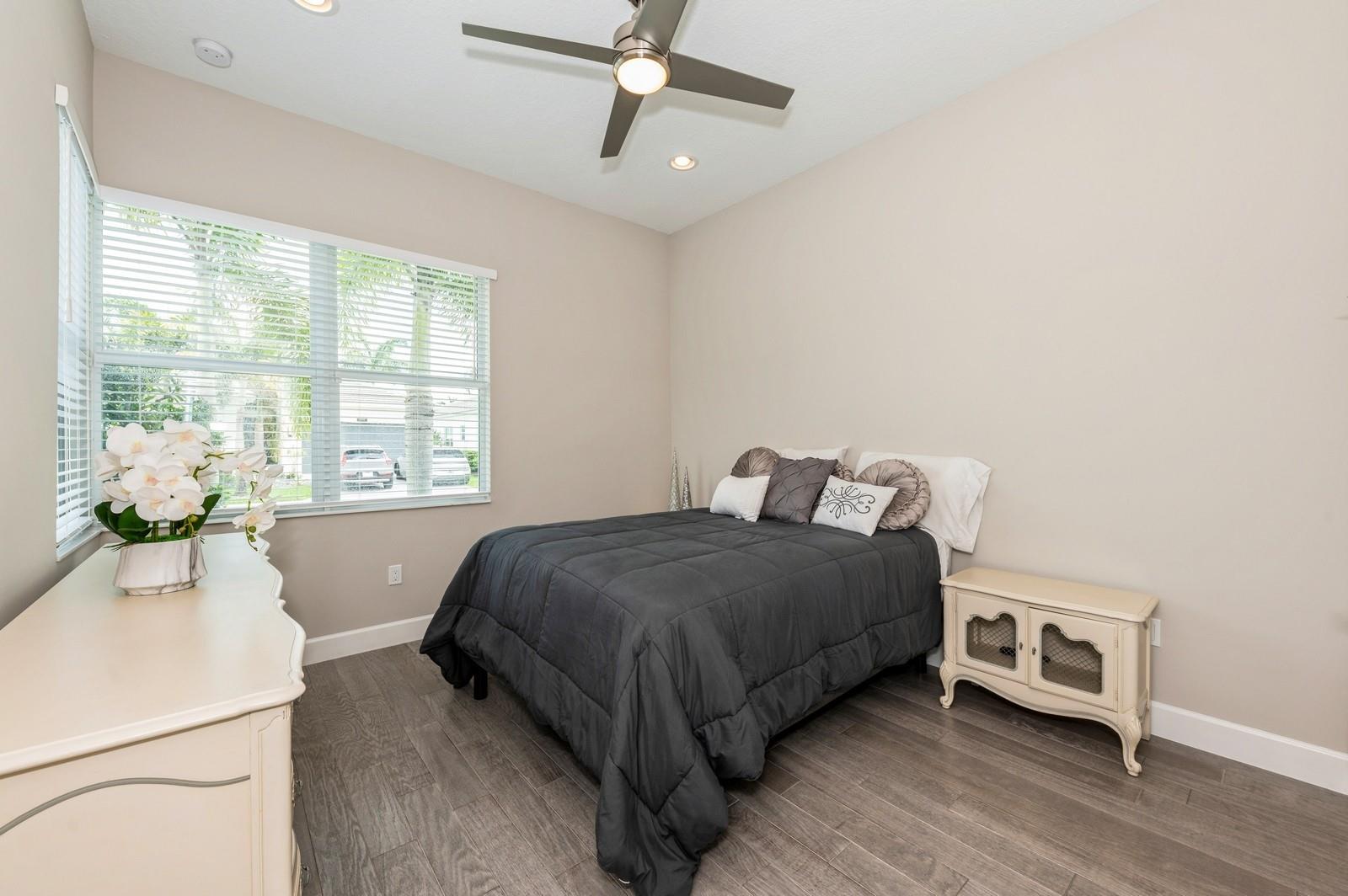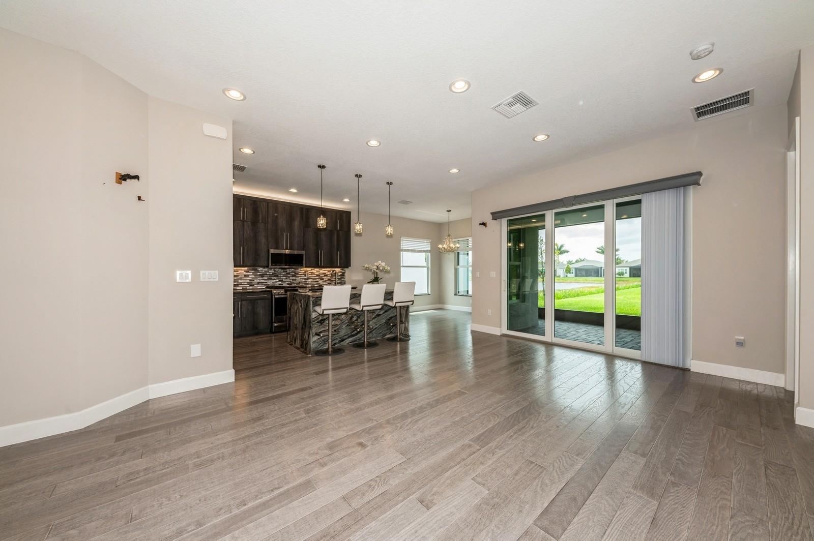 Why wait for new construction when you can move into this nearly new home in Valencia Sound? This premium lot offers lake views and stunning sunsets. Contemporary stacked stone front home with a neutral palate that boasts custom hardwood floors throughout, a designer kitchen with Brazilian quartzite waterfall counters with matching sills, custom undermount sink, stainless steel appliances with gas cooking, central vacuum, alarm system, epoxy garage floor, custom lighting and custom blinds. The study/home office could easily become a third bedroom. The 38,000 sq. ft. clubhouse offers resort-style pools, spa, outdoor bar, indoor sports bar, gourmet dining, a state-of-the-art gym, tennis & pickleball courts, ballroom, game rooms and more. The luxurious active adult lifestyle awaits you now!