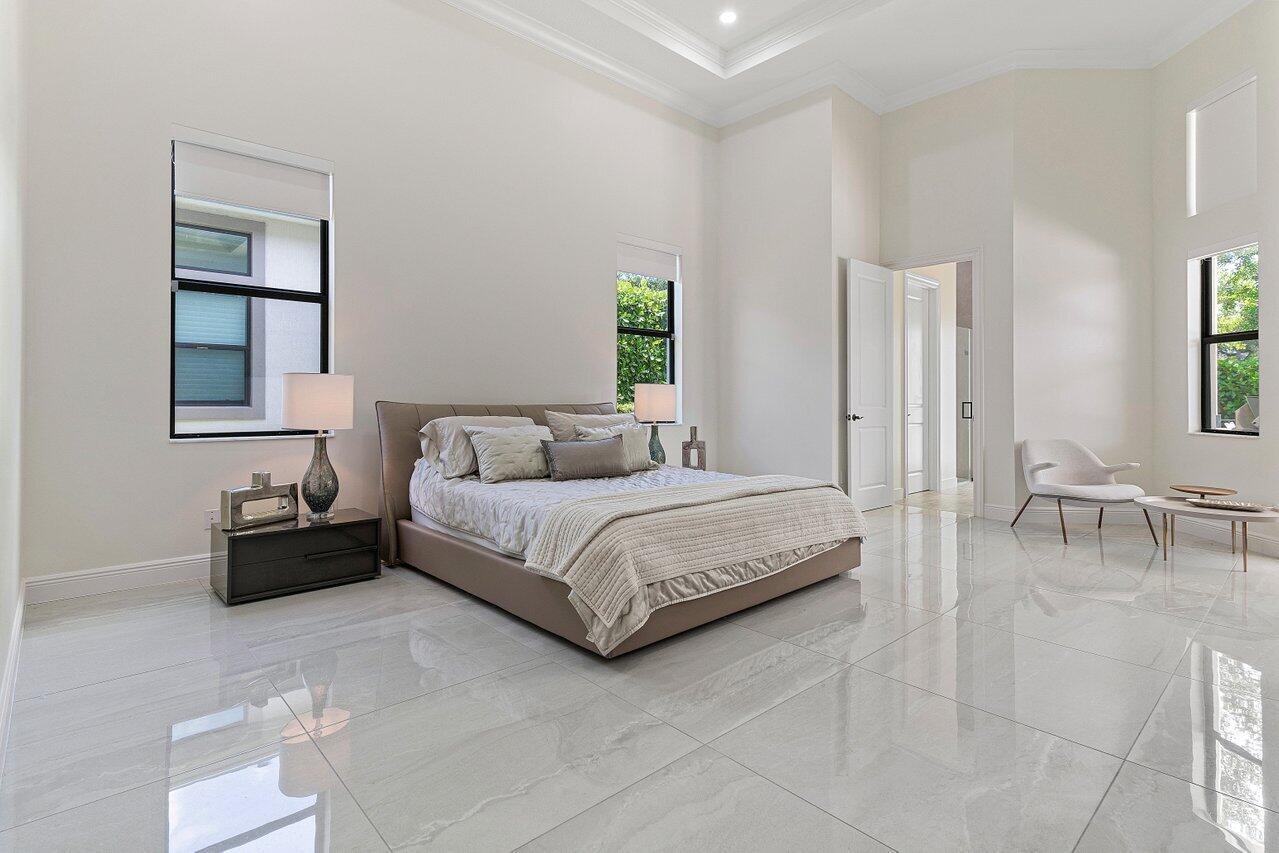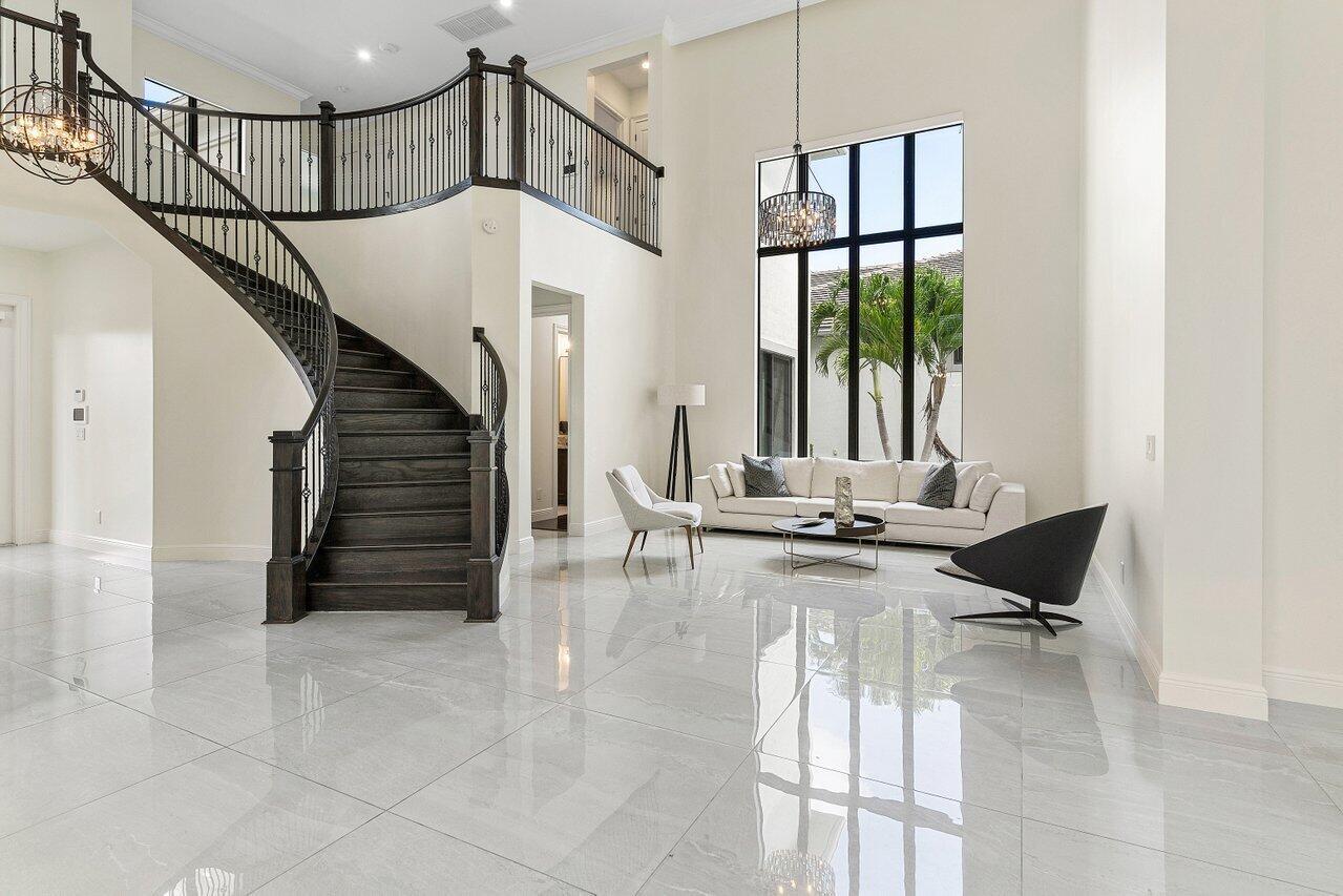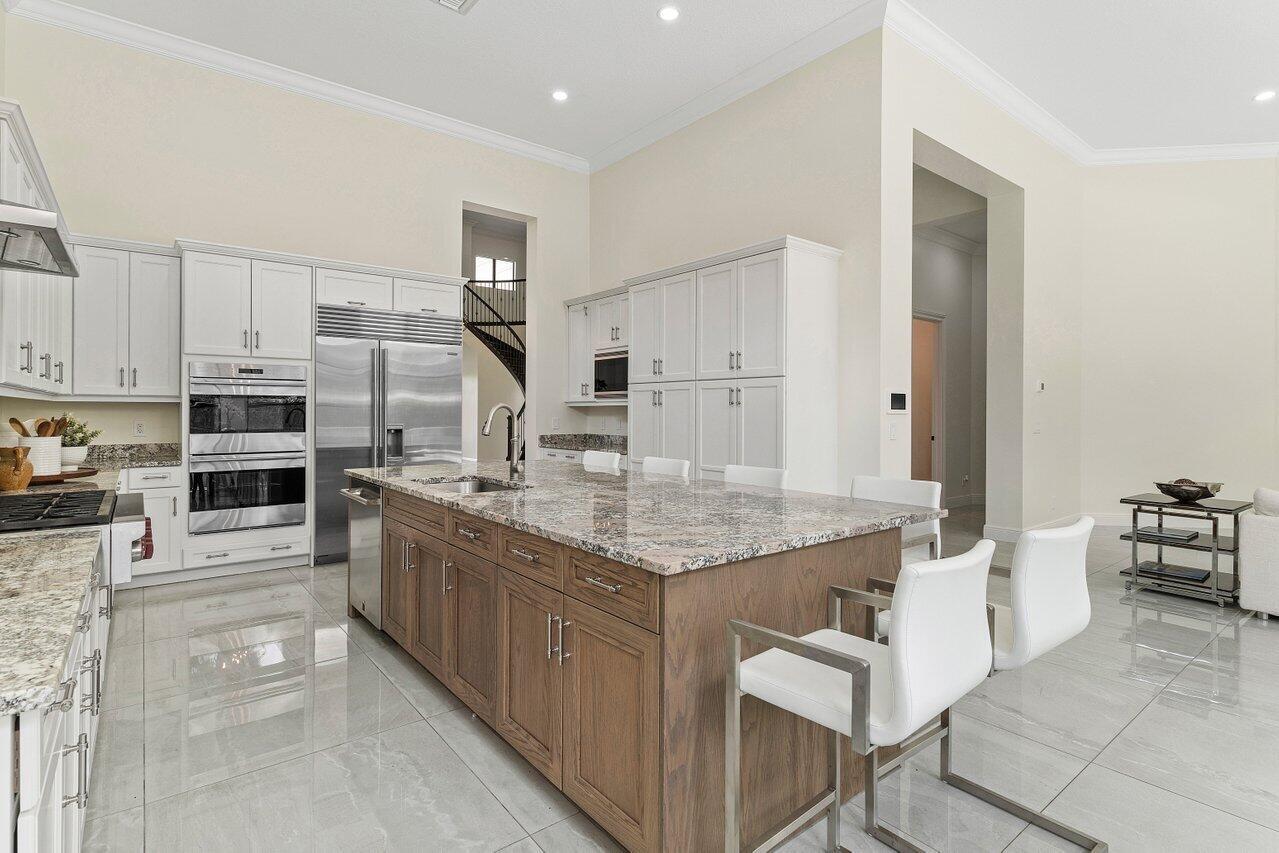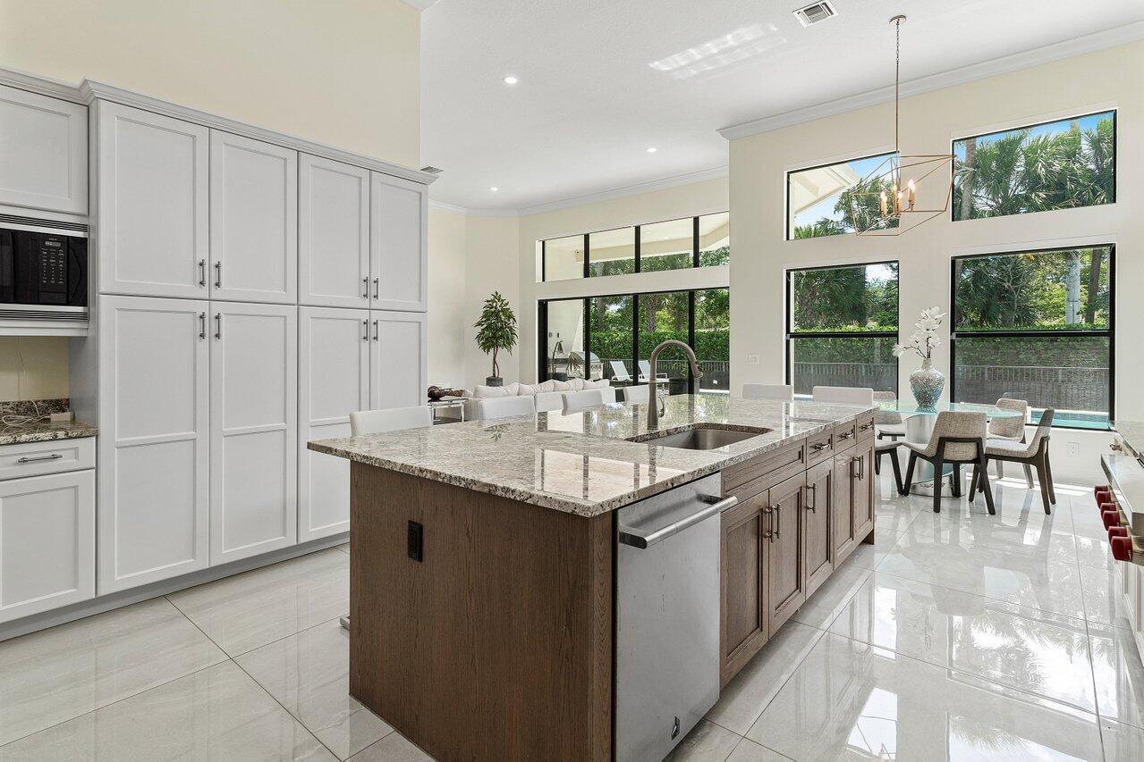 Step into this 5BD 6.5BA (plus office) in Royal Palm Polo to find a spacious and grand atmosphere, where soaring volume ceilings create an impressive sense of openness. Two living rooms provide ample space for both entertainment and relaxation, while large windows throughout the home invite abundant natural light, fostering an undeniably bright and welcoming ambiance. The stunning kitchen is the heart of the home, designed for both the avid home chef and the enthusiastic host. It features seating for six at its expansive central island, dual-tone cabinetry, a gas stove, and sleek stainless steel appliances. Adjacent to the kitchen, the breakfast area is surrounded by windows, offering a cheerful and inviting space to gather over coffee or a casual meal.