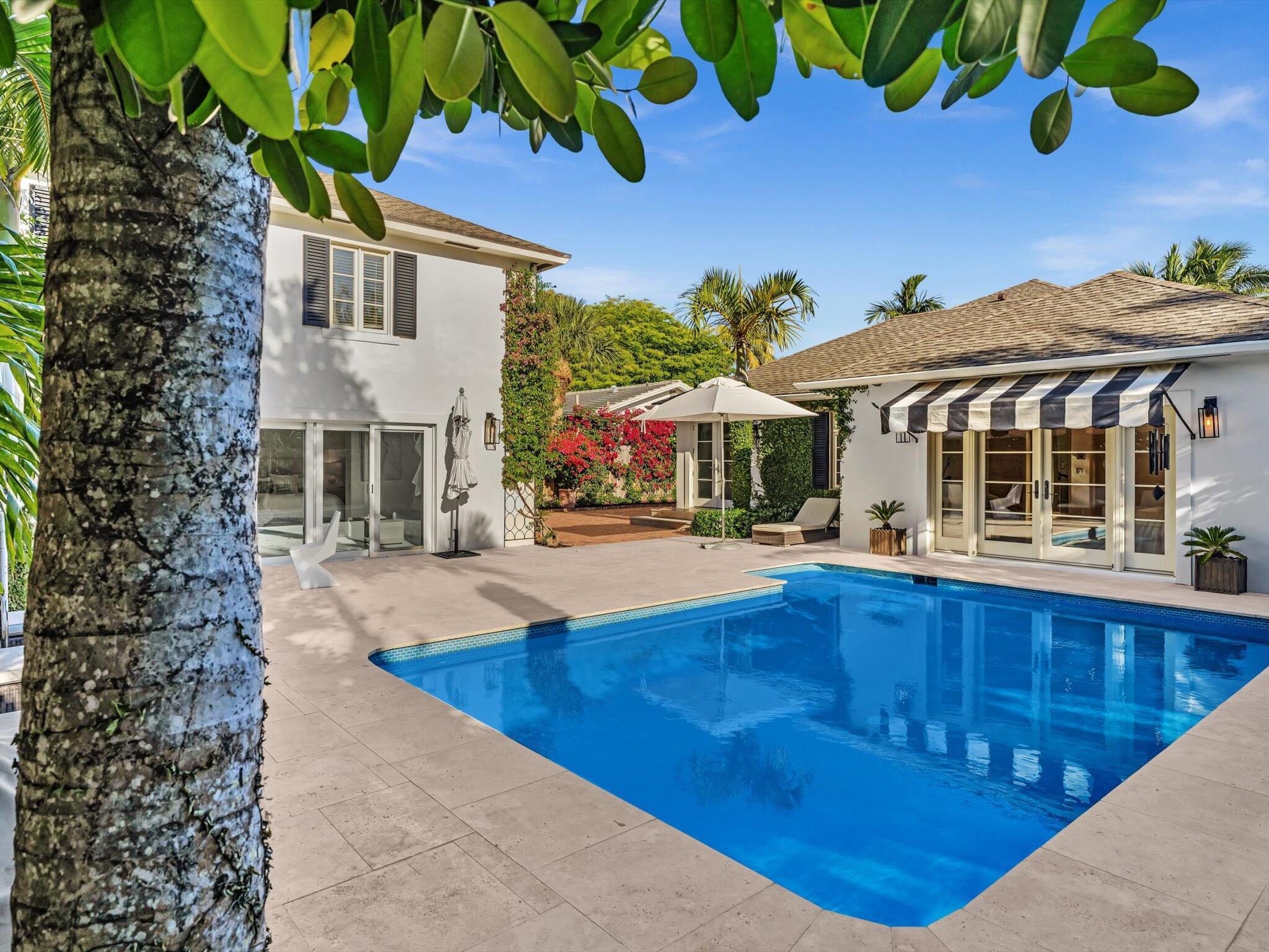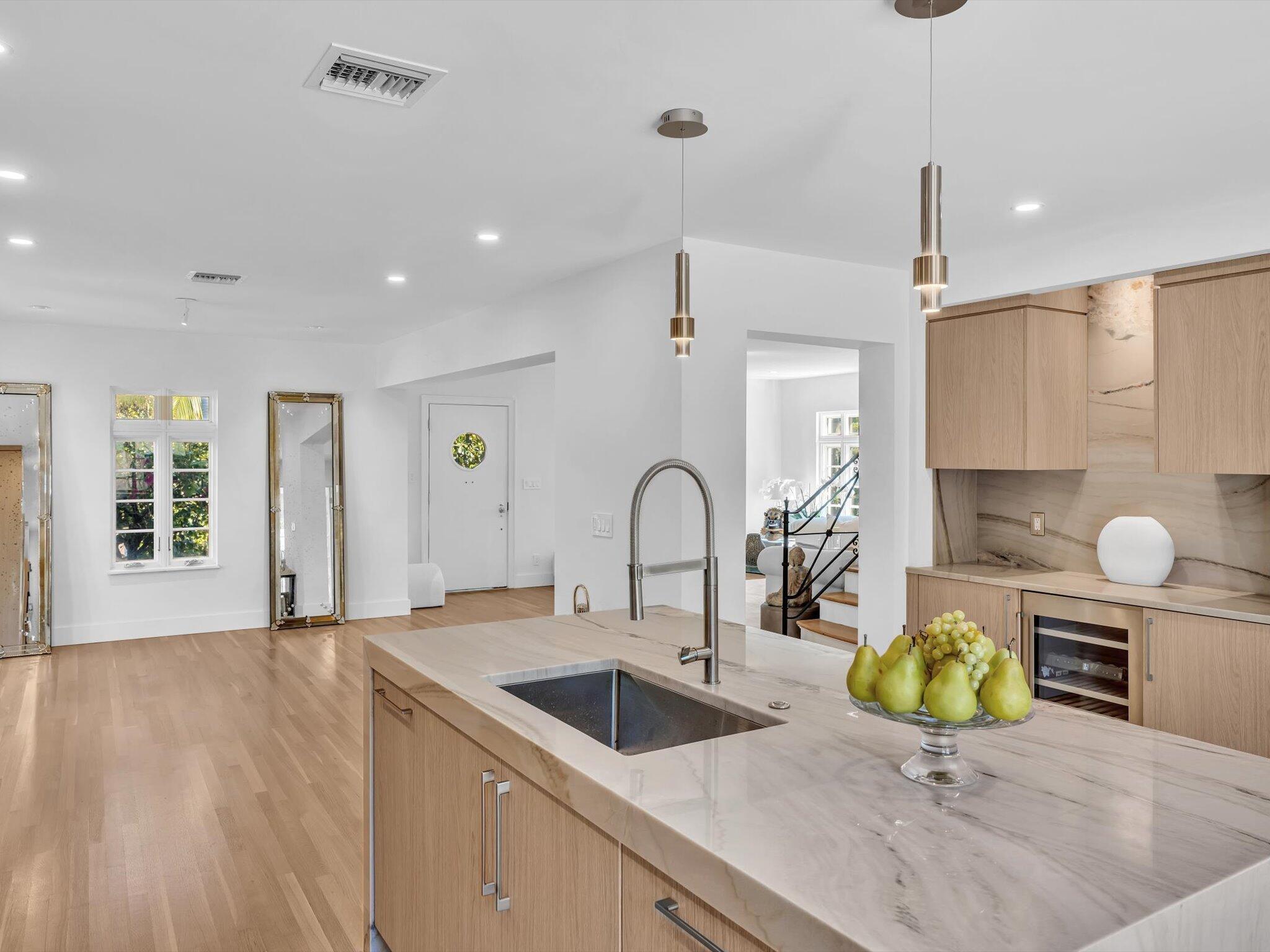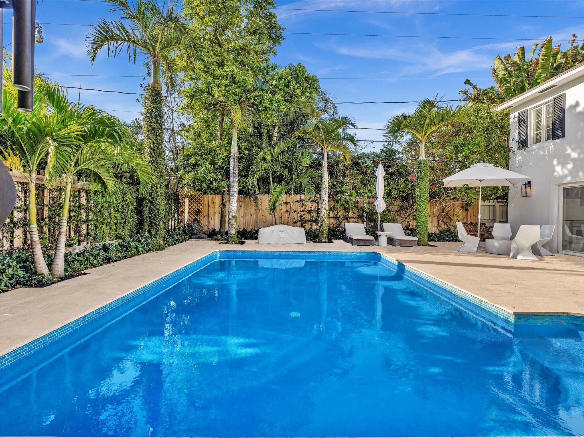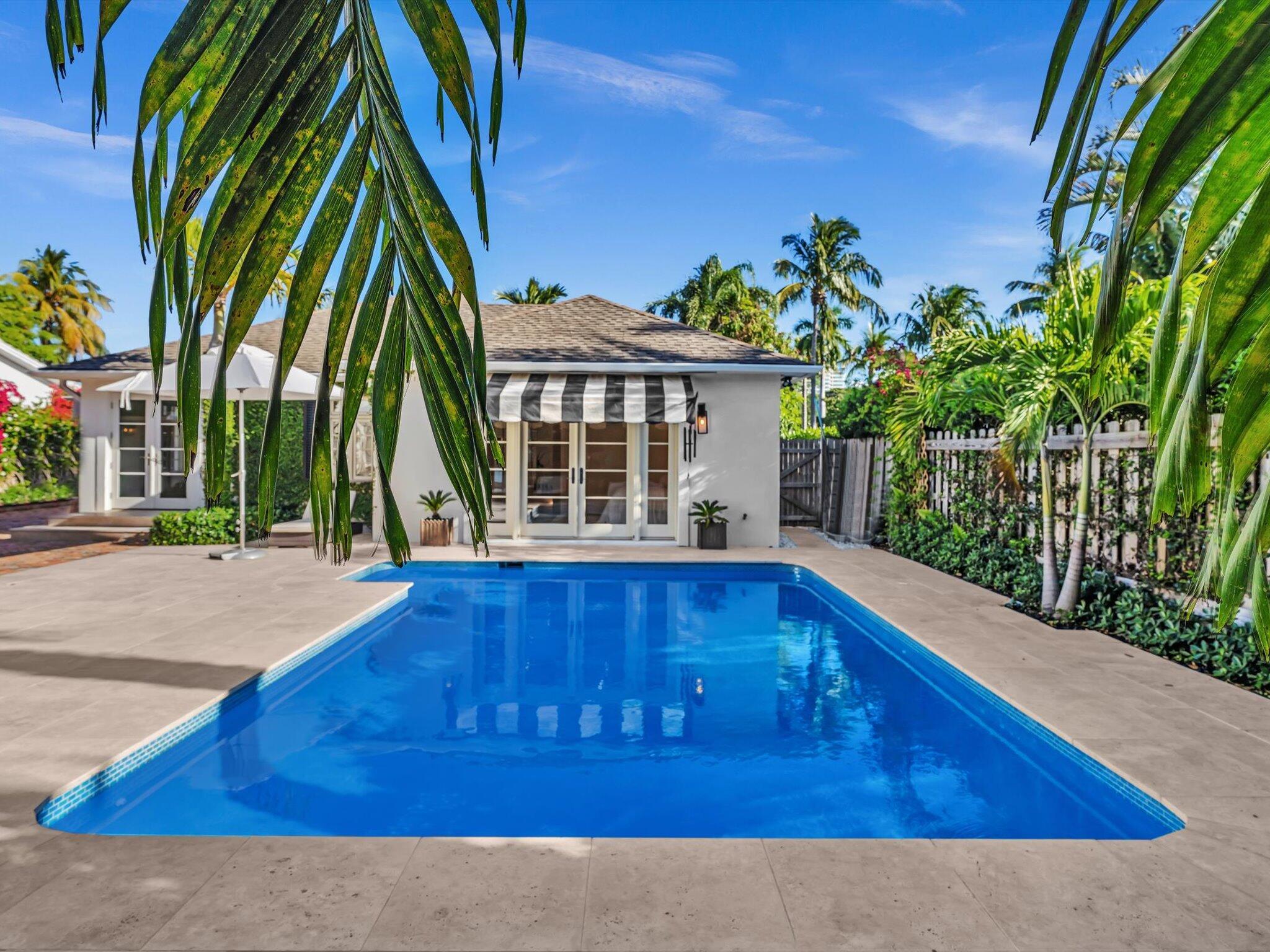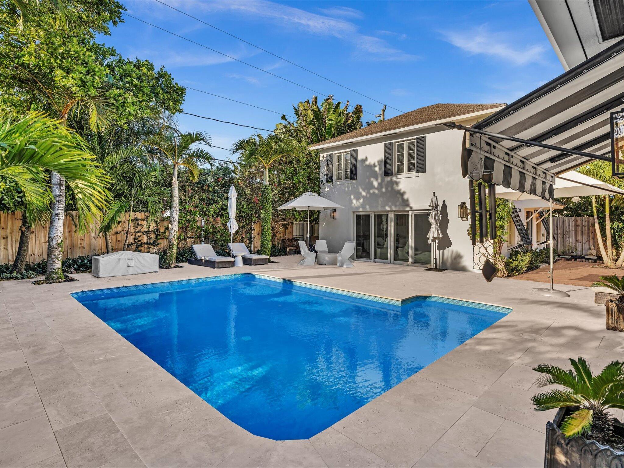 A rare offering in the heart of historic El Cid, this newly renovated estate exudes timeless sophistication and quiet luxury. Crafted with enduring CBS construction and reimagined with exquisite attention to detail, the 3BD/3.5BA main residence features bespoke white oak flooring, spa-inspired Botticino marble baths, and an oversized two-car garage. The separate guest house offers two fully appointed suites–each with its own kitchen and laundry–ideal for hosting or luxury rental income. Outdoor living shines with a 20×35 pool framed by travertine, manicured landscaping, and a Chicago brick courtyard perfect for serene entertaining. Just one block from Flagler Drive and minutes from the island, this is not just a home–it’s a statement. Own a legacy in El Cid.