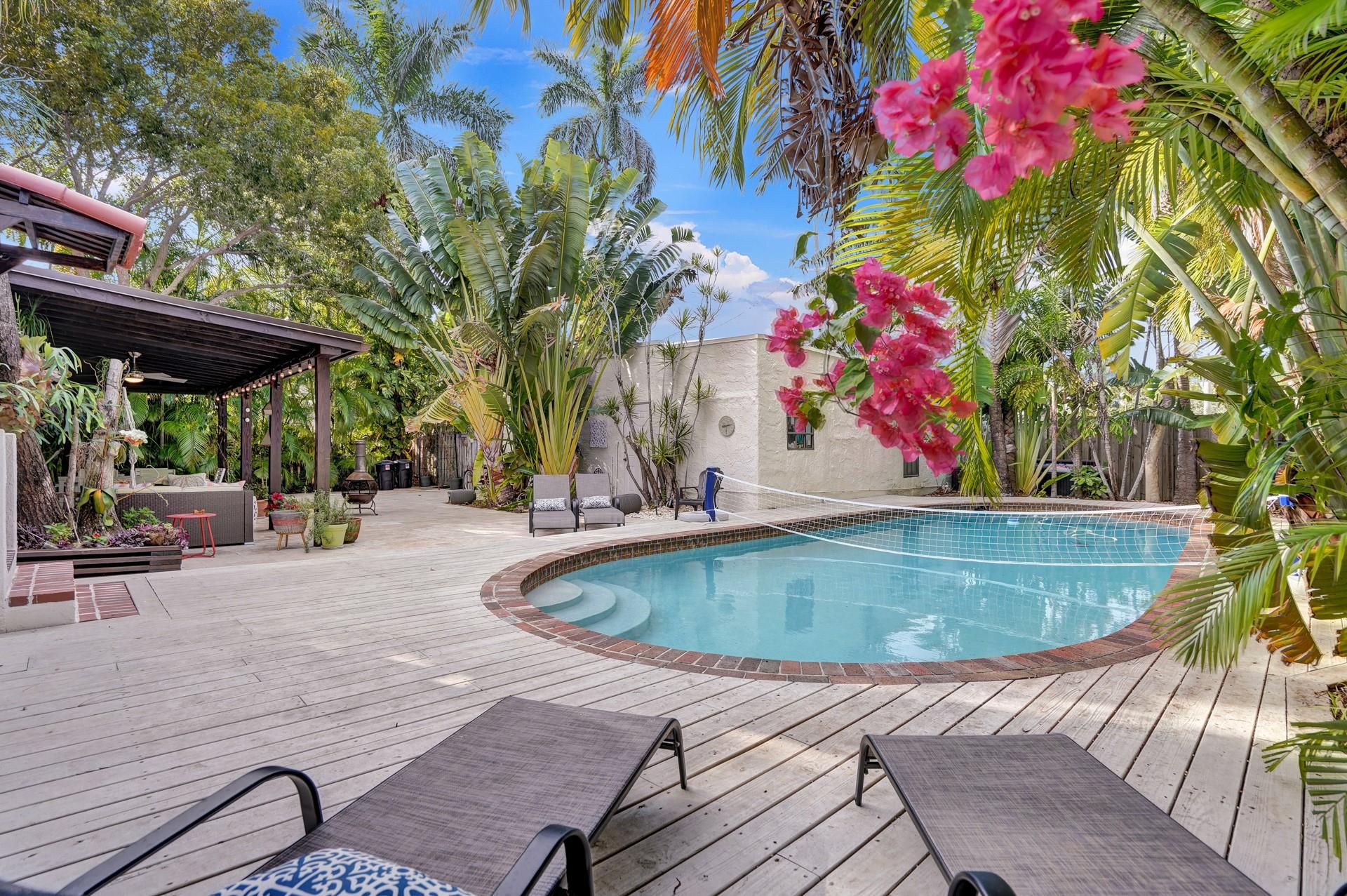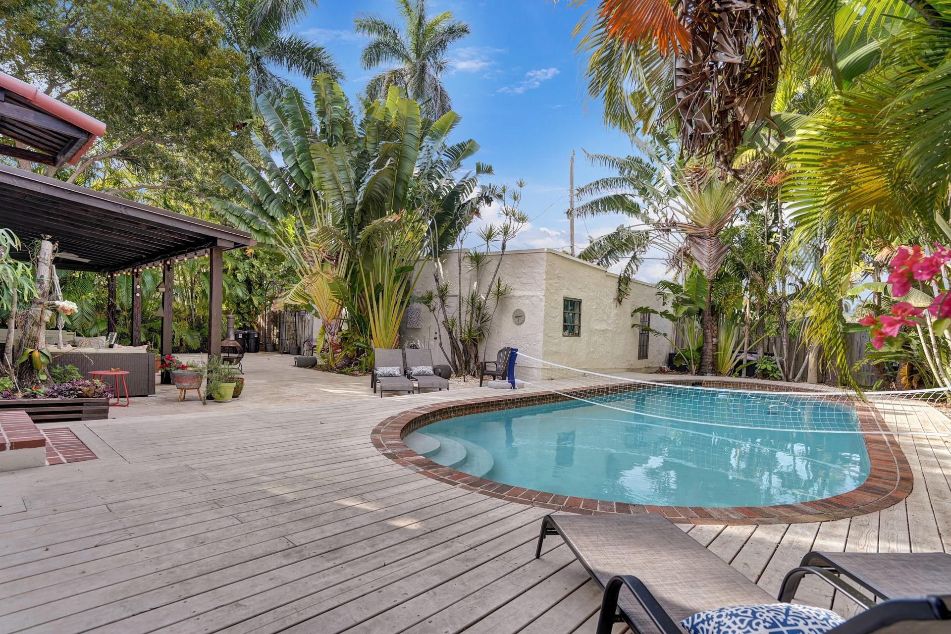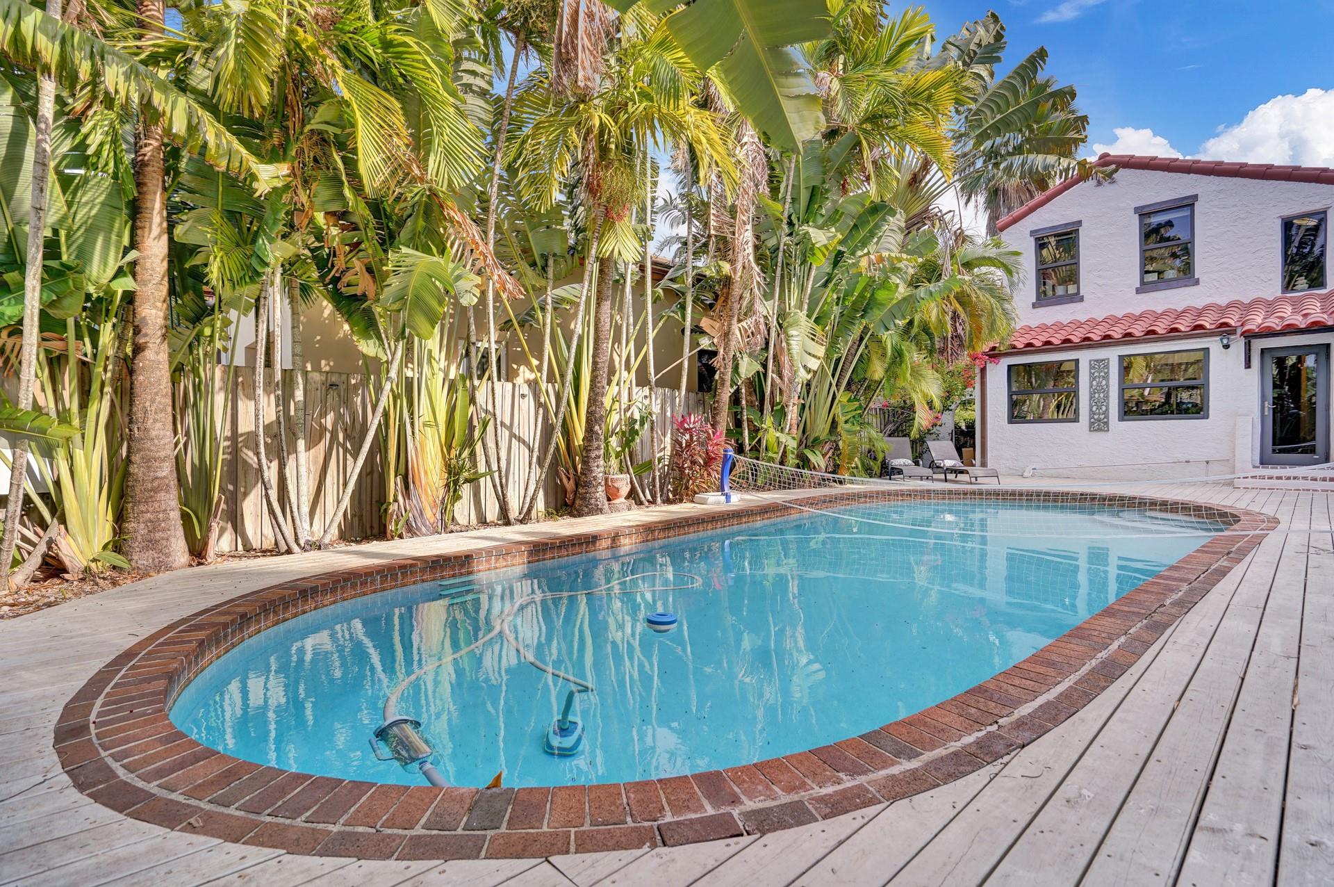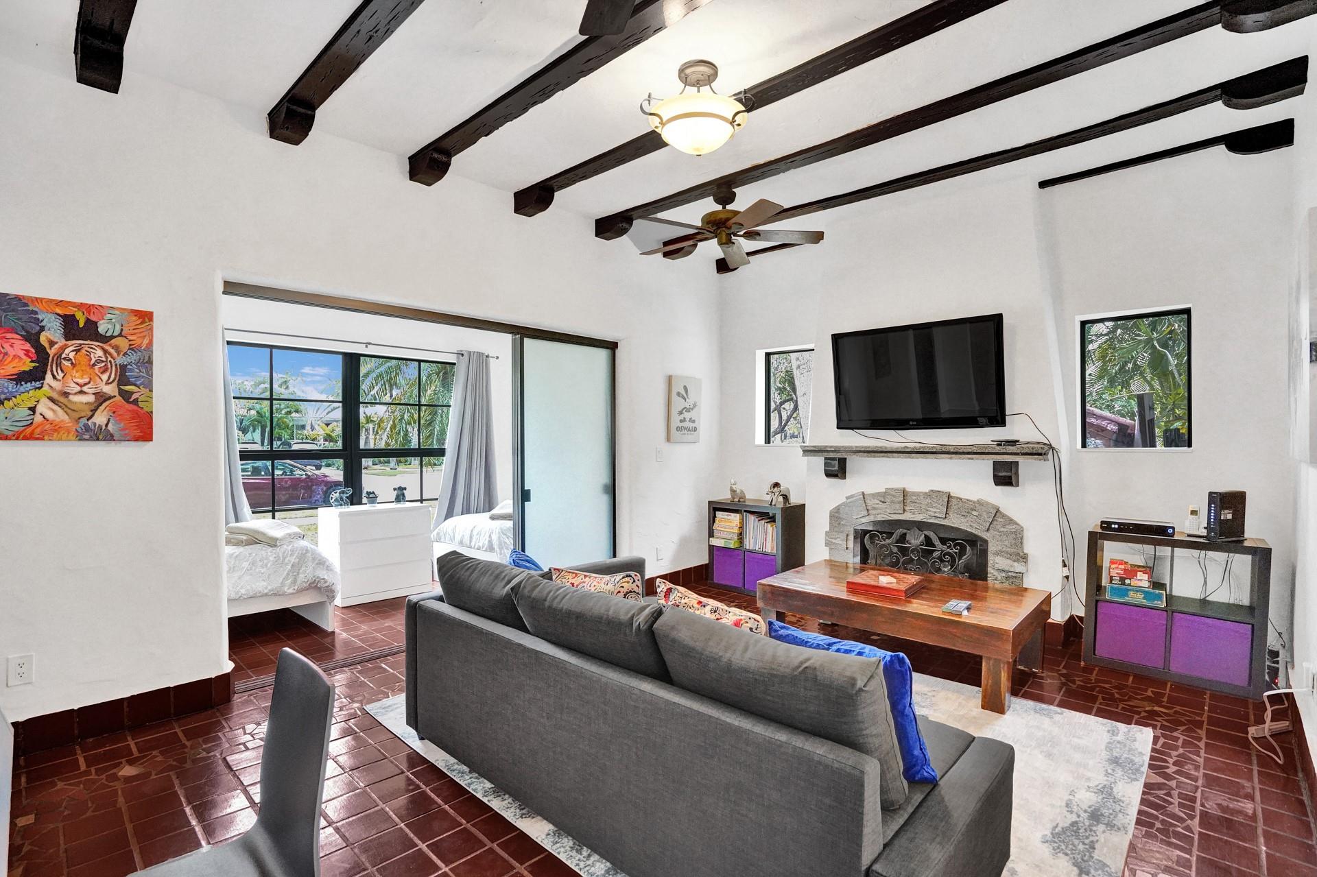 Luxuriously updated Spanish Colonial less than 1 mile from the beach AND vibrant downtown Hollywood! Main house is a 3BD/2BA, plus detached 1 car garage with Tesla supercharger, and 1 bed/1 bath w kitchenette w entrance from alley (currently rented M2M @ $1200, tenant can stay or go). Heated saltwater swimming pool surrounded by wood deck, travertine backyard w barbecue and terrace perfect for entertaining. Upscale kitchen w industrial gas range, Samsung Hub refrigerator, Bosch dishwasher. Inviting living room w gas fireplace and 12′ vaulted ceilings with gorgeous exposed beams. Beautiful dark wood floors in bedrooms and original Saltillo tile in living and dining room. Updated showers, master bath with Jacuzzi. Impact windows and doors throughout.
