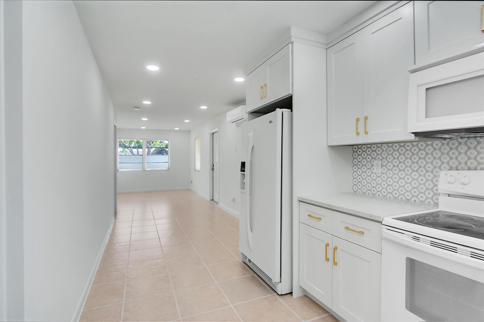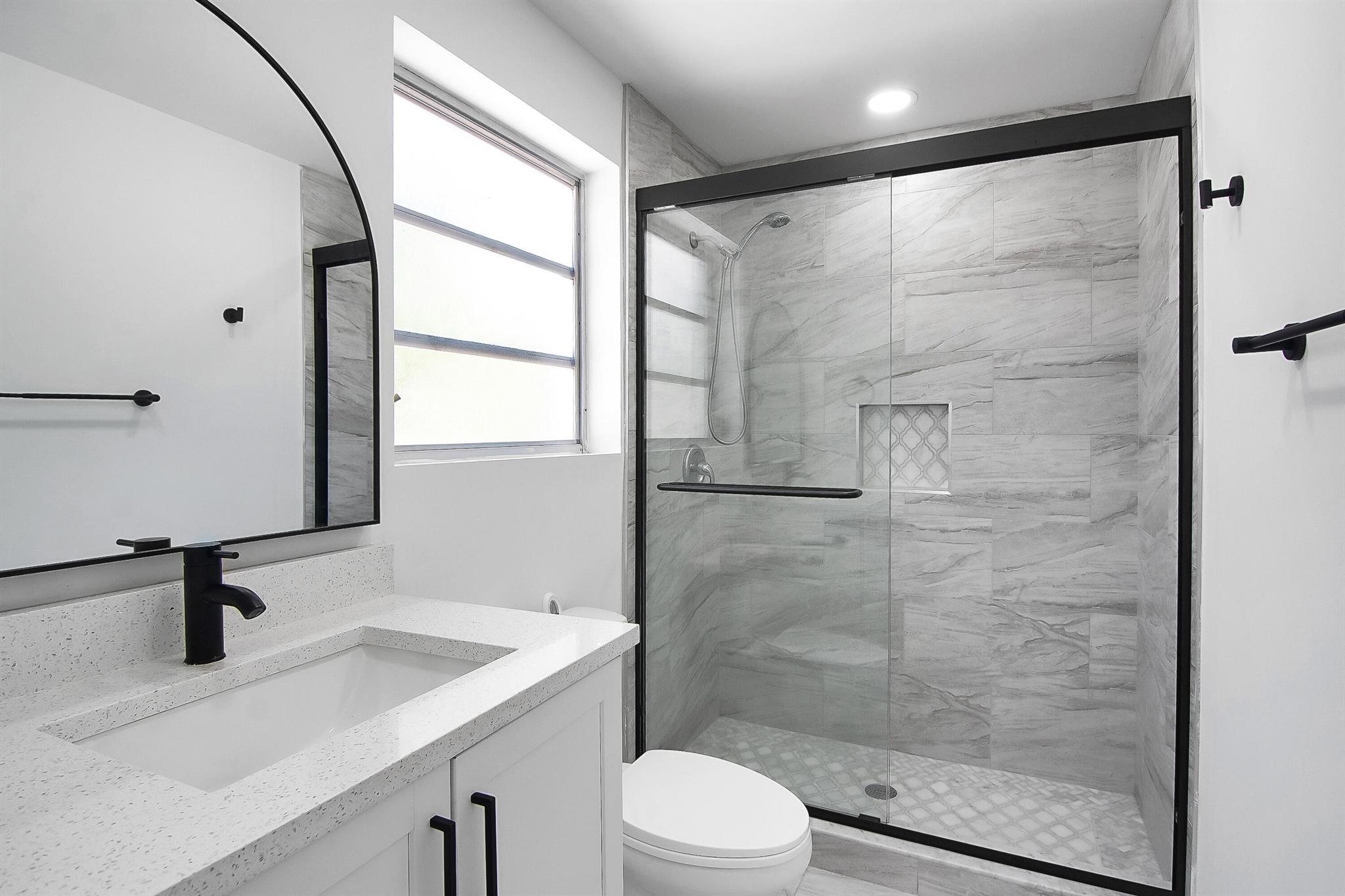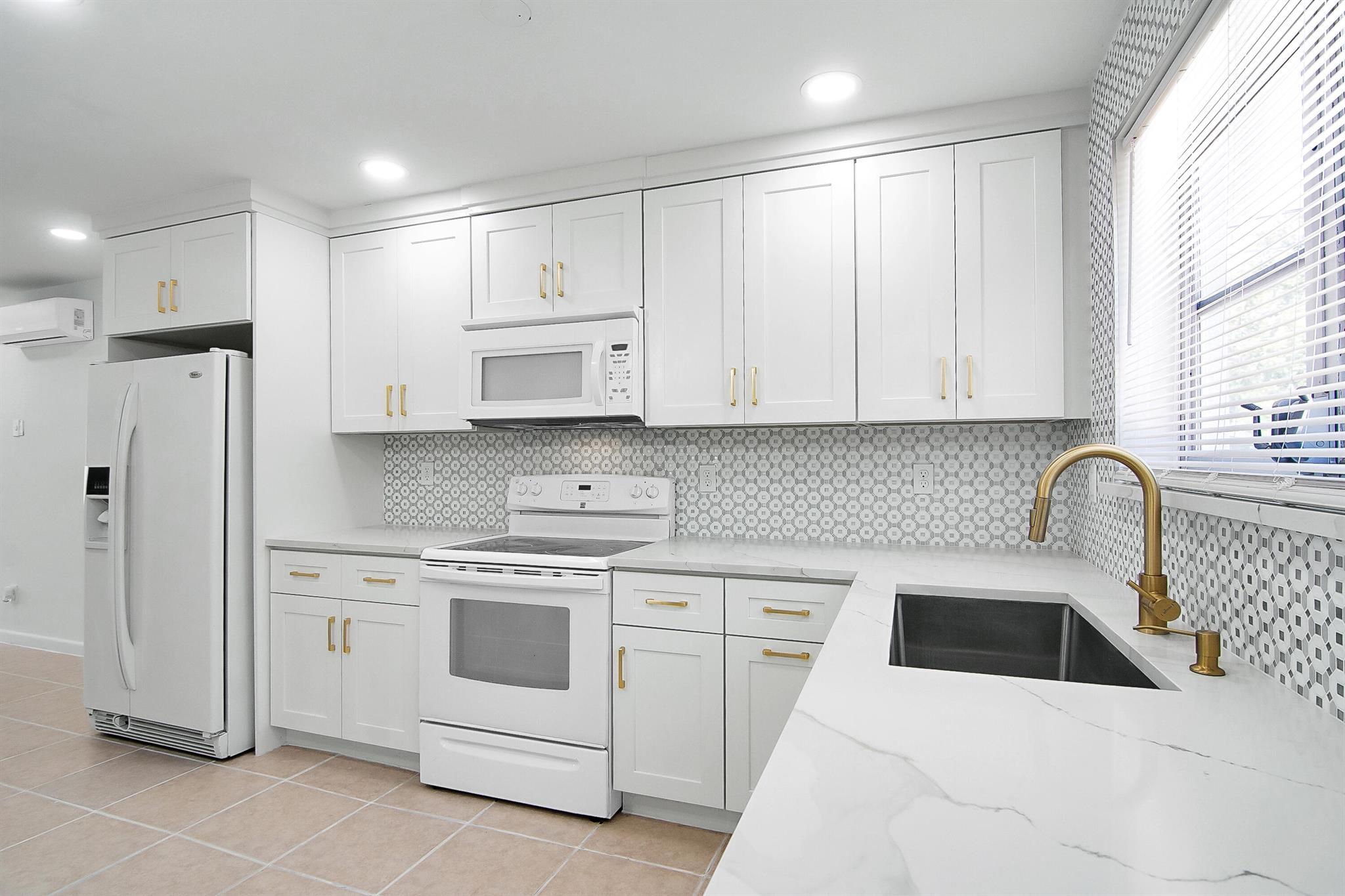 Beautifully remodeled 3BR/1BA home in Lake Worth featuring quartz countertops, premium tile backsplash, and a stunning modern bathroom with a frameless glass shower and matte black finishes. Enjoy a bright, open layout with LED lighting, tile flooring throughout, and fresh paint inside and out. The updated kitchen includes white shaker cabinets, modern hardware, and sleek appliances. Split A/C units provide efficient cooling. Exterior highlights include a 1-car carport, large fenced backyard with storage shed, and extra rear parking pad. Located on a quiet street just minutes from downtown, beaches, shopping, and major highways. Move-in ready and perfect as a primary home or investment!