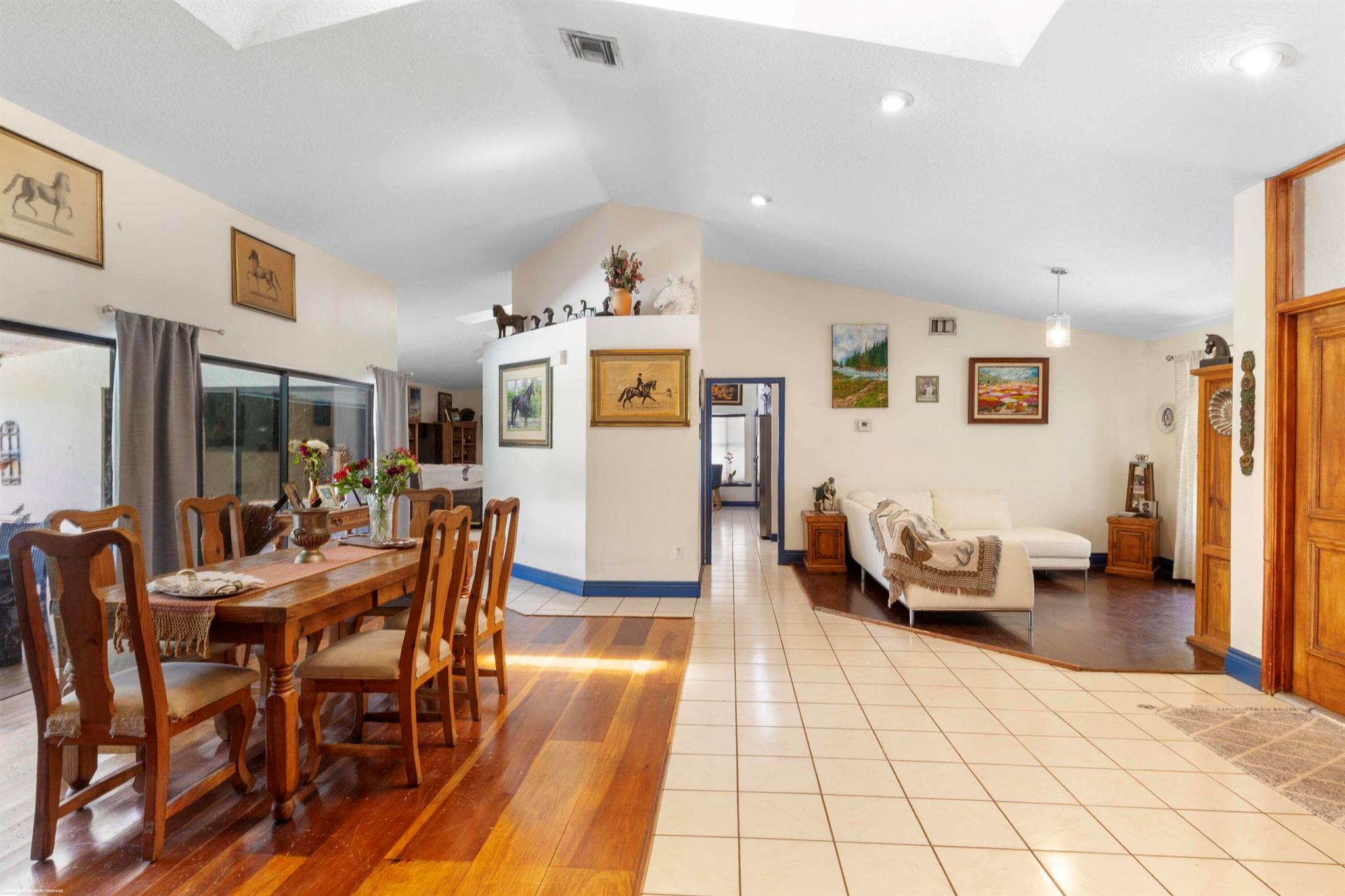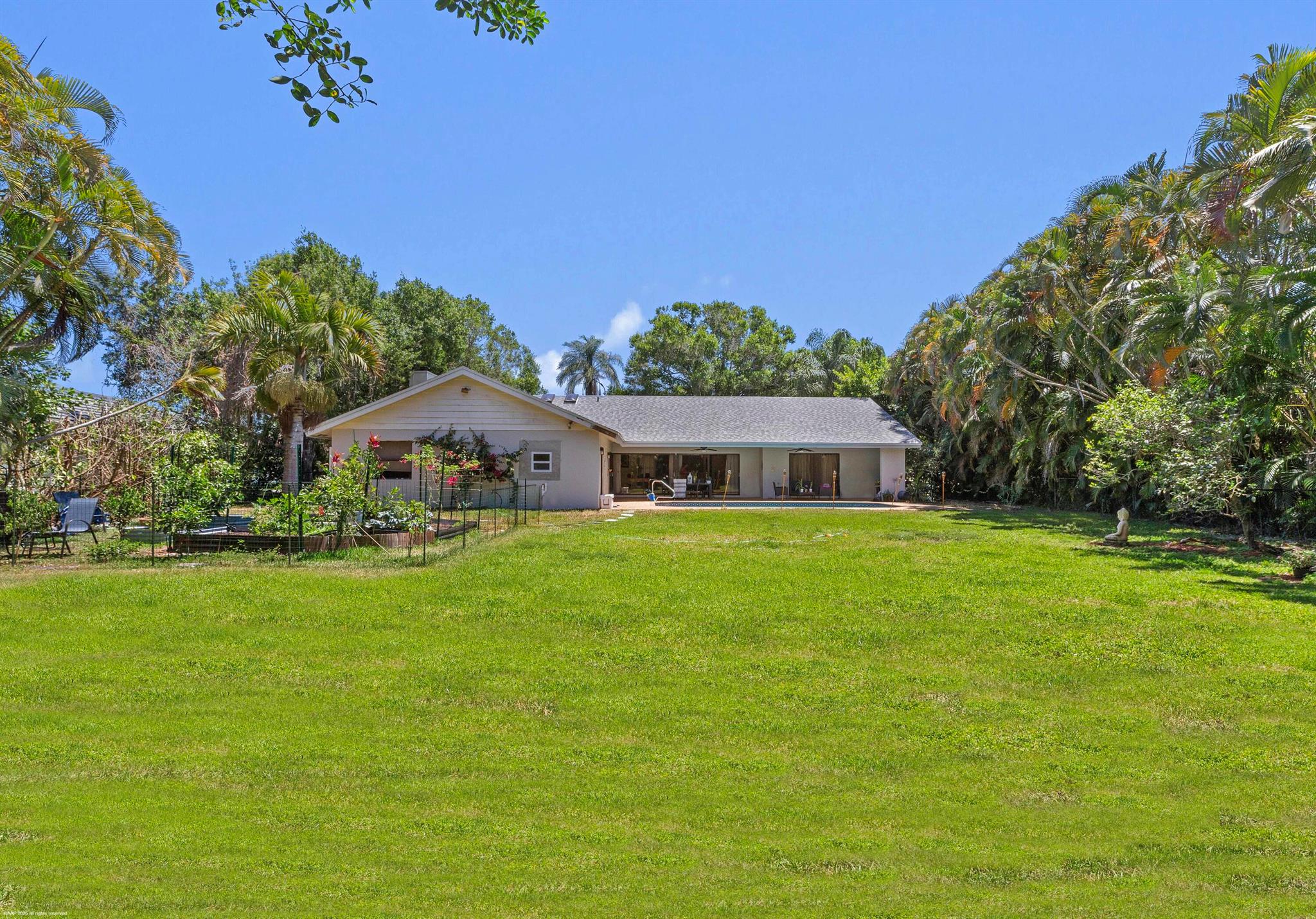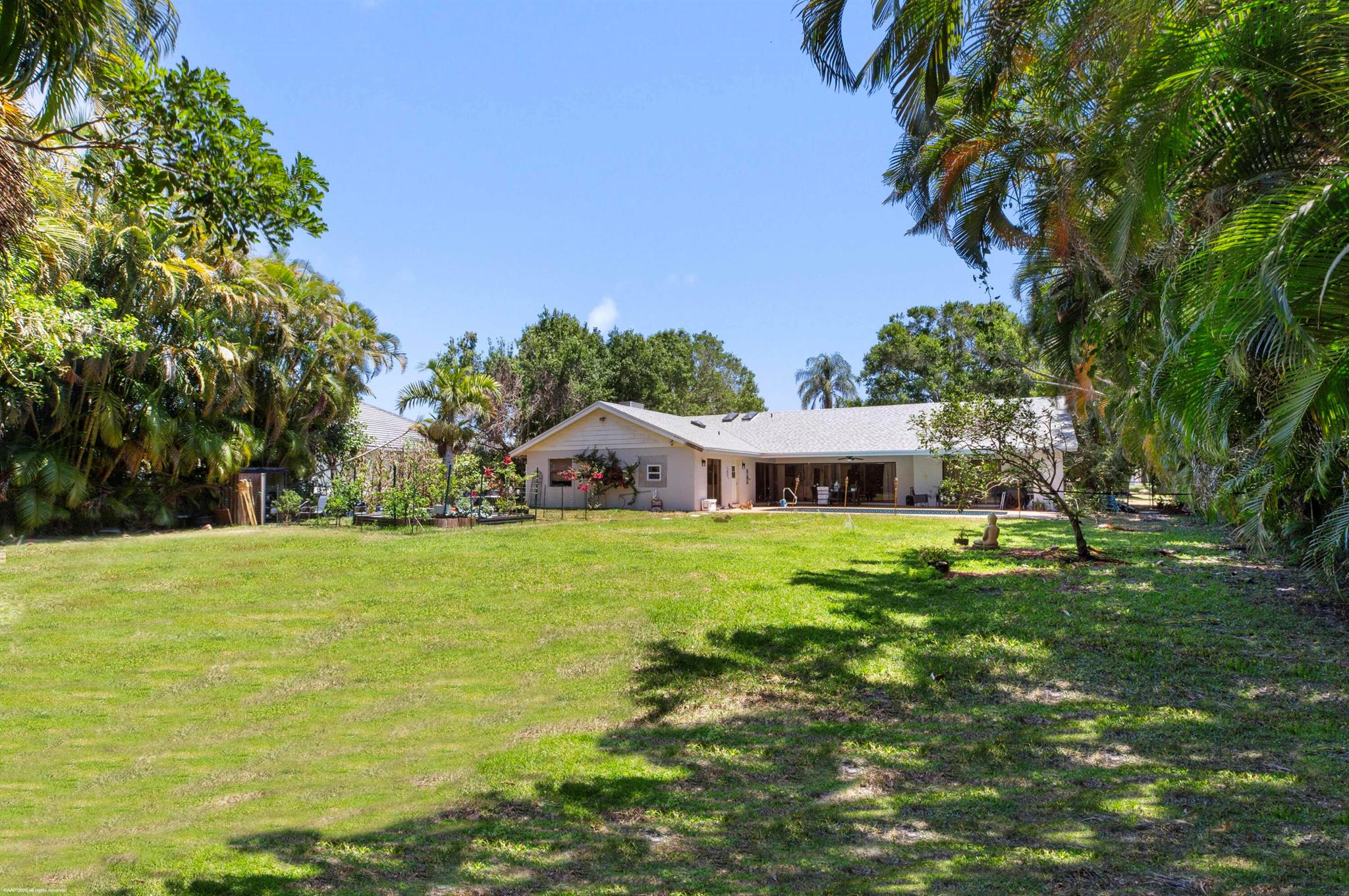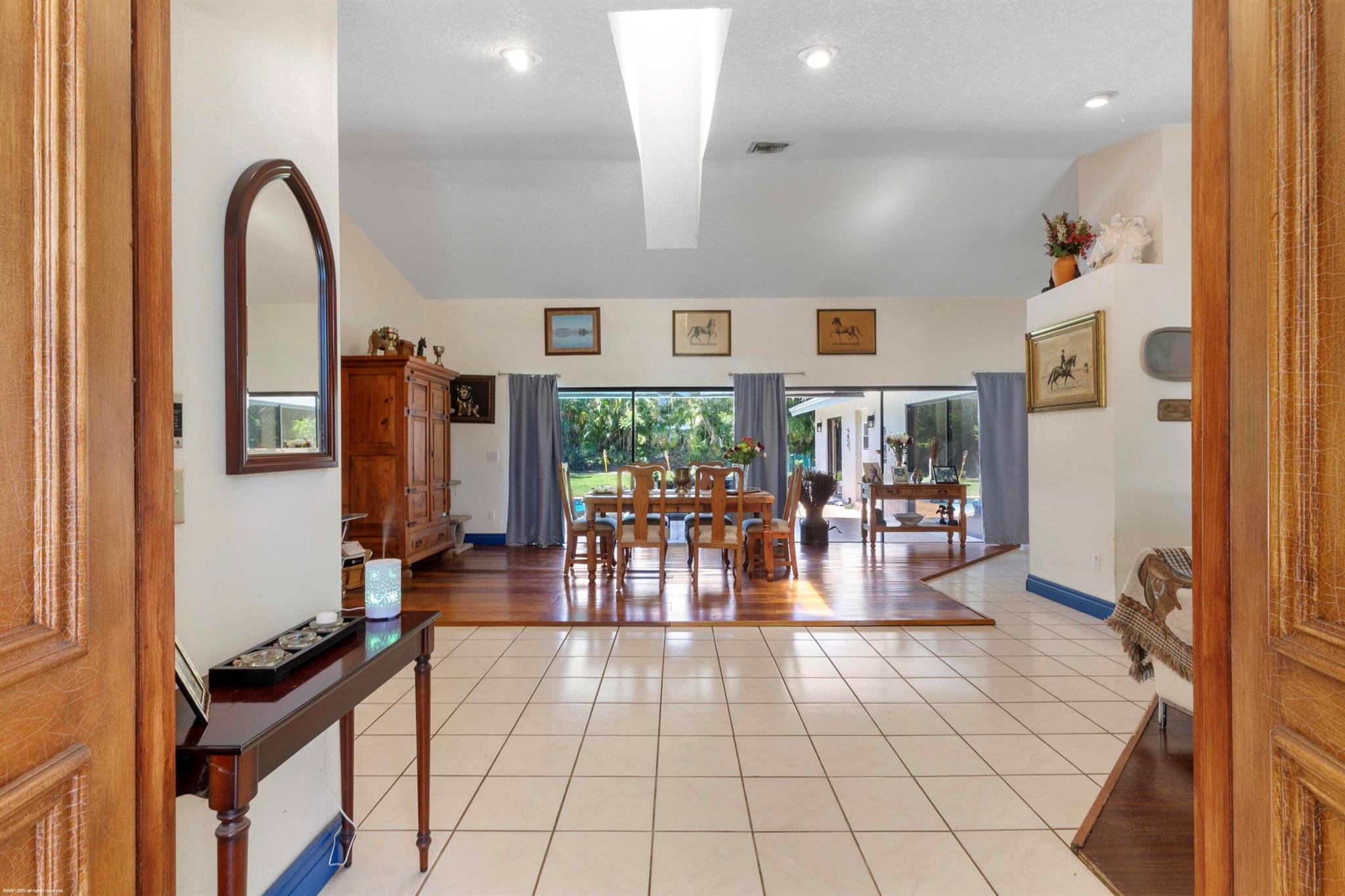This single family pool home is nestled on a lush and tropical half-acre lot in the highly sought-after community of Meadow Wood and boasts a brand NEW ROOF (2025). 2 of the bedrooms have been converted into a separate apartment with its own kitchen and entrance, but also with direct access into the the main house (currently a total of 3bdr, 2 in the main house and 1 in the attached apt- can easily be converted back). Perfect for equestrian enthusiasts, the property is just around the corner from golf cart paths, providing easy access to WEF! The residence features a split floor plan with soaring ceilings and abundant natural light. There is an open dining area, living room a with coral stone fireplace plus a separate den.