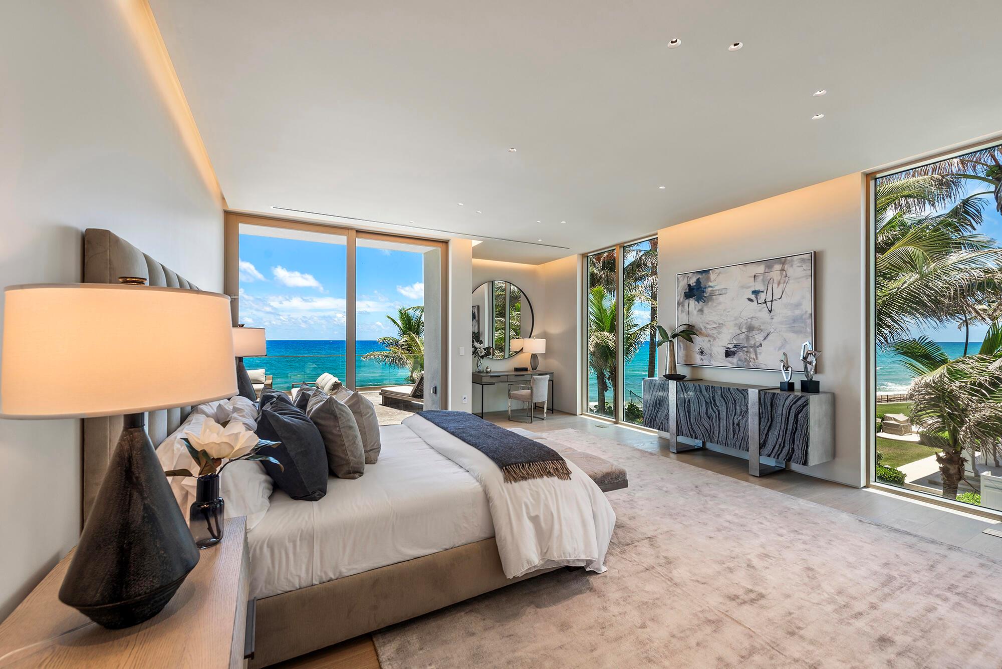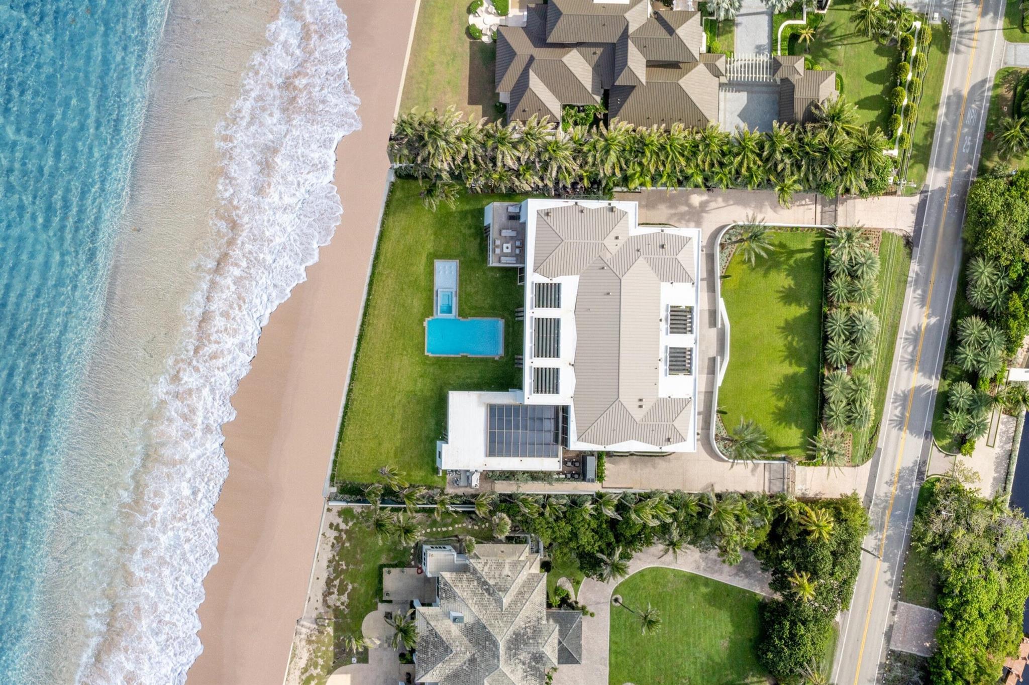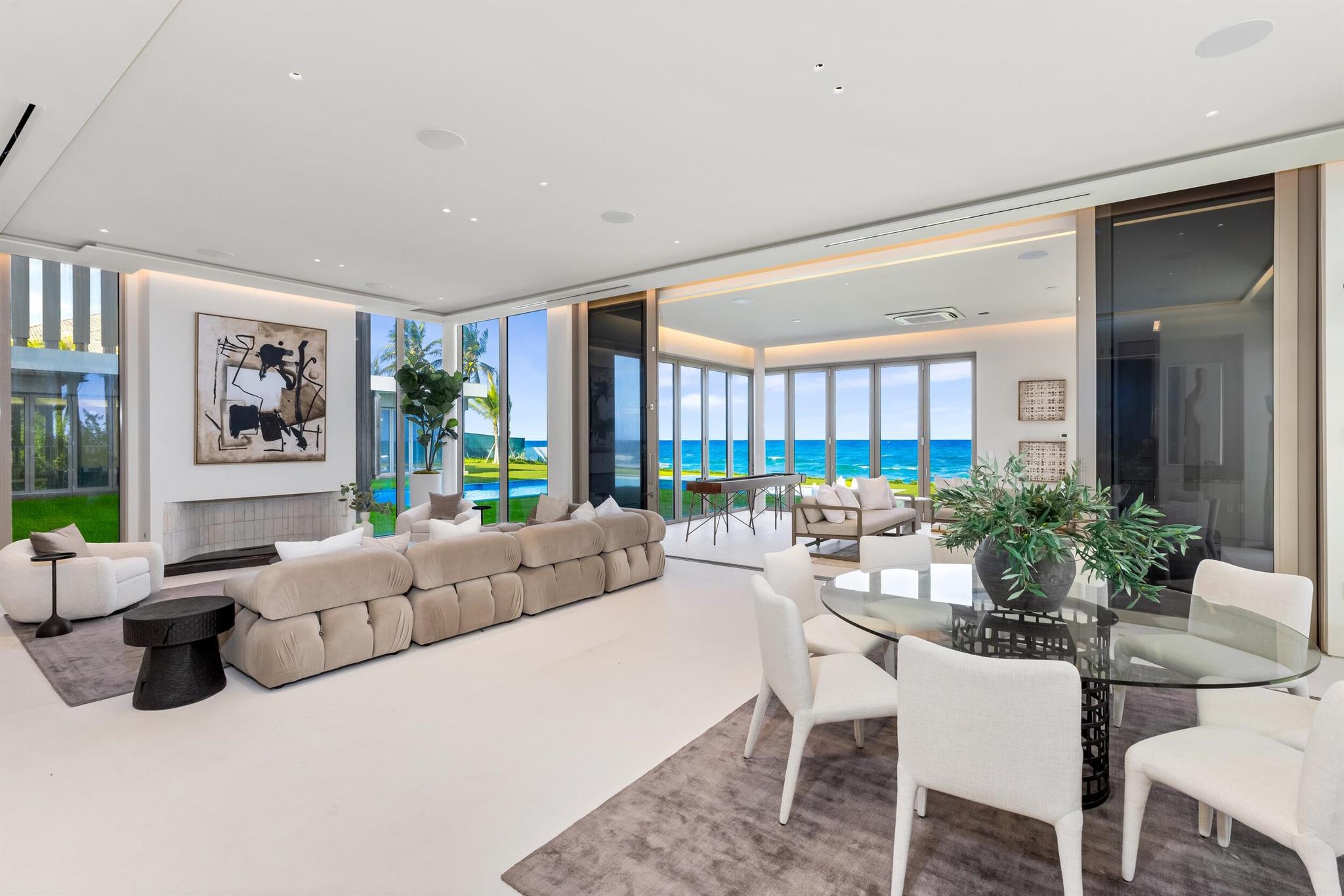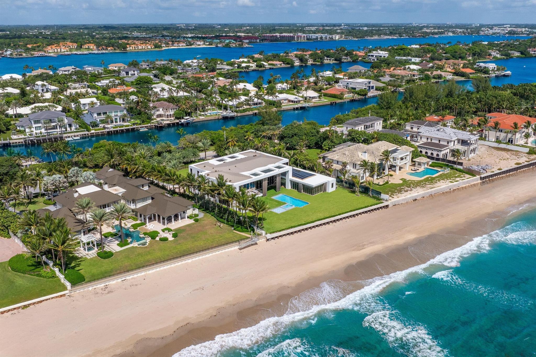 Owner will consider a property trade! Rare, custom contemporary estate home built in 2024. Situated on a premier 1.5+/- acre lot with 172 feet +/- on the Atlantic Ocean and the Intracoastal Waterway. This immaculate, newly constructed home is comprised of 3 stories with a gracious floor plan and commanding water views. No detail has been overlooked with stunning full slab Limestone & wide-plank oak floors, impact windows and doors, and custom finishes throughout. The grand motor court brings you to the gorgeous entry with beautiful fountains on either side. Soaring double-height foyer opens to light-filled waterfront living room. The main floor also features a gracious VIP suite with large en-suite bath and walk-in closet, formal dining room, family room and sunroom.