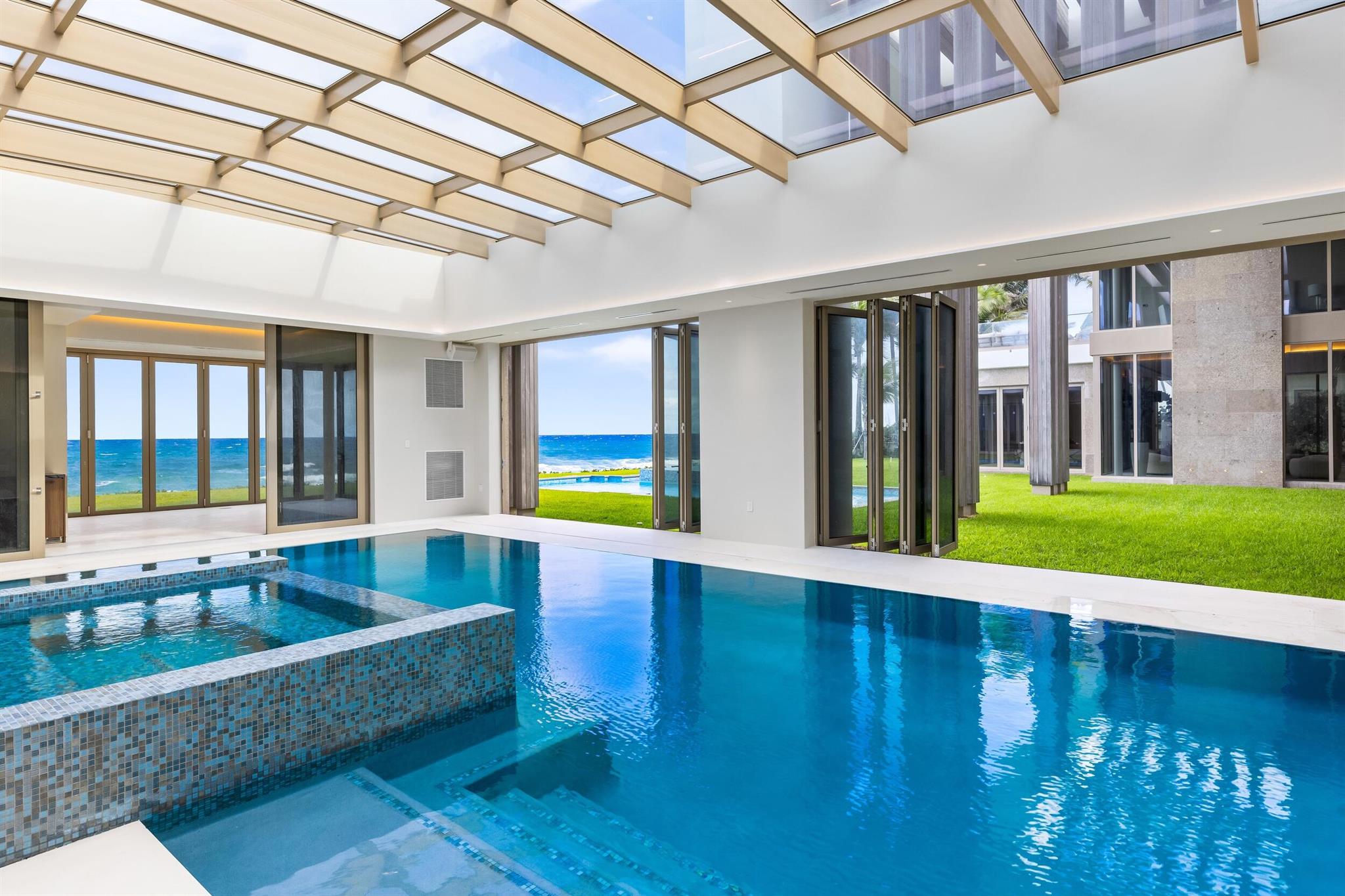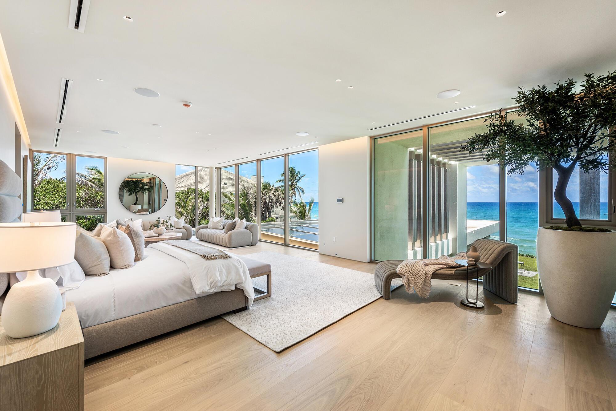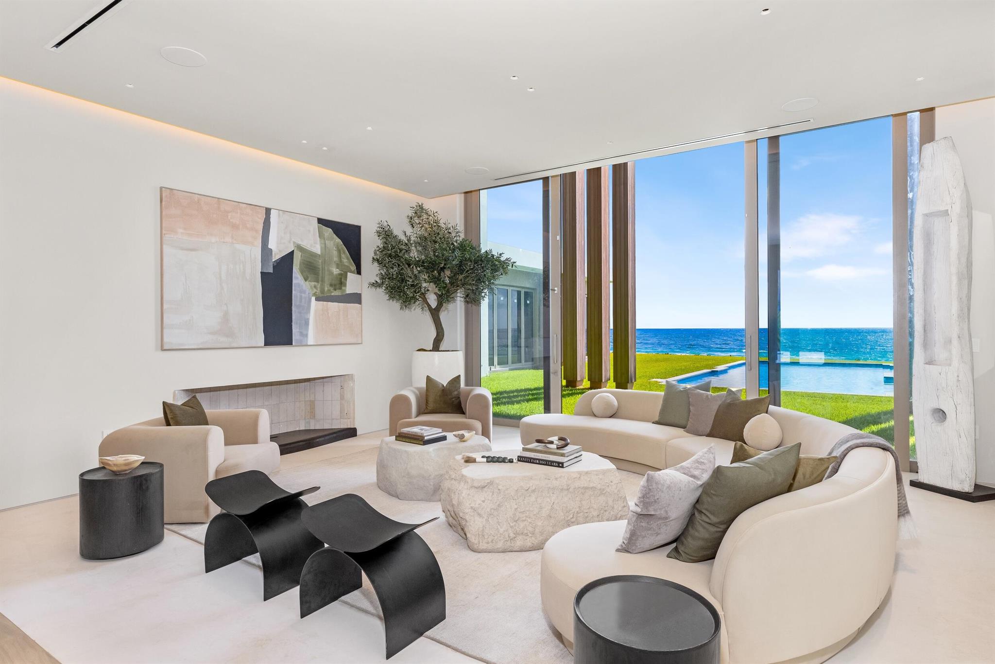 Owner will consider a property trade! Rare, custom contemporary estate home built in 2024. Situated on a premier 1.5+/- acre lot with 172 feet +/- on the Atlantic Ocean and the Intracoastal Waterway. This immaculate, newly constructed home is comprised of 3 stories with a gracious floor plan and commanding water views. No detail has been overlooked with stunning full slab Limestone & wide-plank oak floors, impact windows and doors, and custom finishes throughout. The grand motor court brings you to the gorgeous entry with beautiful fountains on either side. Soaring double-height foyer opens to light-filled waterfront living room. The main floor also features a gracious VIP suite with large en-suite bath and walk-in closet, formal dining room, family room and sunroom.