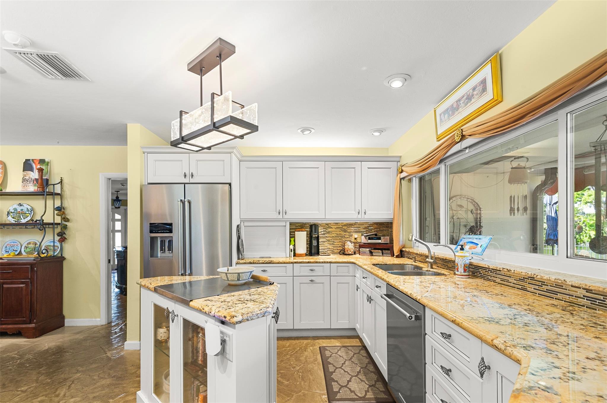 As you step inside, you’re greeted with immediate lake views, beautiful rock floors & designer kitchen. Home features a split floor plan, with ample storage space and many custom pull outs & built ins.