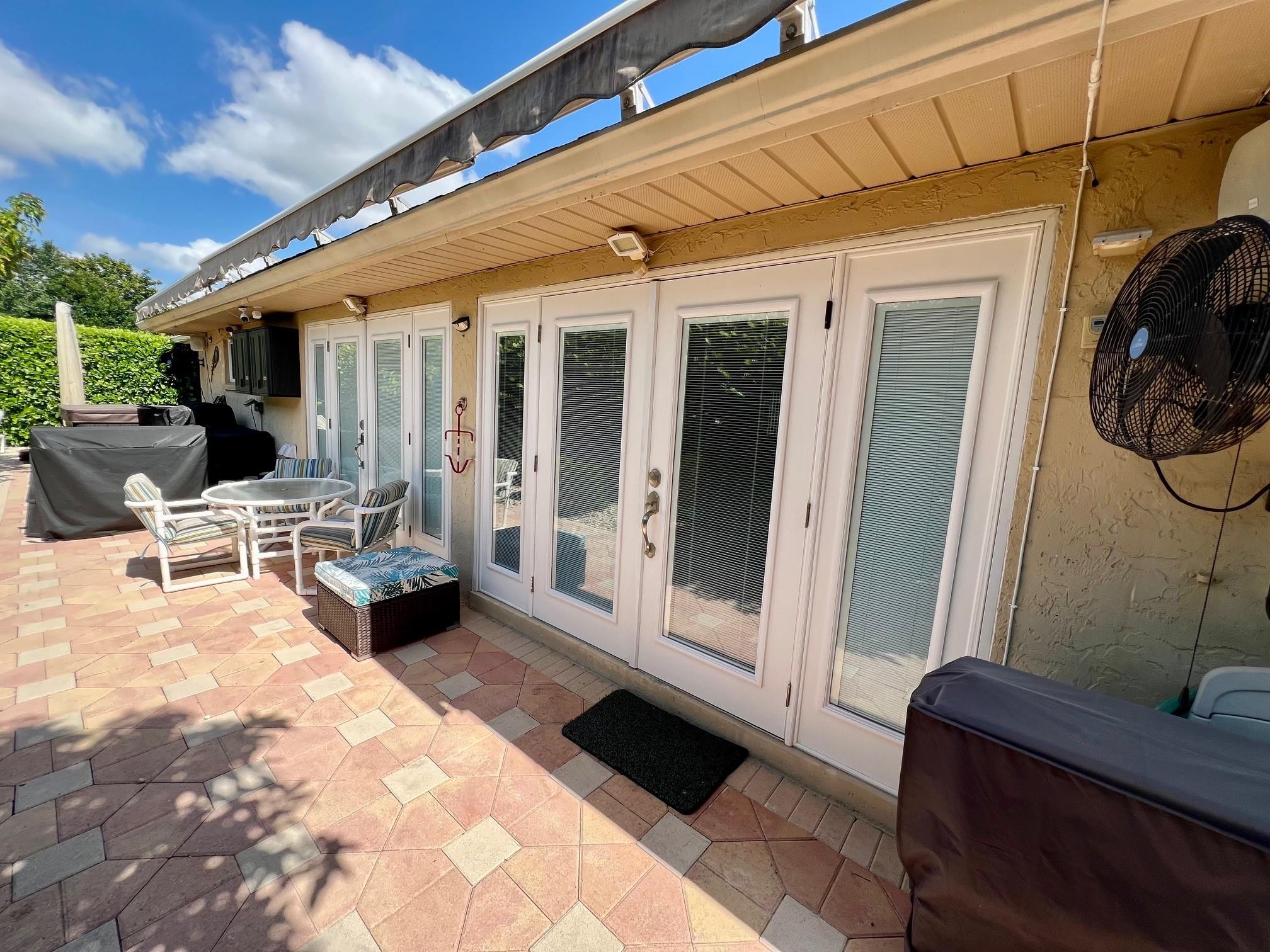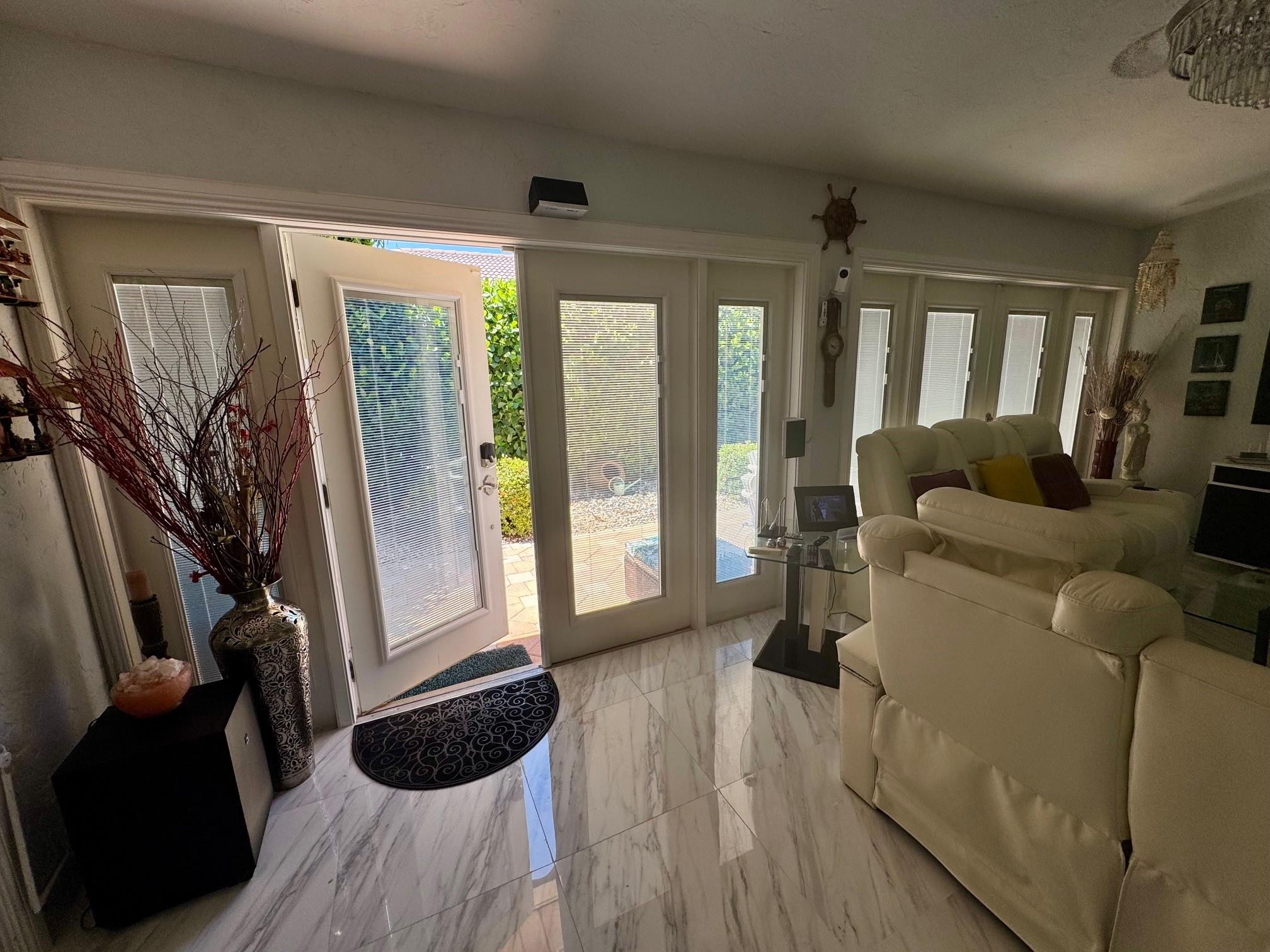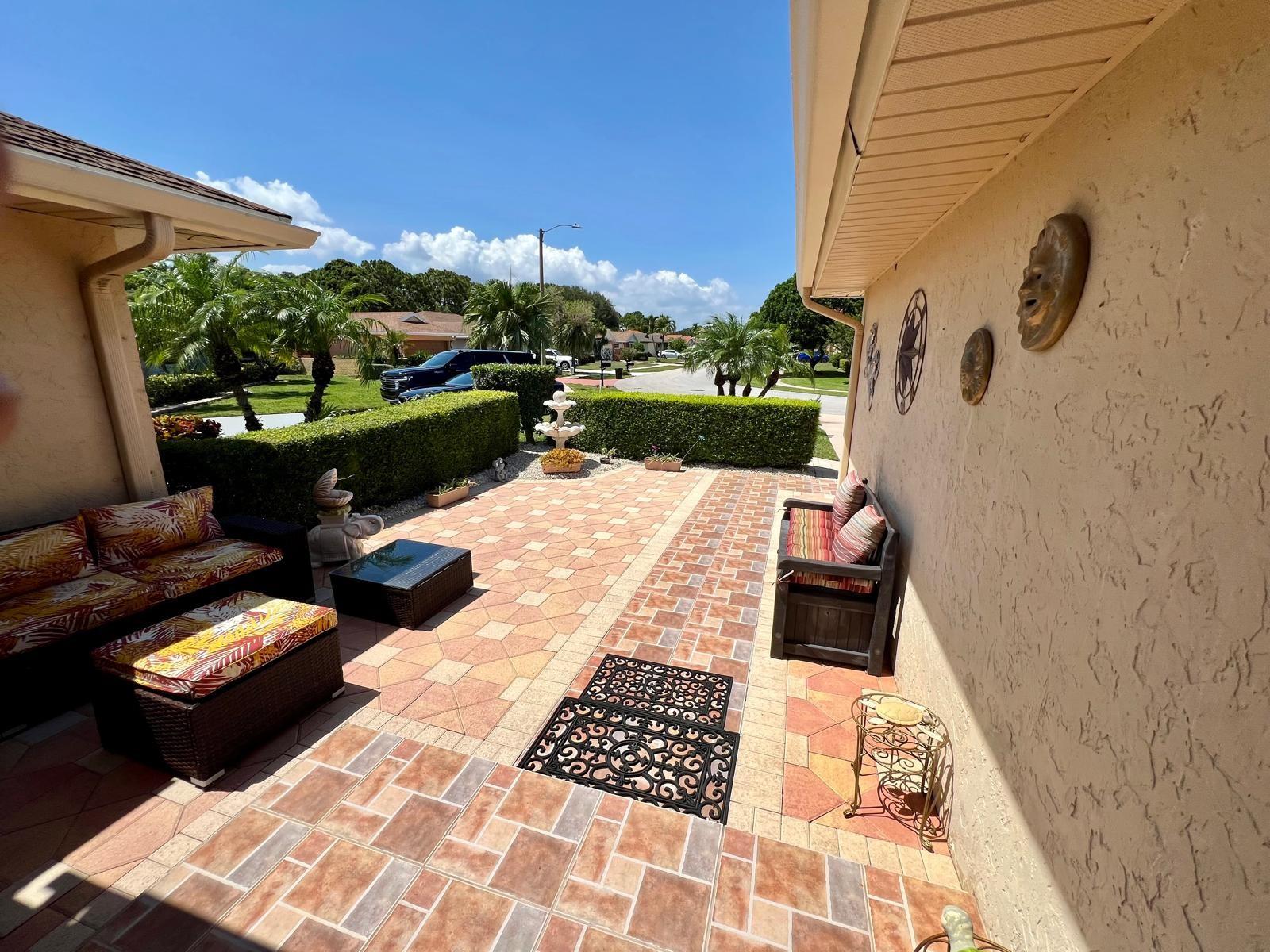 This beautifully upgraded modern home offers 3 spacious bedrooms & 2 sleek bathrooms. All-impact windows & doors, including French doors in the back, a front door with keypad entry, & an impact garage door. The sellers are in the process of installing a new roof. Upgraded kitchen adds a touch of luxury, and features like Alexa-compatible switches, ceiling fans, smart garage opener, 6 security cameras, and motion sensors throughout the home bring modern to your fingertips. Relax outdoors with a private plug-and-play jacuzzi, paved backyard and courtyard, electric retractable awnings, outdoor wall fans, and included patio furniture front and back. The courtyard features a water fountain. Shopping, dining, entertainment,5 miles from the beach! 55+ community. Emotional support animals welcome.