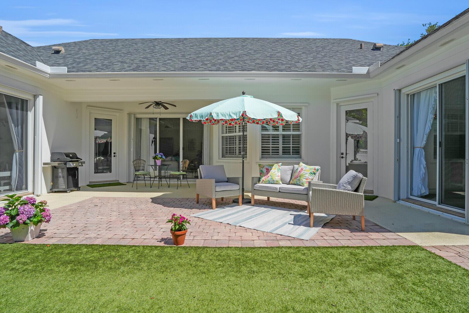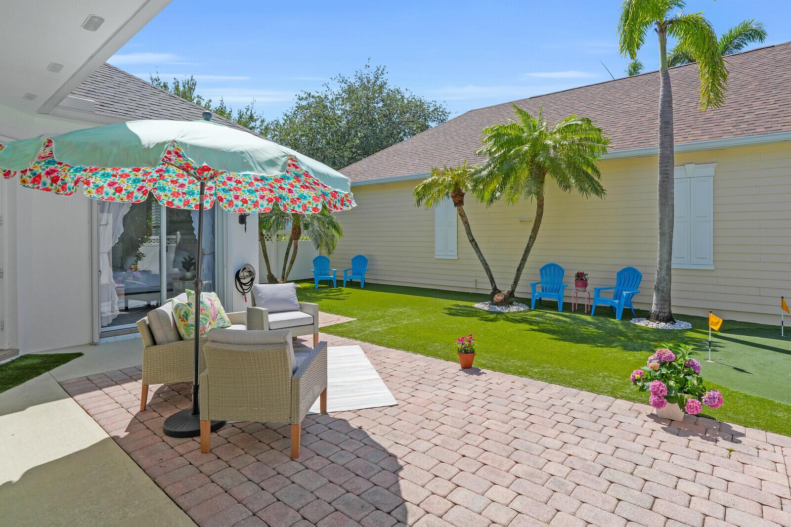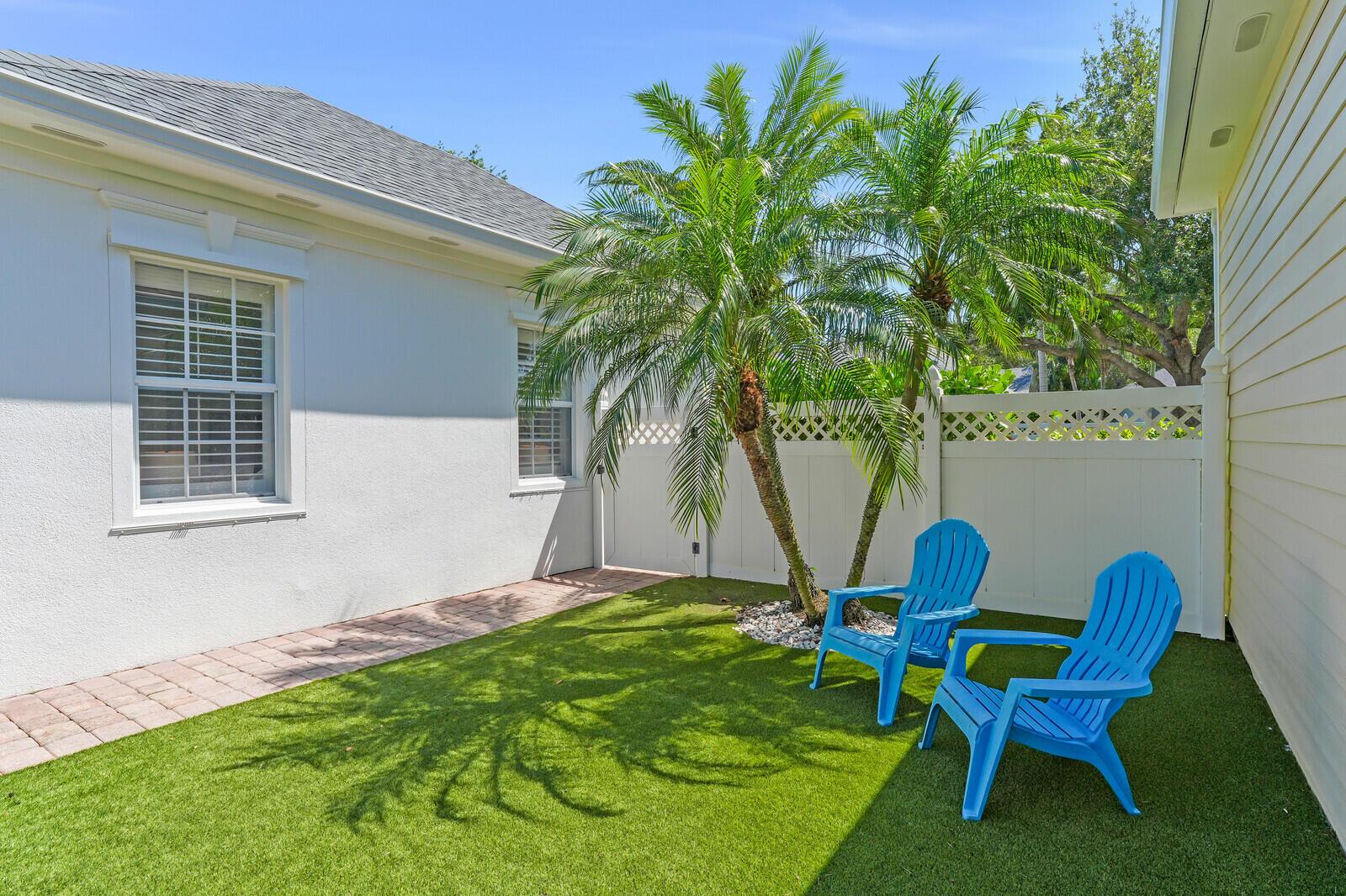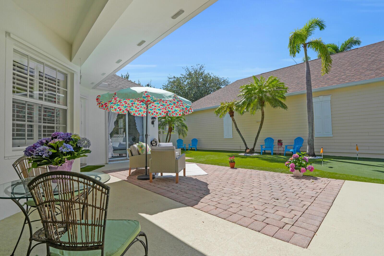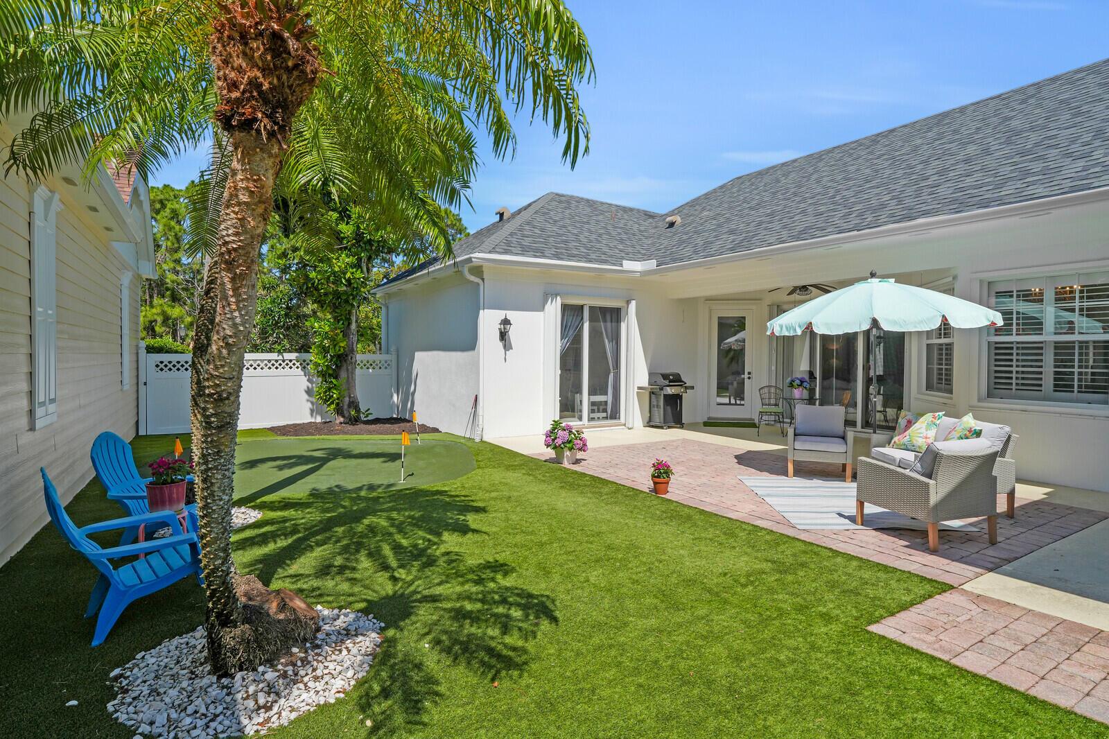 Bright and inviting, this courtyard-style home in NewHaven at Abacoa offers serene preserve views from the welcoming front porch. Inside, you’ll find a spacious open-concept layout with tile flooring throughout, plantation shutters, and a beautifully remodeled kitchen featuring an island, quartz countertops, upgraded appliances, updated lighting, and a stylish glass backsplash.The oversized living area is perfect for both entertaining and everyday living. The primary suite boasts a luxurious bathroom with quartz countertops, dual shower heads and handhelds for a true spa-like experience.Step outside to a private side yard with low-maintenance artificial turf and a fun mini putting green–perfect for relaxing or enjoying a casual game. Additional upgrades include a newer roof