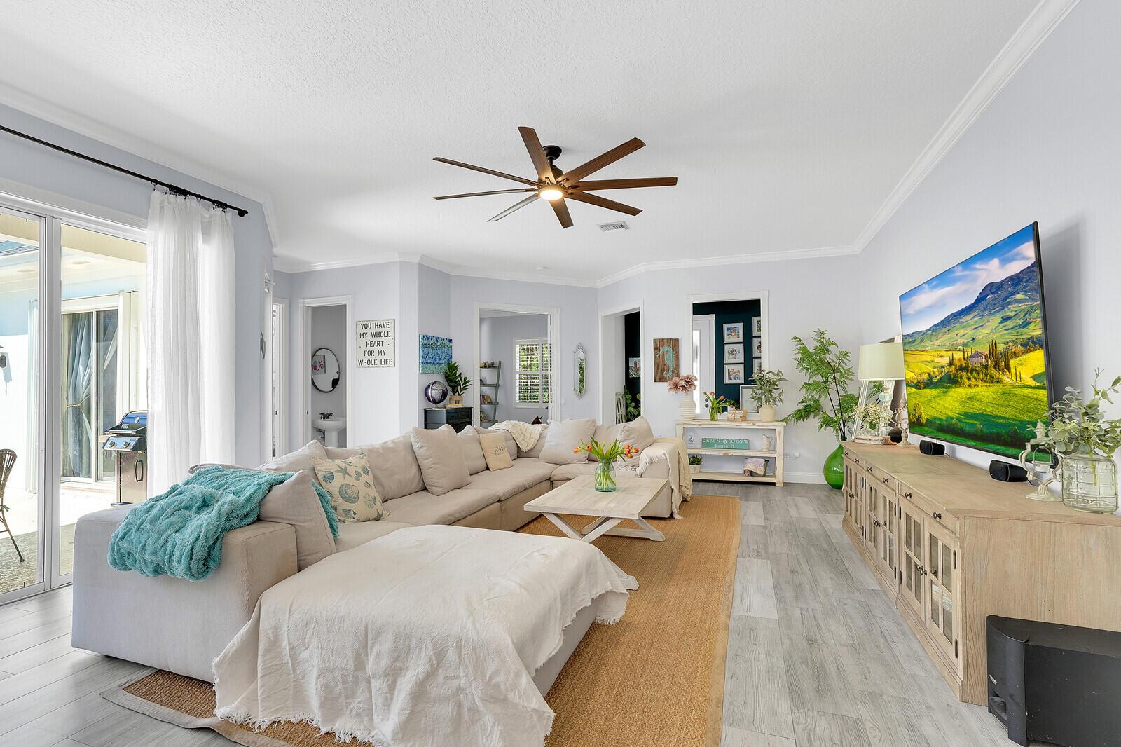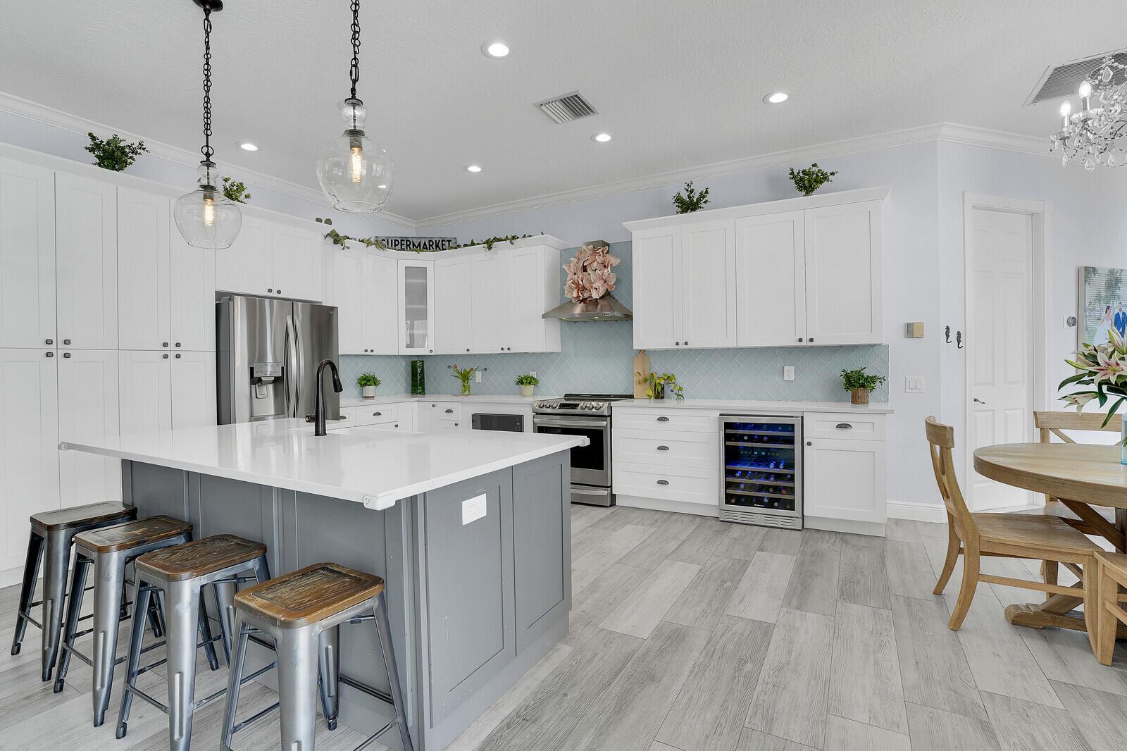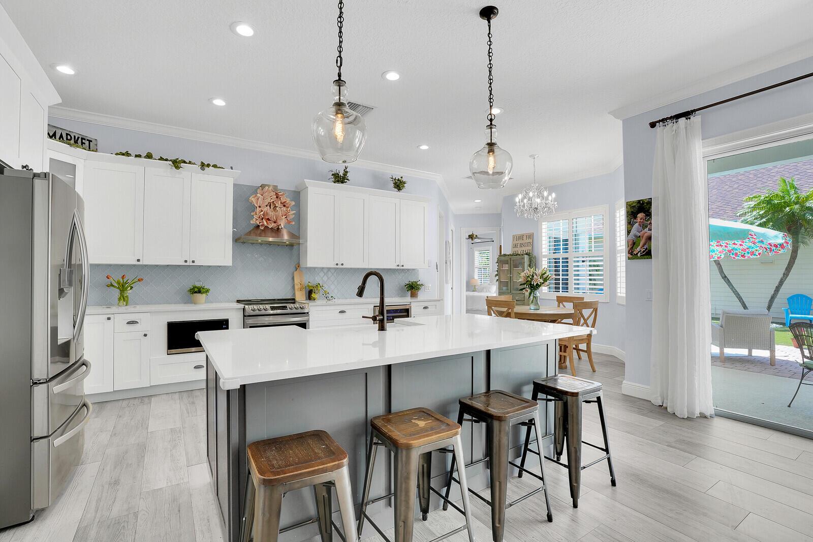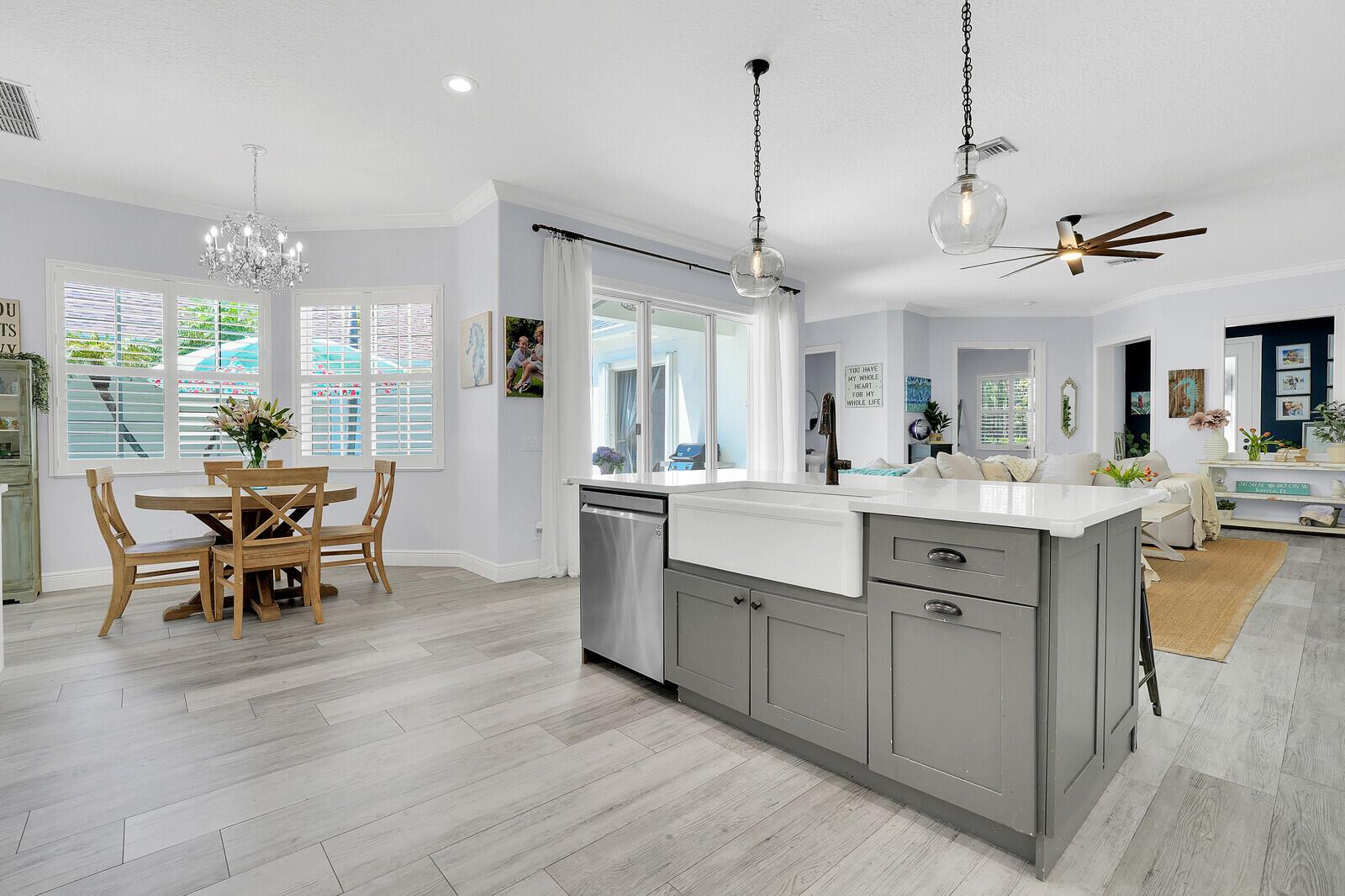 Bright and inviting, this courtyard-style home in NewHaven at Abacoa offers serene preserve views from the welcoming front porch. Inside, you’ll find a spacious open-concept layout with tile flooring throughout, plantation shutters, and a beautifully remodeled kitchen featuring an island, quartz countertops, upgraded appliances, updated lighting, and a stylish glass backsplash.The oversized living area is perfect for both entertaining and everyday living. The primary suite boasts a luxurious bathroom with quartz countertops, dual shower heads and handhelds for a true spa-like experience.Step outside to a private side yard with low-maintenance artificial turf and a fun mini putting green–perfect for relaxing or enjoying a casual game. Additional upgrades include a newer roof
