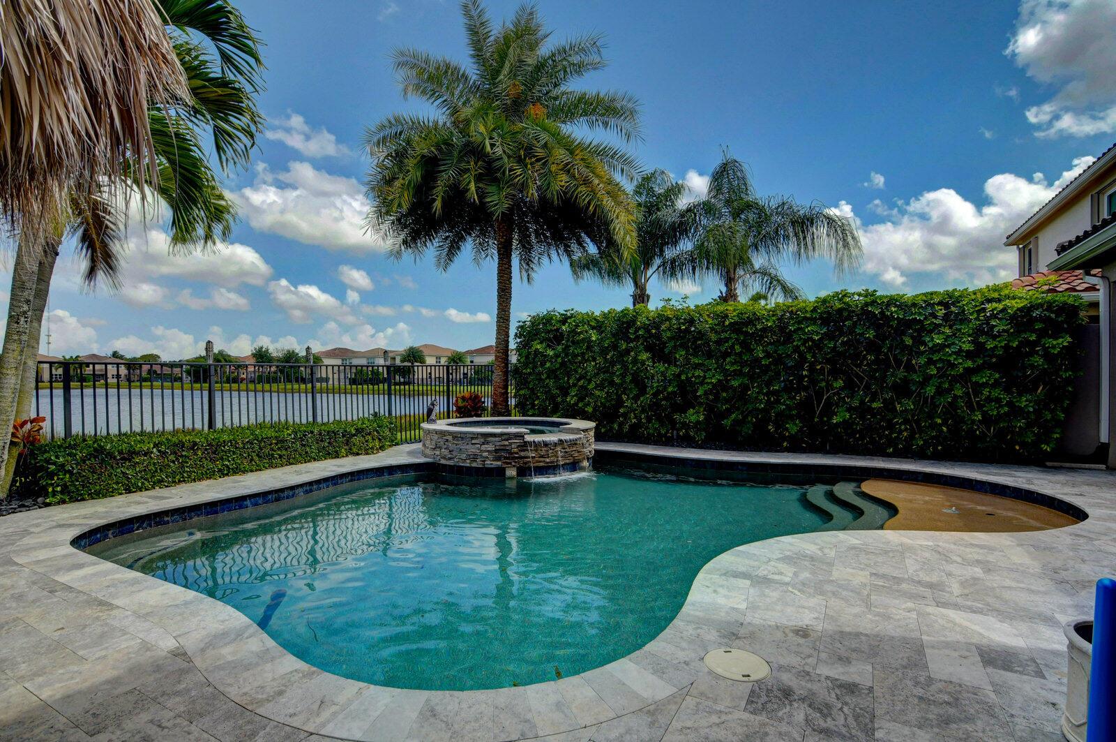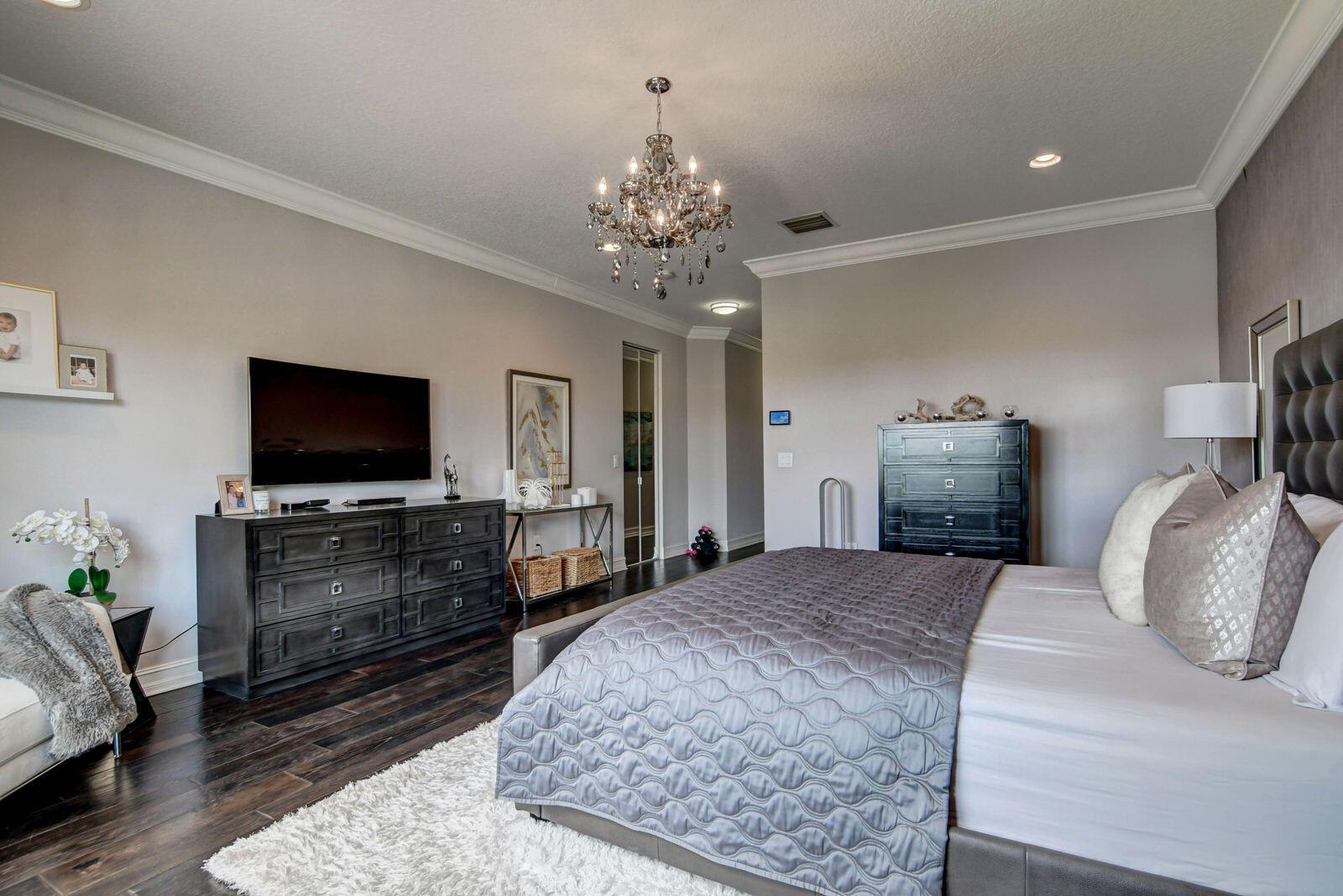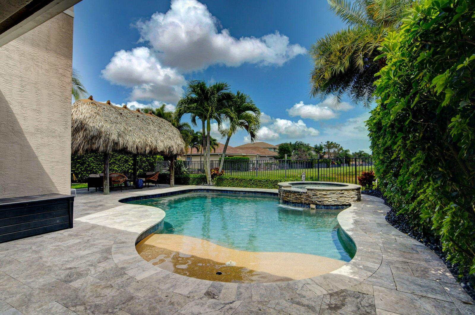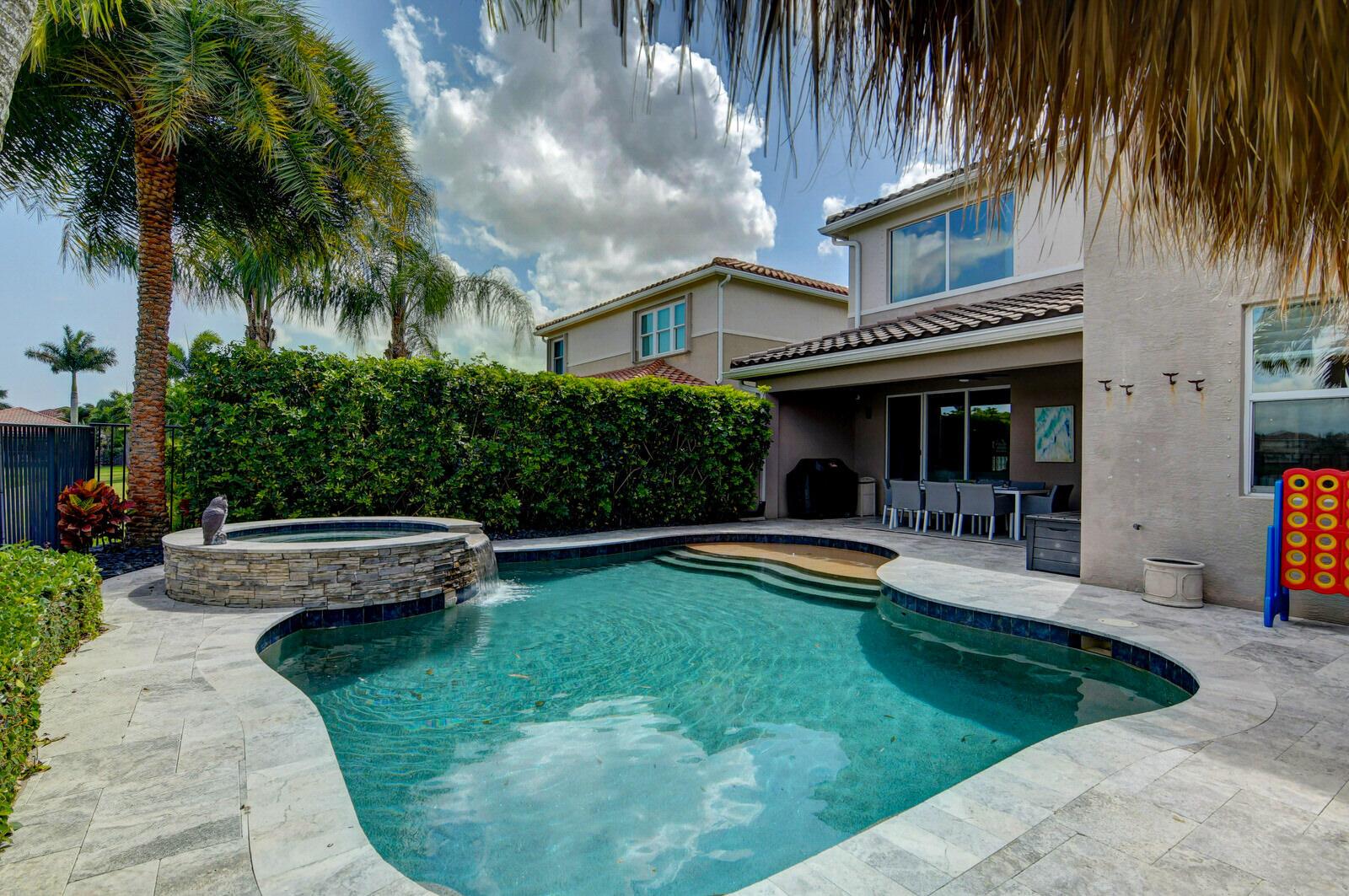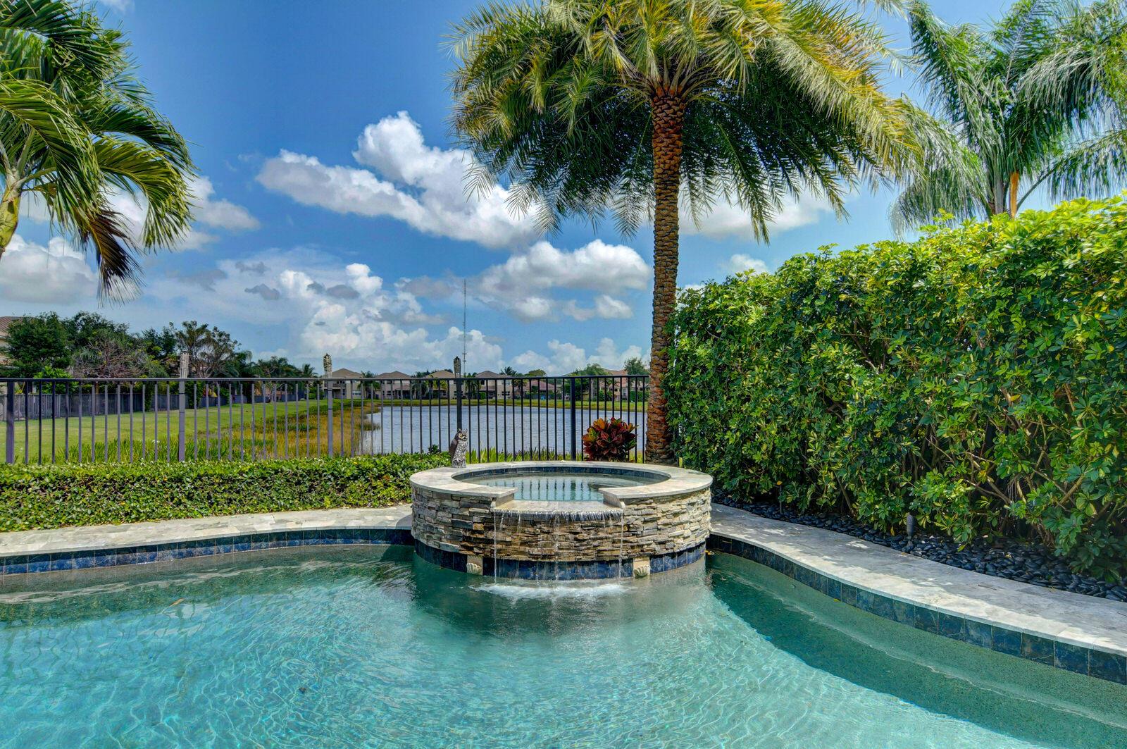 Step into tropical luxury with this immaculate lakefront home on a premier oversized lot. Enjoy heated resort style salt water pool and hot tub with LED lighting, Wi-Fi automation, travertine deck, and a tiki hut – perfect for entertaining. The beautiful kitchen features 42′ cabinets, granite counters and full backsplash, built-in pantry, and reverse osmosis water system. Master suite includes custom built-in him and hers walk-in closets. The downstairs 4th bedroom comes with beautiful built-in office furniture. Highlights include wood floors on the second floor, crown molding, custom drapery, plantation shutters, iron staircase, and stunning chandeliers in various rooms. This home is filled with stunning decorative touches, completely move-in ready with nothing left do.