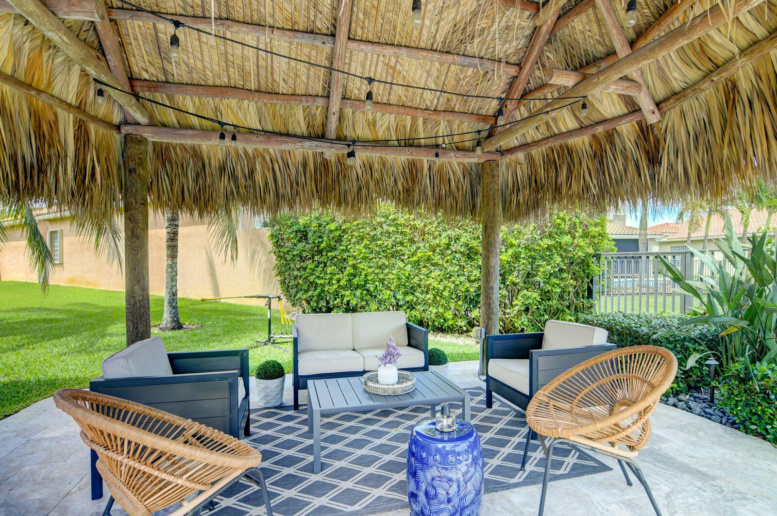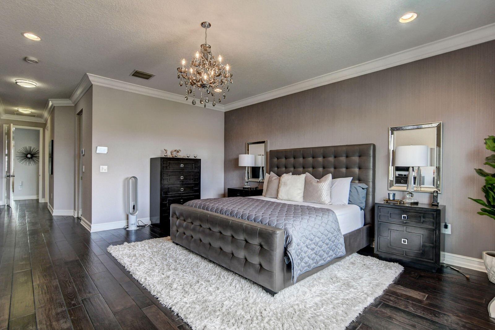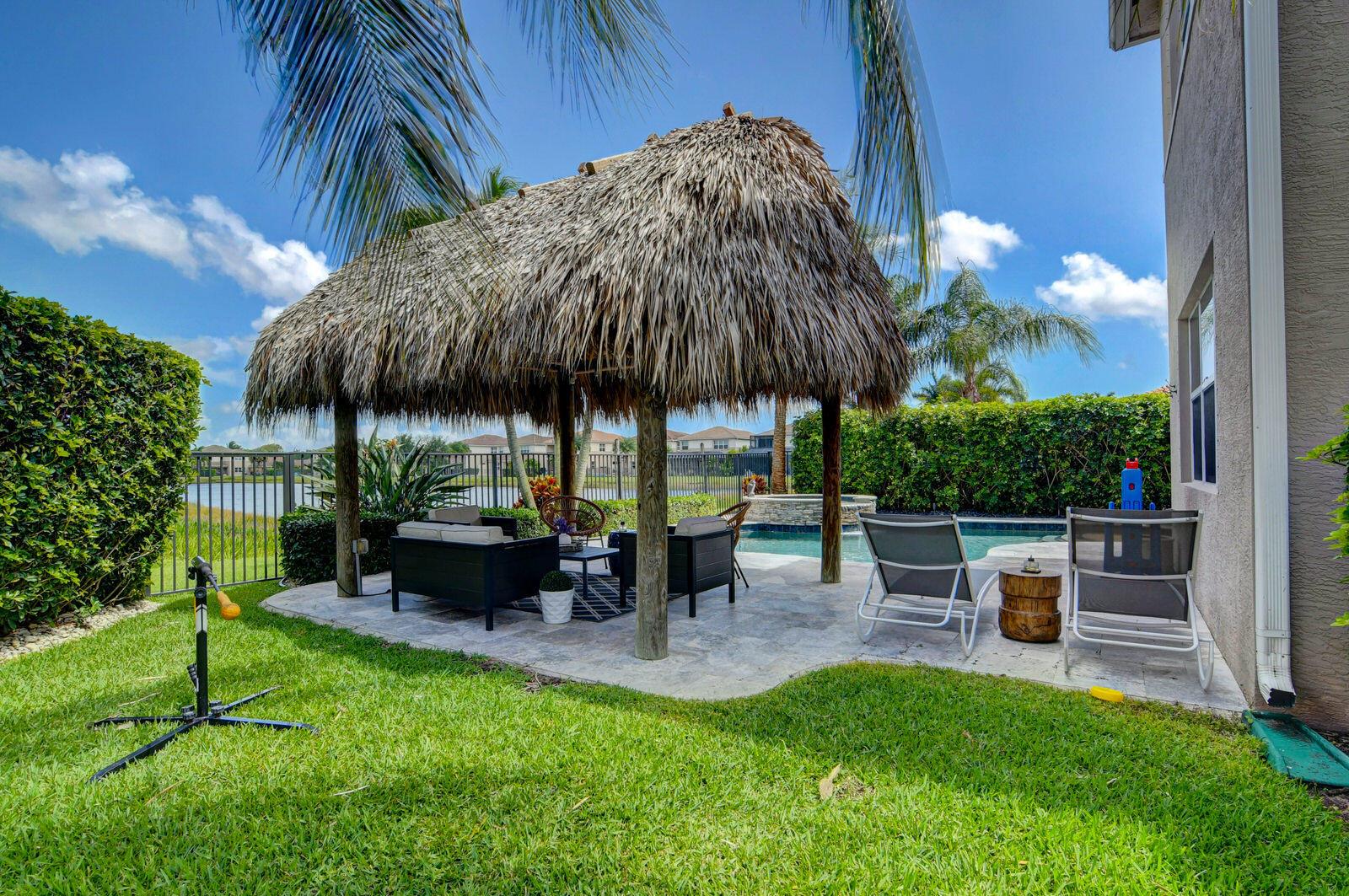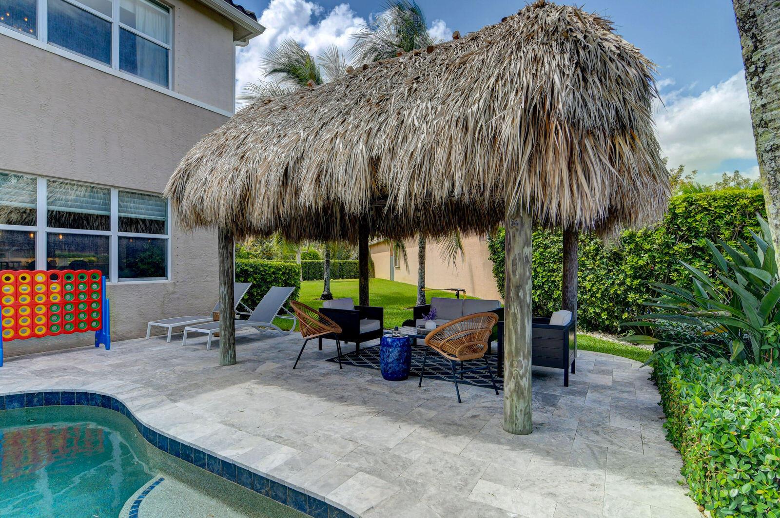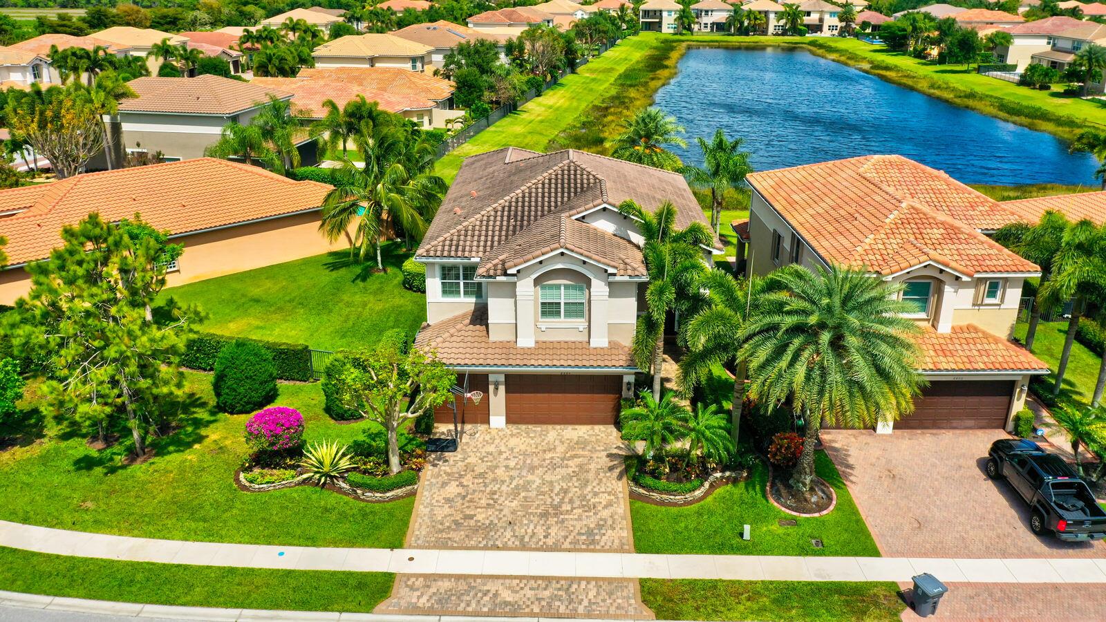Step into tropical luxury with this immaculate lakefront home on a premier oversized lot. Enjoy heated resort style salt water pool and hot tub with LED lighting, Wi-Fi automation, travertine deck, and a tiki hut – perfect for entertaining. The beautiful kitchen features 42′ cabinets, granite counters and full backsplash, built-in pantry, and reverse osmosis water system. Master suite includes custom built-in him and hers walk-in closets. The downstairs 4th bedroom comes with beautiful built-in office furniture. Highlights include wood floors on the second floor, crown molding, custom drapery, plantation shutters, iron staircase, and stunning chandeliers in various rooms. This home is filled with stunning decorative touches, completely move-in ready with nothing left do.