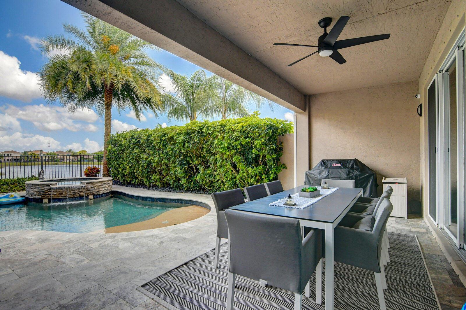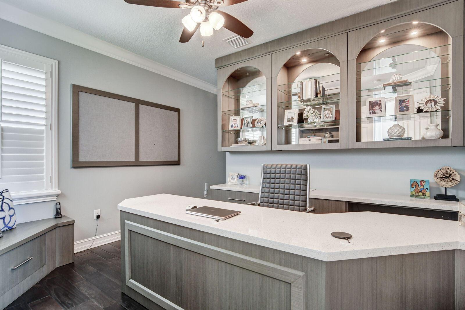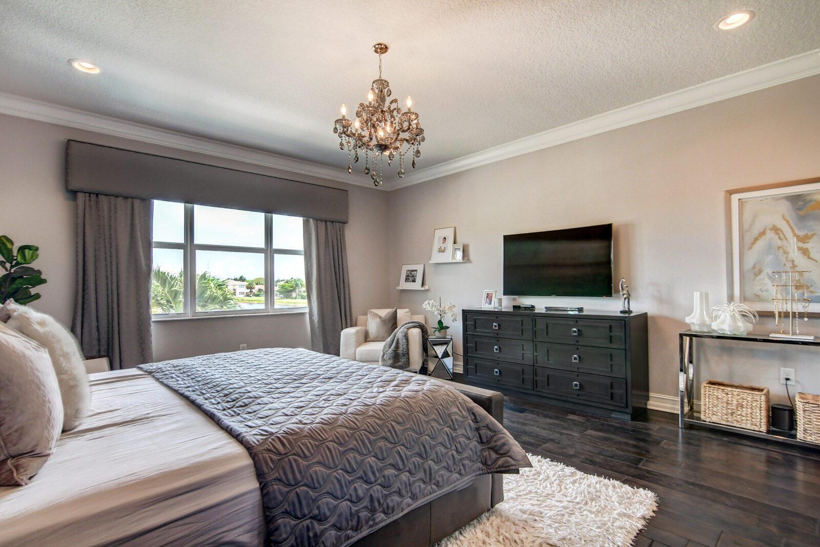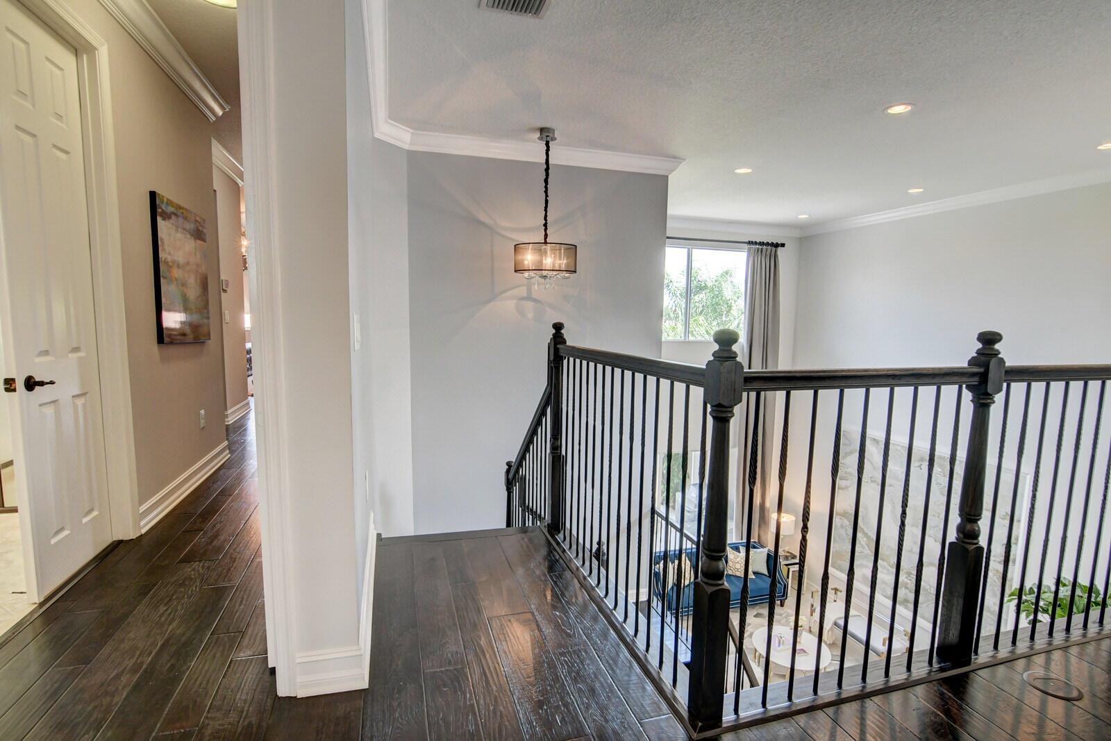 Step into tropical luxury with this immaculate lakefront home on a premier oversized lot. Enjoy heated resort style salt water pool and hot tub with LED lighting, Wi-Fi automation, travertine deck, and a tiki hut – perfect for entertaining. The beautiful kitchen features 42′ cabinets, granite counters and full backsplash, built-in pantry, and reverse osmosis water system. Master suite includes custom built-in him and hers walk-in closets. The downstairs 4th bedroom comes with beautiful built-in office furniture. Highlights include wood floors on the second floor, crown molding, custom drapery, plantation shutters, iron staircase, and stunning chandeliers in various rooms. This home is filled with stunning decorative touches, completely move-in ready with nothing left do.
