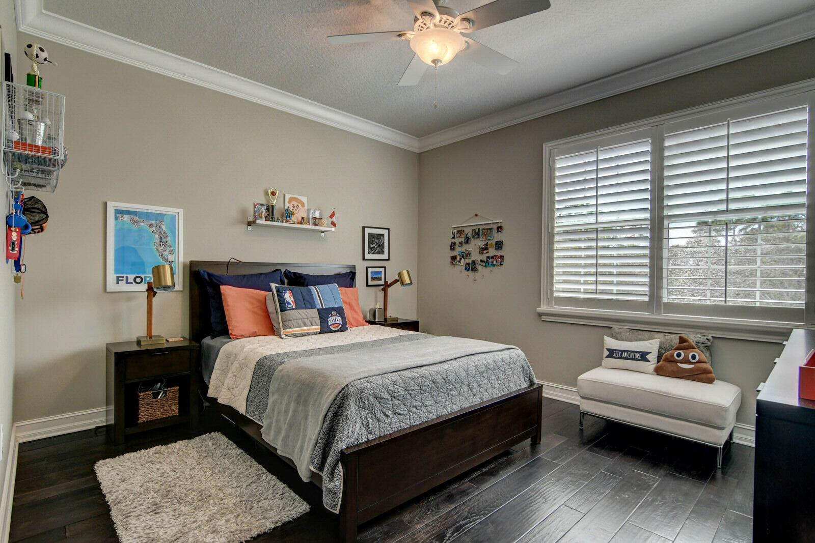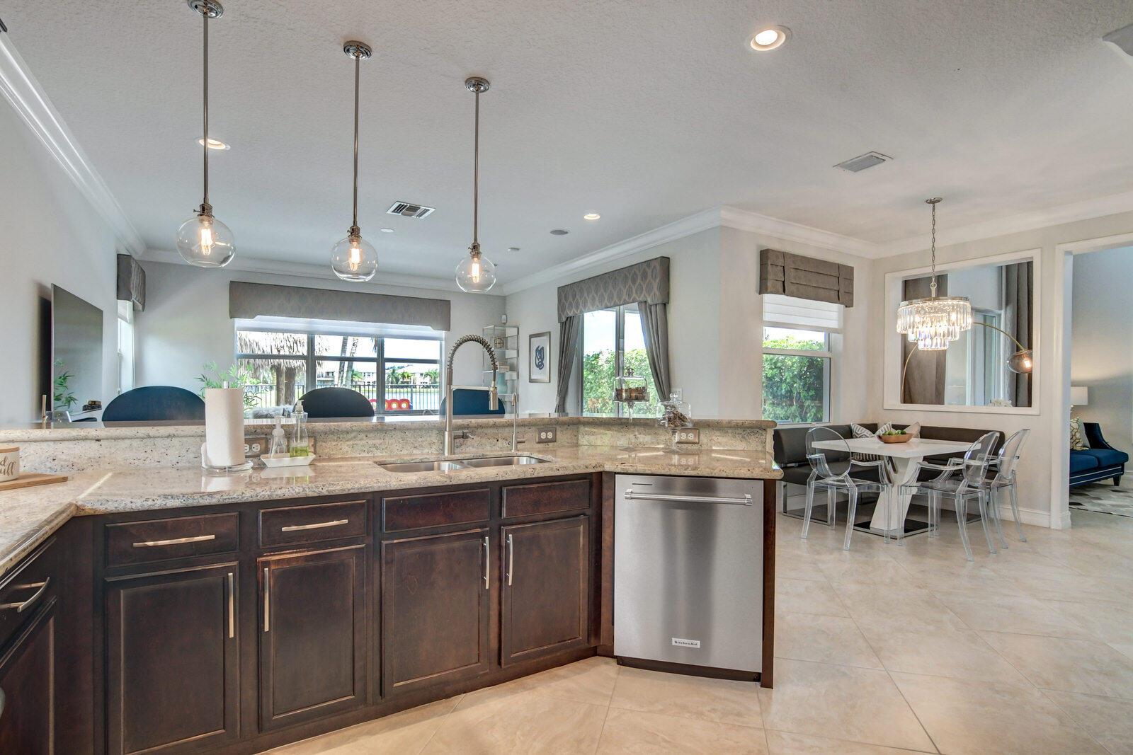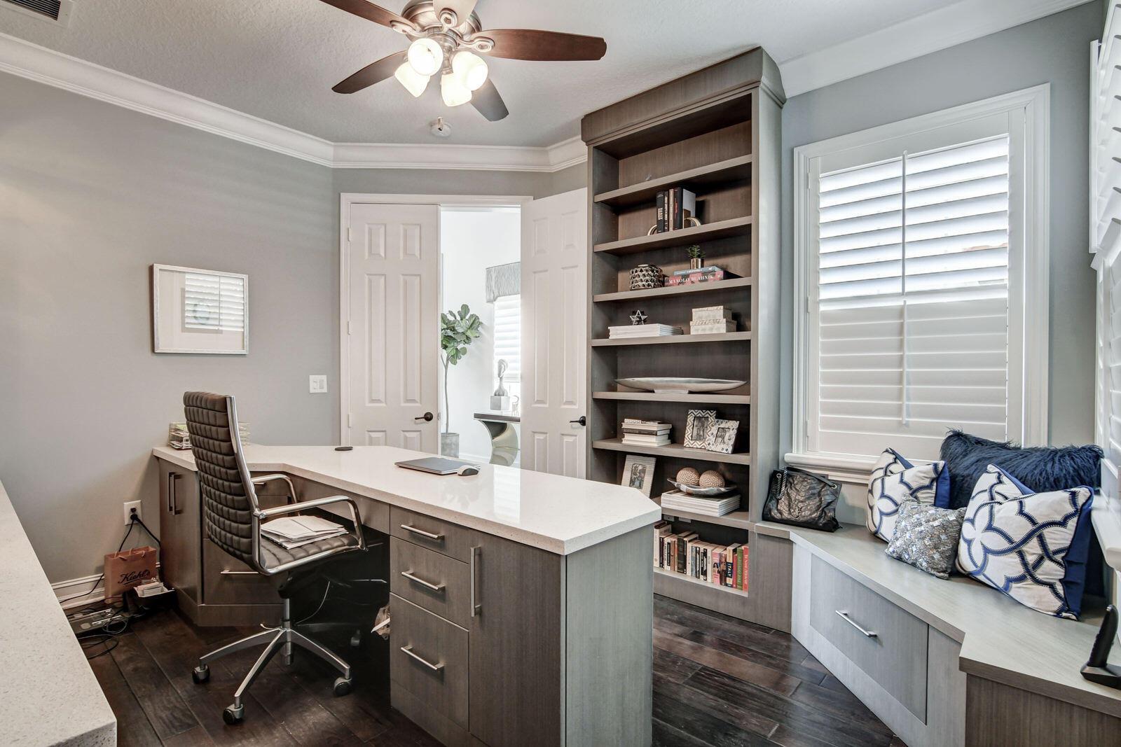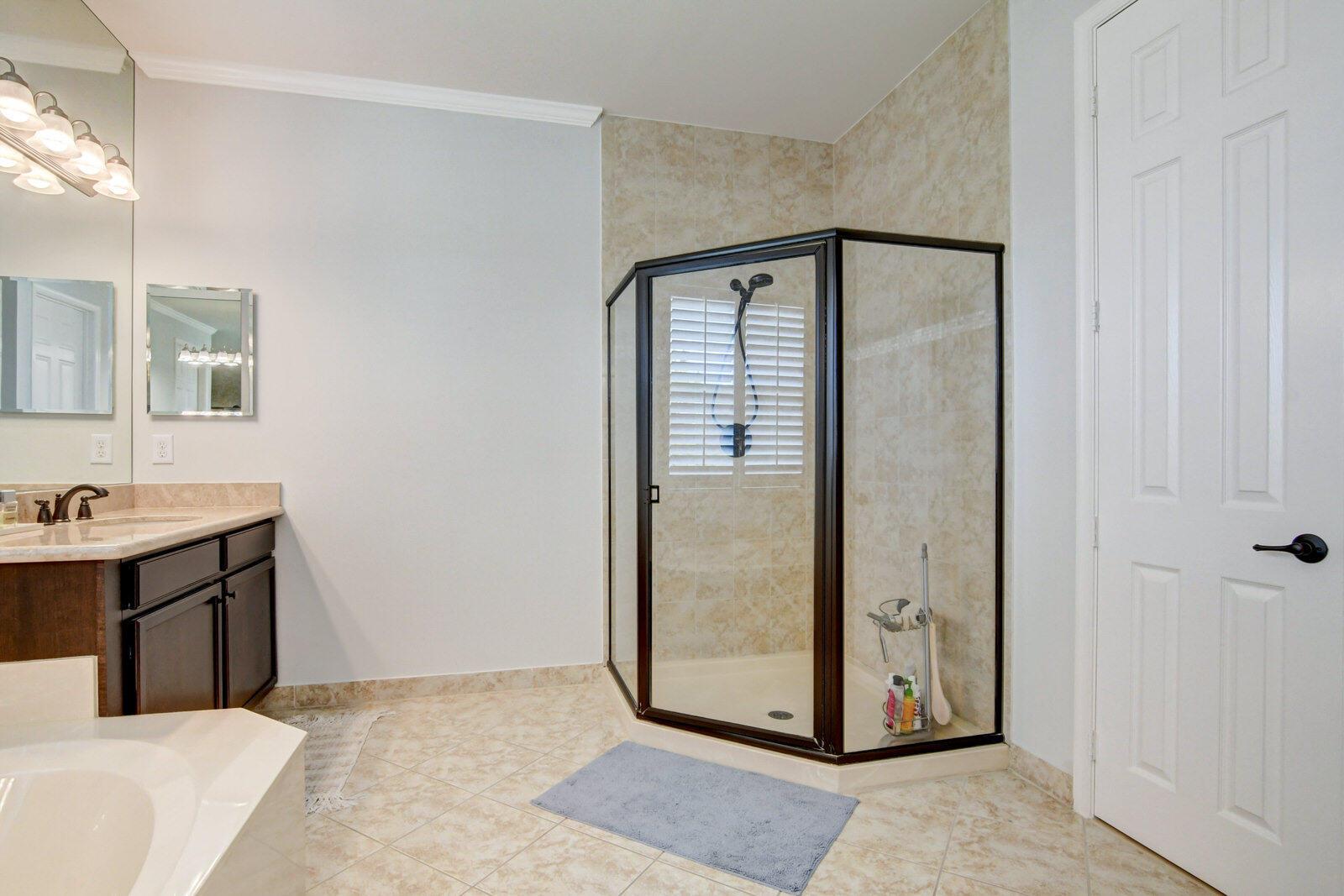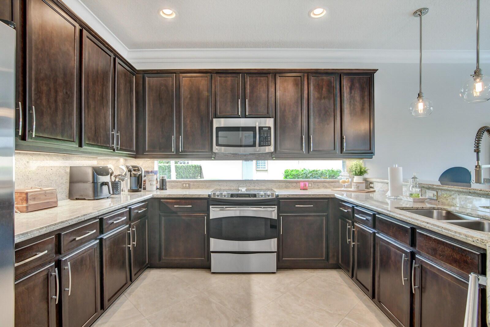 Step into tropical luxury with this immaculate lakefront home on a premier oversized lot. Enjoy heated resort style salt water pool and hot tub with LED lighting, Wi-Fi automation, travertine deck, and a tiki hut – perfect for entertaining. The beautiful kitchen features 42′ cabinets, granite counters and full backsplash, built-in pantry, and reverse osmosis water system. Master suite includes custom built-in him and hers walk-in closets. The downstairs 4th bedroom comes with beautiful built-in office furniture. Highlights include wood floors on the second floor, crown molding, custom drapery, plantation shutters, iron staircase, and stunning chandeliers in various rooms. This home is filled with stunning decorative touches, completely move-in ready with nothing left do.