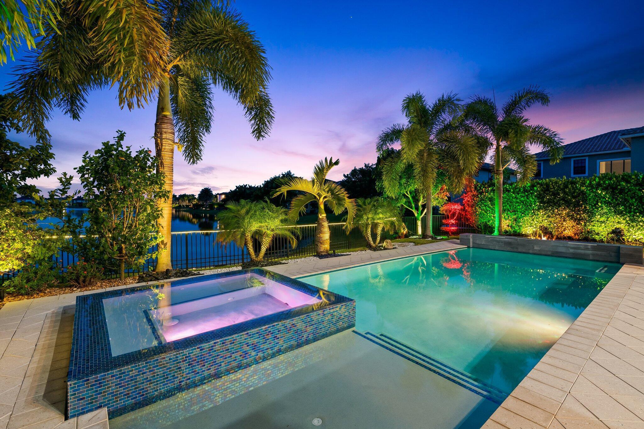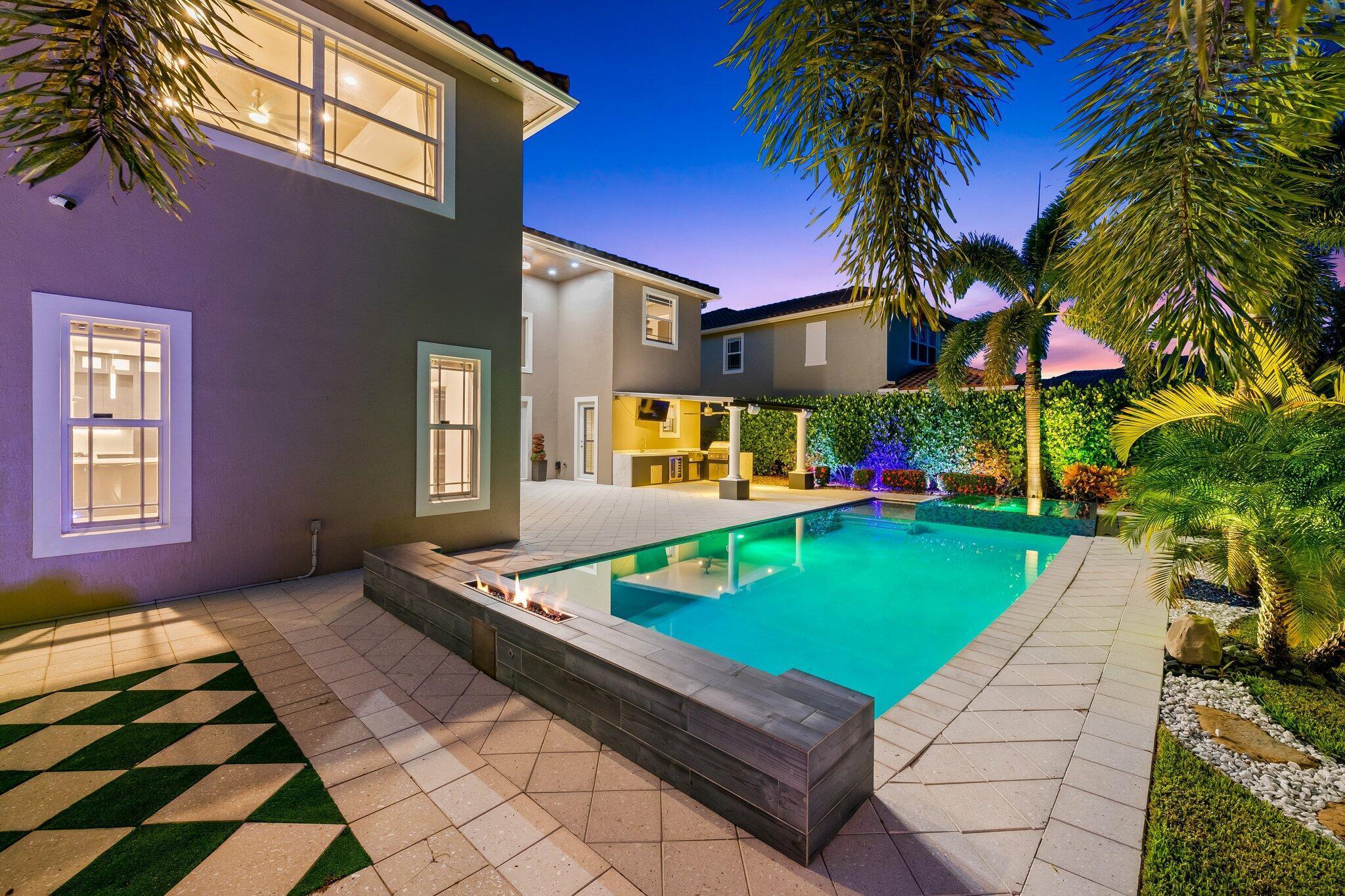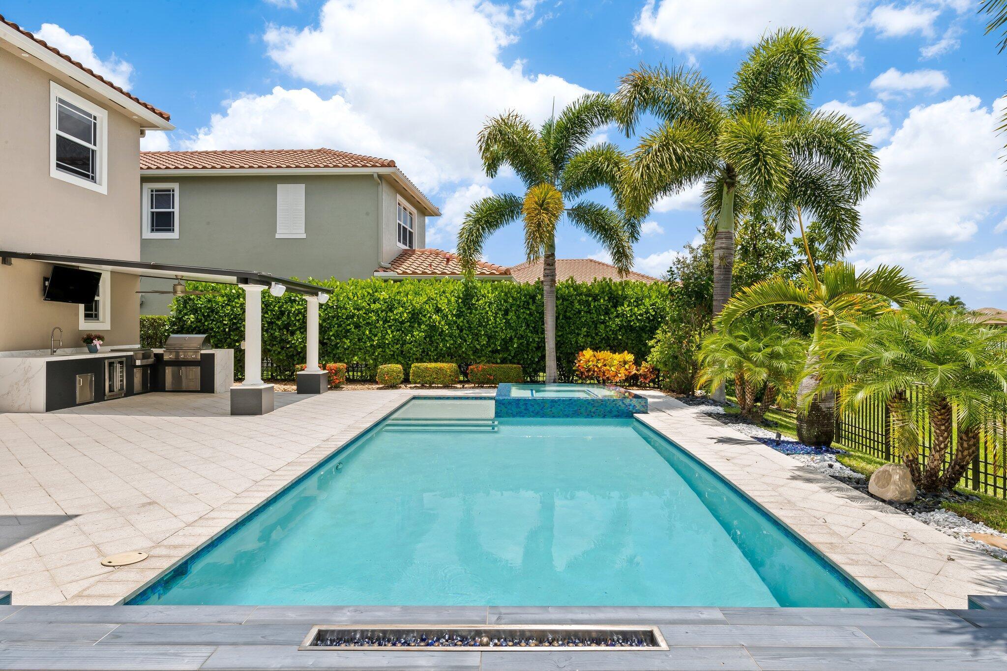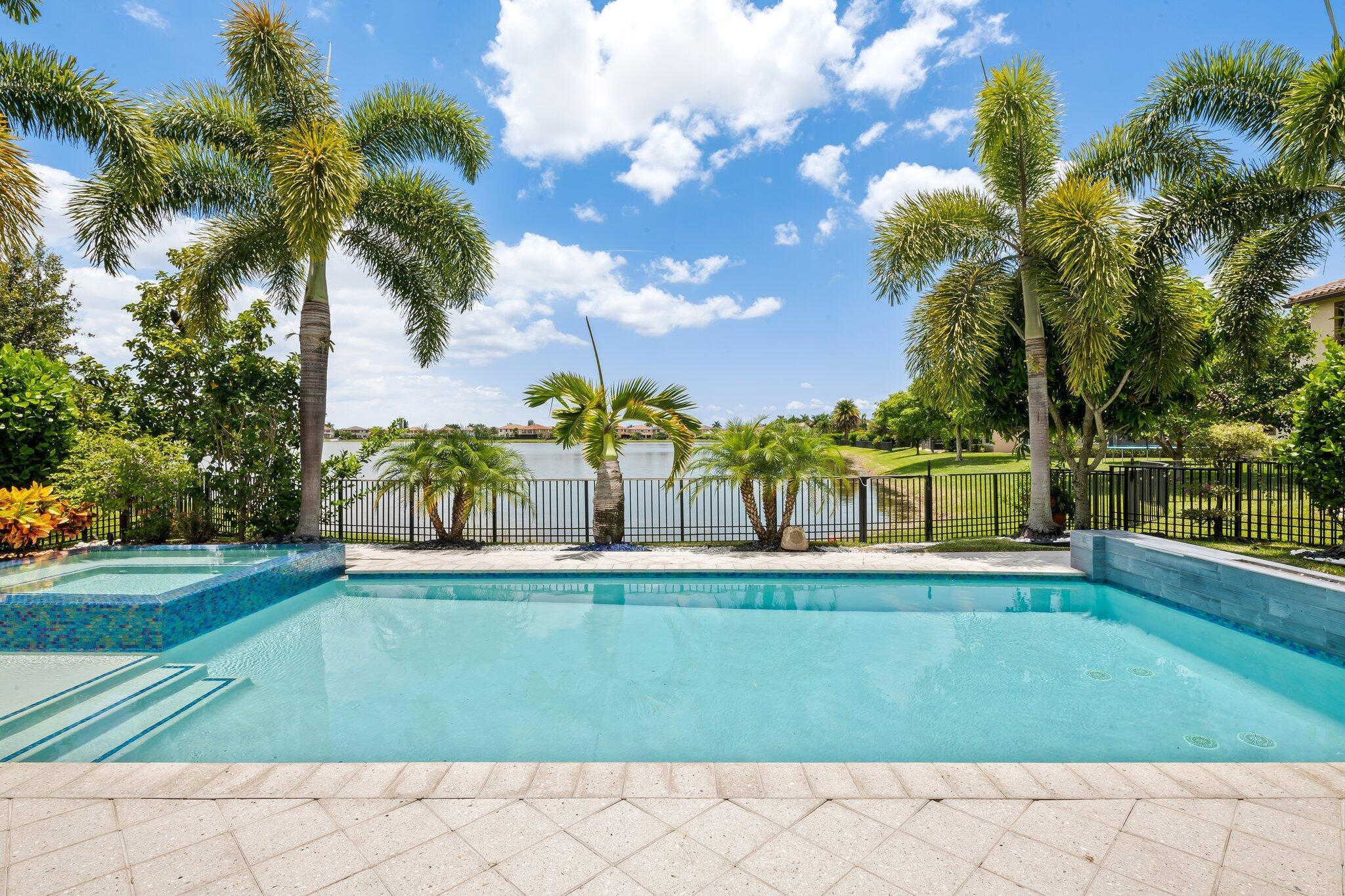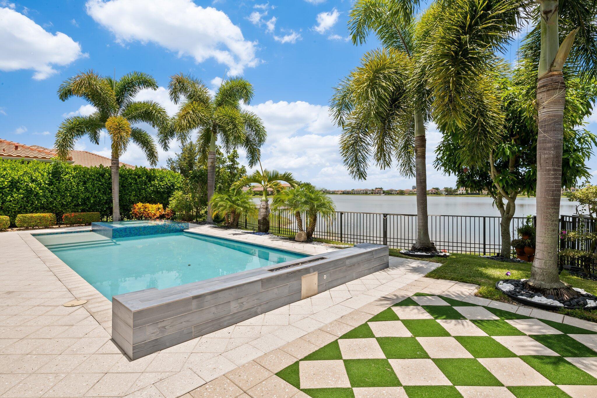 Experience luxury in this 5-bedroom, 4.5-bath Windsor Model at Miralago. From the grand entry to the serene backyard, every room boasts premium upgrades. Entertain in the formal living space with a custom-built wet bar and chandelier. The kitchen features a stunning waterfall island of exotic Brazilian granite and Richelieu cabinets.Renovated in 2019, the resort-style yard includes a gas-heated pool, spa, and fire feature. The outdoor kitchen is perfect for entertaining with matte quartzite countertops and black granite stone. Enjoy panoramic lake views and peace of mind with impact windows and a high-definition security system.Miralago’s HOA provides access to amenities like a basketball court, clubhouse, fitness center, game room, pool, sauna, and tennis courts. his home is a must see!!