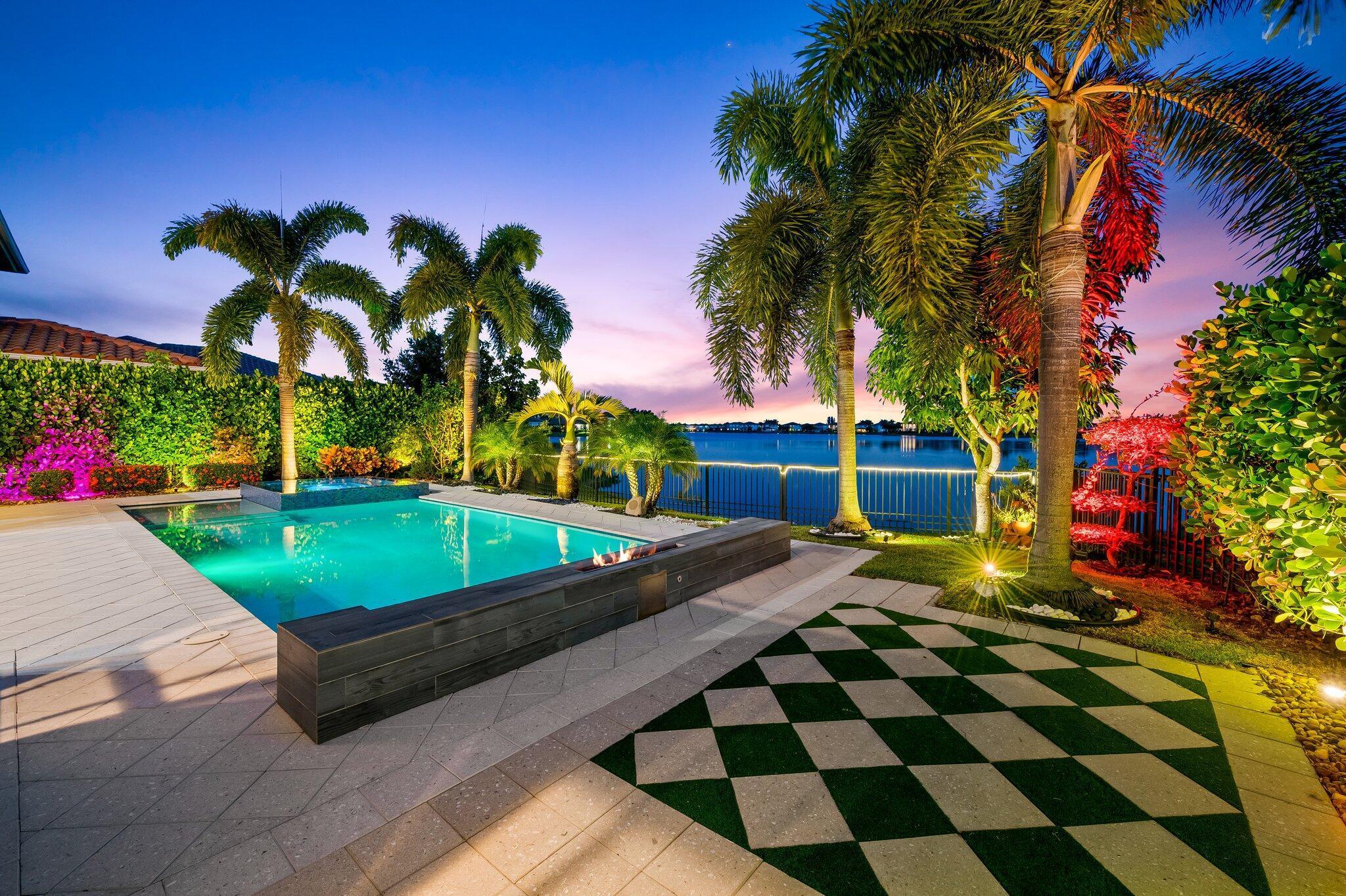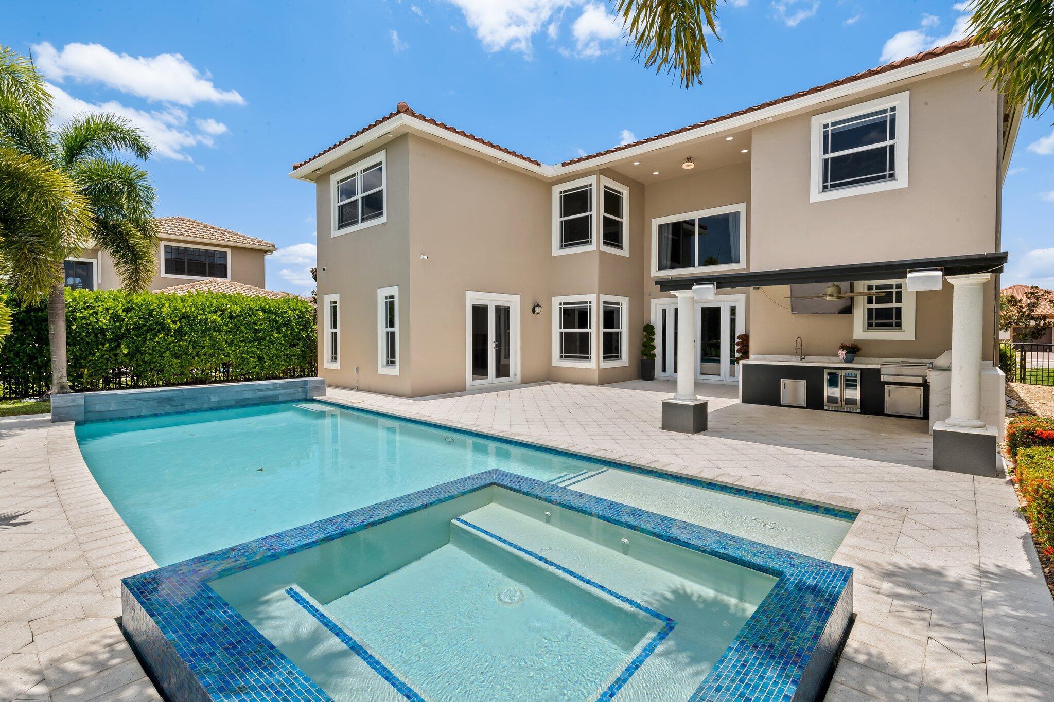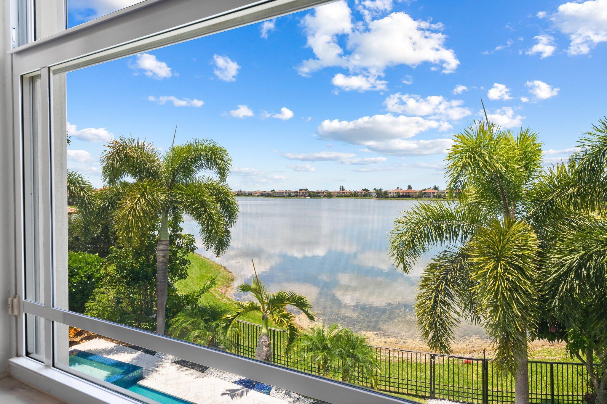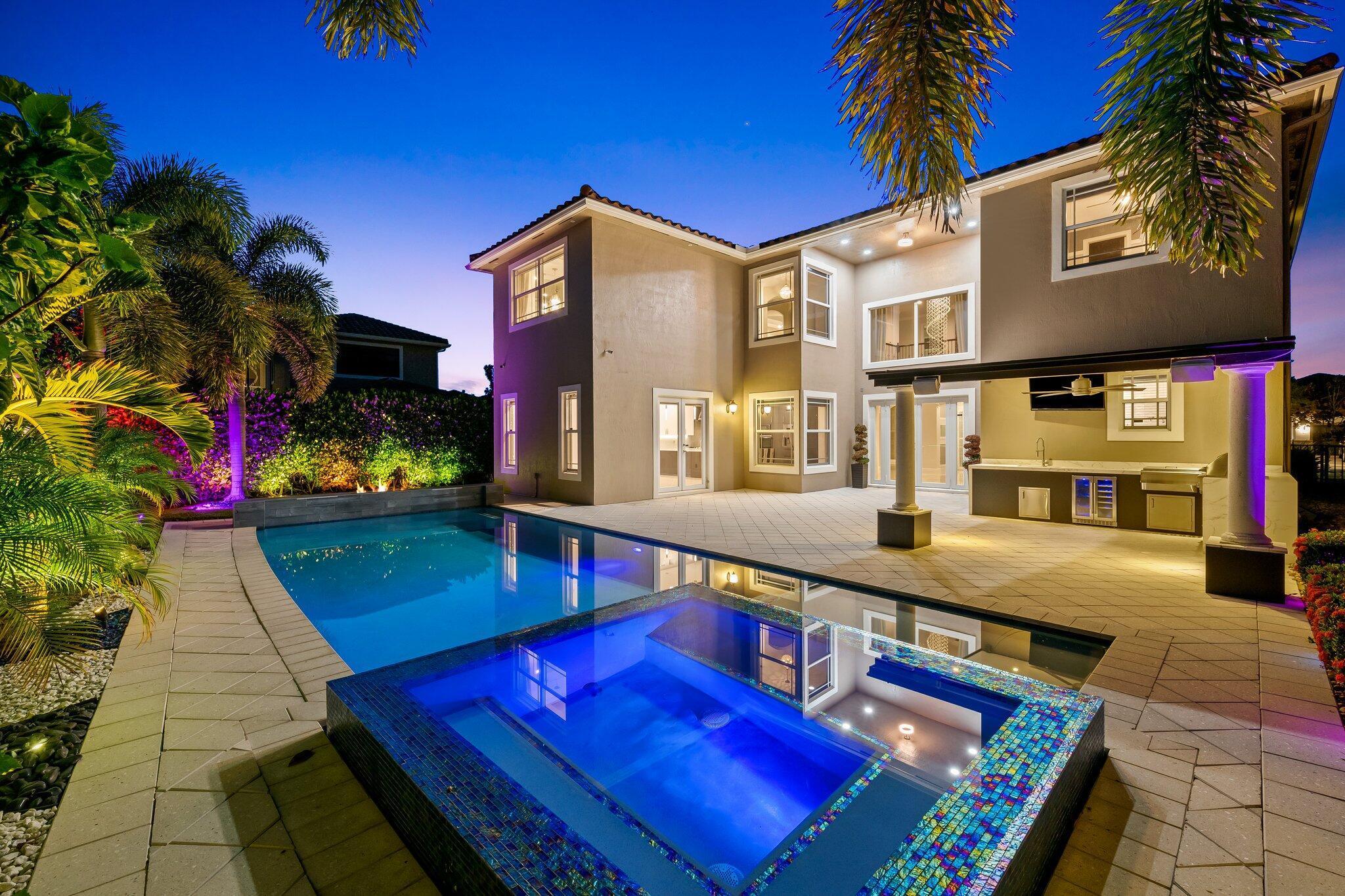 Experience luxury in this 5-bedroom, 4.5-bath Windsor Model at Miralago. From the grand entry to the serene backyard, every room boasts premium upgrades. Entertain in the formal living space with a custom-built wet bar and chandelier. The kitchen features a stunning waterfall island of exotic Brazilian granite and Richelieu cabinets.Renovated in 2019, the resort-style yard includes a gas-heated pool, spa, and fire feature. The outdoor kitchen is perfect for entertaining with matte quartzite countertops and black granite stone. Enjoy panoramic lake views and peace of mind with impact windows and a high-definition security system.Miralago’s HOA provides access to amenities like a basketball court, clubhouse, fitness center, game room, pool, sauna, and tennis courts. his home is a must see!!
