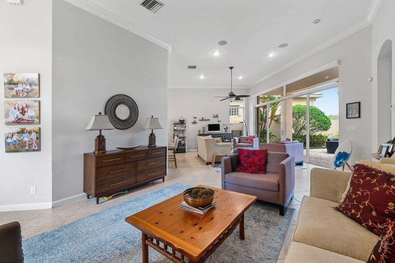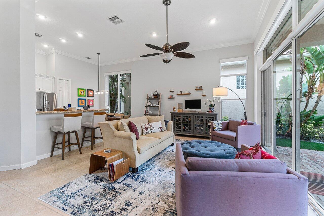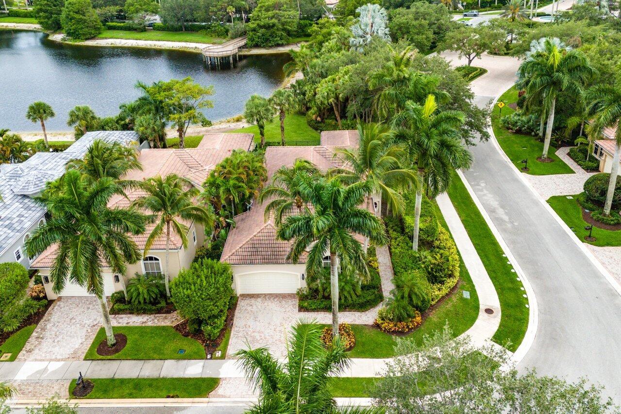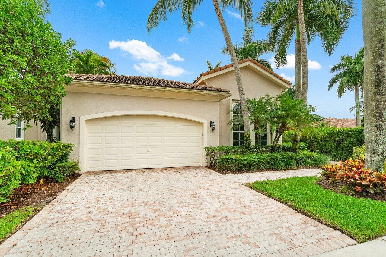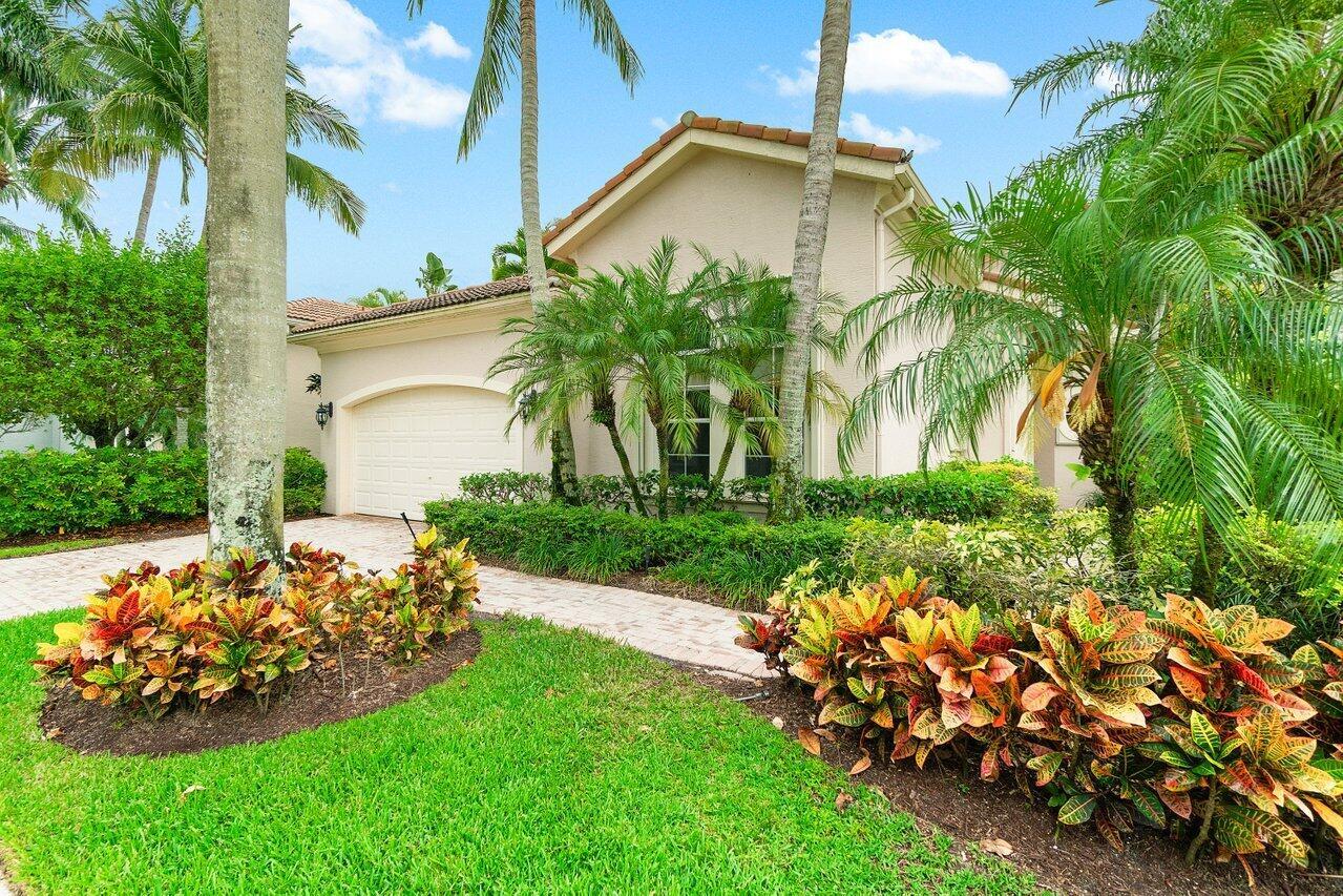 Experience the ease of Florida living at its best in this beautifully maintained 3-bedroom, 2.5-bath home nestled on a lushly landscaped corner lot with tranquil water views. Located in highly desirable Mirasol Country Club, this residence features the popular Belize model open floor perfectly designed for modern comfort and entertaining. Step inside to find a spacious great room-style layout that flows seamlessly into a stylish kitchen equipped with stainless steel appliances and a tumbled stone backsplash. The home also features crown molding throughout the main living area, accordion hurricane shutters and recent upgrades include a newer AC and hot water heater providing added efficiency. Additional features include newer floors in the bedrooms, custom motorized window treatments,