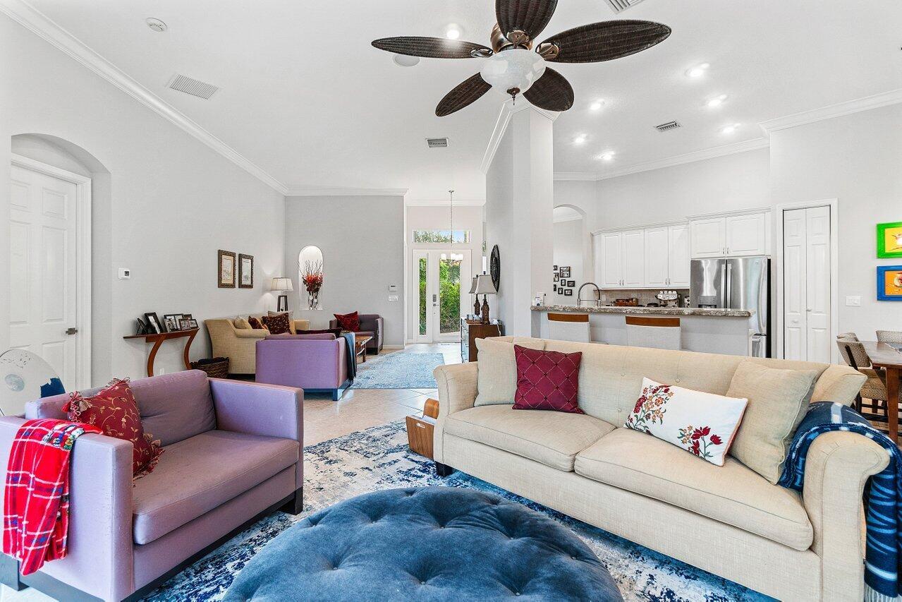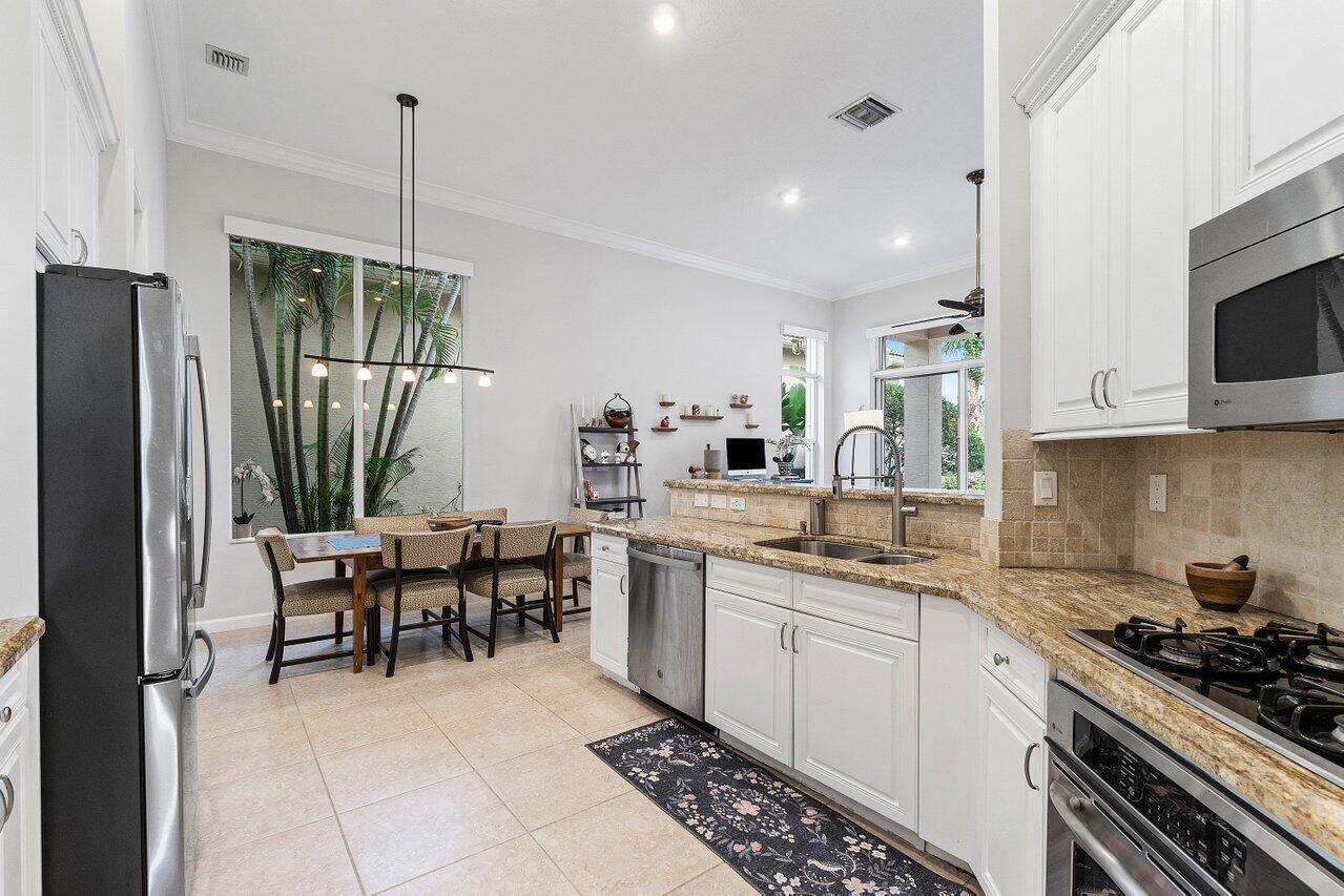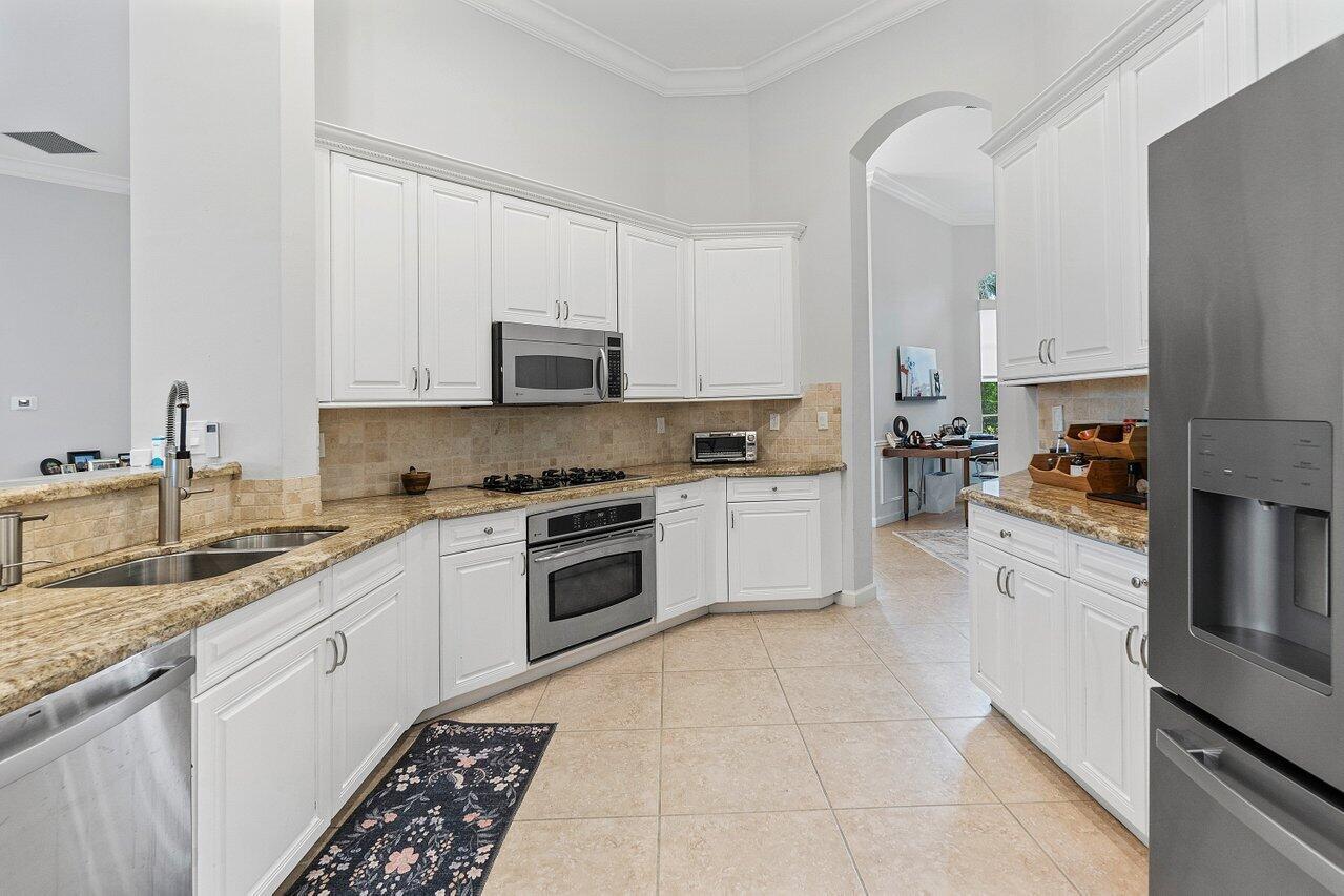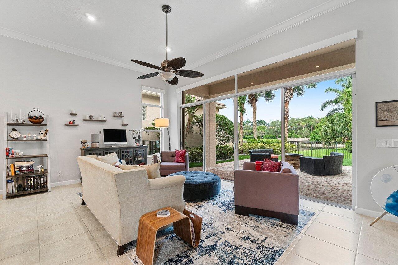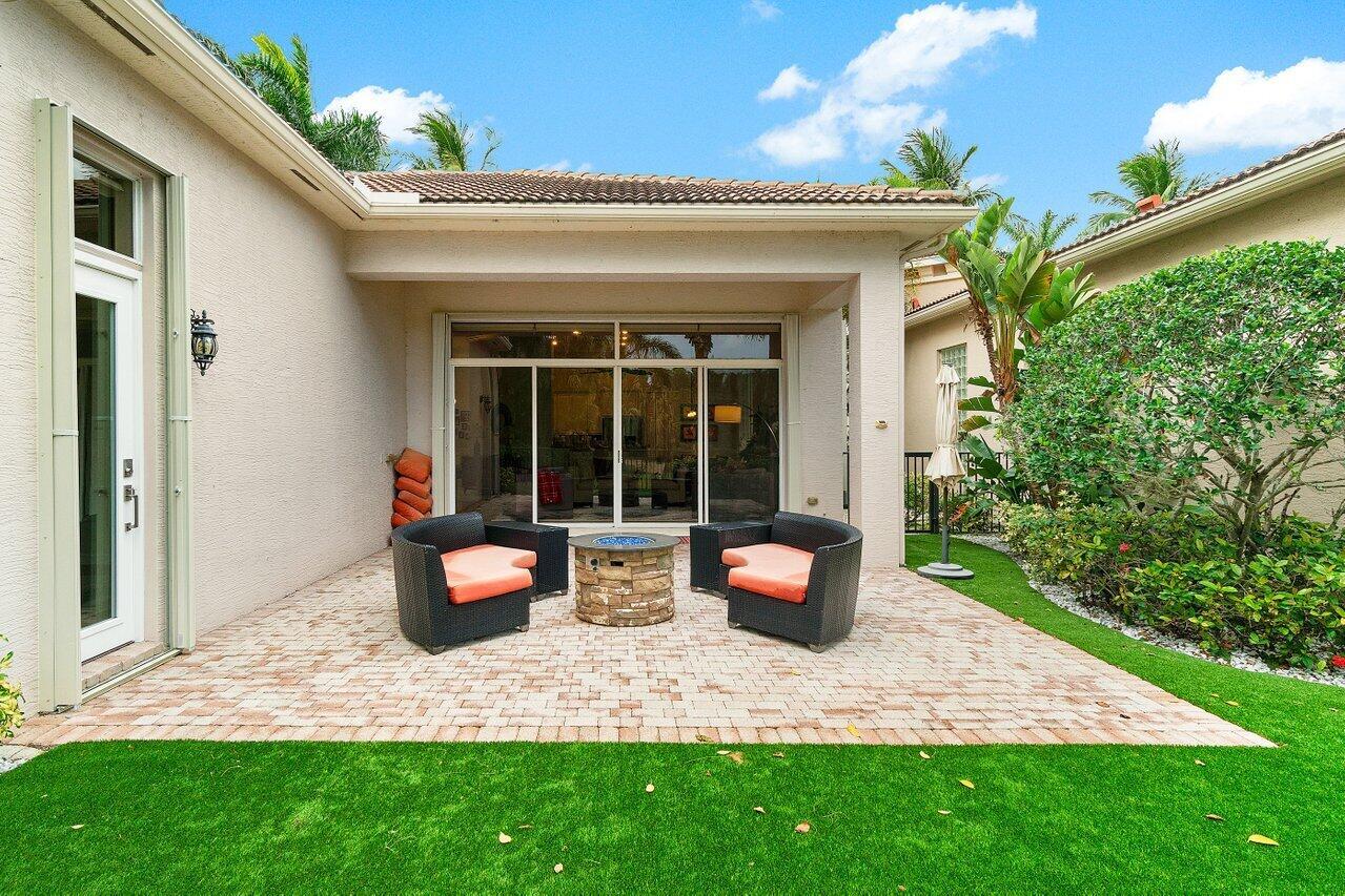 Experience the ease of Florida living at its best in this beautifully maintained 3-bedroom, 2.5-bath home nestled on a lushly landscaped corner lot with tranquil water views. Located in highly desirable Mirasol Country Club, this residence features the popular Belize model open floor perfectly designed for modern comfort and entertaining. Step inside to find a spacious great room-style layout that flows seamlessly into a stylish kitchen equipped with stainless steel appliances and a tumbled stone backsplash. The home also features crown molding throughout the main living area, accordion hurricane shutters and recent upgrades include a newer AC and hot water heater providing added efficiency. Additional features include newer floors in the bedrooms, custom motorized window treatments,