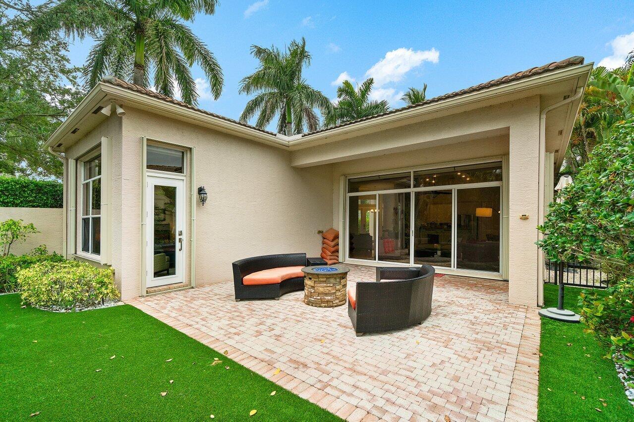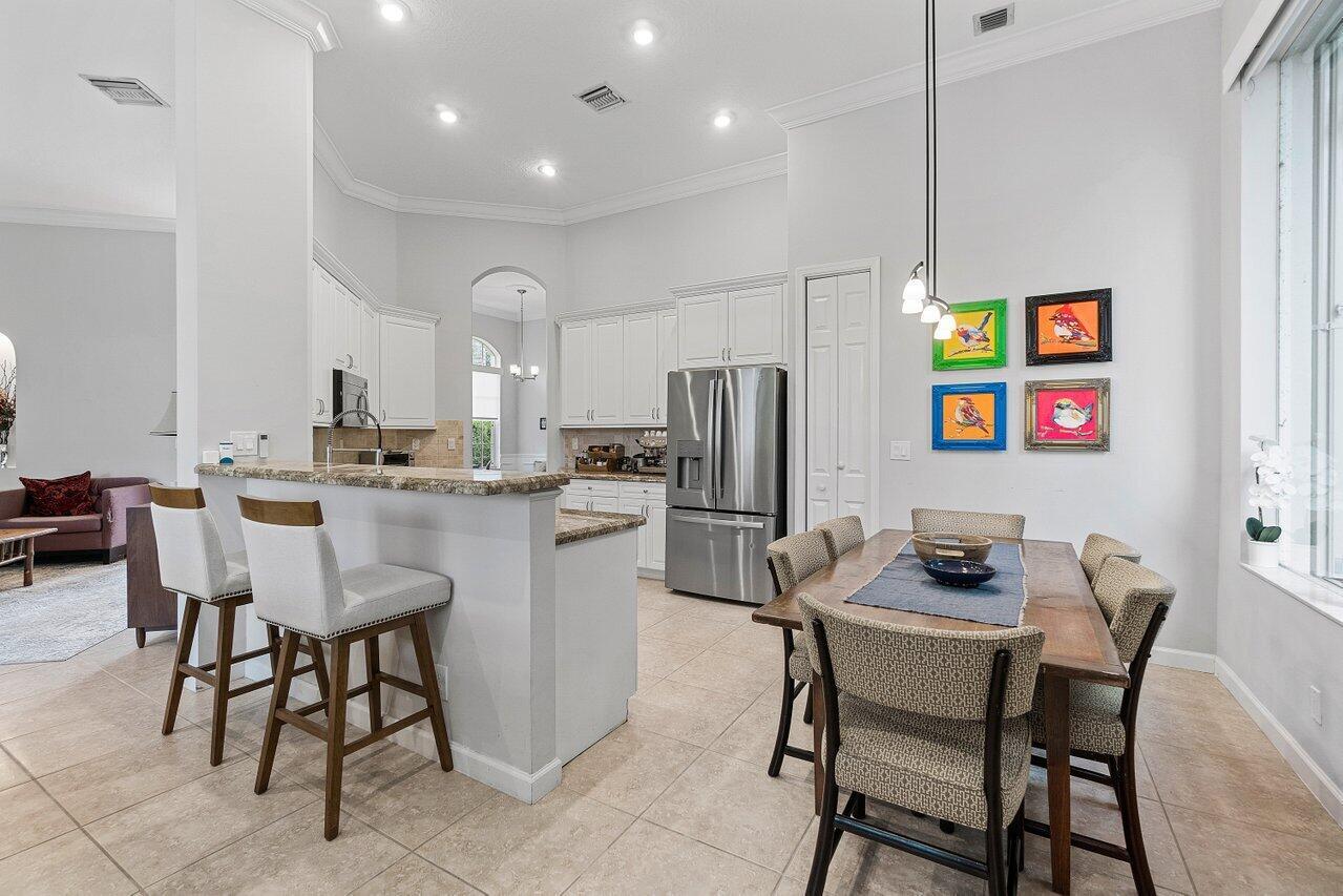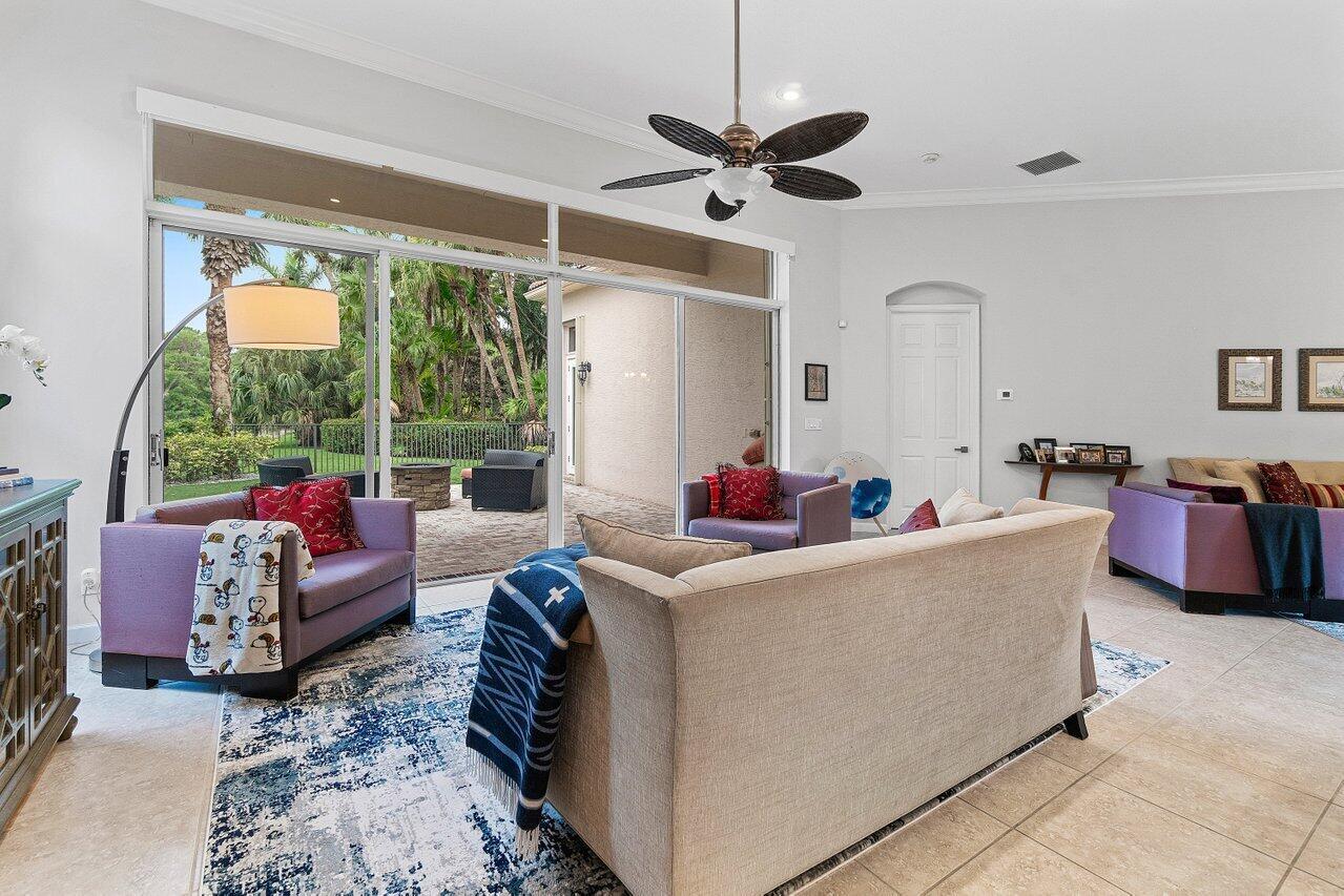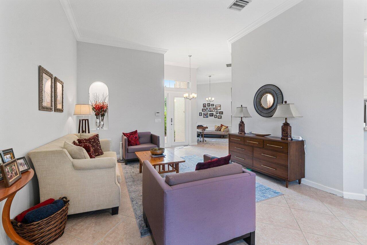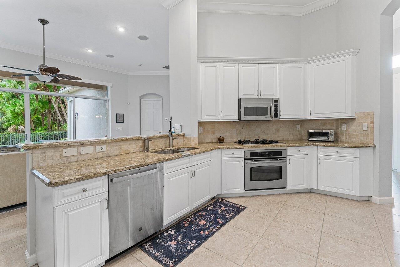Experience the ease of Florida living at its best in this beautifully maintained 3-bedroom, 2.5-bath home nestled on a lushly landscaped corner lot with tranquil water views. Located in highly desirable Mirasol Country Club, this residence features the popular Belize model open floor perfectly designed for modern comfort and entertaining. Step inside to find a spacious great room-style layout that flows seamlessly into a stylish kitchen equipped with stainless steel appliances and a tumbled stone backsplash. The home also features crown molding throughout the main living area, accordion hurricane shutters and recent upgrades include a newer AC and hot water heater providing added efficiency. Additional features include newer floors in the bedrooms, custom motorized window treatments,