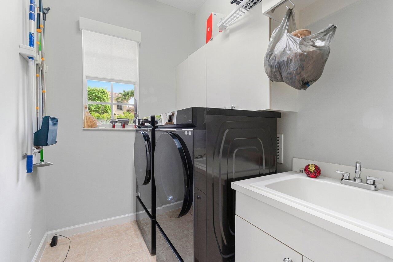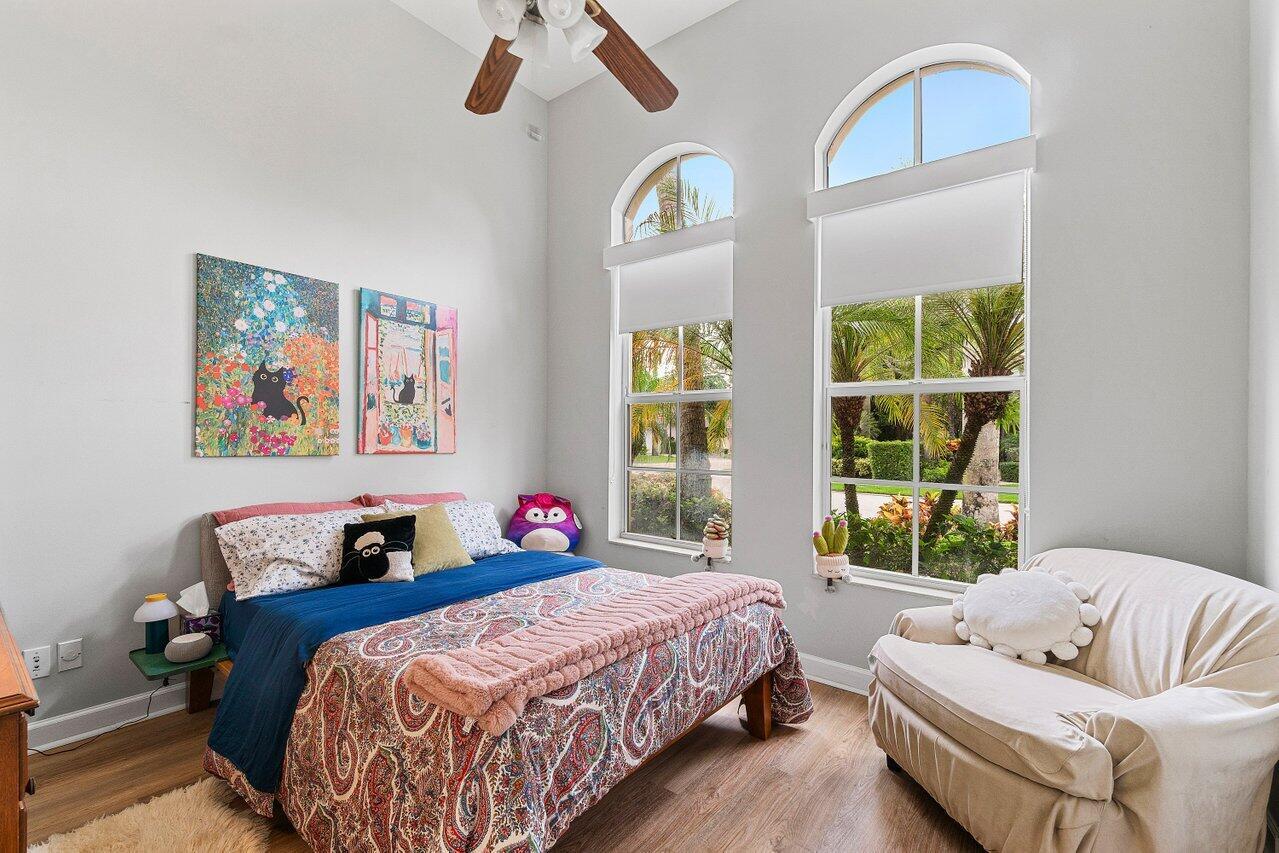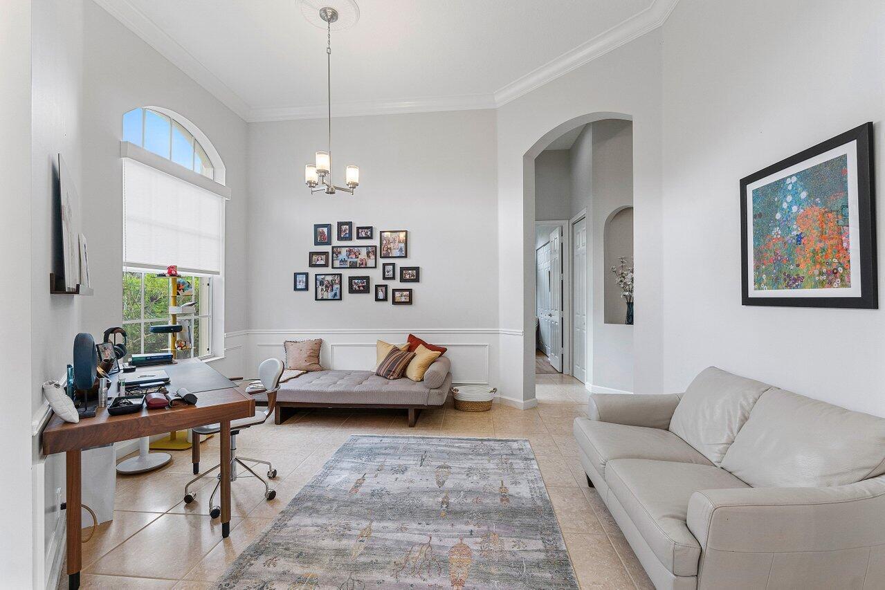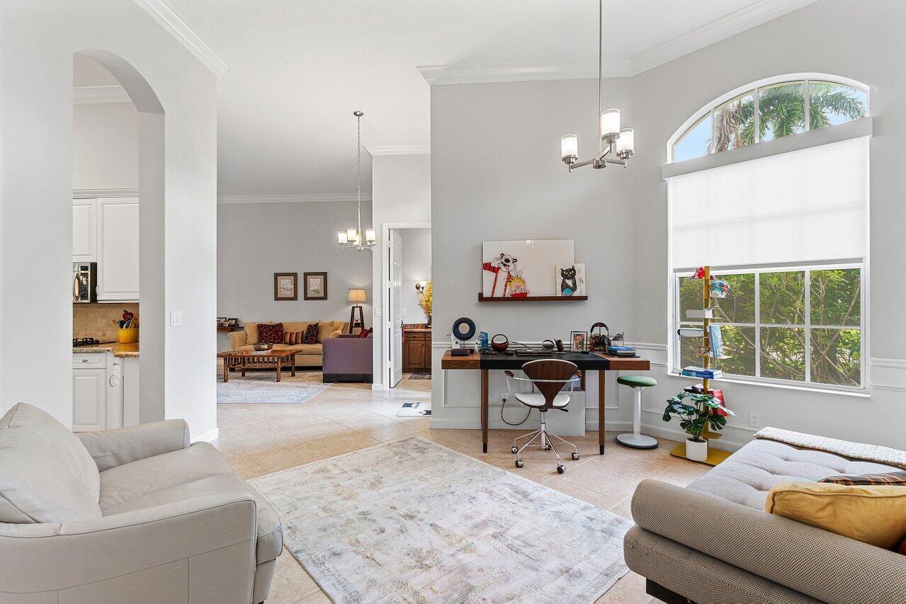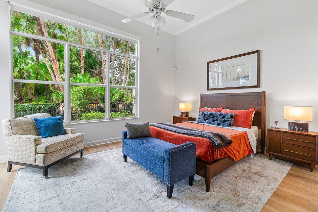 Experience the ease of Florida living at its best in this beautifully maintained 3-bedroom, 2.5-bath home nestled on a lushly landscaped corner lot with tranquil water views. Located in highly desirable Mirasol Country Club, this residence features the popular Belize model open floor perfectly designed for modern comfort and entertaining. Step inside to find a spacious great room-style layout that flows seamlessly into a stylish kitchen equipped with stainless steel appliances and a tumbled stone backsplash. The home also features crown molding throughout the main living area, accordion hurricane shutters and recent upgrades include a newer AC and hot water heater providing added efficiency. Additional features include newer floors in the bedrooms, custom motorized window treatments,