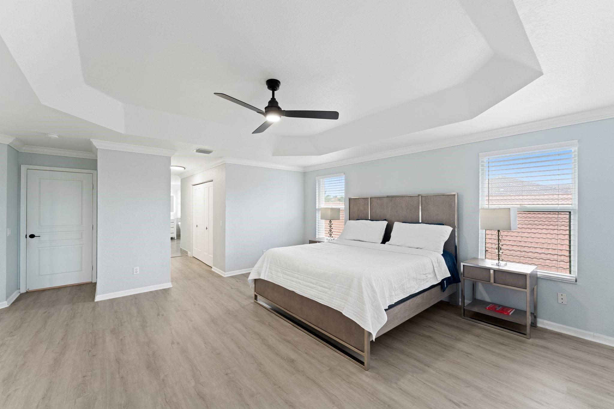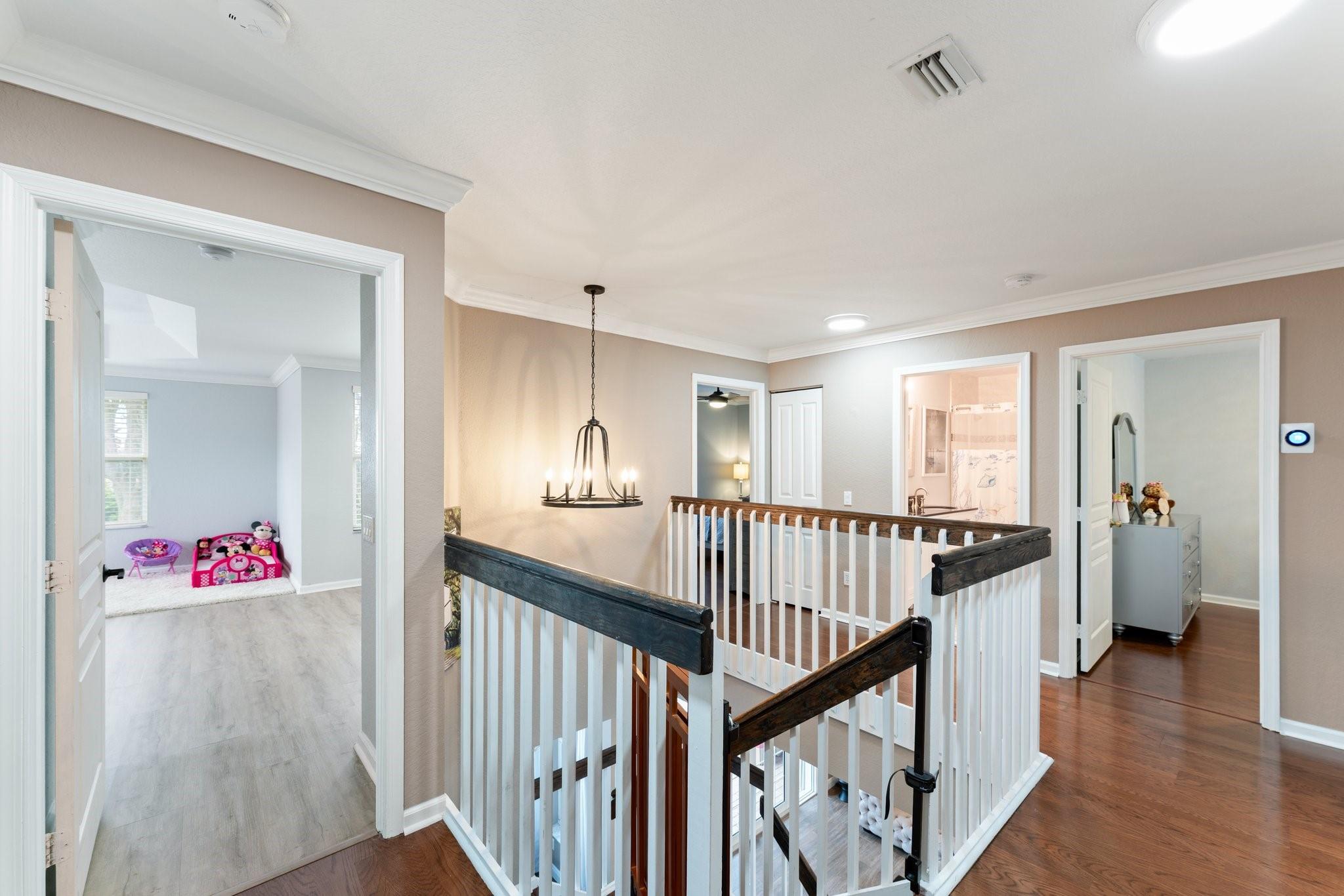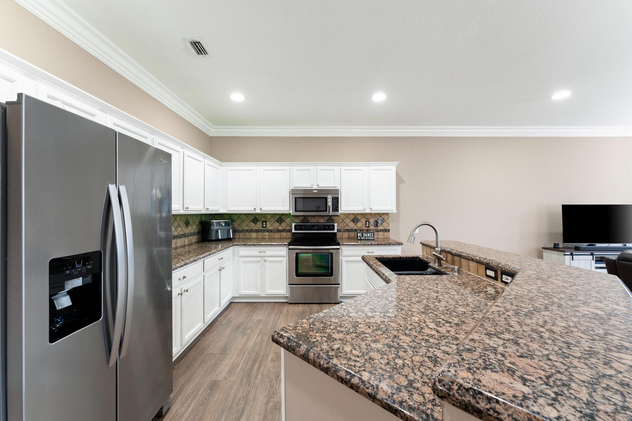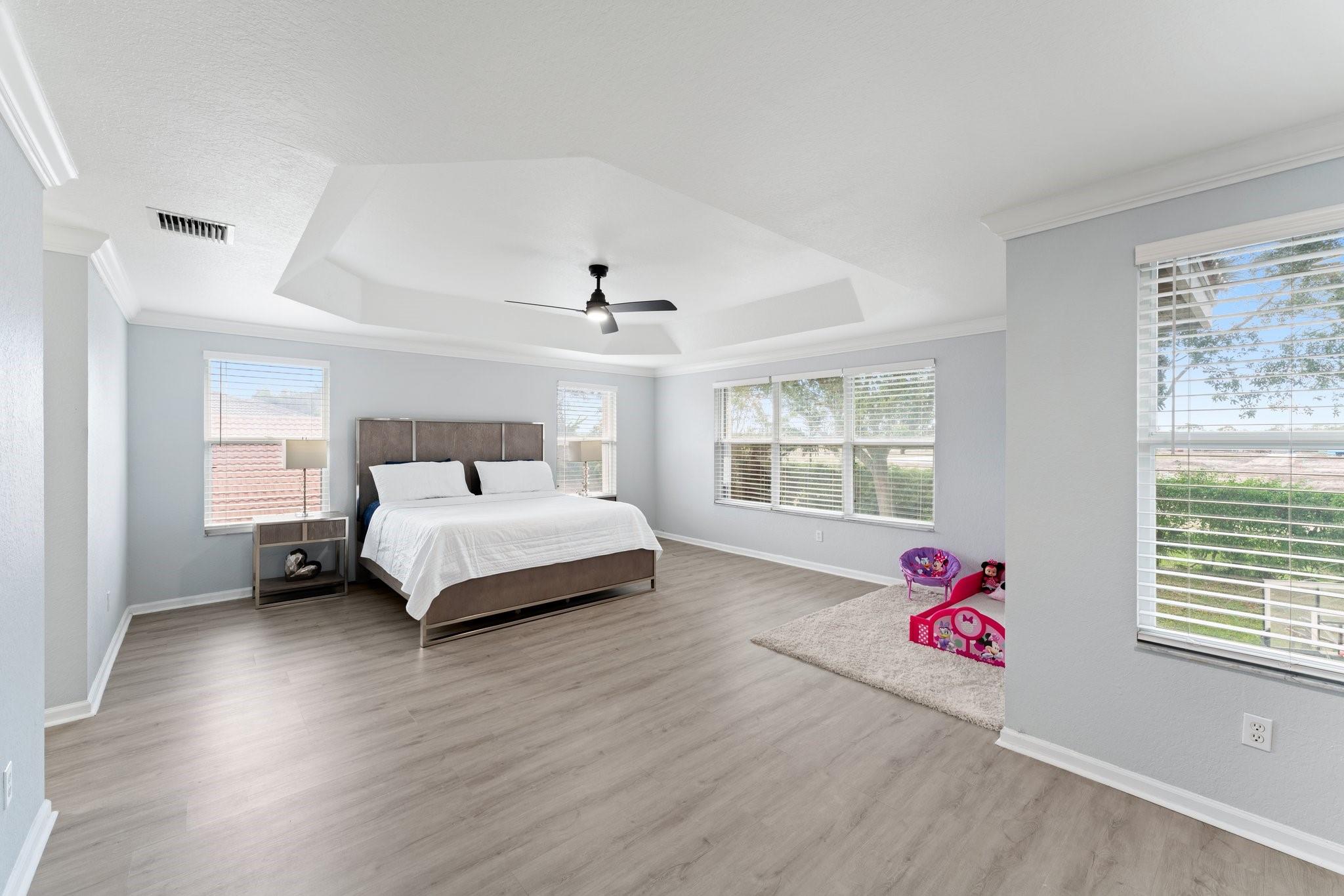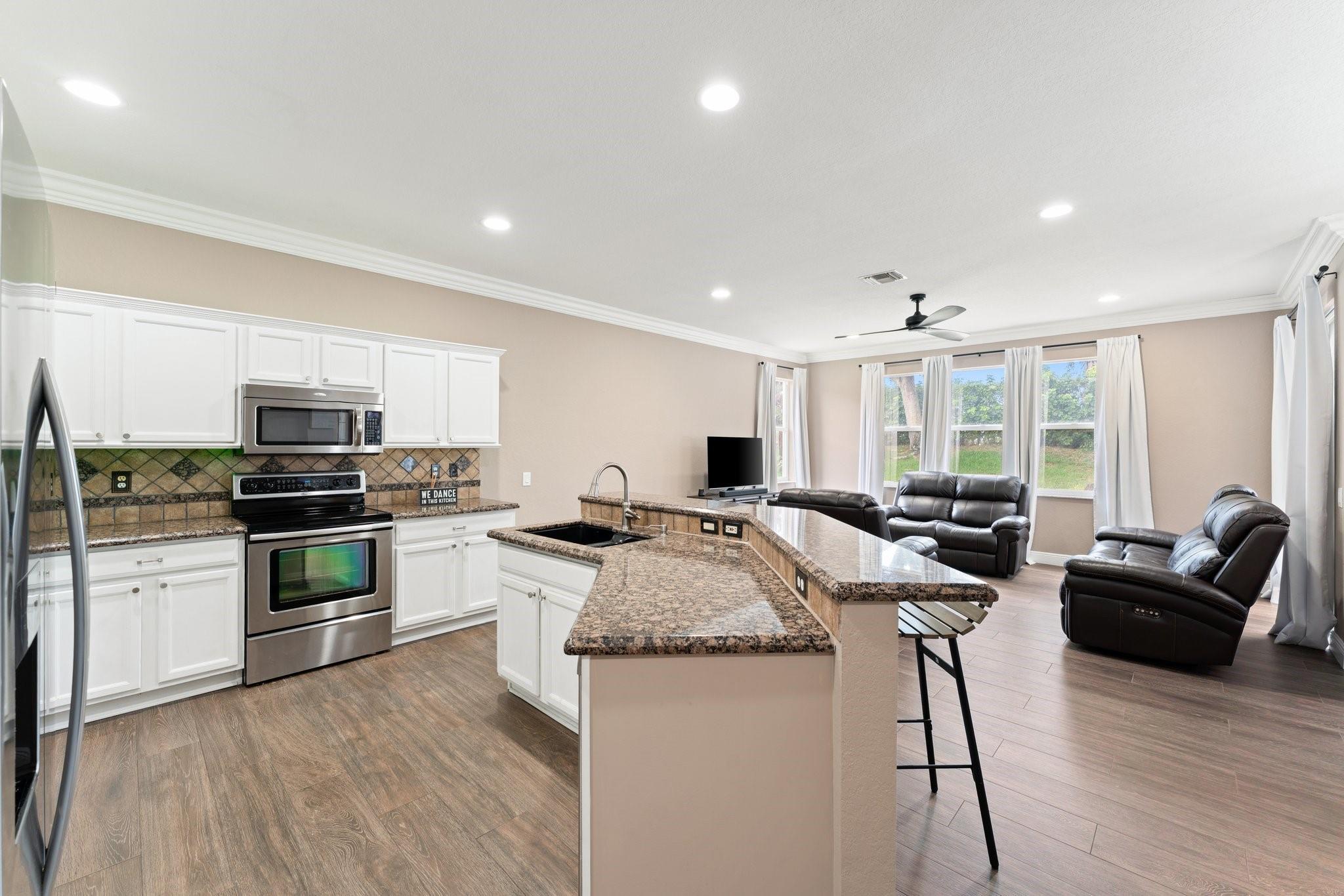 This stunning 5 bedroom, 3 bath home blends comfort and style. The first floor features upgraded flooring, two living/dining areas, and a chef’s kitchen with granite counters, stainless appliances, island seating, large pantry, and a bay window breakfast nook with backyard views. A guest bedroom, full bath, and laundry room with new washer/dryer complete the main level. Upstairs, the grand master suite offers a tray ceiling, sitting area, and remodeled spa-like bath with dual sinks, roman tub, and separate shower. Enjoy resort style amenities: pool, tennis, pickleball, basketball, and gym.