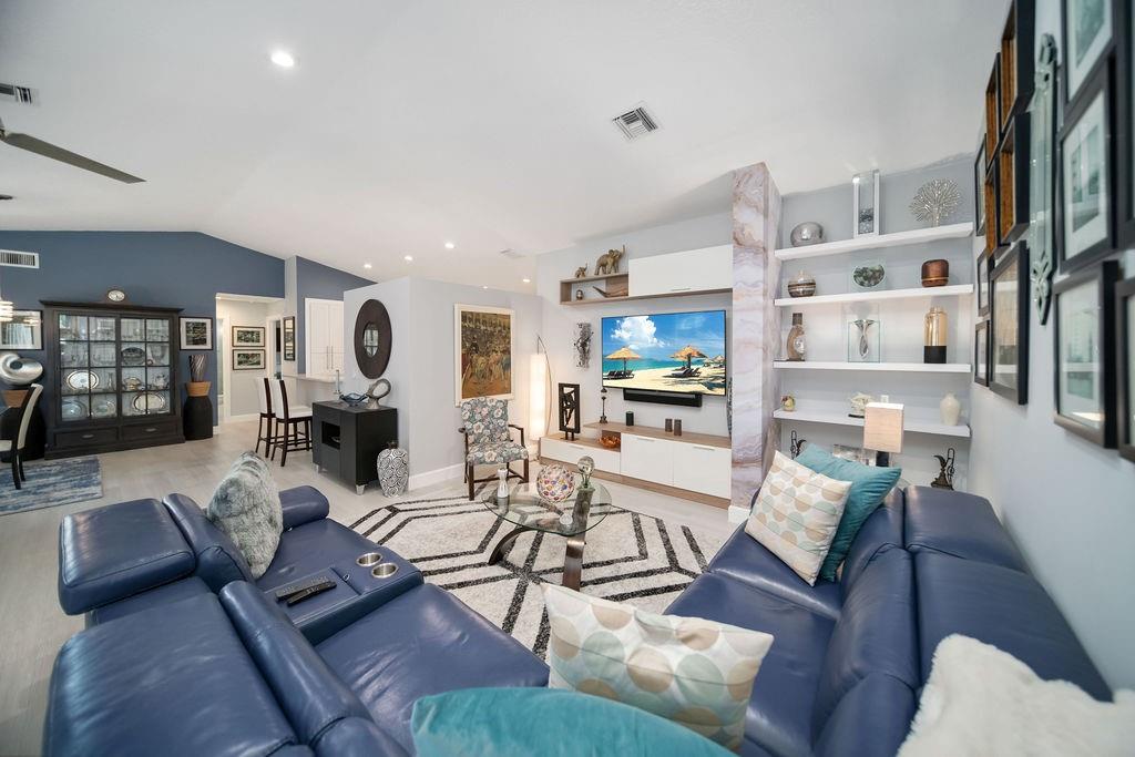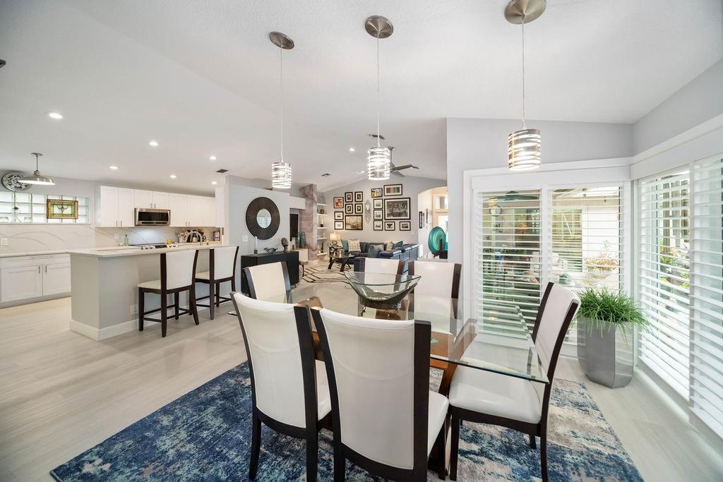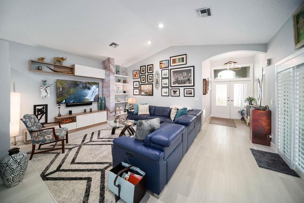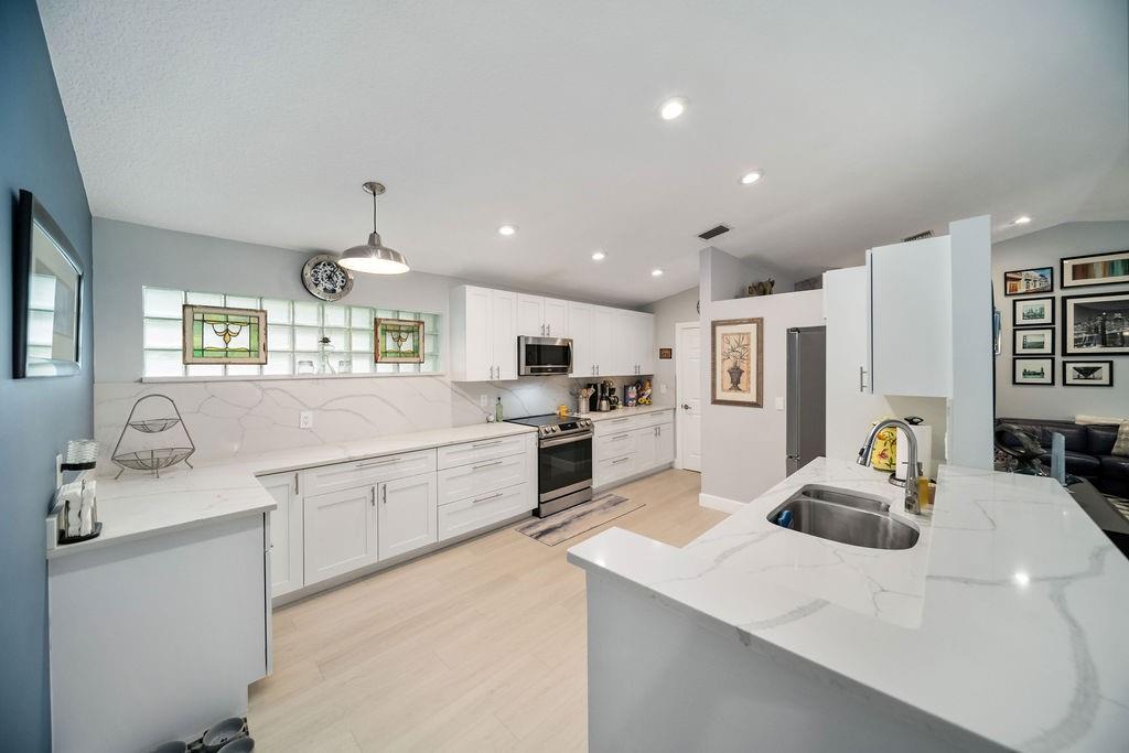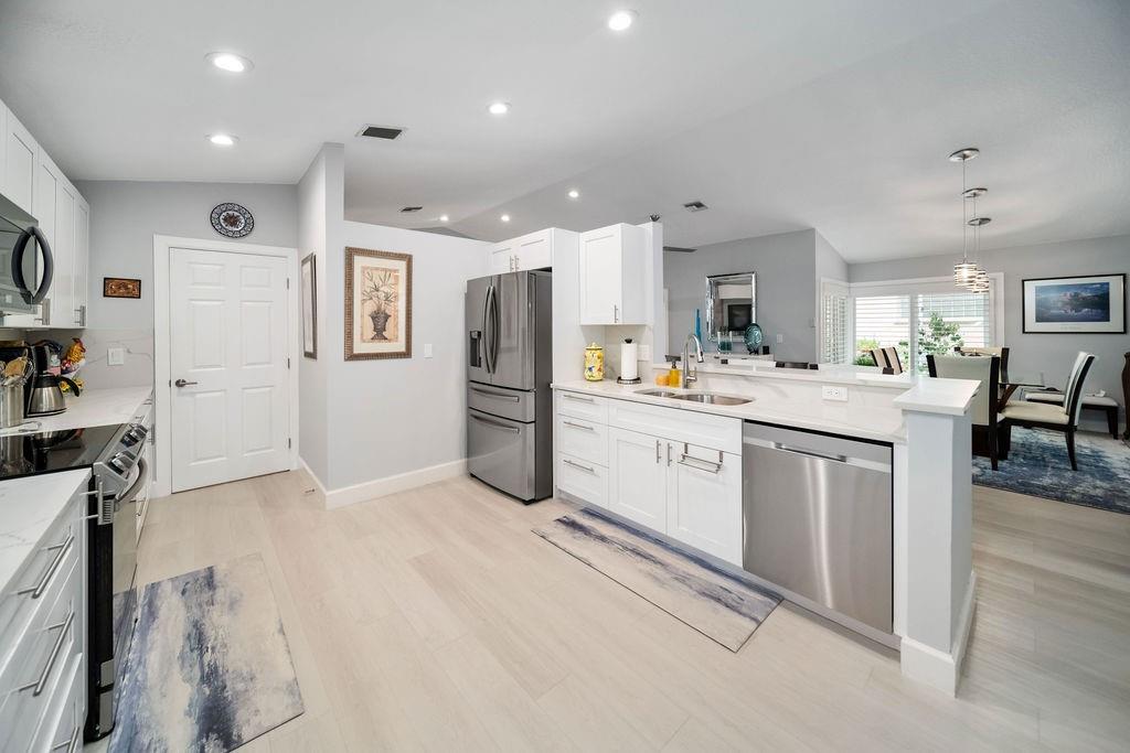 Fabulous updated 3-bed, 2-bath single-family home with 2-car garage. Features all-new impact windows/doors, stainless steel appliances, quartz countertops in kitchen and master bath, and a sleek grout-free master shower. Includes central vacuum, newer washer/dryer, 5-ton Carrier A/C, laminate in bedrooms, and vinyl throughout. Enjoy resort-style amenities: clubhouse, pool, tennis, gym, billiards, and theater. $4,000 one-time capital contribution at closing. $300 café card charged annually in July. Owner to pay assessment at closing. Clubhouse is currently going through a $25 M. renovation and is in the final phase for completion. Move-in ready and beautifully maintained!