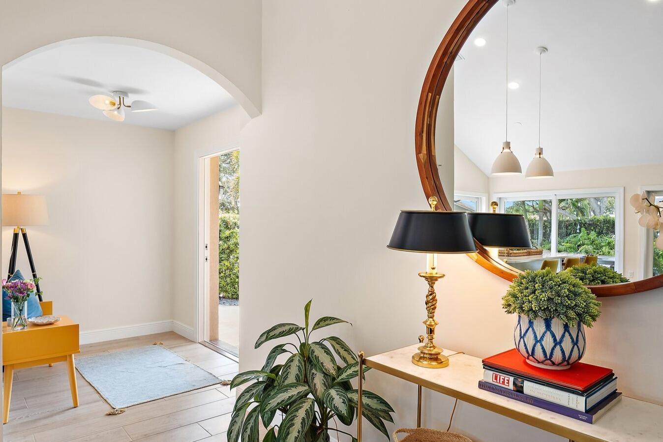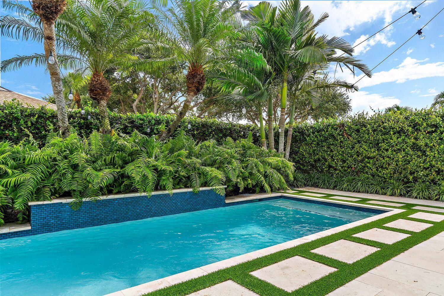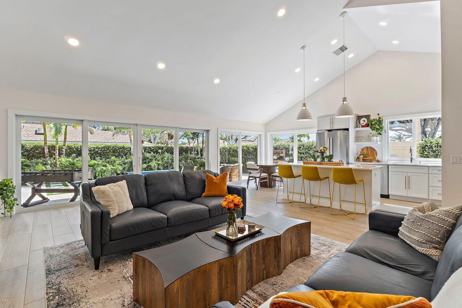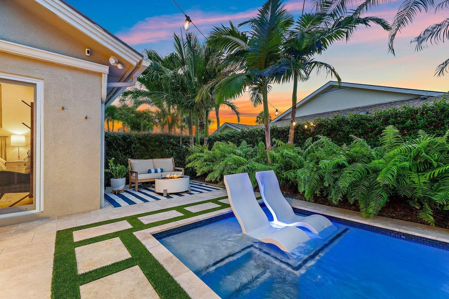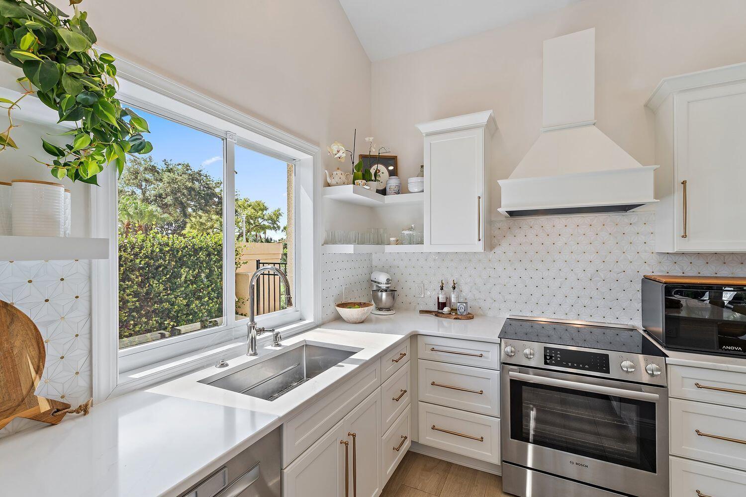 Feel the breeze! Highly desirable, southeast corner property in prime location in the Bluffs and close to beautiful Jupiter Beach. Embark on a delightful journey through this beautifully renovated home where subtle design choices make all the difference. The redesigned kitchen provides for a more formal arched entry leading to an open floor plan with serene views of the tropical landscape and beckoning pool. Enjoy the sophistication of Bosch appliances, white cabinetry with smart storage solutions, a custom hood, and stunning mosaic marble backsplash and counters. The accent shelving and brass details add a touch of understated luxury. Impact glass, new AC 2023, stunning salt-chlorinated pool w/sun shelf + sheer descent water feature completed in 2024, Oak wood-plank tile floors, vaulted