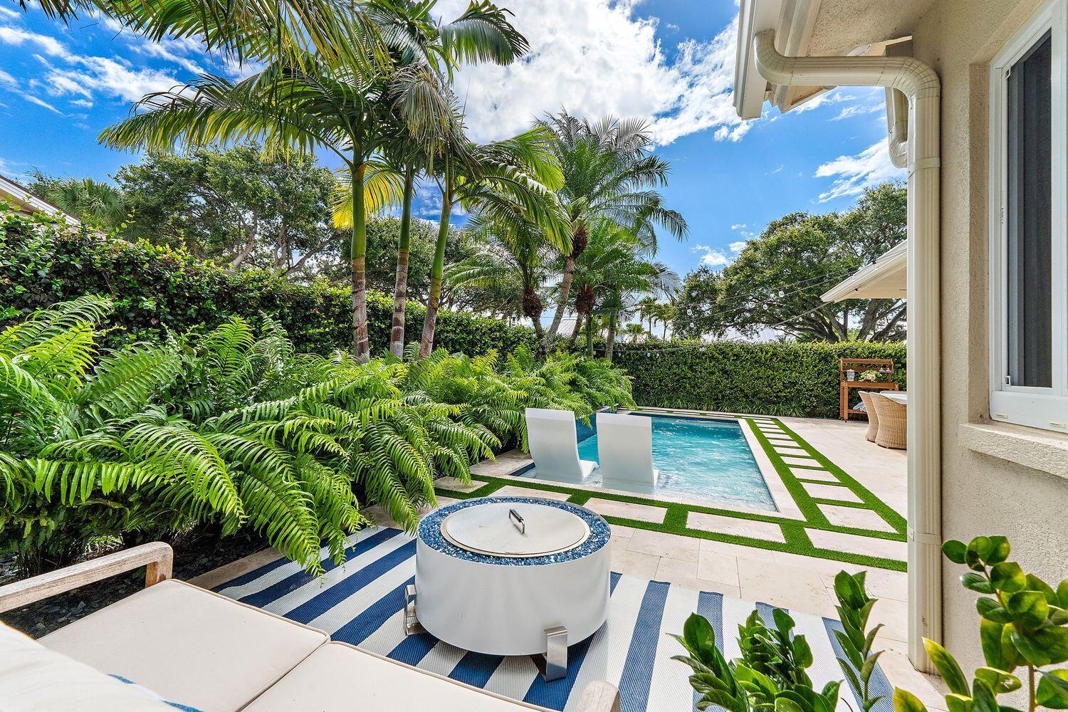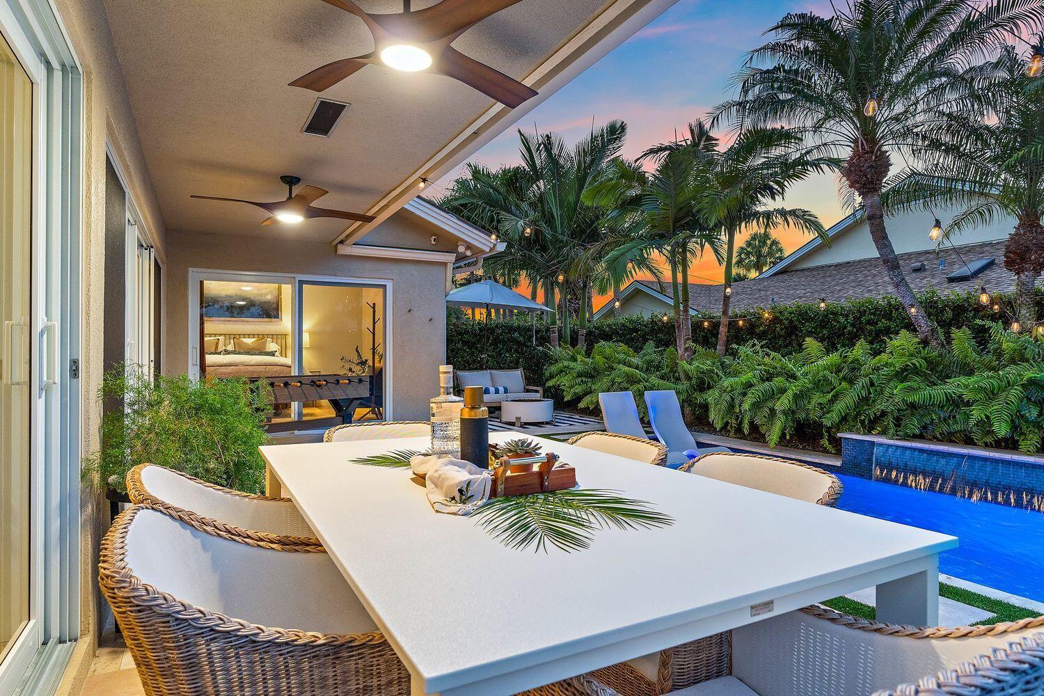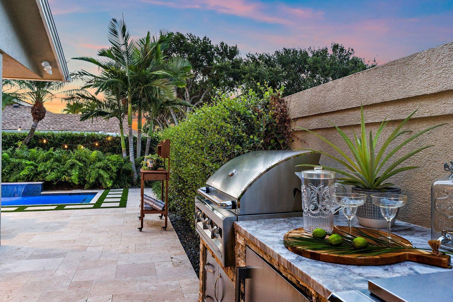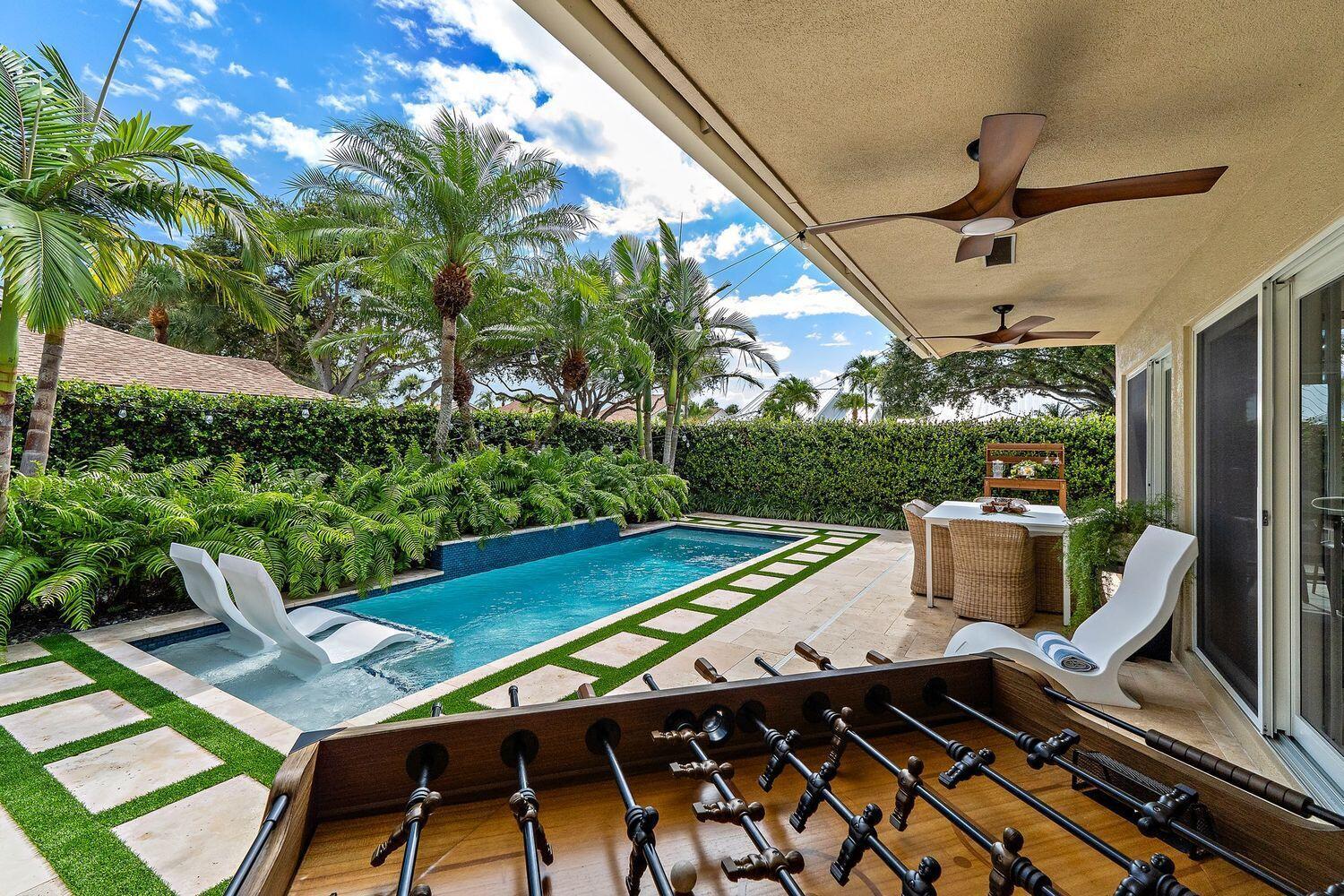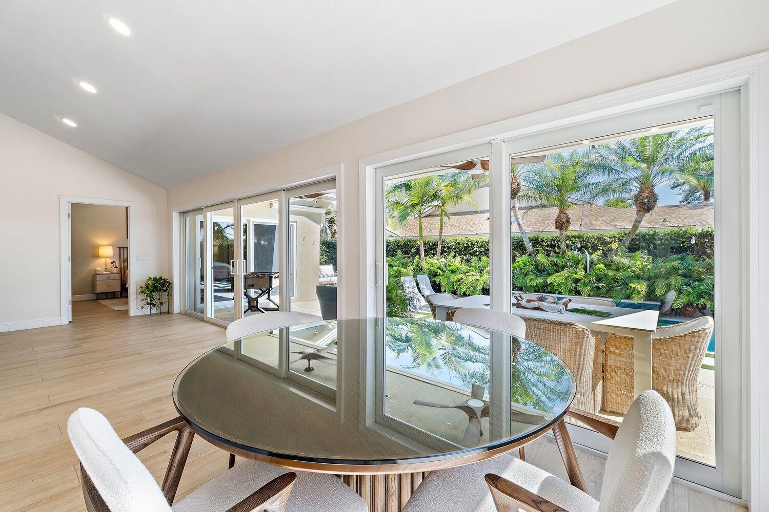 Feel the breeze! Highly desirable, southeast corner property in prime location in the Bluffs and close to beautiful Jupiter Beach. Embark on a delightful journey through this beautifully renovated home where subtle design choices make all the difference. The redesigned kitchen provides for a more formal arched entry leading to an open floor plan with serene views of the tropical landscape and beckoning pool. Enjoy the sophistication of Bosch appliances, white cabinetry with smart storage solutions, a custom hood, and stunning mosaic marble backsplash and counters. The accent shelving and brass details add a touch of understated luxury. Impact glass, new AC 2023, stunning salt-chlorinated pool w/sun shelf + sheer descent water feature completed in 2024, Oak wood-plank tile floors, vaulted