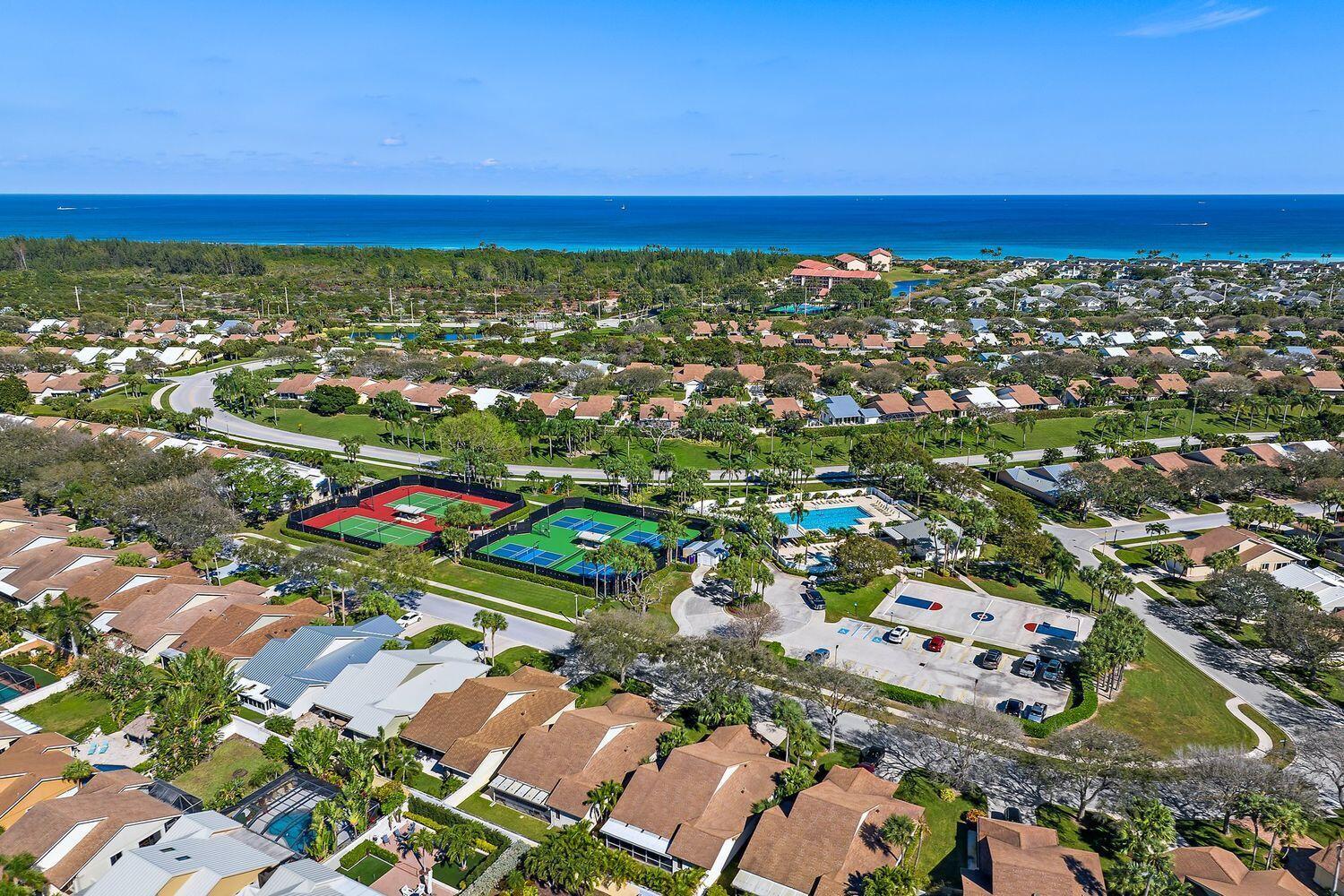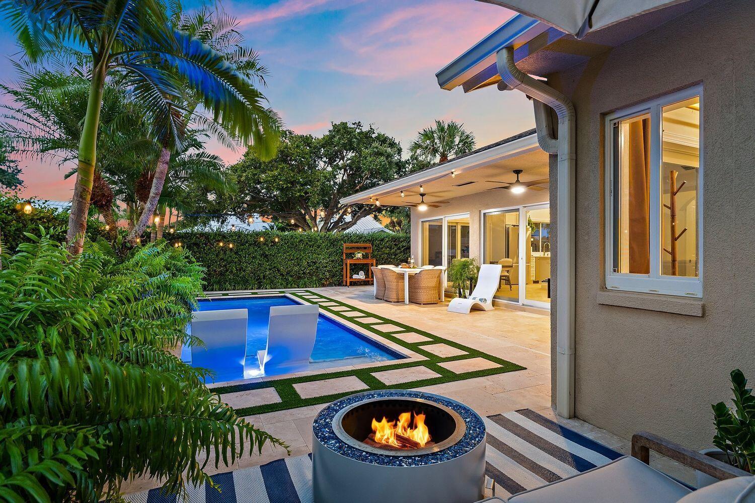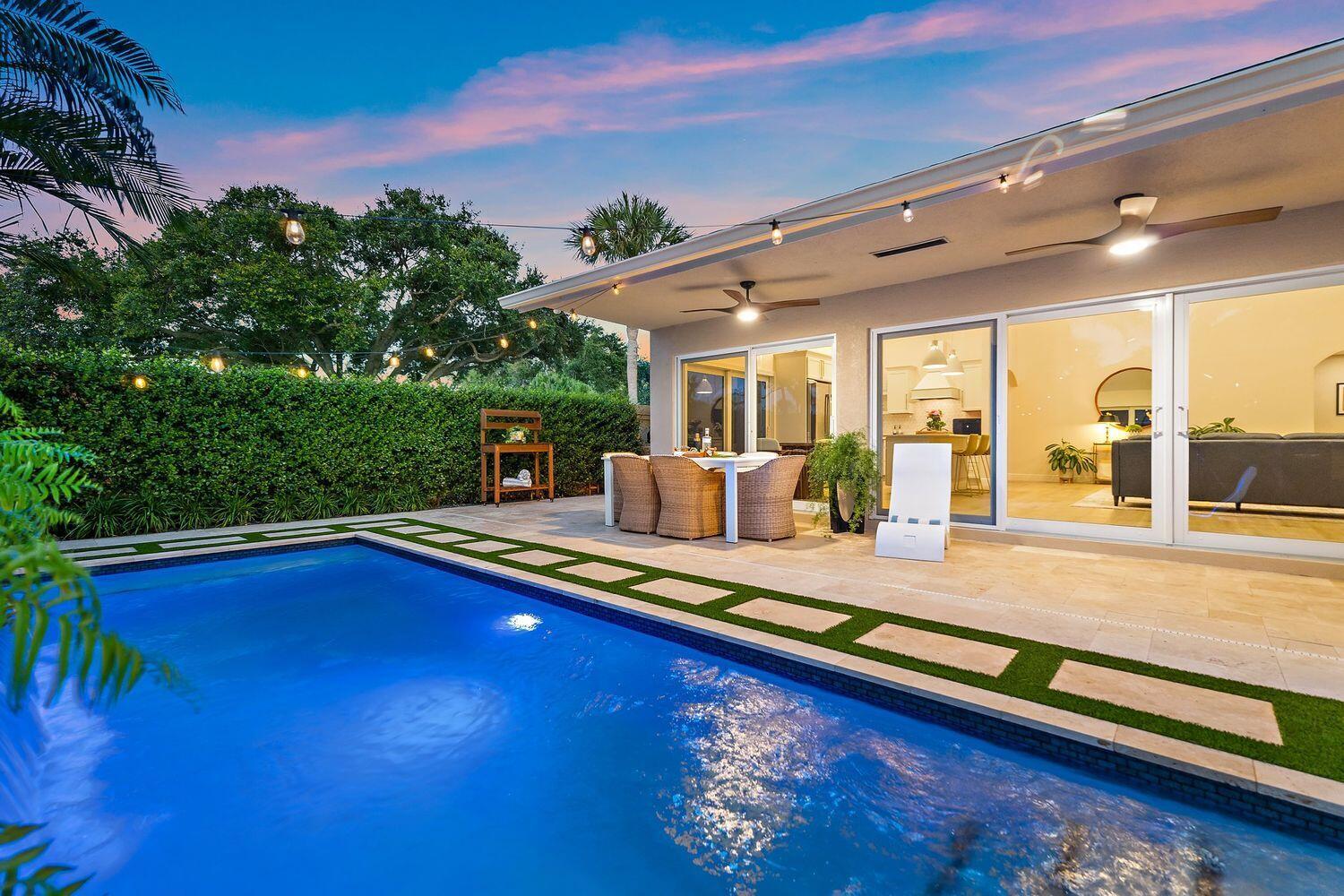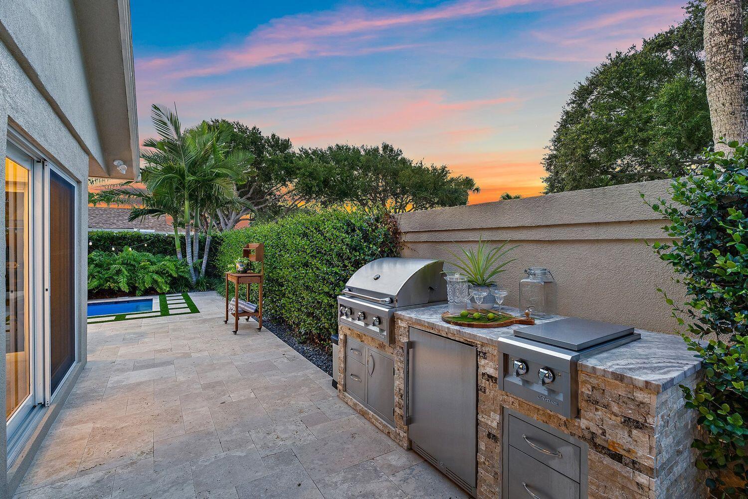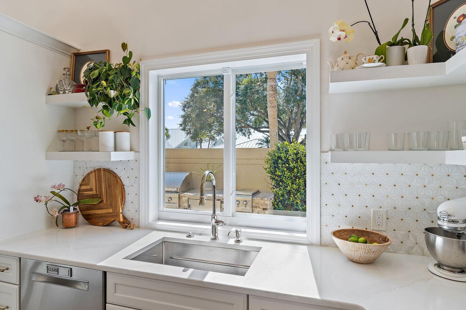 Feel the breeze! Highly desirable, southeast corner property in prime location in the Bluffs and close to beautiful Jupiter Beach. Embark on a delightful journey through this beautifully renovated home where subtle design choices make all the difference. The redesigned kitchen provides for a more formal arched entry leading to an open floor plan with serene views of the tropical landscape and beckoning pool. Enjoy the sophistication of Bosch appliances, white cabinetry with smart storage solutions, a custom hood, and stunning mosaic marble backsplash and counters. The accent shelving and brass details add a touch of understated luxury. Impact glass, new AC 2023, stunning salt-chlorinated pool w/sun shelf + sheer descent water feature completed in 2024, Oak wood-plank tile floors, vaulted