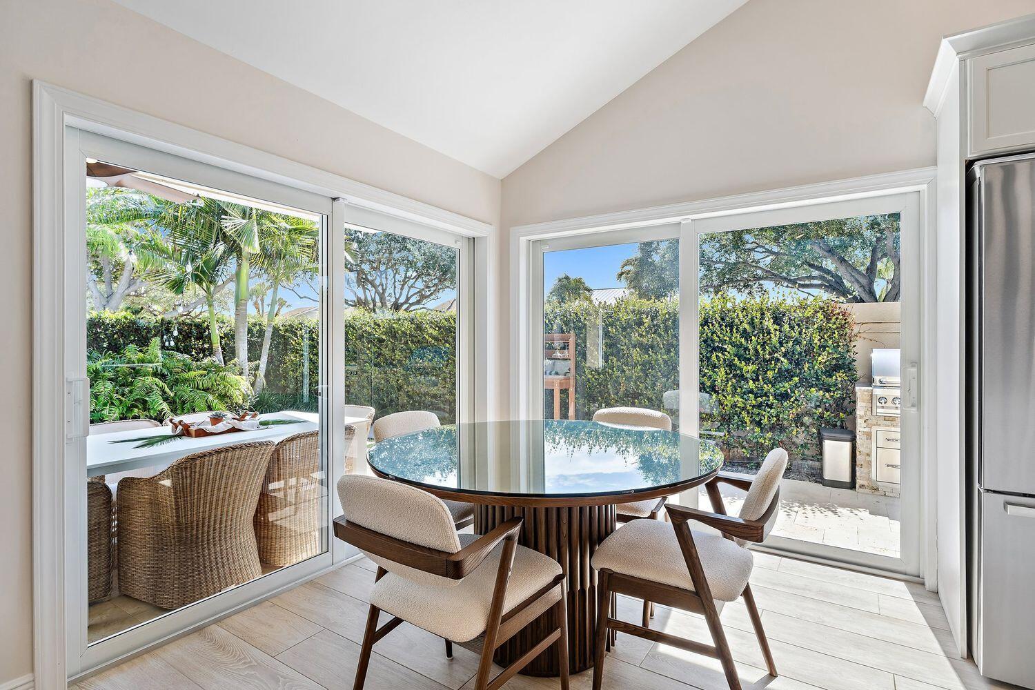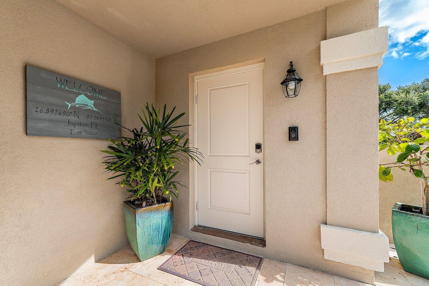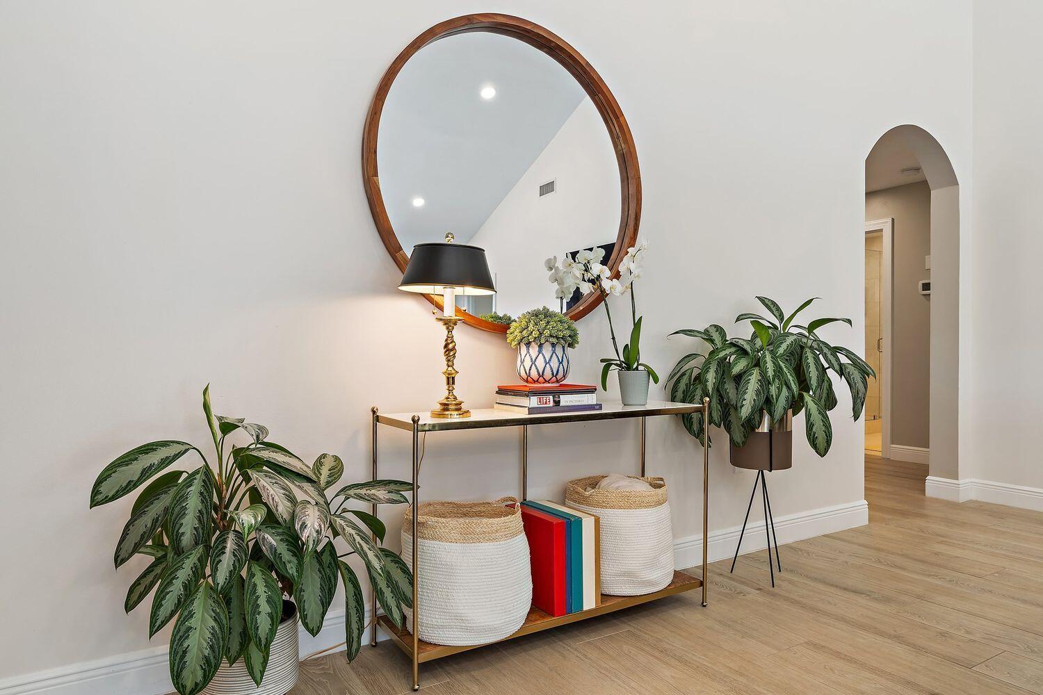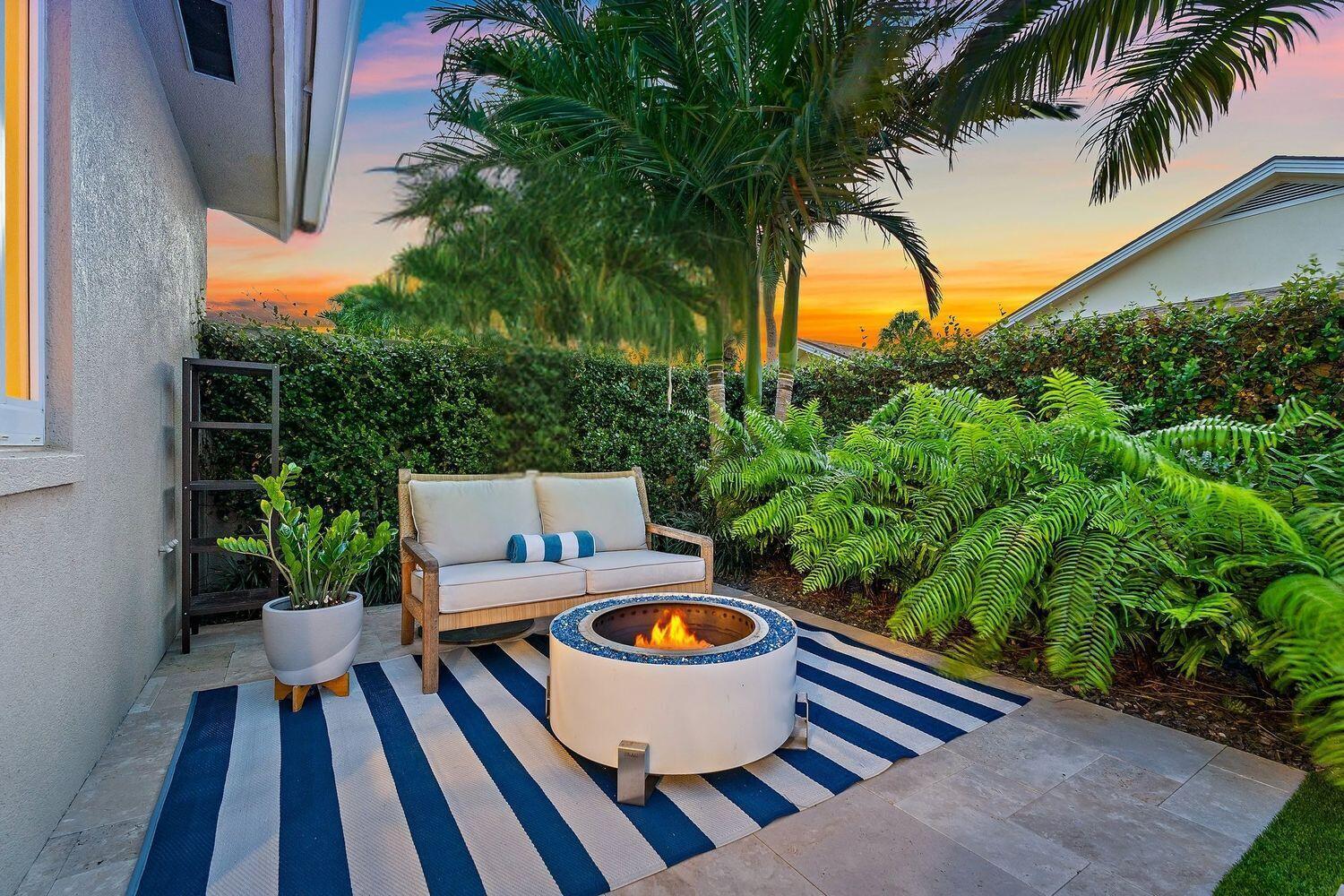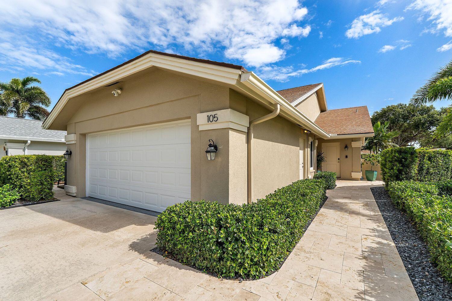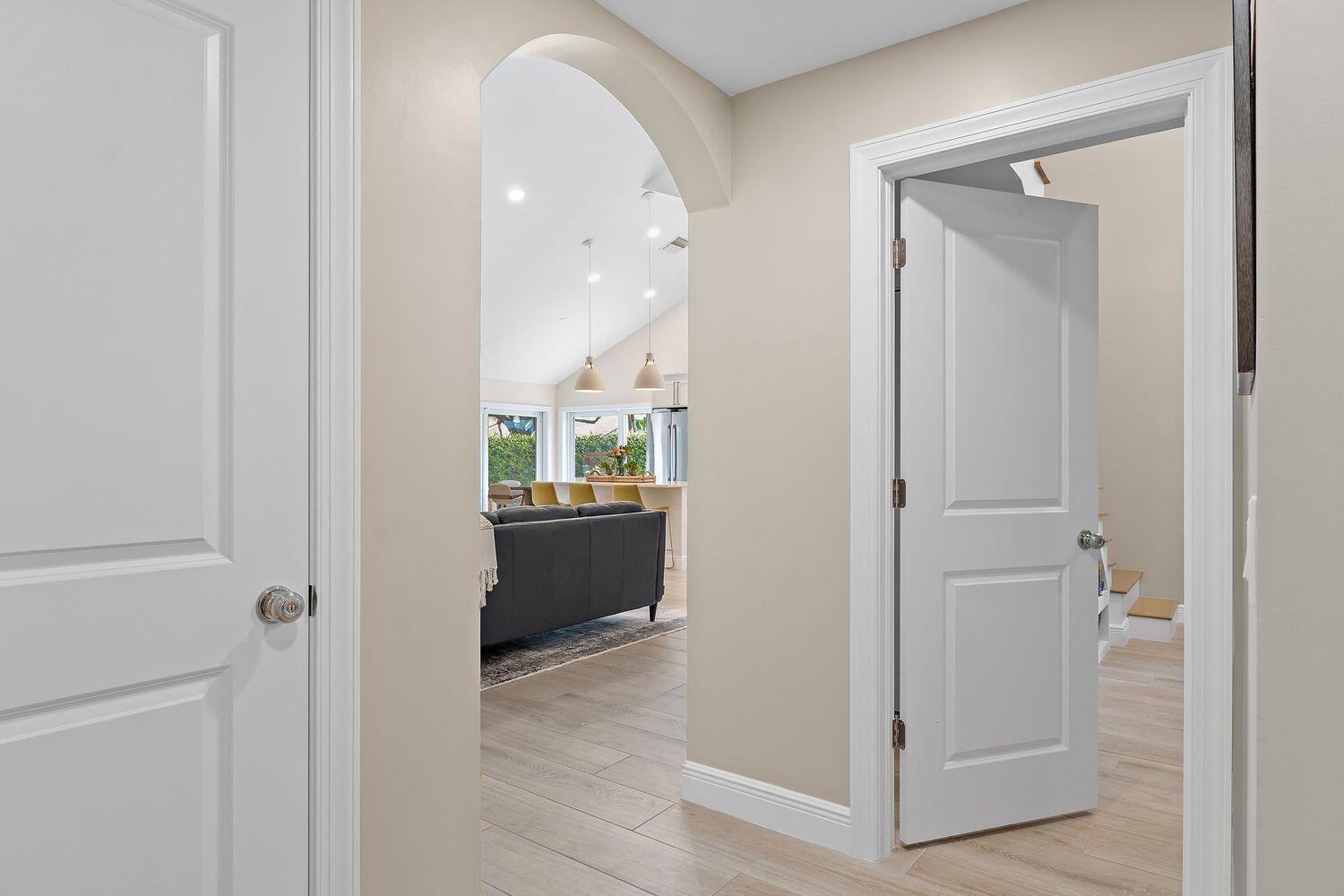 Feel the breeze! Highly desirable, southeast corner property in prime location in the Bluffs and close to beautiful Jupiter Beach. Embark on a delightful journey through this beautifully renovated home where subtle design choices make all the difference. The redesigned kitchen provides for a more formal arched entry leading to an open floor plan with serene views of the tropical landscape and beckoning pool. Enjoy the sophistication of Bosch appliances, white cabinetry with smart storage solutions, a custom hood, and stunning mosaic marble backsplash and counters. The accent shelving and brass details add a touch of understated luxury. Impact glass, new AC 2023, stunning salt-chlorinated pool w/sun shelf + sheer descent water feature completed in 2024, Oak wood-plank tile floors, vaulted