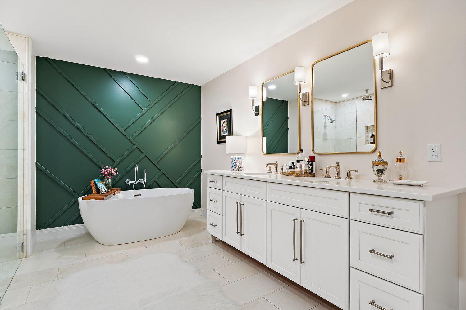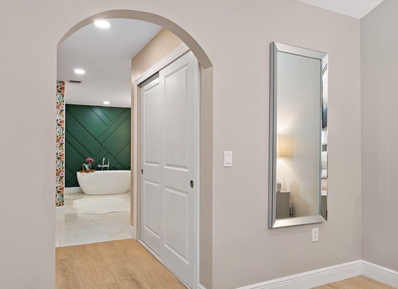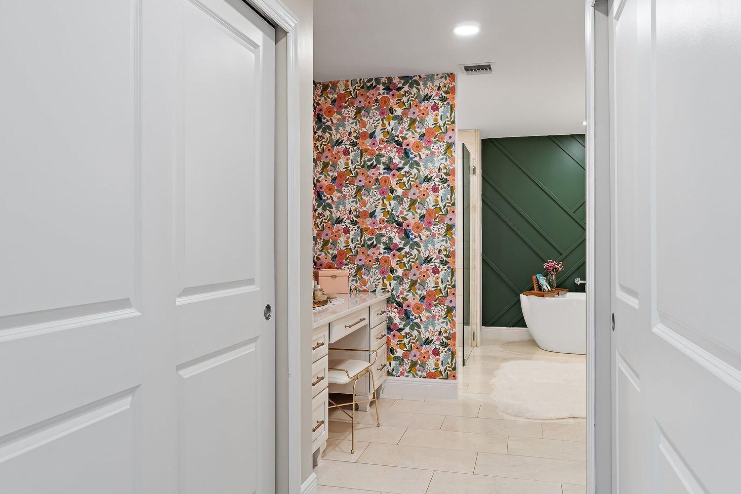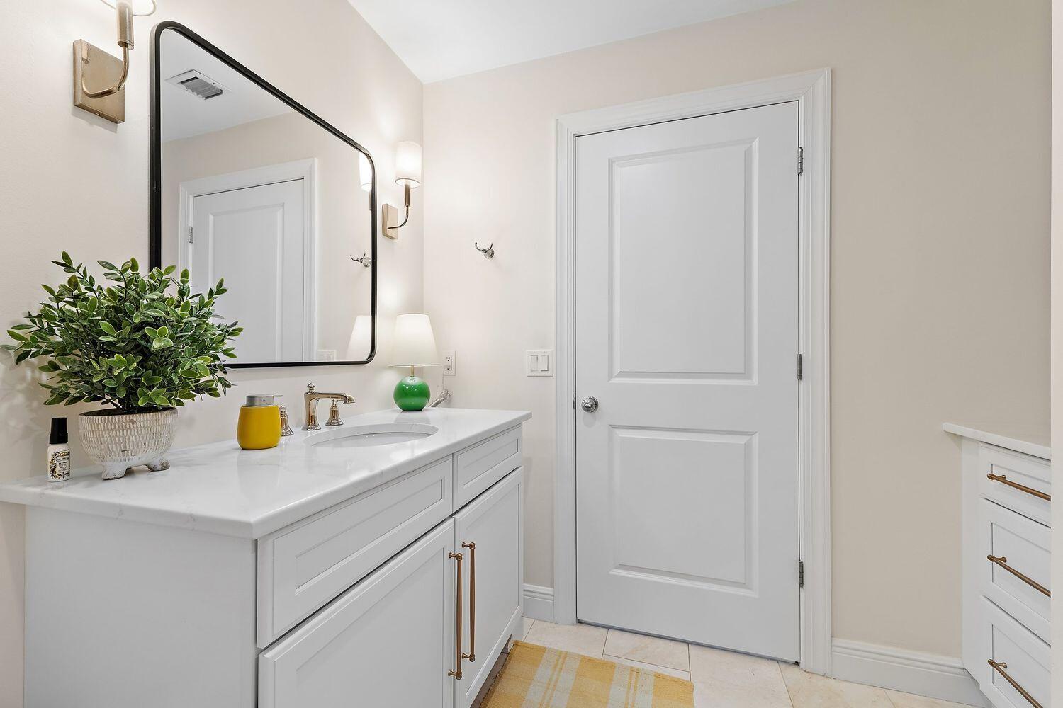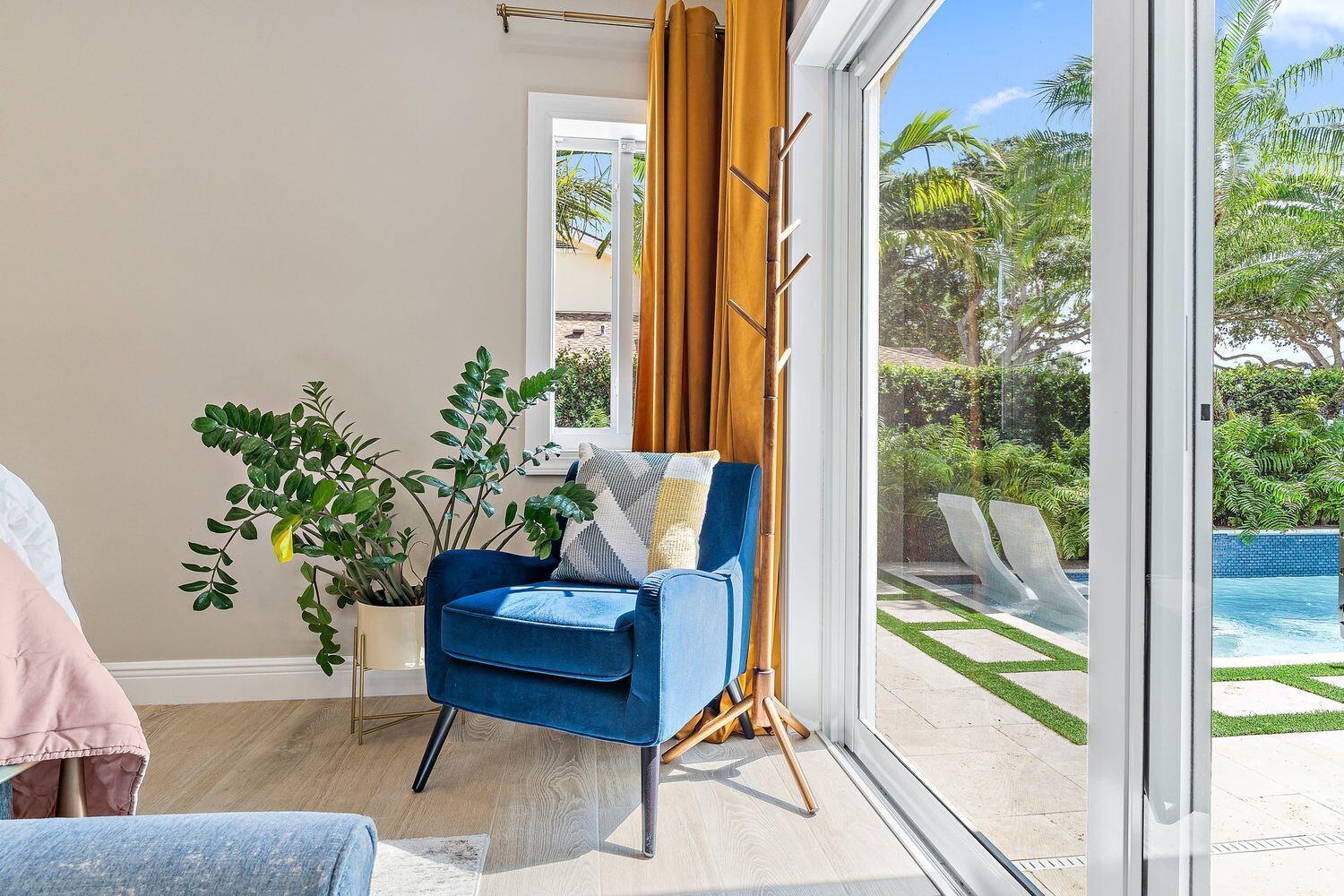 Feel the breeze! Highly desirable, southeast corner property in prime location in the Bluffs and close to beautiful Jupiter Beach. Embark on a delightful journey through this beautifully renovated home where subtle design choices make all the difference. The redesigned kitchen provides for a more formal arched entry leading to an open floor plan with serene views of the tropical landscape and beckoning pool. Enjoy the sophistication of Bosch appliances, white cabinetry with smart storage solutions, a custom hood, and stunning mosaic marble backsplash and counters. The accent shelving and brass details add a touch of understated luxury. Impact glass, new AC 2023, stunning salt-chlorinated pool w/sun shelf + sheer descent water feature completed in 2024, Oak wood-plank tile floors, vaulted