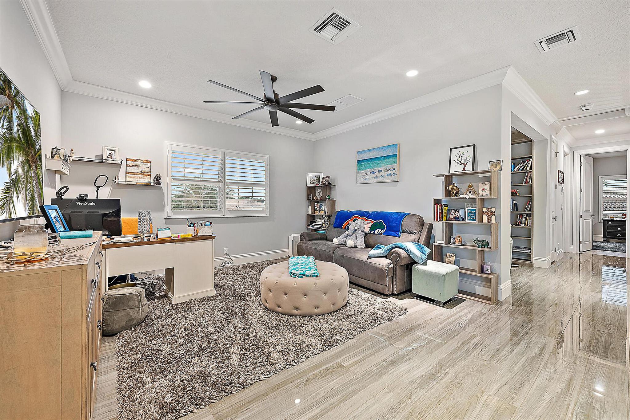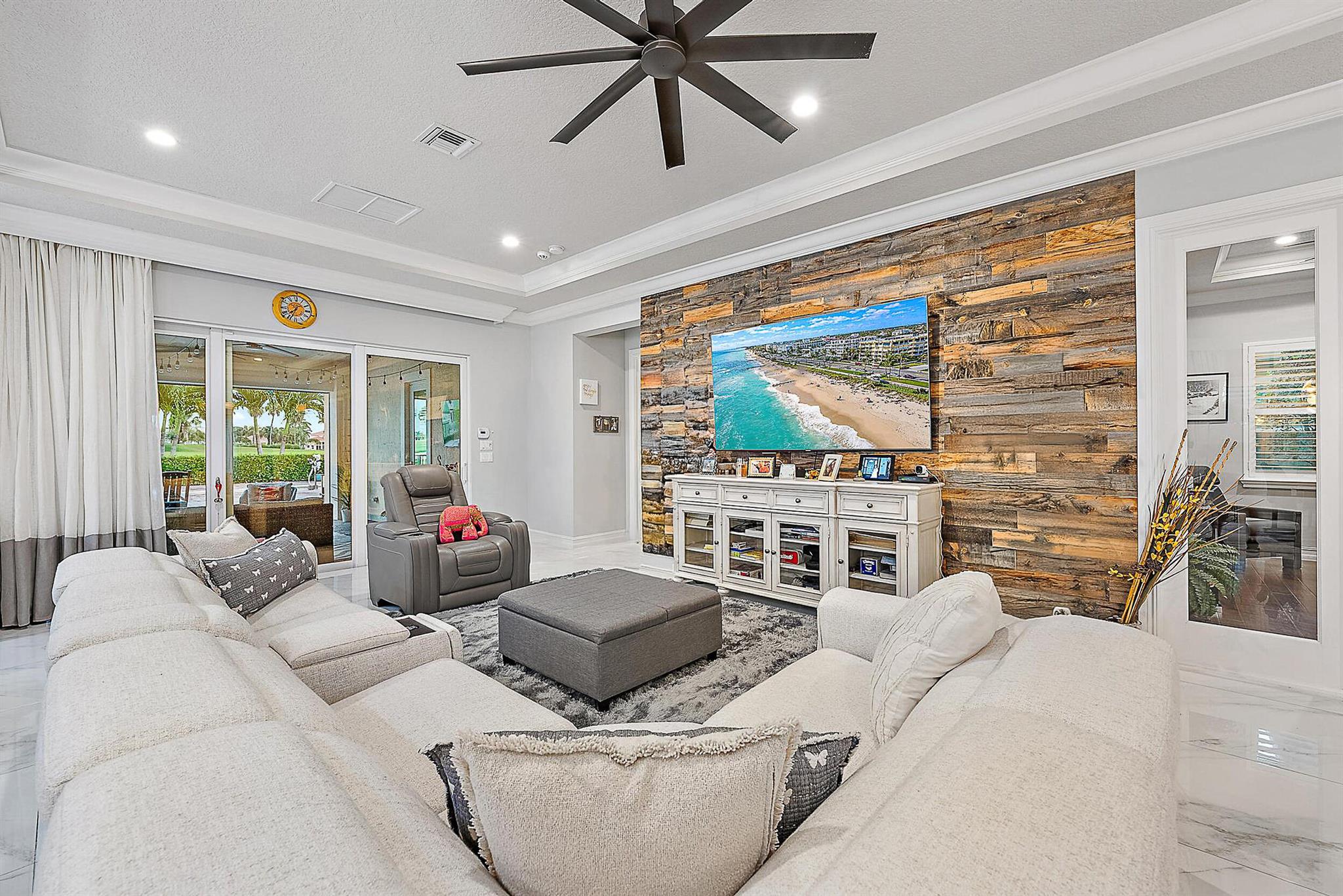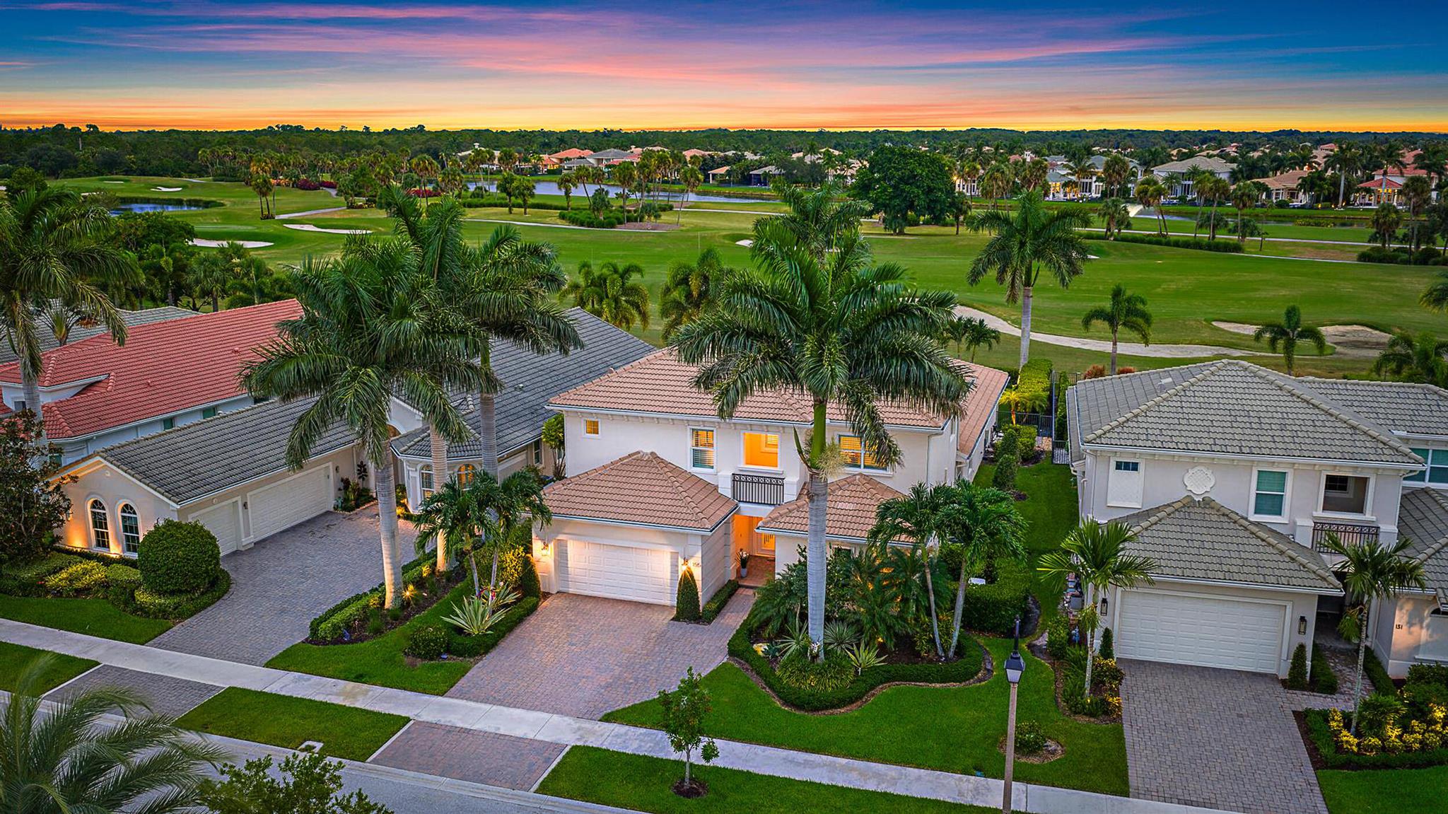 Elegant Golf Course Estate with Immediate Full Golf Membership! Welcome to your serene sanctuary in one of Jupiter Country Club’s more peaceful sections, offering rare immediate full golf membership in one of the area’s premier golf and sport communities. This home captures panoramic views of the 13th hole and is thoughtfully designed for both comfort and entertaining, with an open-concept layout anchored by a grand great room and expansive island where family and friends naturally gather. The first floor features the primary suite, a private office, and a separate in-law/guest en-suite bedroom, ensuring comfort for residents and visitors alike.With full impact windows & sliders and a whole house natural gas generator, this home is prepared for any season. Outdoors, phantom screens
