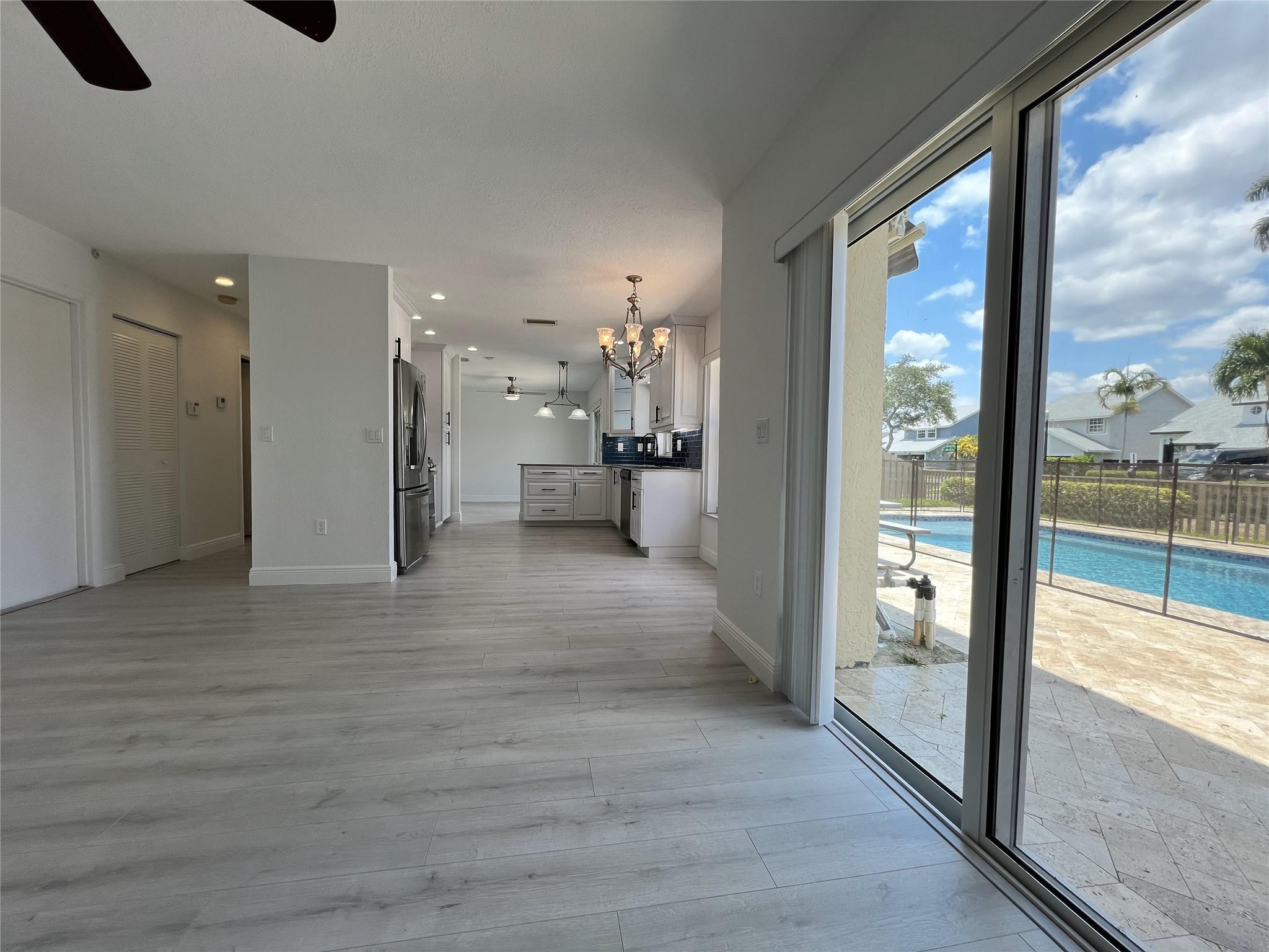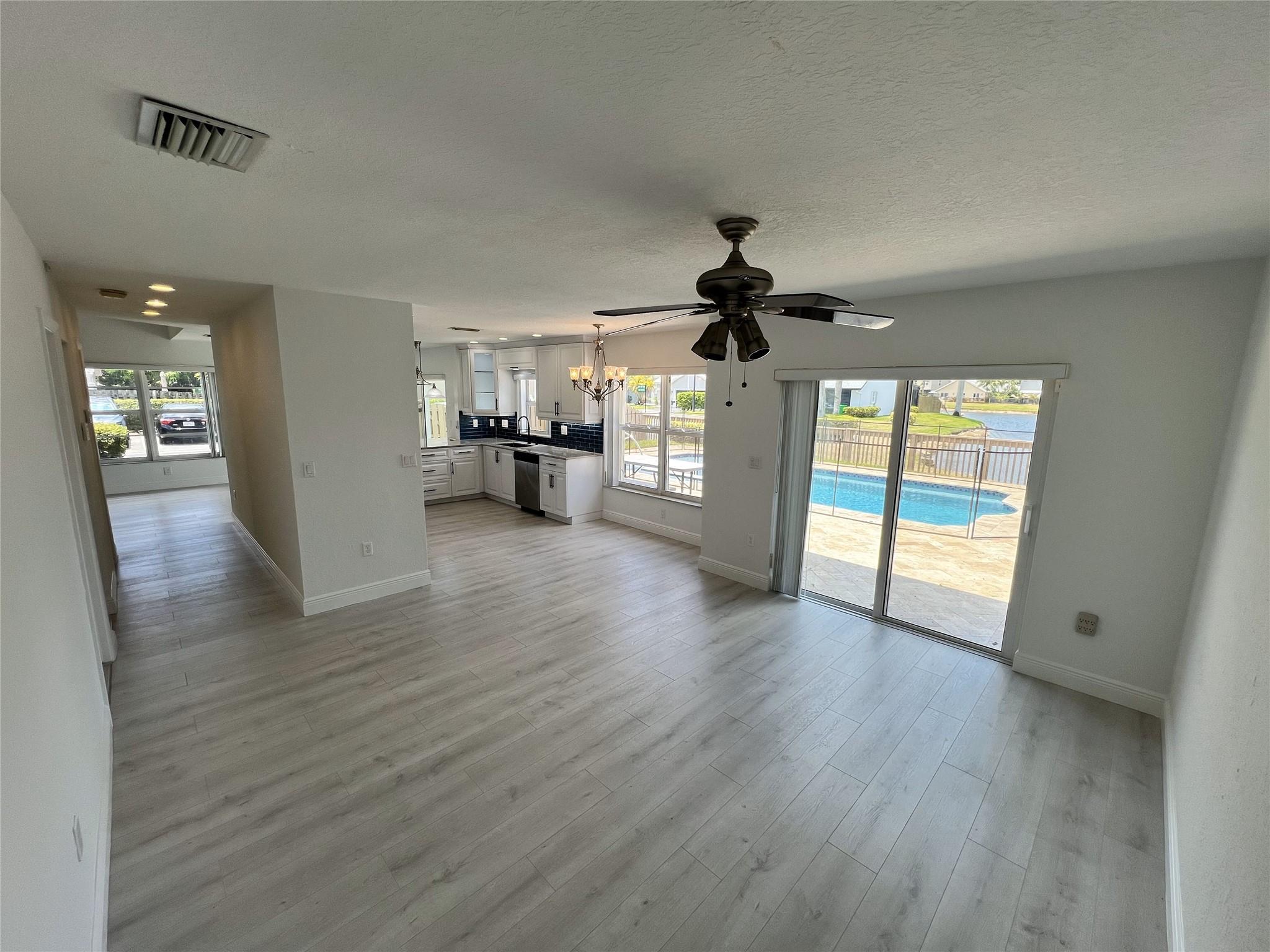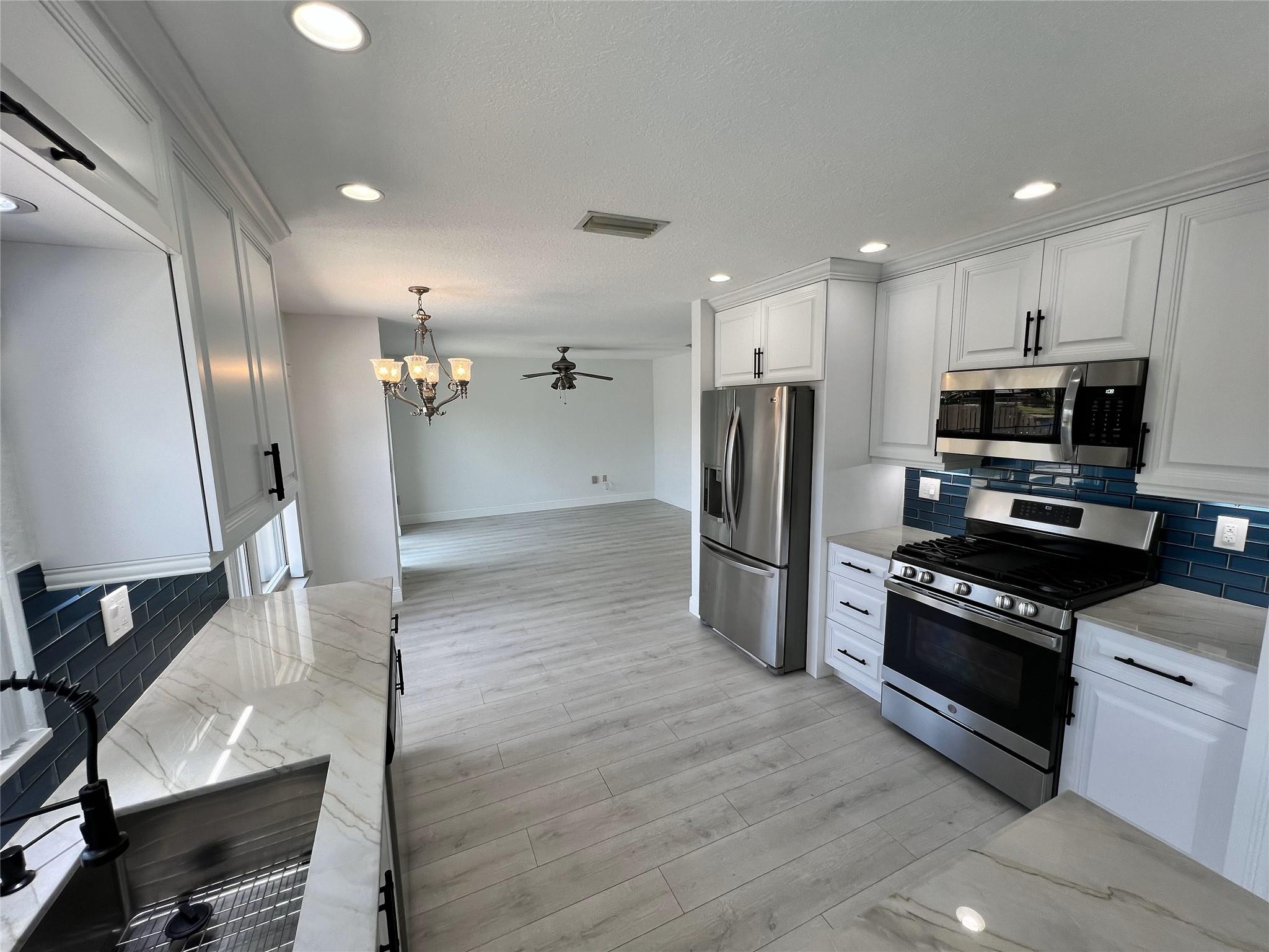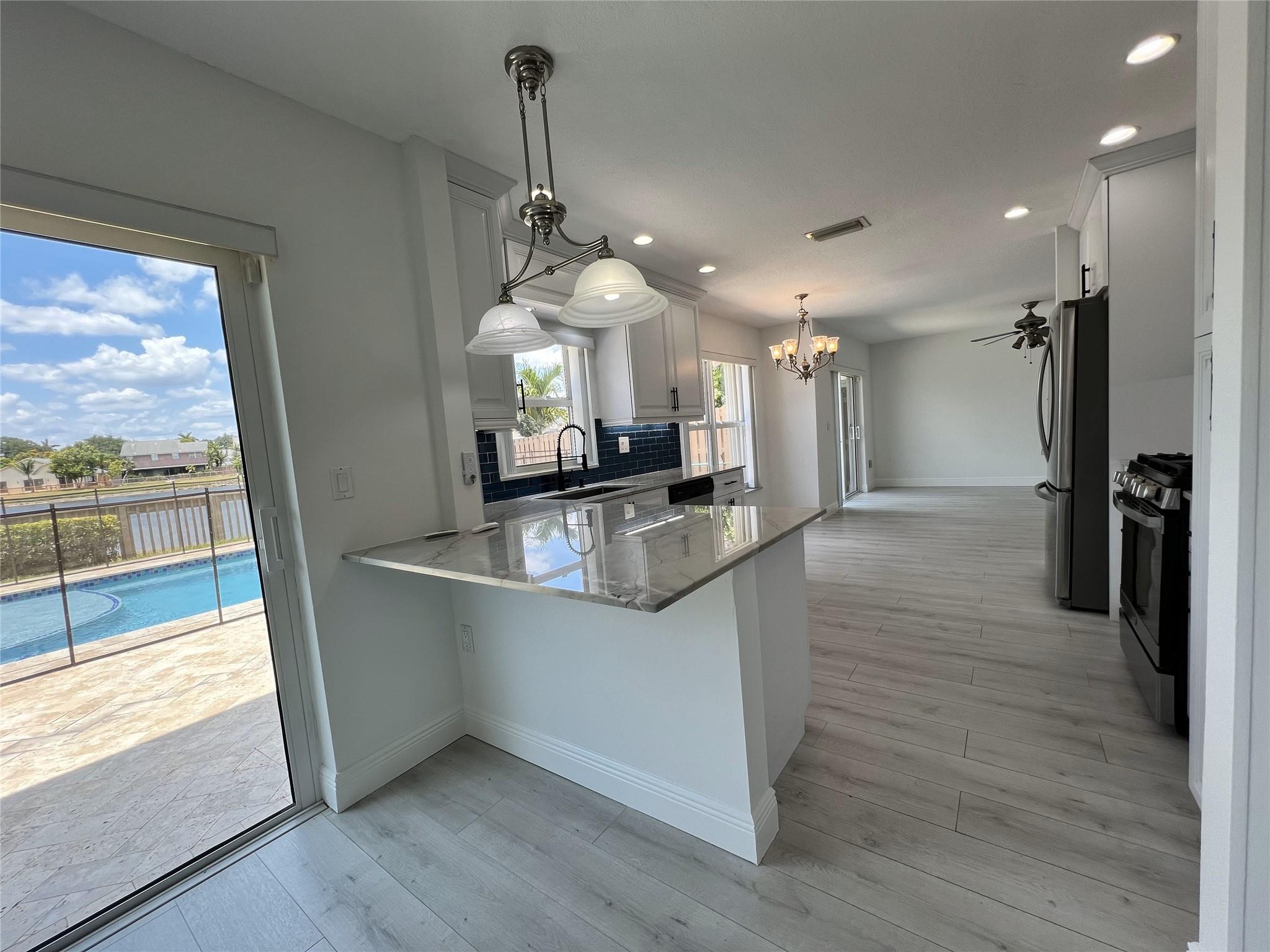 The newly remodeled kitchen featuring natural stone countertops, glass tile backsplash, custom soft-close cabinetry & LED undercabinet lighting. The main floor has impact windows a large living room, family room, dining room & a half bathroom.