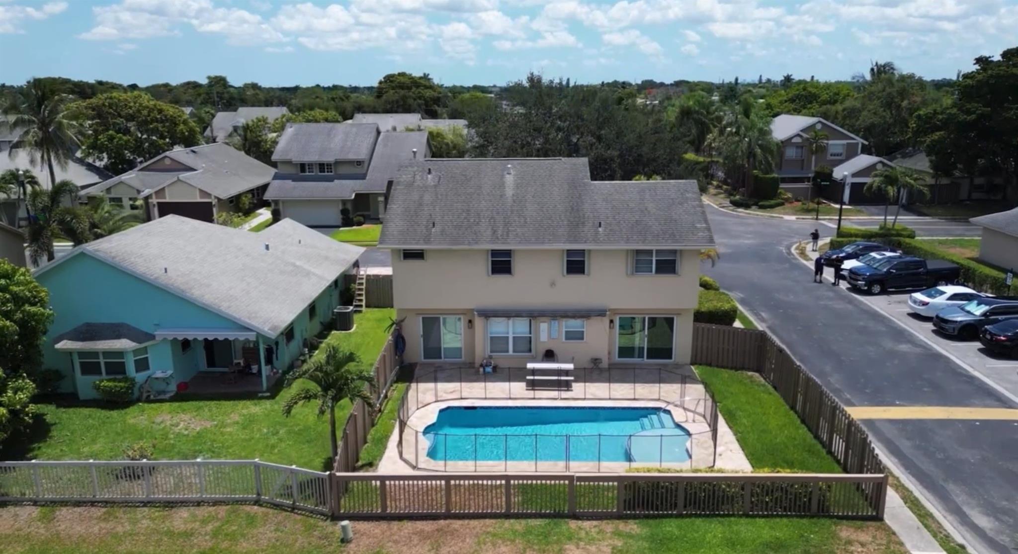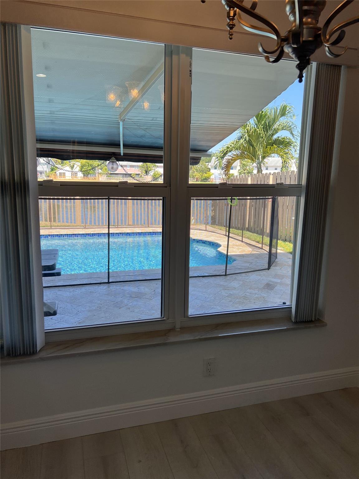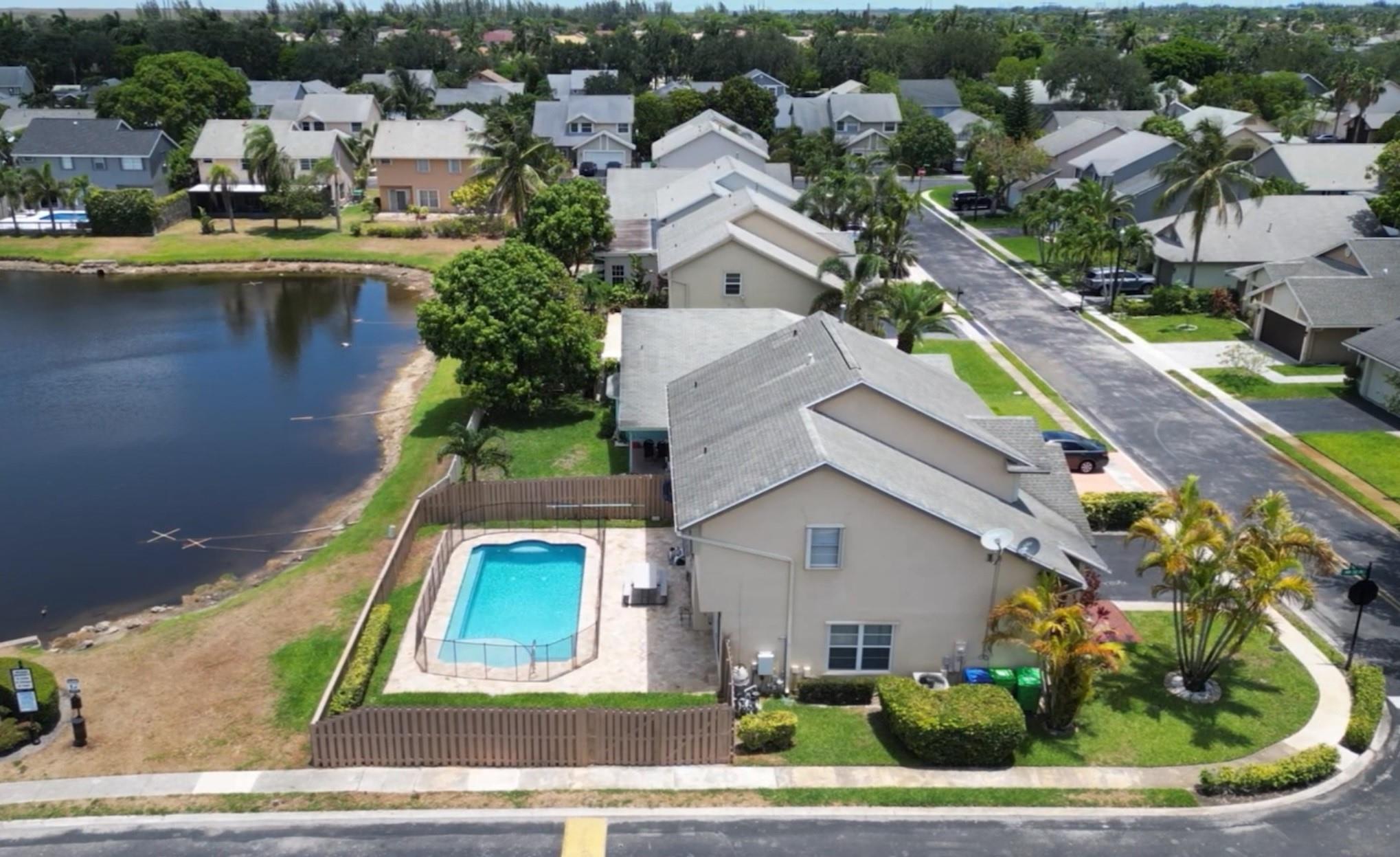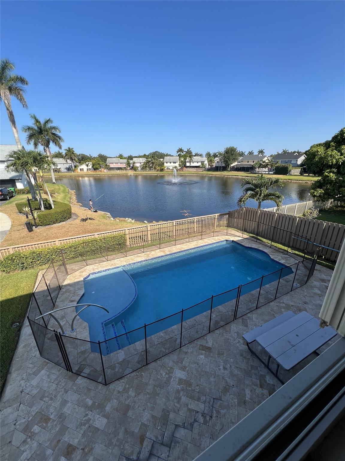 The primary bedroom offers a large en suite bathroom with a shower & walk-in closet, windows providing beautiful pool & lake views. 3 additional bedrooms & full bathroom complete the upper level. All rooms are equipped with accordion hurricane shutters for added security.