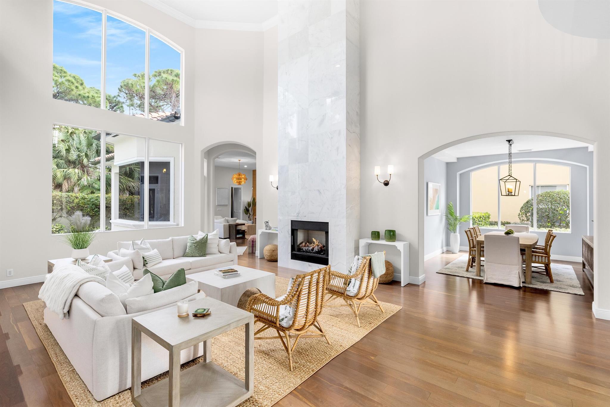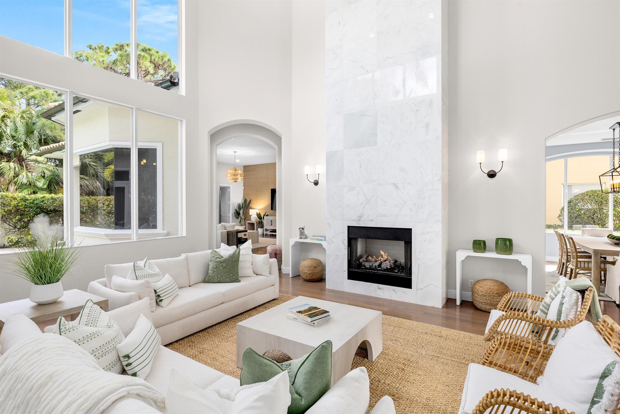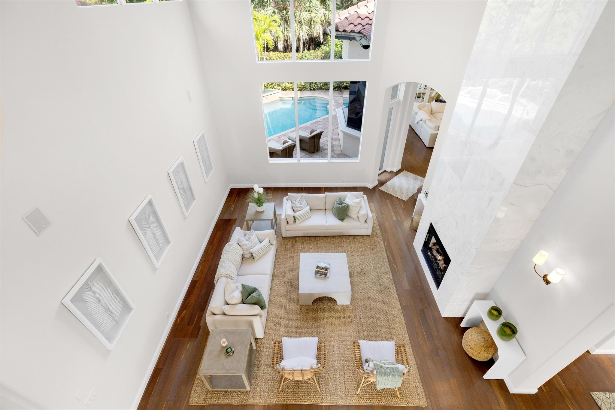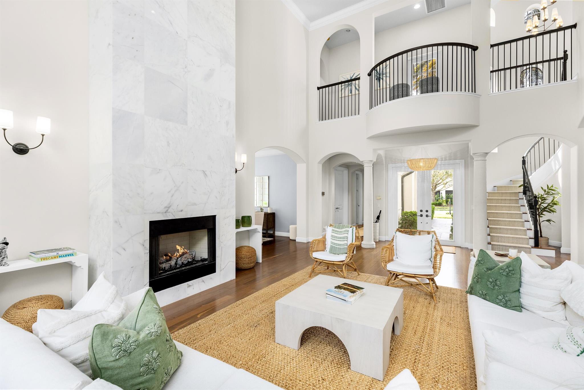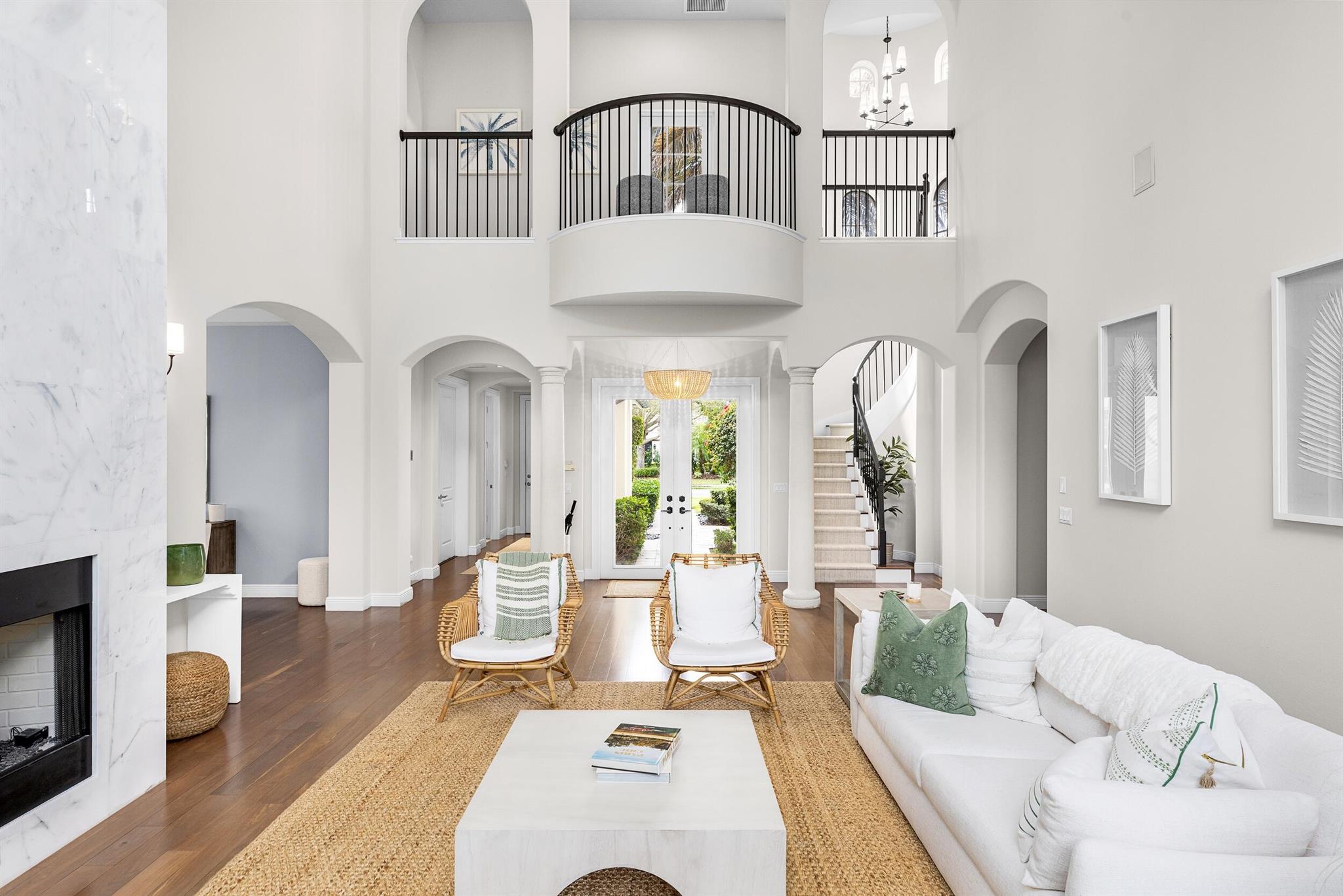 This exquisite home offers the epitome of luxury living, boasting a myriad of upscale features and amenities. Situated on a private corner lot, this residence exudes elegance from the moment you arrive. As you step inside, you are greeted by vaulted ceilings that bathe the interior in natural light, creating a bright and airy ambiance throughout, and a stunning marble fireplace. The allure continues with new hardwood flooring gracing the home. The renovated kitchen showcases marble backsplash, a gas range, an oversized pantry, and a new wine fridge. The master bedroom, conveniently located on the first floor, features California walk-in closets for ample storage. For those who work from home, the den/office on the first floor provides the ideal space for productivity.