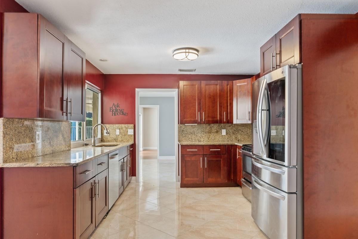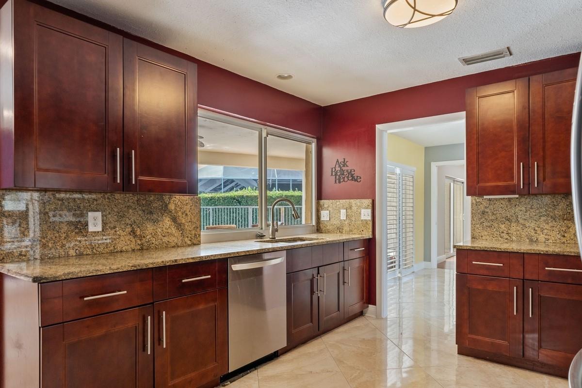 Beautifully remodeled 3BR/2BA pool home in the desirable Woodlands community! This home backs to lush greenery, offering peaceful views and total privacy. Step outside to a custom pool with travertine patio and a spacious covered area—ideal for outdoor living. Inside, enjoy an open layout with formal dining, large living room, and oversized family room. The kitchen features granite counters, stainless steel appliances, and ample cabinetry. Split-bedroom design, impact windows/doors, and a 2019 roof. Conveniently located minutes from shopping, dining, parks, and everyday essentials. Spacious bedrooms, updated baths, and generous closets provide both comfort and style.