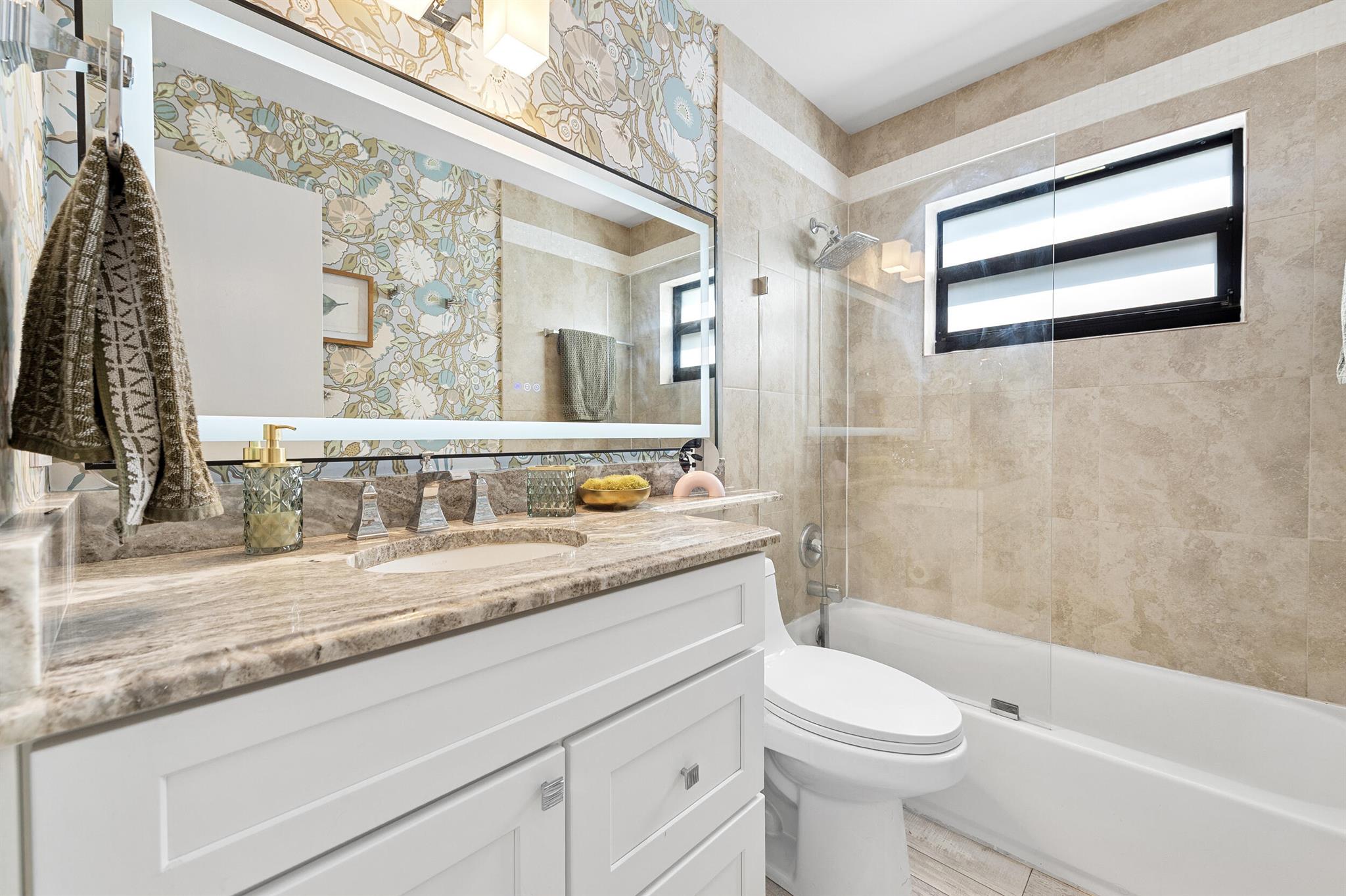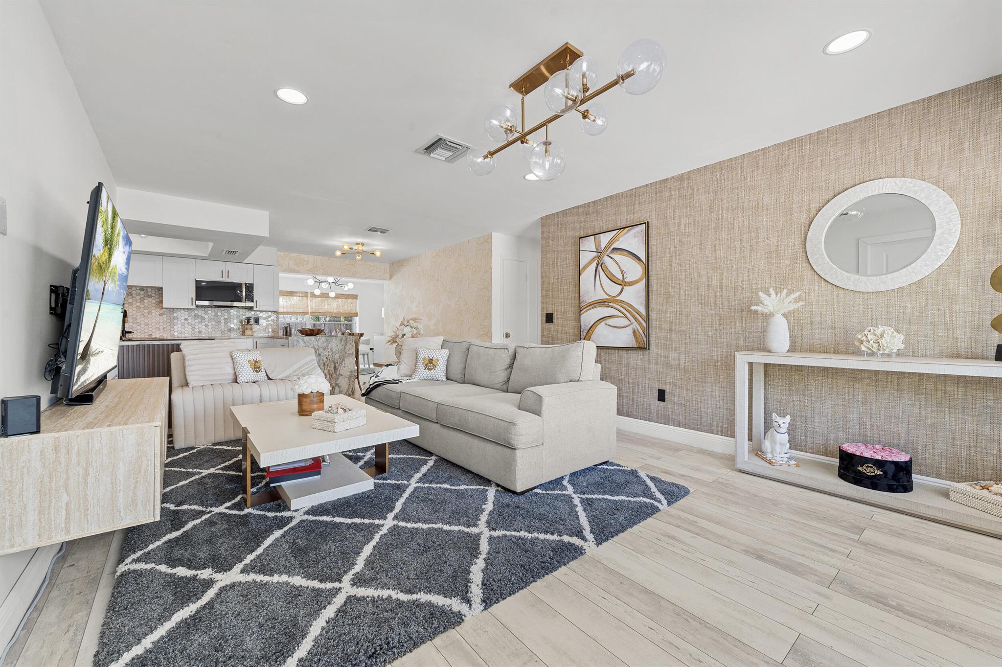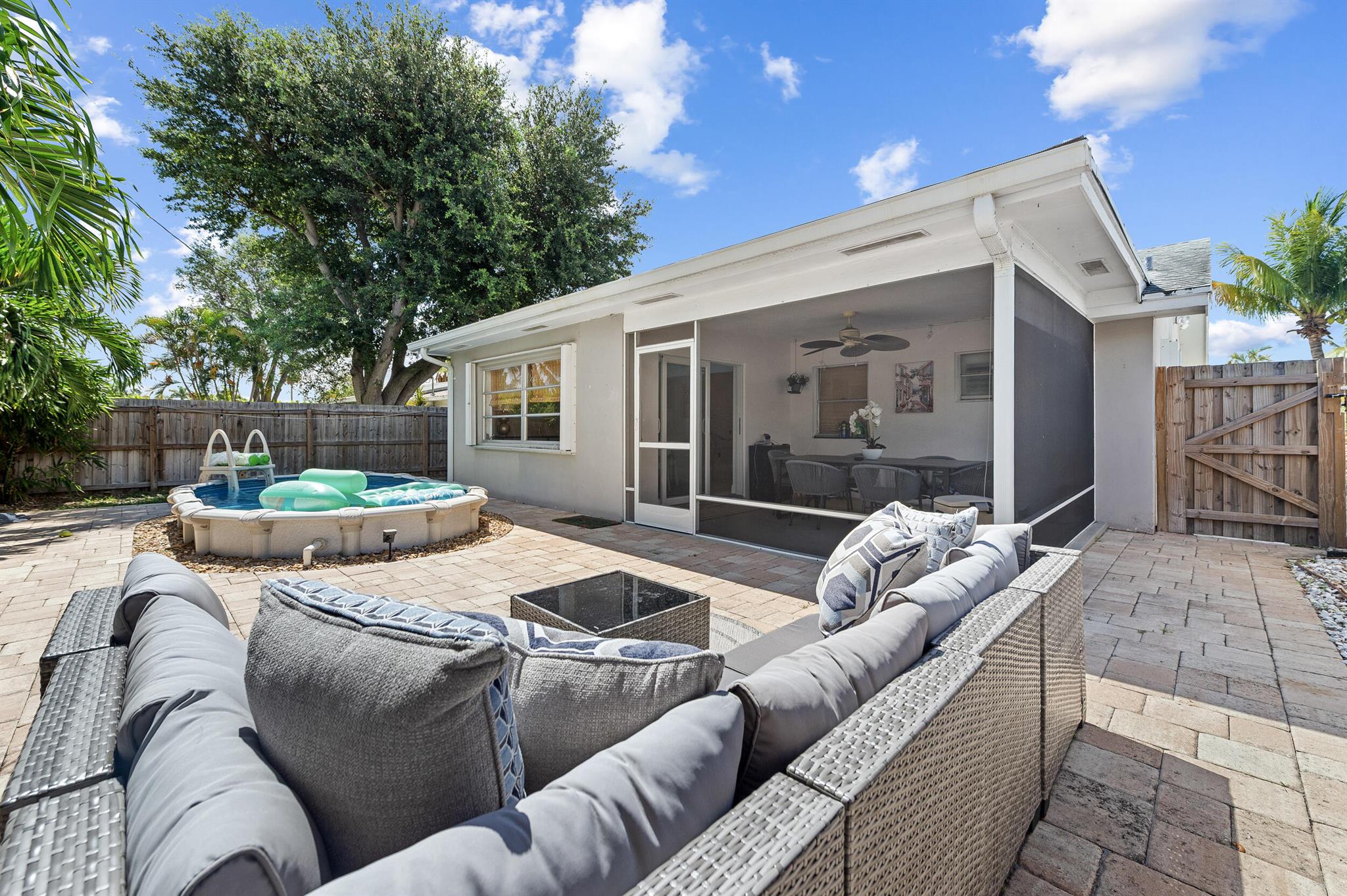 Modern coastal living in coveted College Park Historical District! Renovated Sunlit 2BR with open layout, waterproof LVP, and impact-rated windows/doors plus shutters. Sleek kitchen with natural stone counters, stainless appliances, and breakfast bar; dining area with custom bar and wine cooler. Bedrooms feature lit California closets and roller shades. Step out to a 160 sq ft covered lanai with electric and fan, a semi-inground vinyl pool, and a paved patio for effortless entertaining. Prime location, walking distance to the Intracoastal, minutes to the beach, parks and downtown. No HOA, Airbnb-friendly. Roof 2016, AC 2022, WH 2018. Furniture Negotiable
