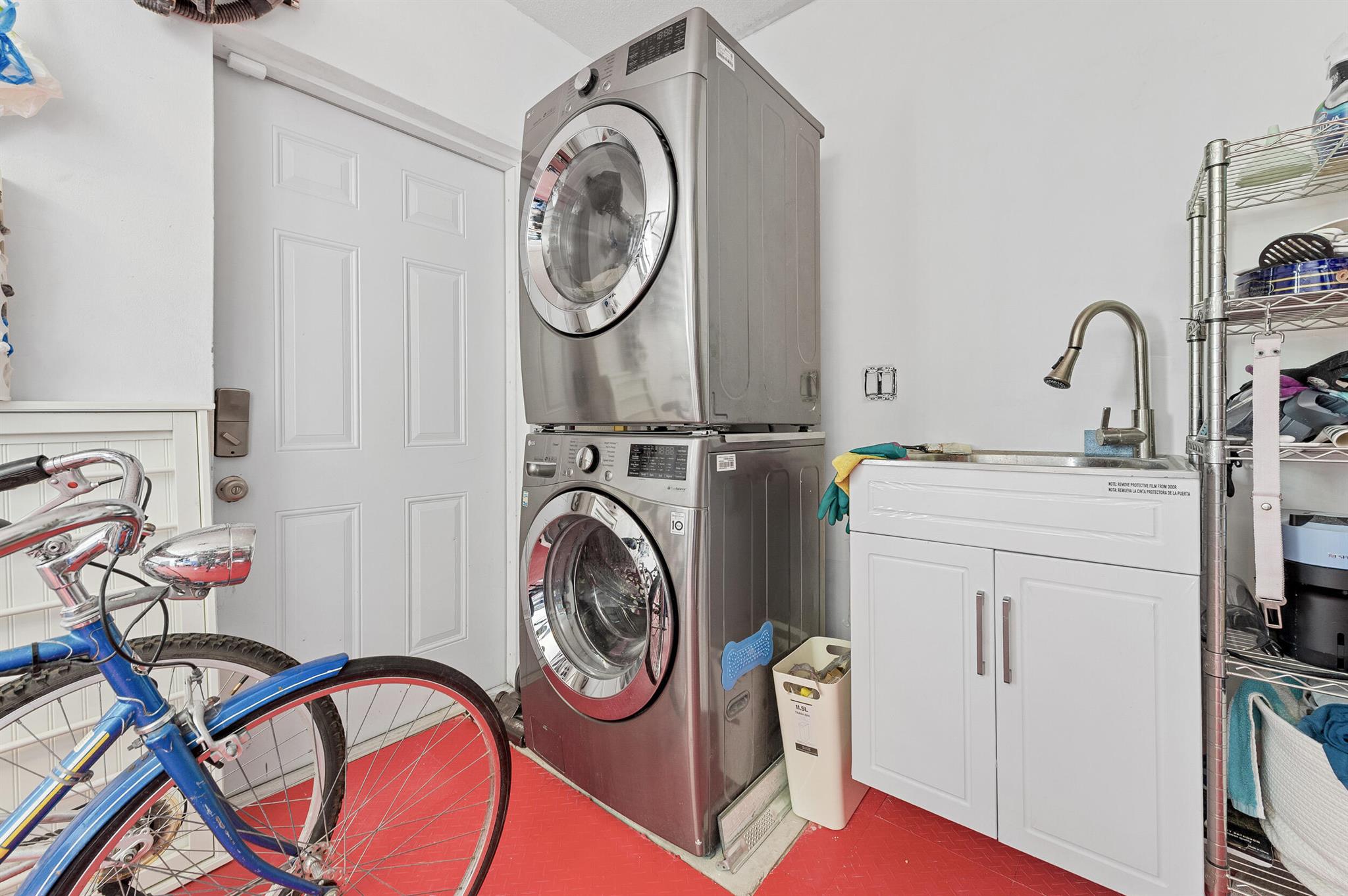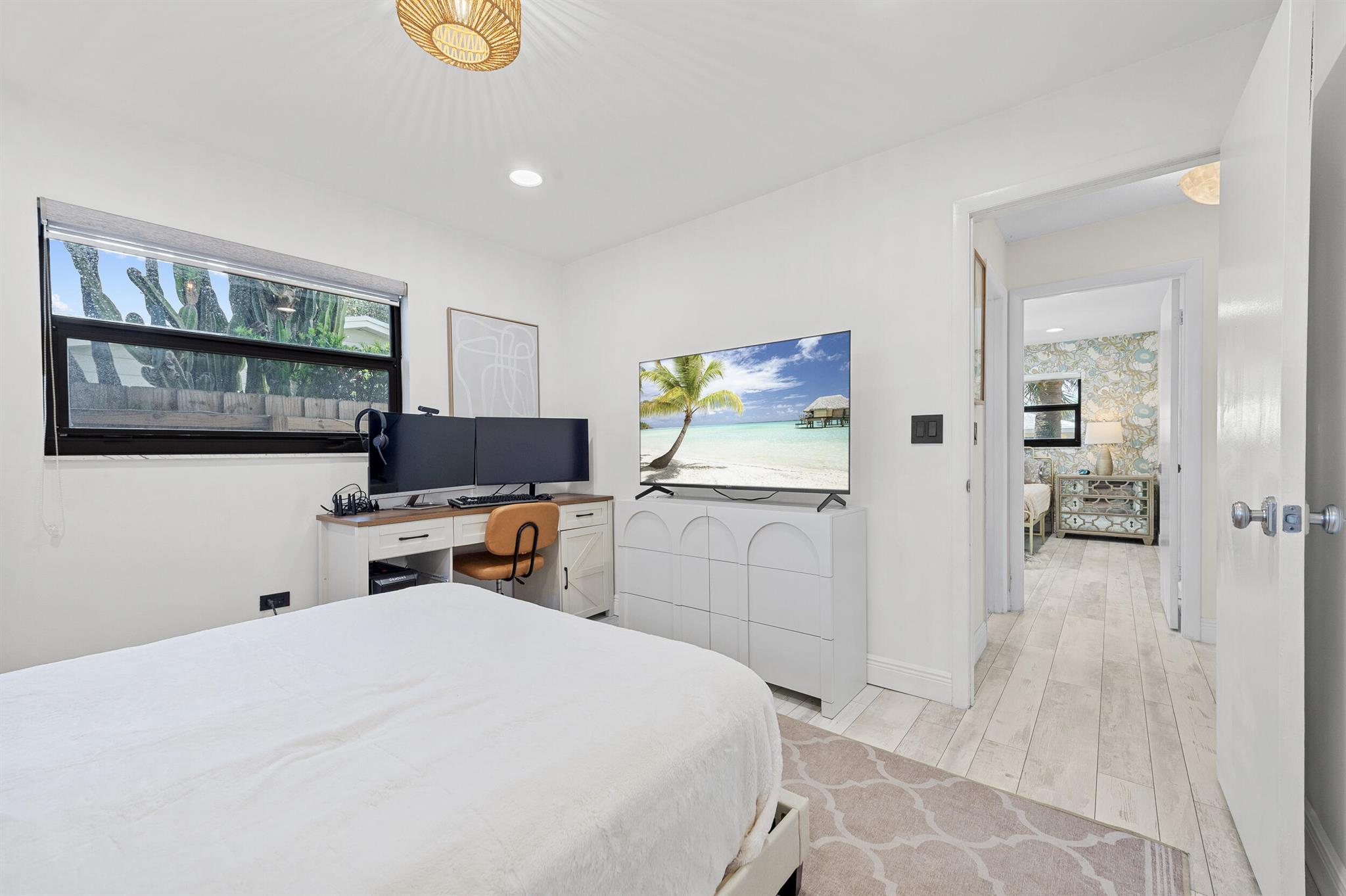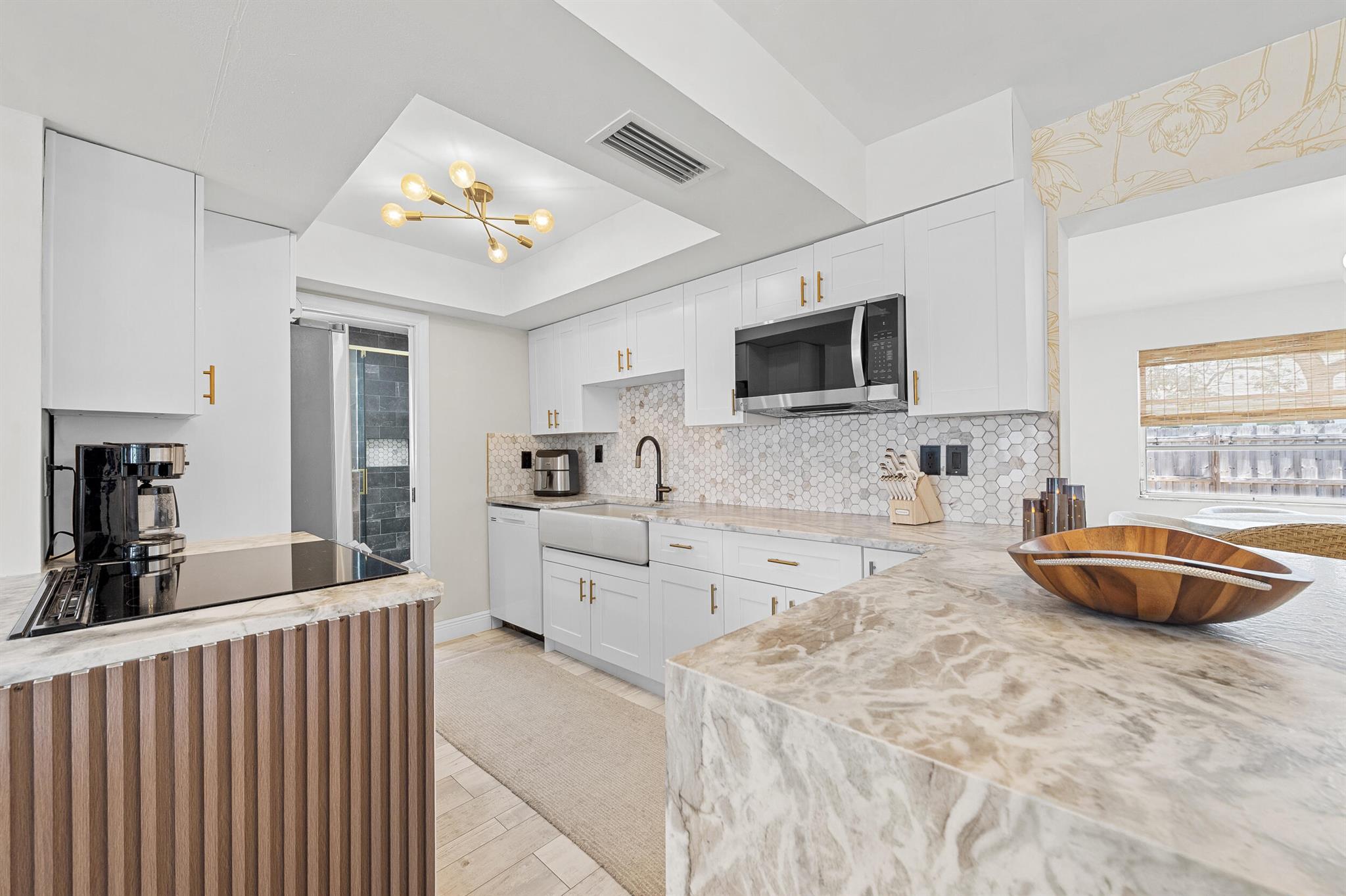 Modern coastal living in coveted College Park Historical District! Renovated Sunlit 2BR with open layout, waterproof LVP, and impact-rated windows/doors plus shutters. Sleek kitchen with natural stone counters, stainless appliances, and breakfast bar; dining area with custom bar and wine cooler. Bedrooms feature lit California closets and roller shades. Step out to a 160 sq ft covered lanai with electric and fan, a semi-inground vinyl pool, and a paved patio for effortless entertaining. Prime location, walking distance to the Intracoastal, minutes to the beach, parks and downtown. No HOA, Airbnb-friendly. Roof 2016, AC 2022, WH 2018. Furniture Negotiable