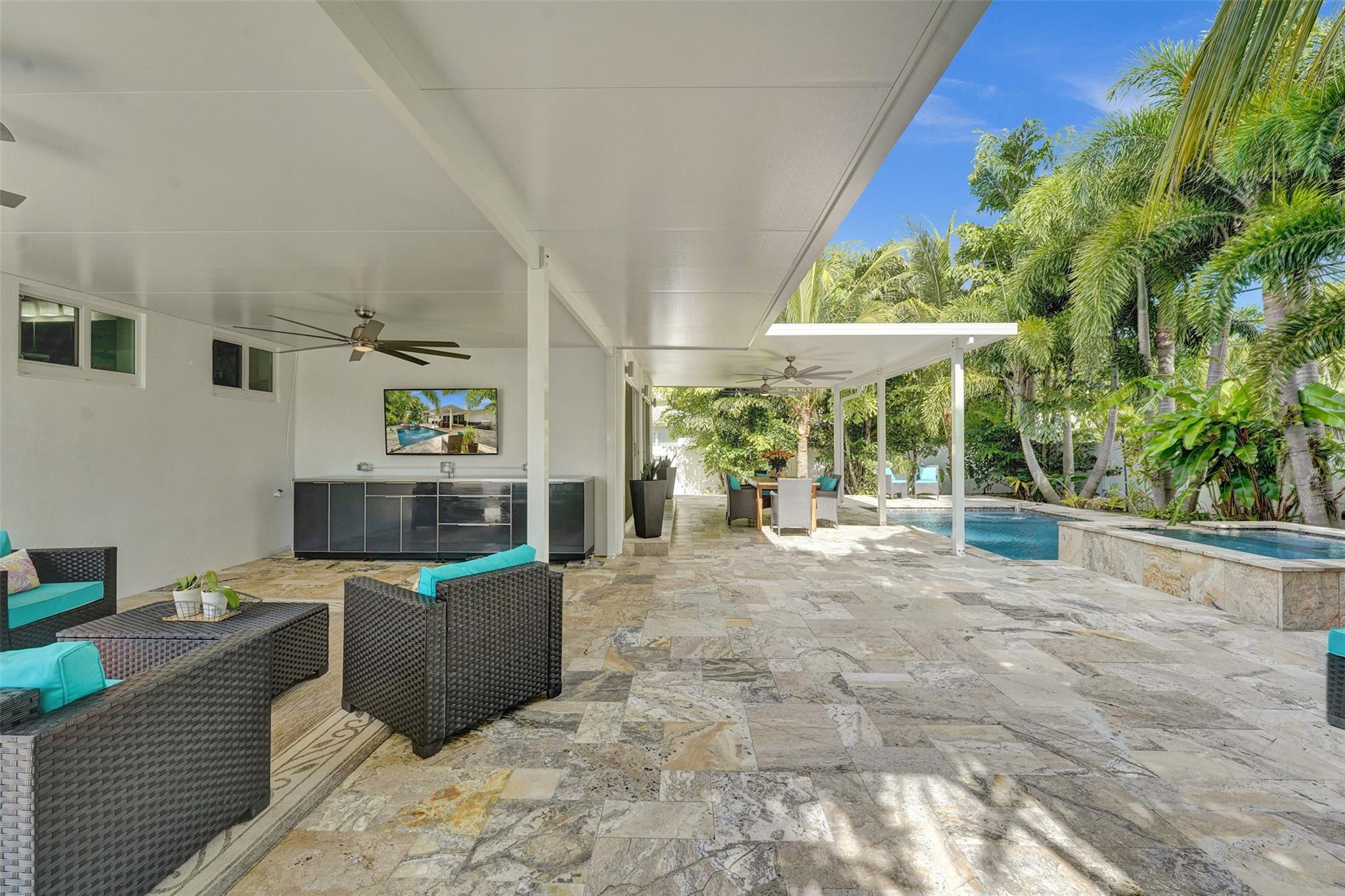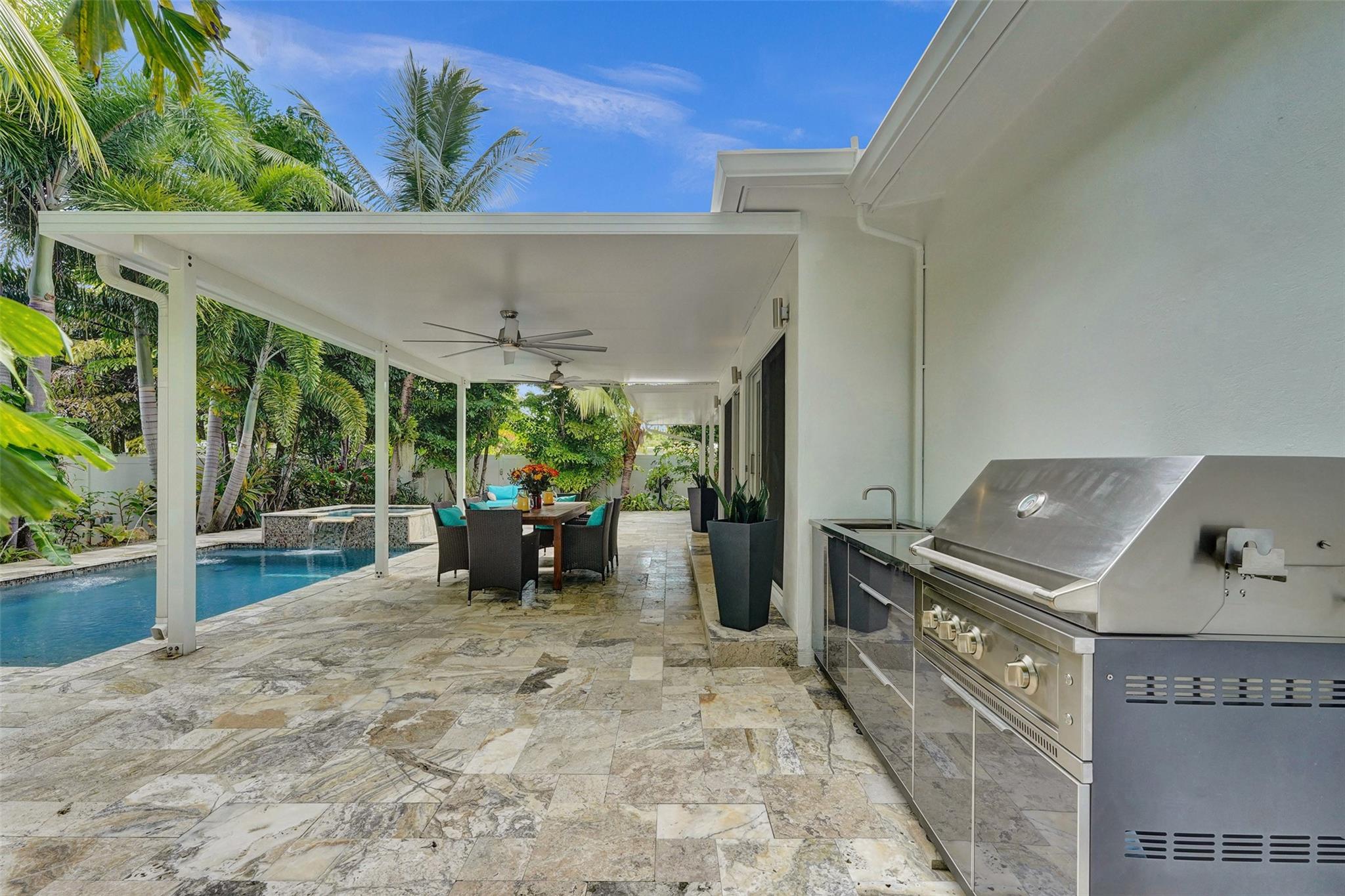 The heart of the home flows seamlessly to the outdoors, where an entertainer’s paradise awaits. A gourmet outdoor kitchen with natural gas cooking, sparkling pool, relaxing hot tub, and two covered lounge areas create the ultimate setting for gatherings or quiet retreats. An electric car charger adds modern convenience to this sophisticated retreat, blending luxury and practicality at every turn.