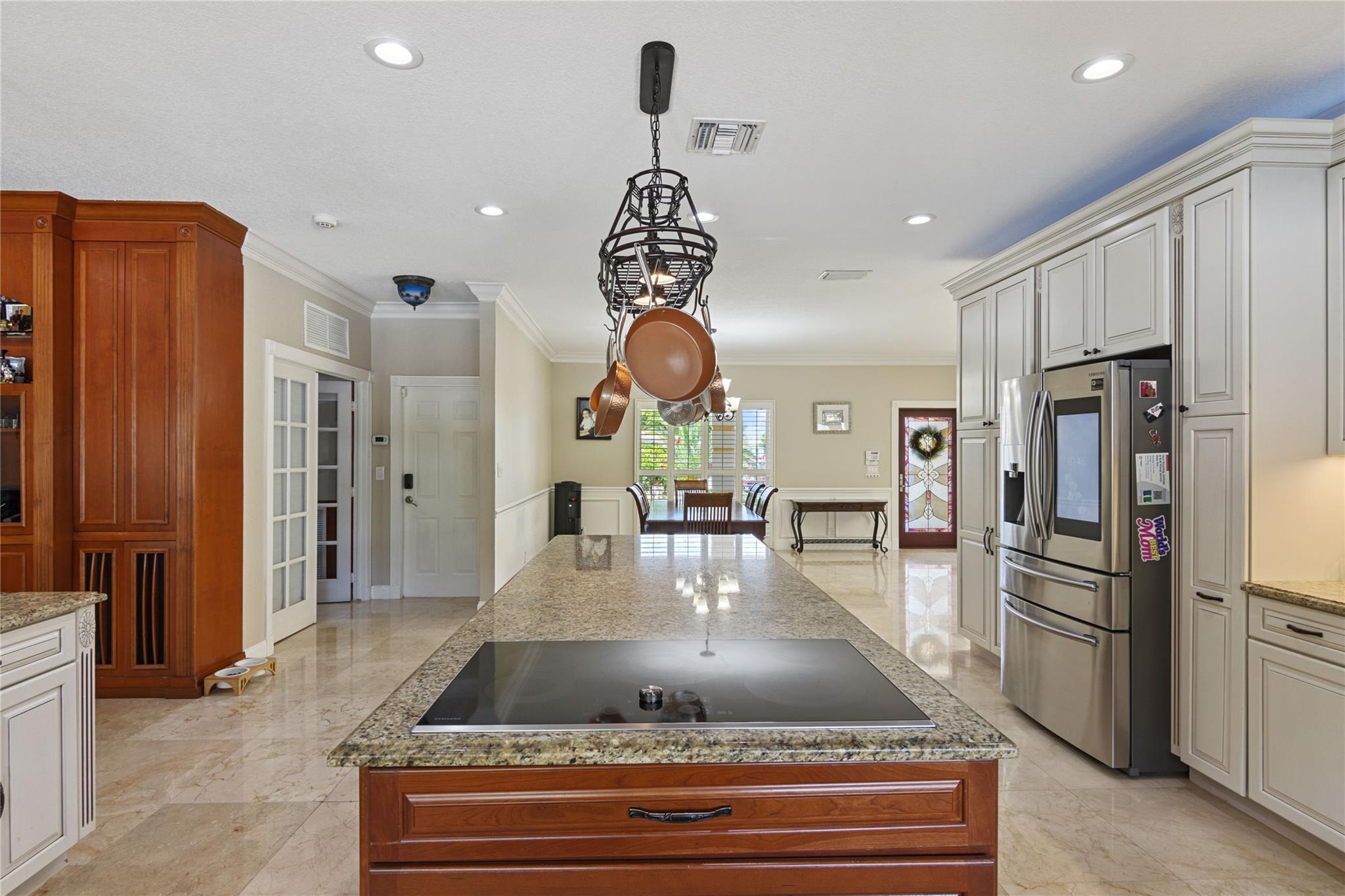 Custom home completely updated 4 bd 3 bath plus office smart home nestled on rare ½-acre lot in the heart of Weston Impact windows & doors, marble & wood flooring gourmet kitchen boasts an oversized island, ss appliances, wood cabinetry, granite countertops, distinctive copper farmhouse sink. Large picture windows offer serene views of backyard oasis. The luxurious master suite incl a spa-like bathroom with a spacious jacuzzi tub, shower featuring body sprays and a rain showerhead. Enjoy seamless indoor-outdoor living with a spacious covered patio summer kitchen & expansive backyard, perfect for entertaining or relaxing. Extended patios & 2nd covered patio area w batting cage & rec area, workshop area, & enjoy the cul-de-sac from front patio, near top-rated schools parks HOA only 385 a yr