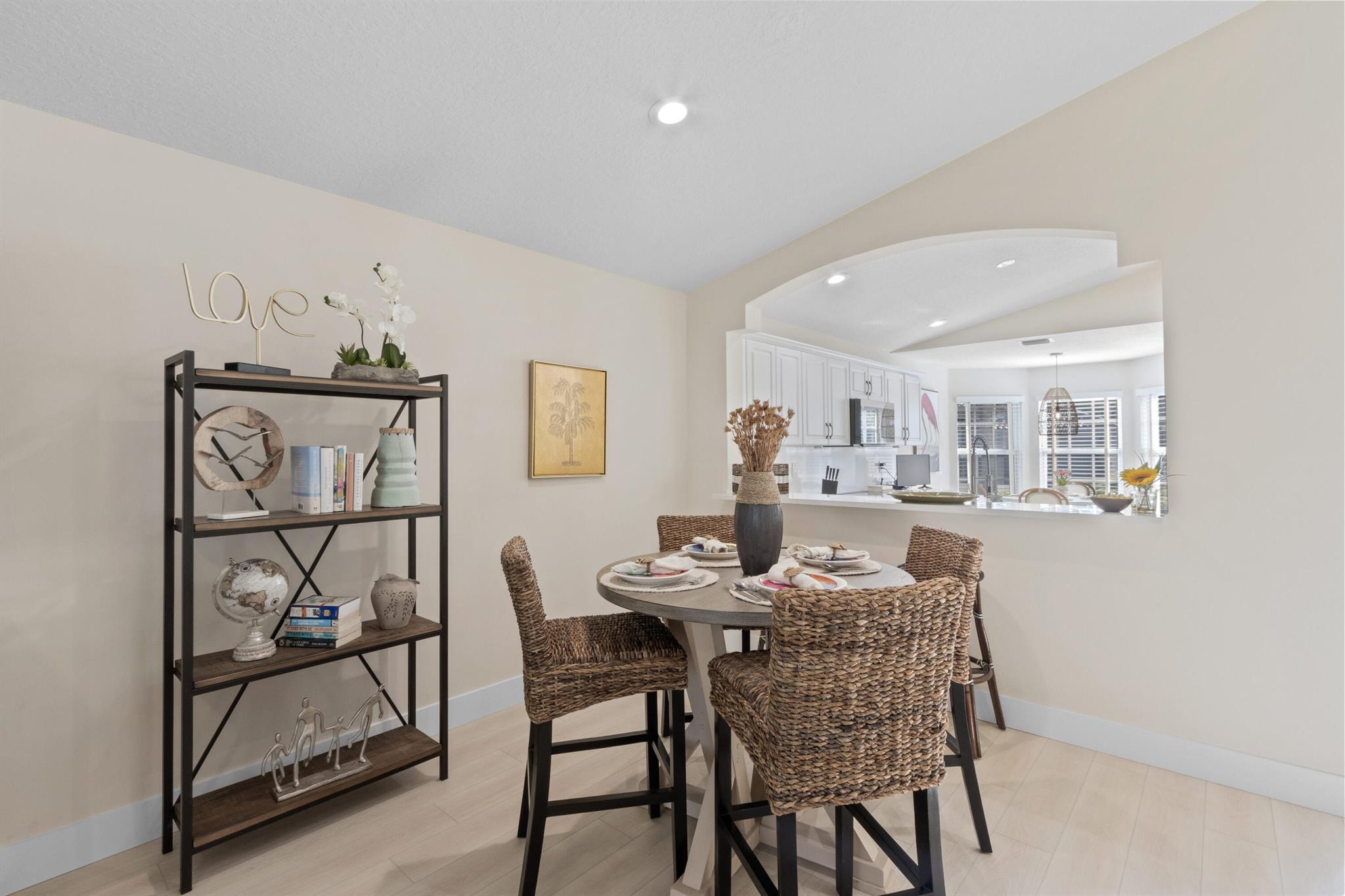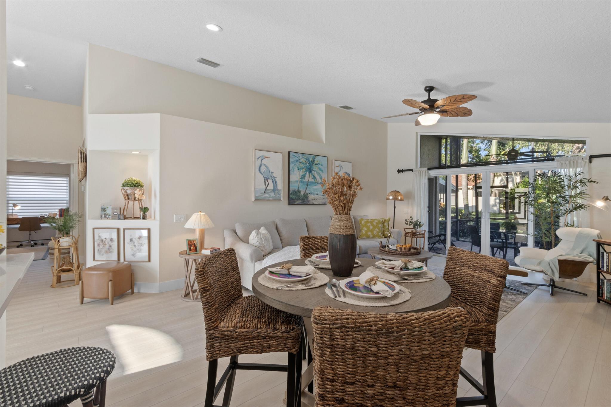 MOVE-IN READY! This LIGHT & BRIGHT true 3 Bedroom (3rd bedroom is being used as a den/office)/2 Bath Adriatic model w/ both garden & lake views is renovated to decorator perfection! IMPACT WINDOWS throughout! NO CARPETS, NEW 5” baseboards! NEW contemporary front doors adding light & privacy. Eat-In Kitchen features wood cabinets, Quartz countertops NEW STATE of the ART APPLIANCES & large pantry for storage. NEW light fixtures & ceiling fans throughout. Both BATHROOMS have been RENOVATED! Large Primary Bedroom w/ fitted walk-in closet. Neutral colors throughout! Laundry w/ custom built storage. NEWER A/C & WH. Finished garage floor! Custom Landscaping! WALKING DISTANCE to the renovated clubhouse w/ Bistro. Valencia Isles has amenities & activities to keep you busy all week long!