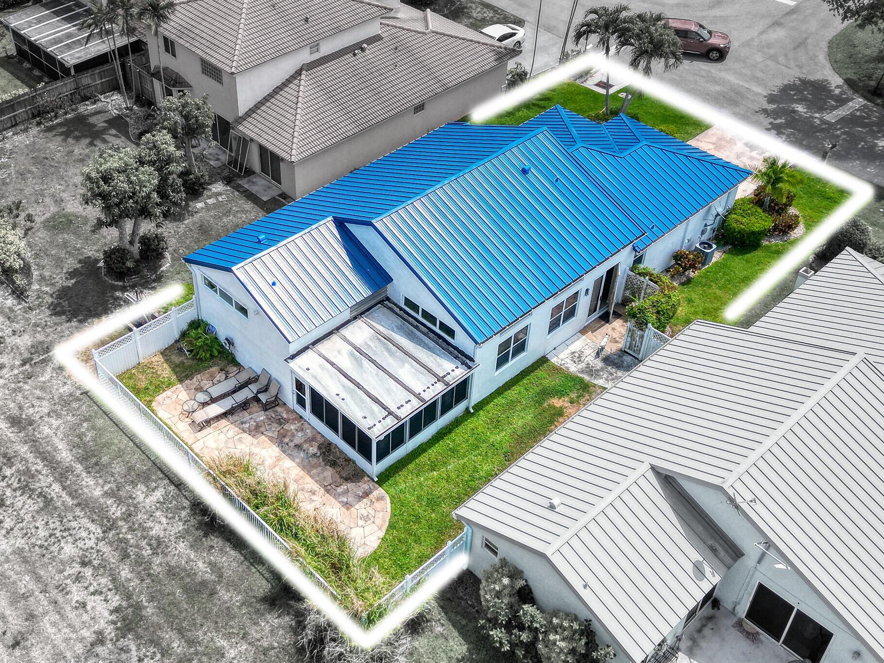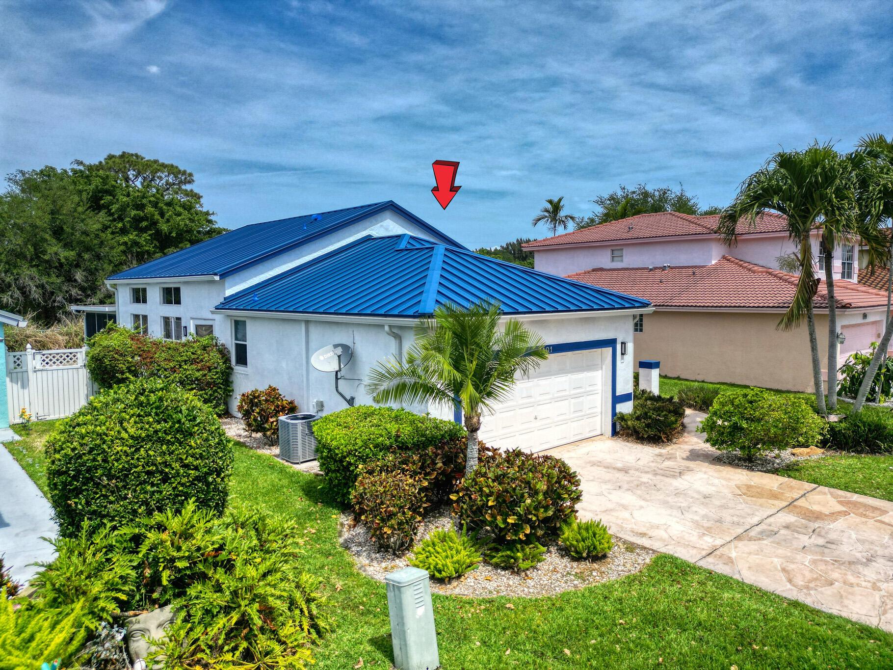 This charming home features a brand new metal roof installed in 2024, a spacious kitchen complete with granite countertops, maple cabinetry, and a beautiful tumbled marble backsplash. The living areas feature stylish neutral tile laid on the diagonal, with the master bedroom also outfitted in tile. Enjoy the expansive covered and screened-in patio, equipped with windows, overlooking a large, lush backyard with a stamped concrete patio and no rear neighbors for added privacy. The master walk-in closet features built-in shelving, providing extra storage space. The oversized garage offers custom-built shelving for your convenience. The great room is bathed in natural light thanks to vaulted ceilings and transom windows.